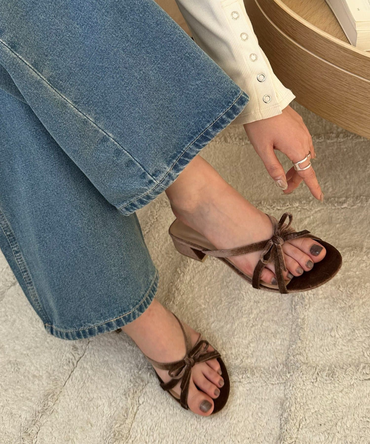 光沢感が美しいベロア素材を使用し、足元に華やかさをプラス。カジュアルな装いも一気にクラスアップさせてくれる、主役級の一足です。フロントに施されたリボンもベロア素材にしたことで、甘さが抑えられ、大人の女性も取り入れやすい一足に仕上がりました。台形ヒールにしたことで、疲れにくく安定感があり、普段ヒールをあまり履かない方も挑戦しやすいです!