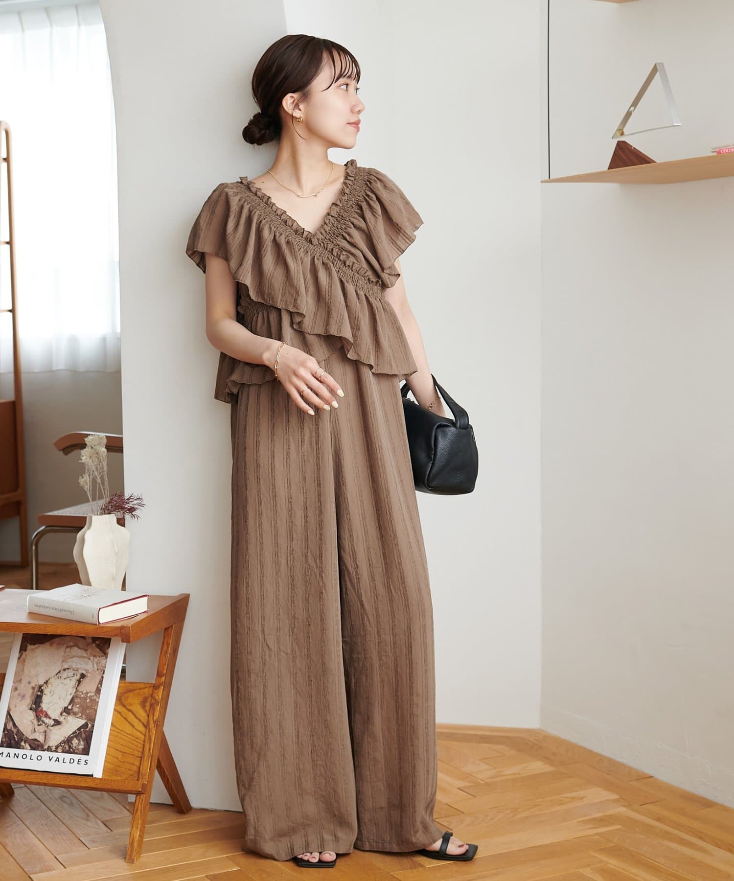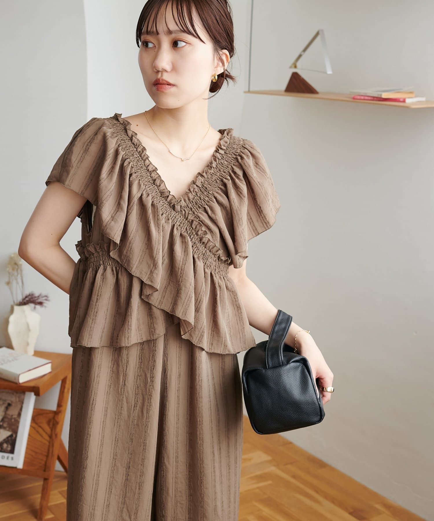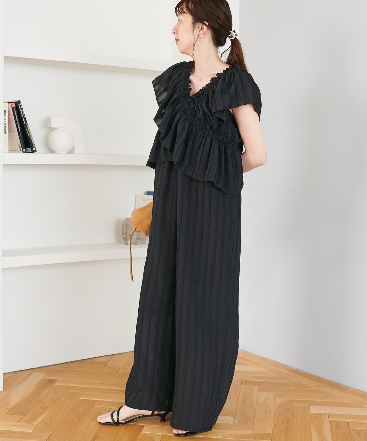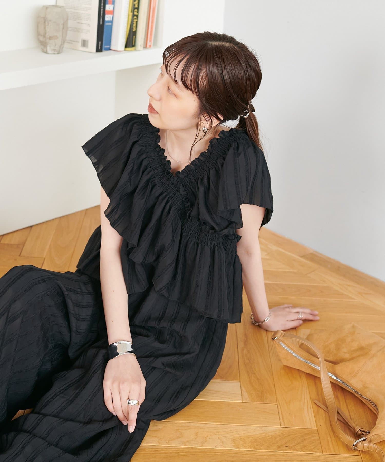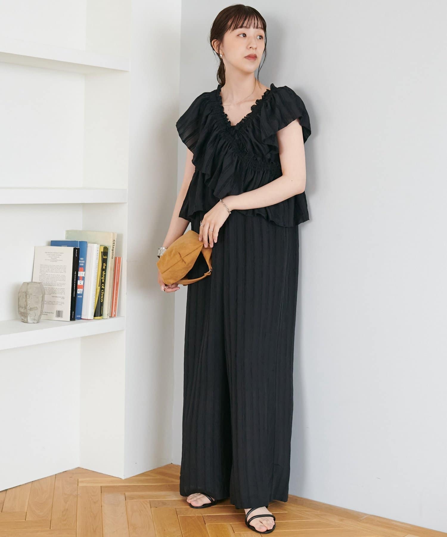 153cmスタッフ (PSサイズ着用):胸元の大きなフリルが華やかで、気になる二の腕をふんわりとカバーしてくれるのが嬉しいです♪ウエストのシャーリングがアクセントになり、小柄な私でもバランス良く着こなせました!落ち感のある素材なので、ワイドシルエットでもすっきりと見えます◎