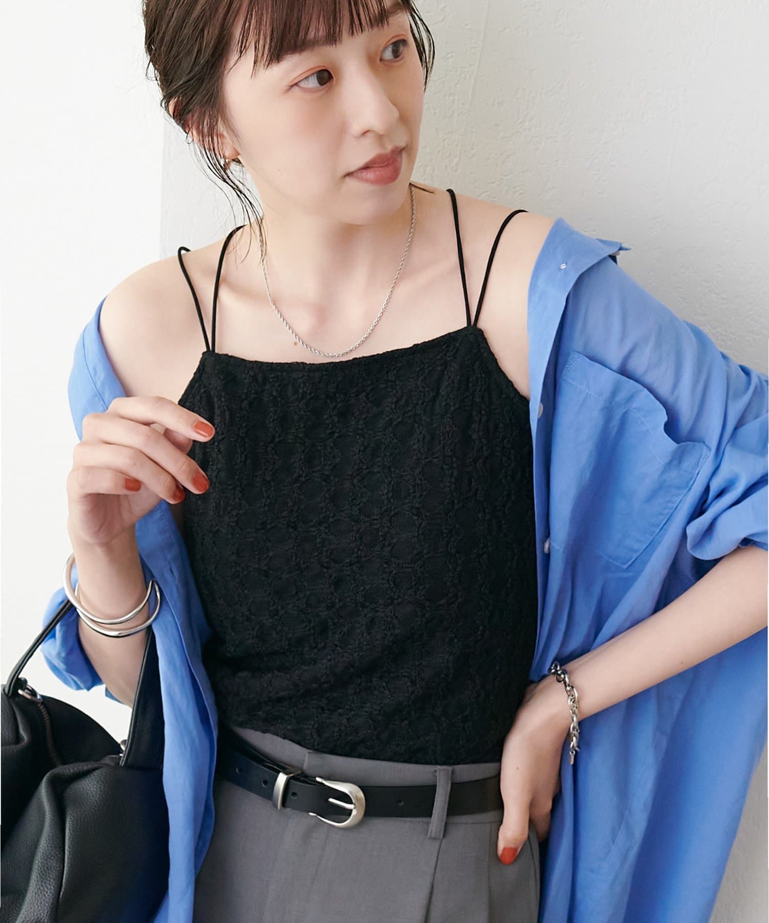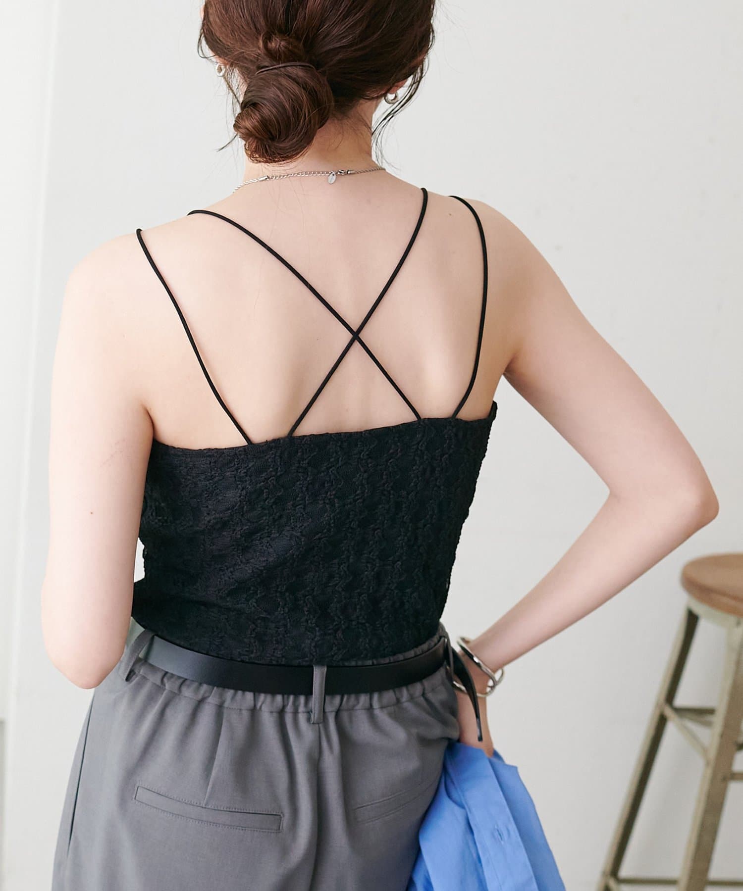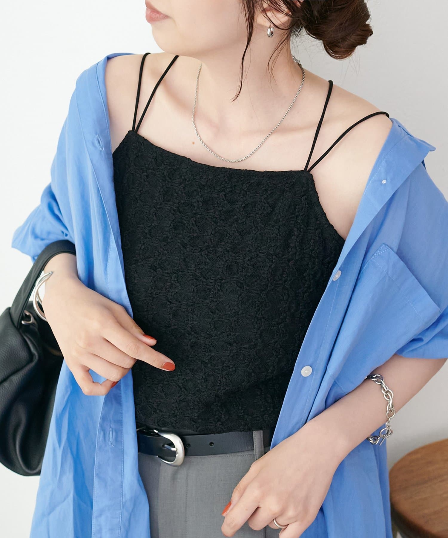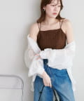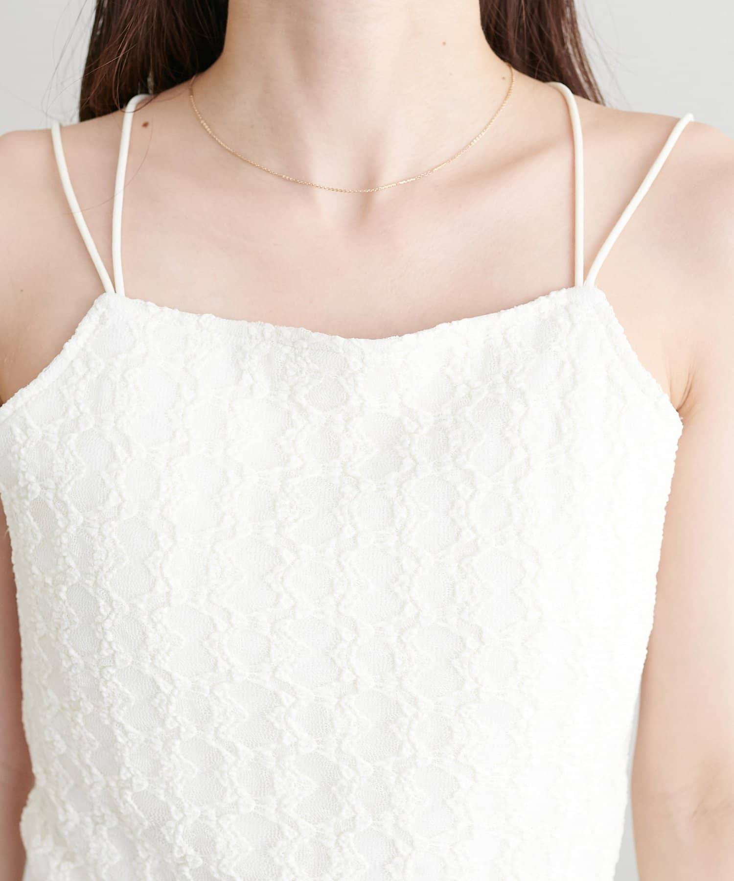 158cmスタッフ:繊細なレース素材が上品で、シンプルなジャケットやシャツのインナーに合わせるだけで華やかな印象になります♪華奢なダブルストラップがデコルテをきれいに見せてくれるのもポイント!伸縮性のある生地で着心地も抜群です◎