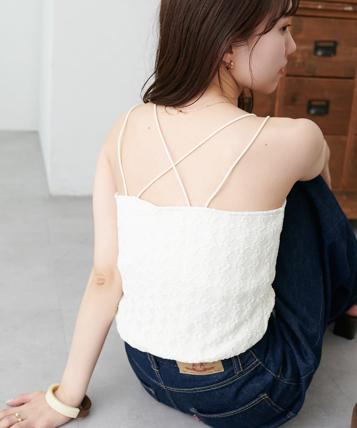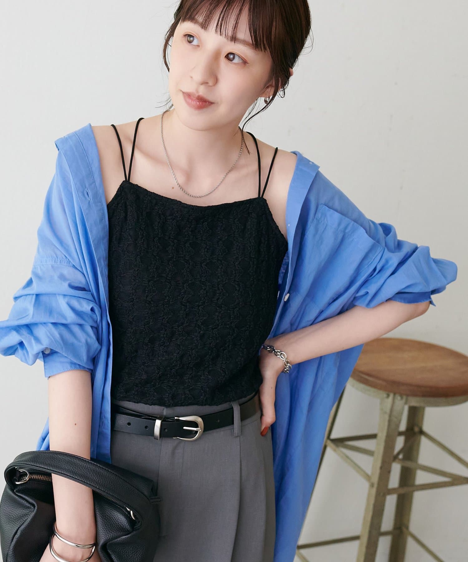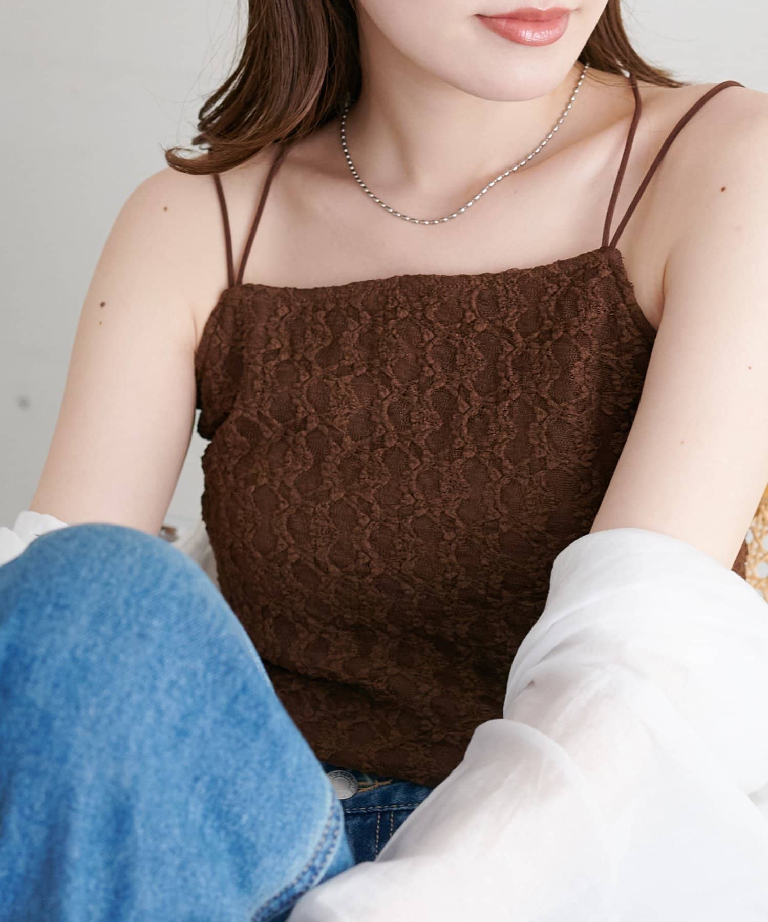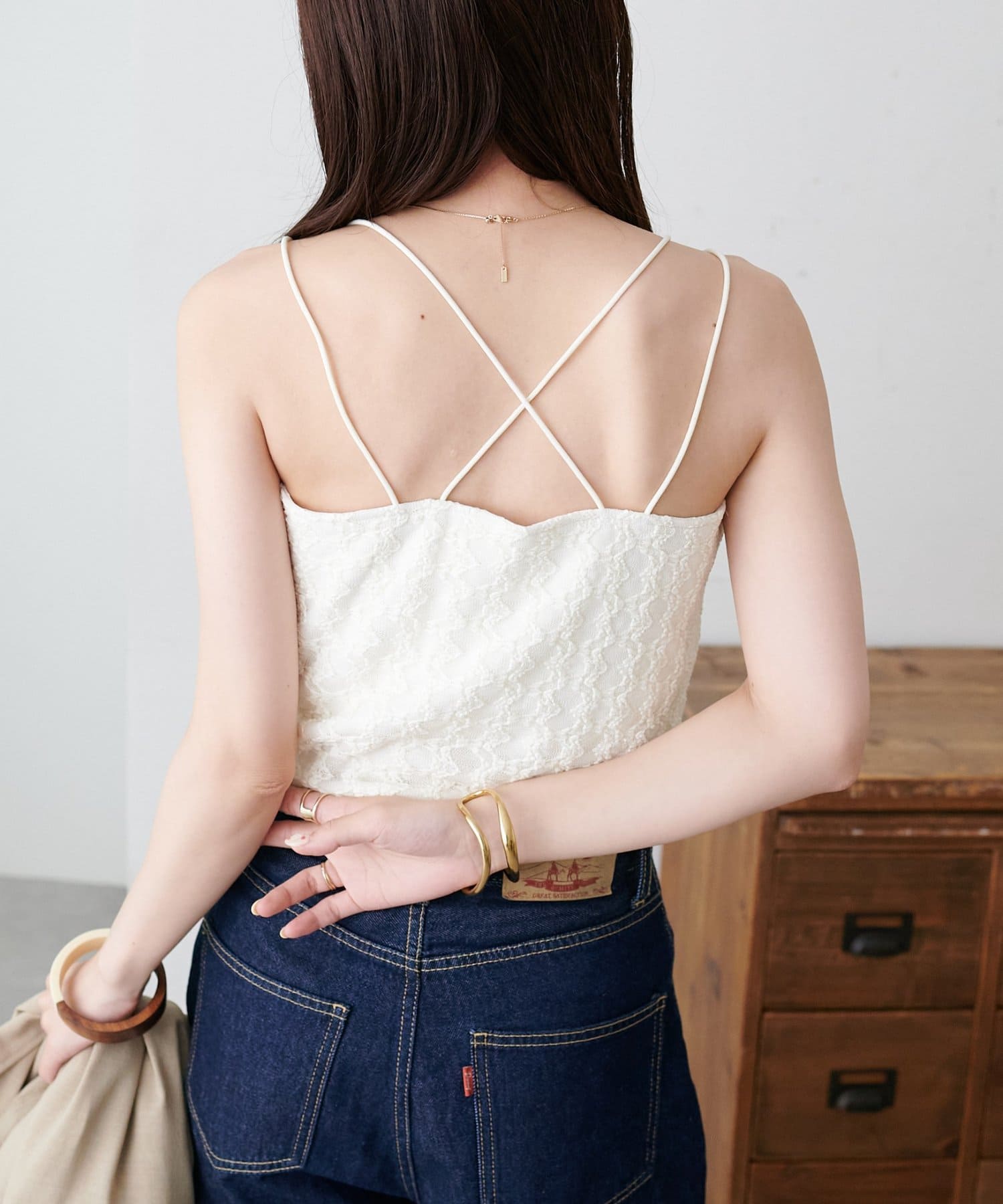 158cmスタッフ:繊細なレース素材が上品で、シンプルなジャケットやシャツのインナーに合わせるだけで華やかな印象になります♪華奢なダブルストラップがデコルテをきれいに見せてくれるのもポイント!伸縮性のある生地で着心地も抜群です◎