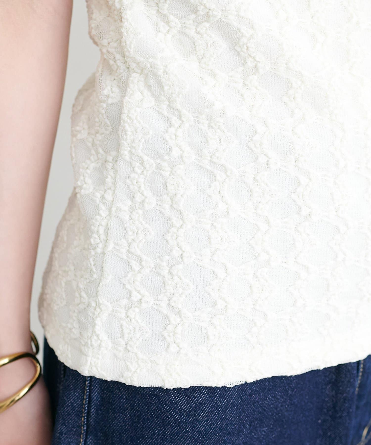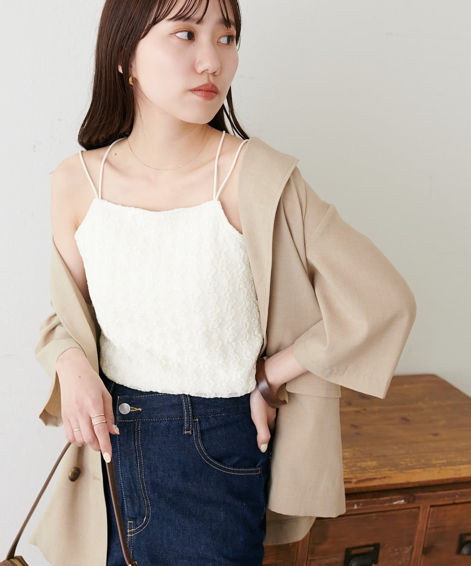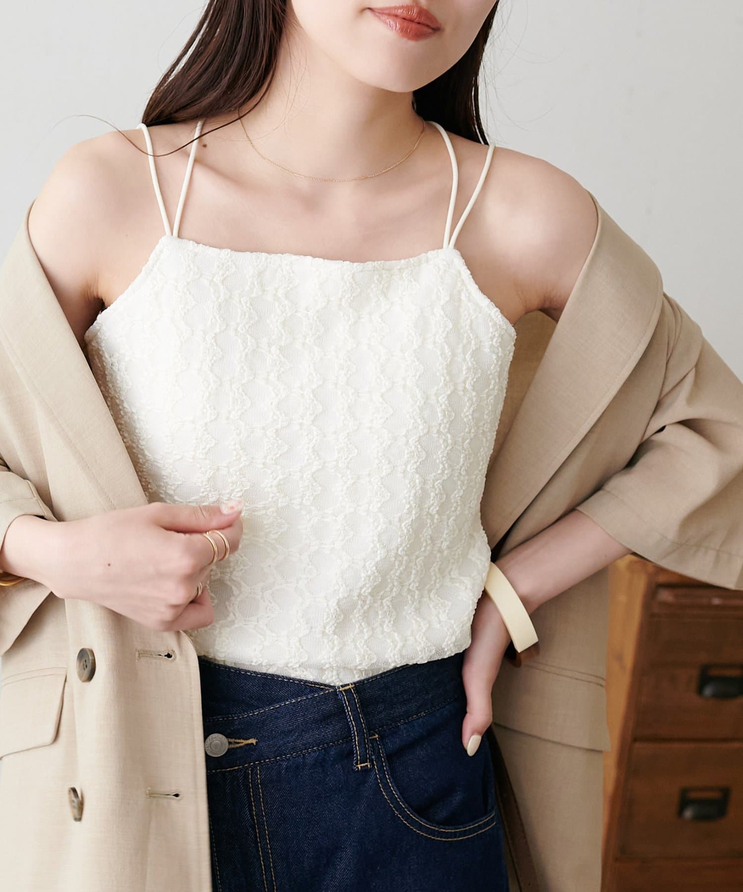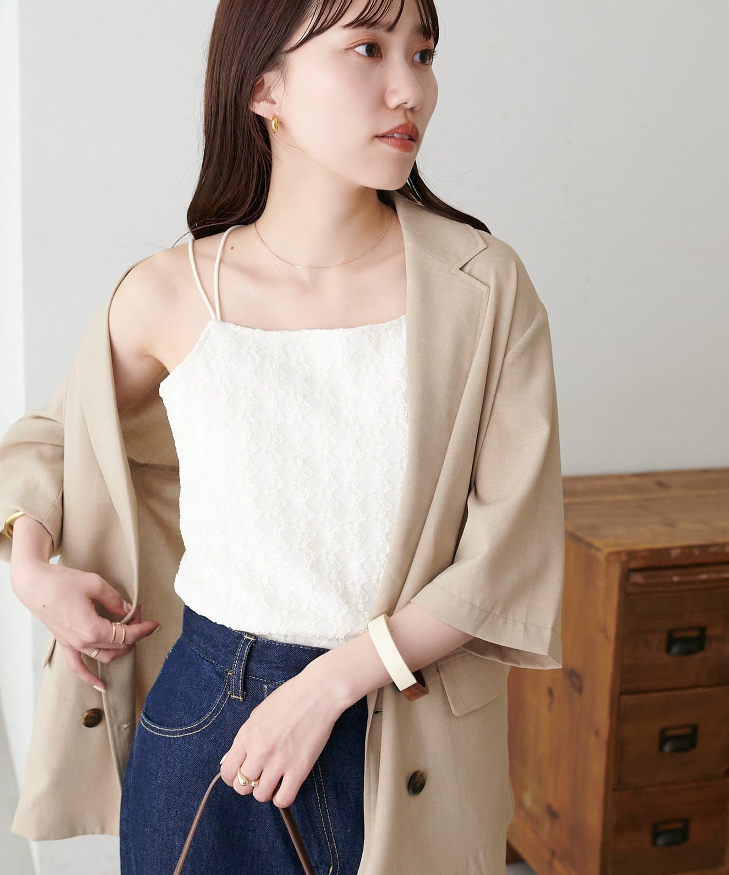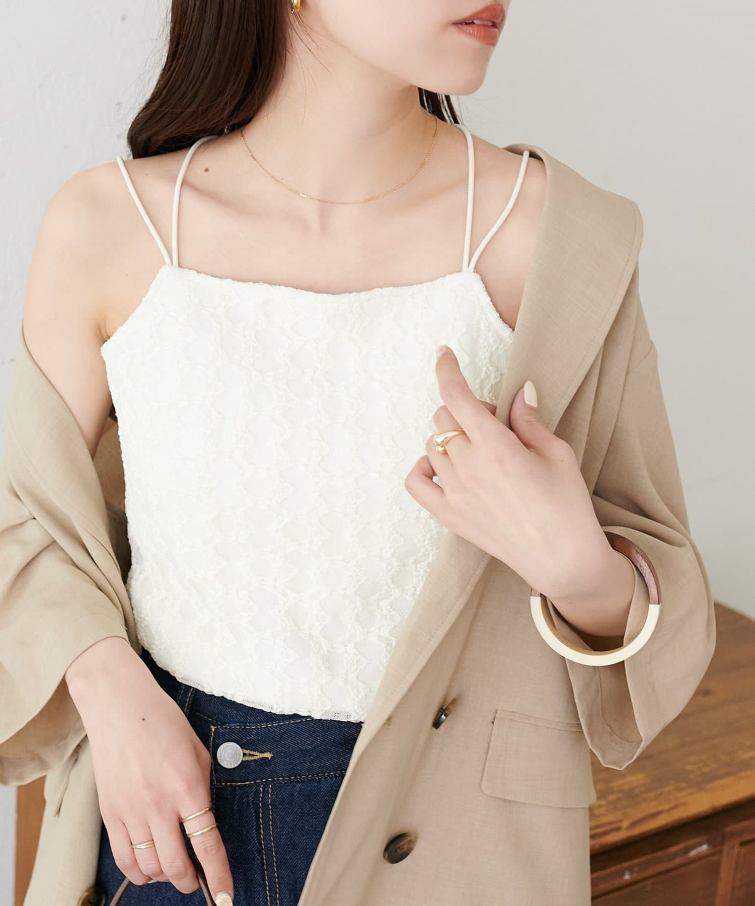 ・ジャケットやカーディガンのインナーに合わせ、胸元のレースをちらりと見せることで、上品な抜け感を演出♪
