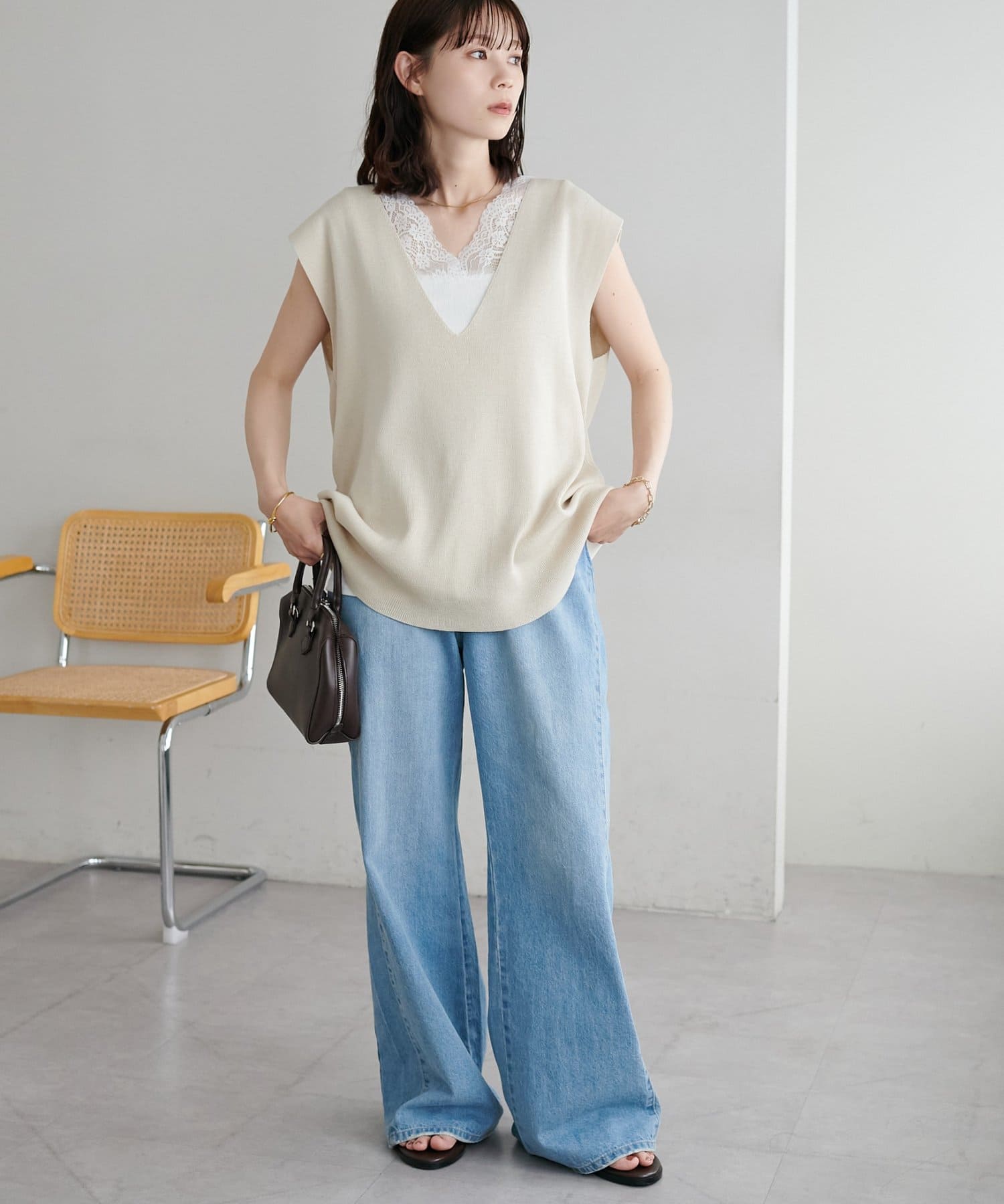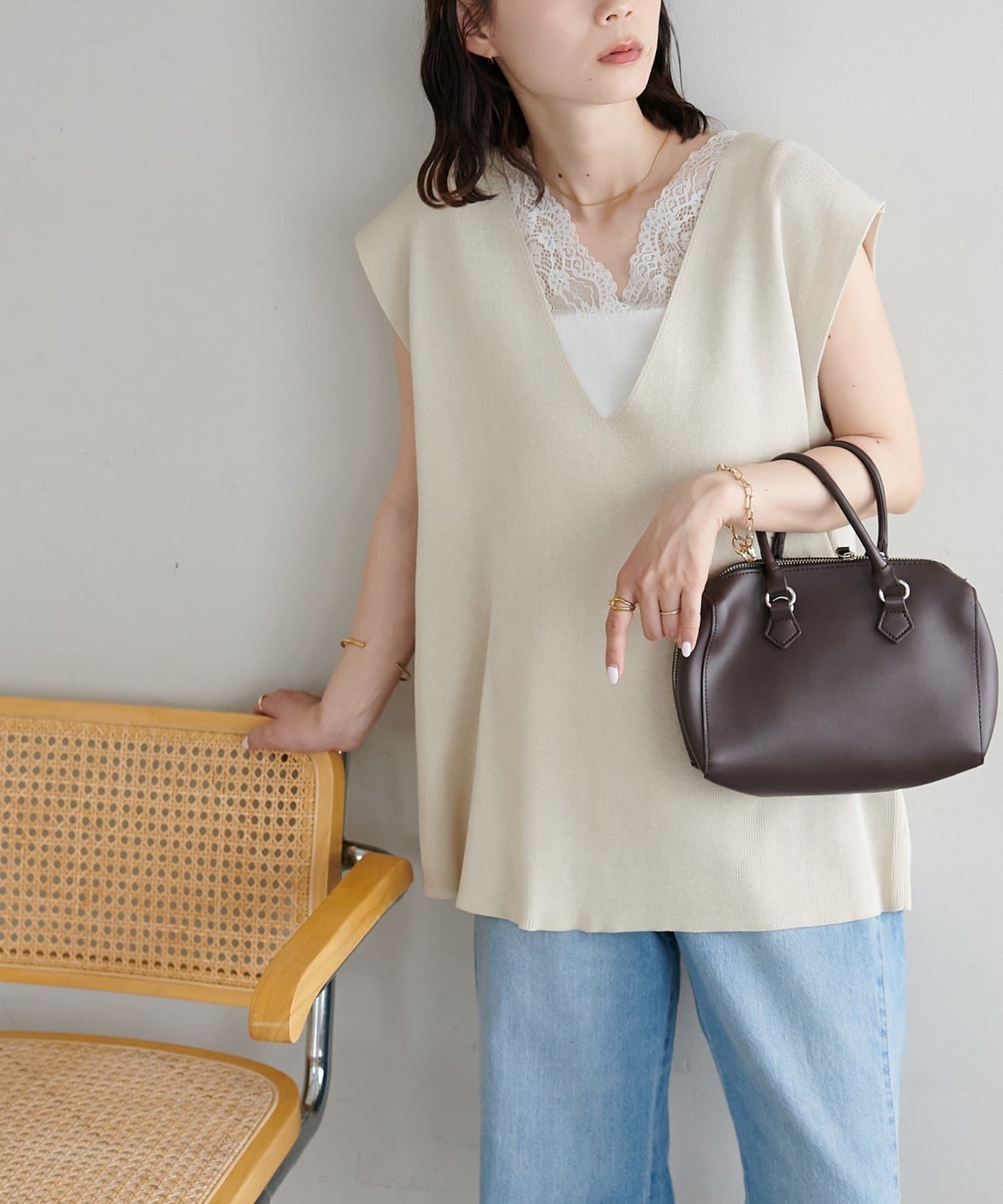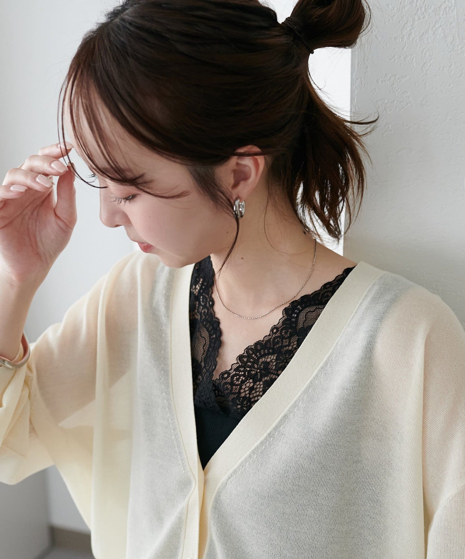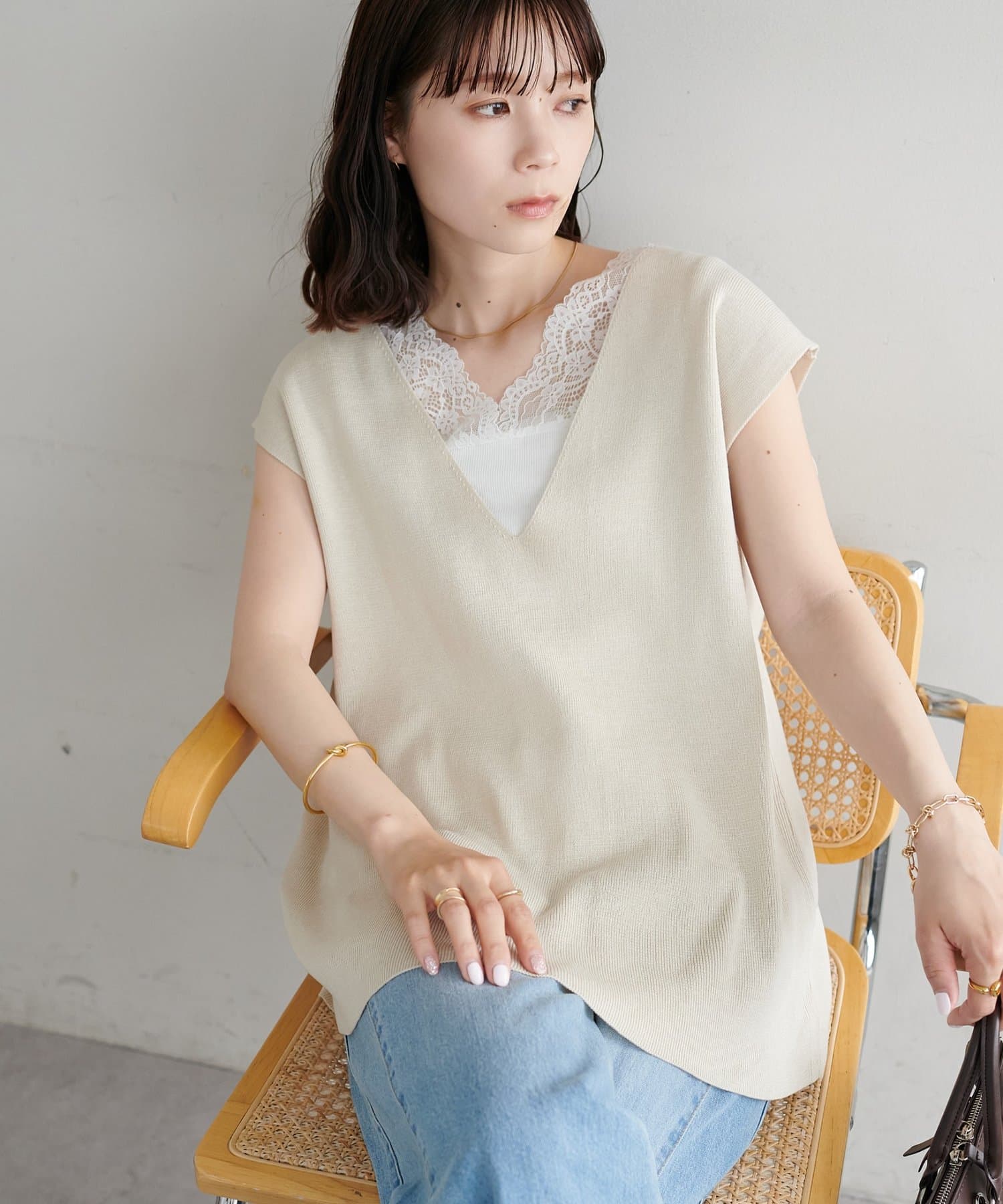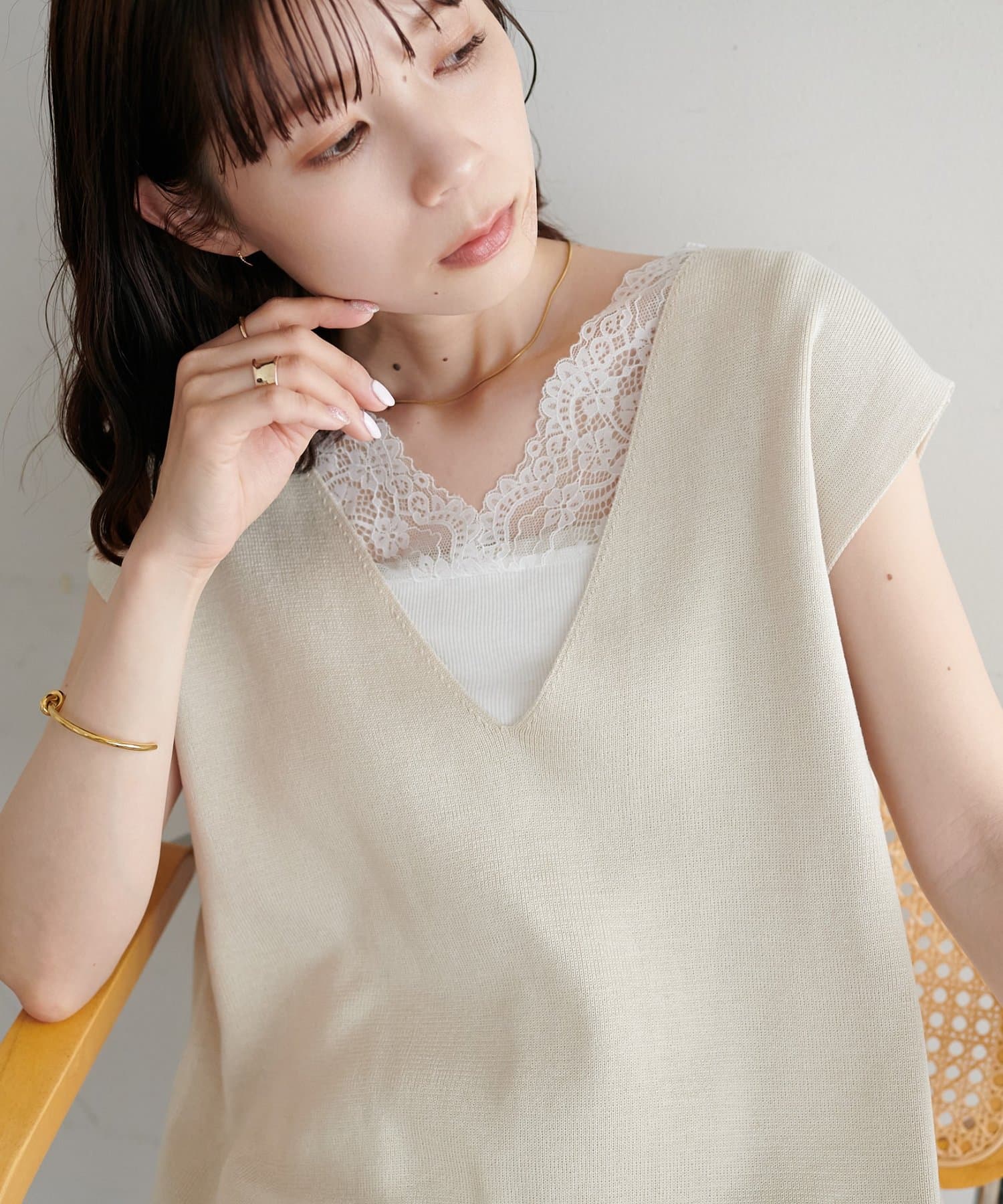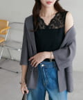 トレンドのレースアイテムで、Vネックのトップスを重ねたり、ジャケットのインナーとしても着たいです♪