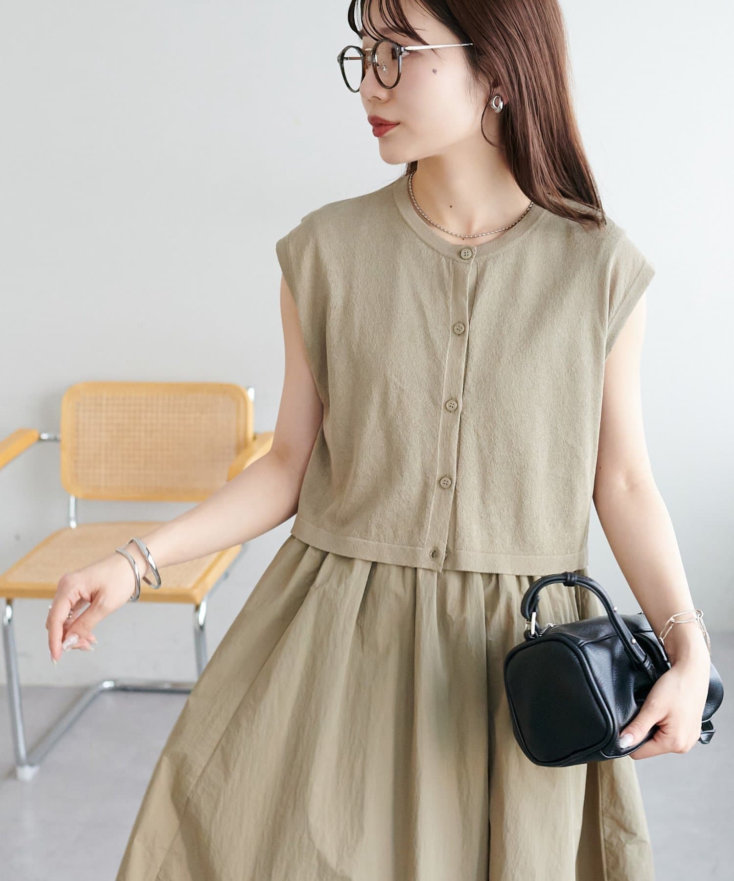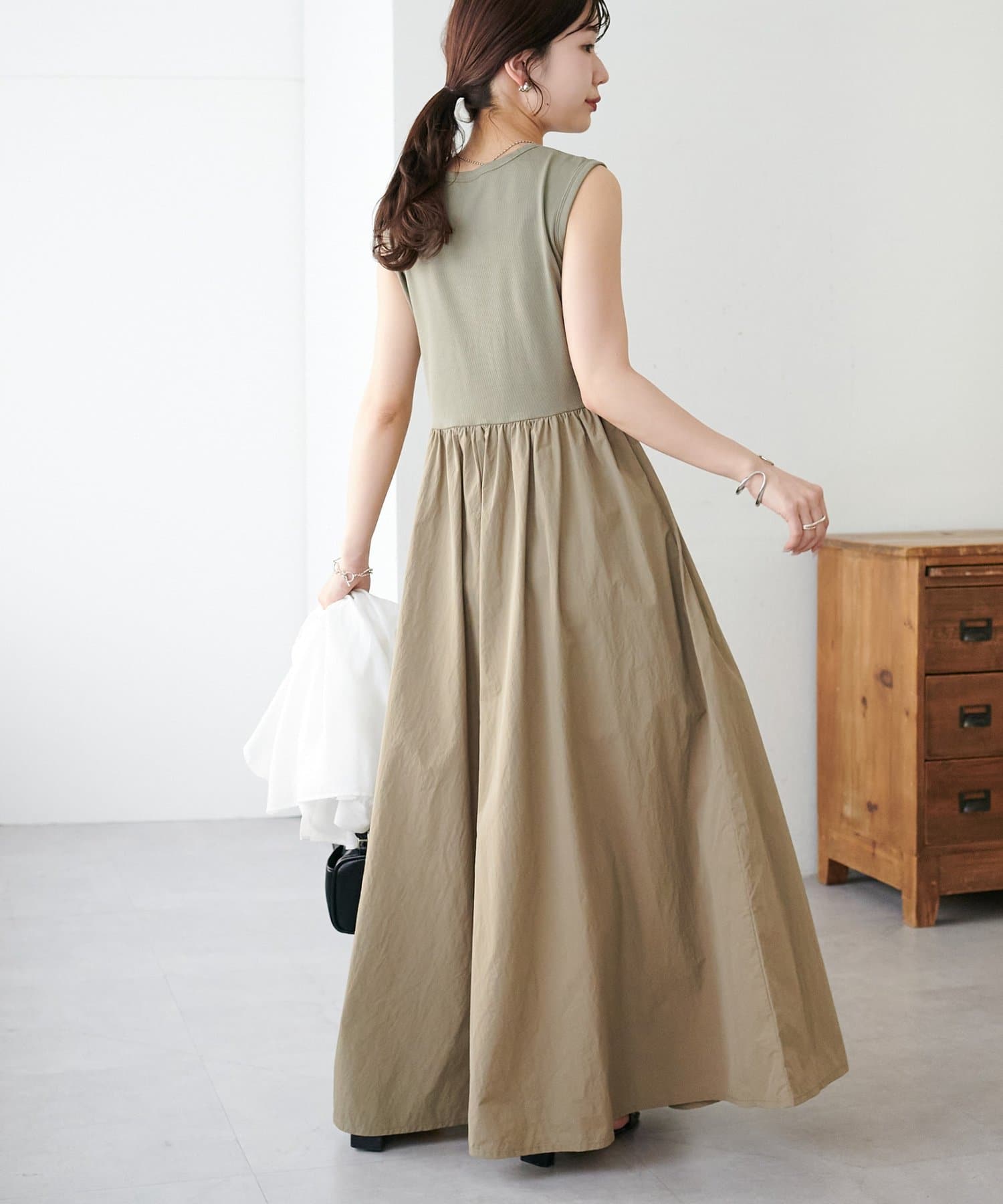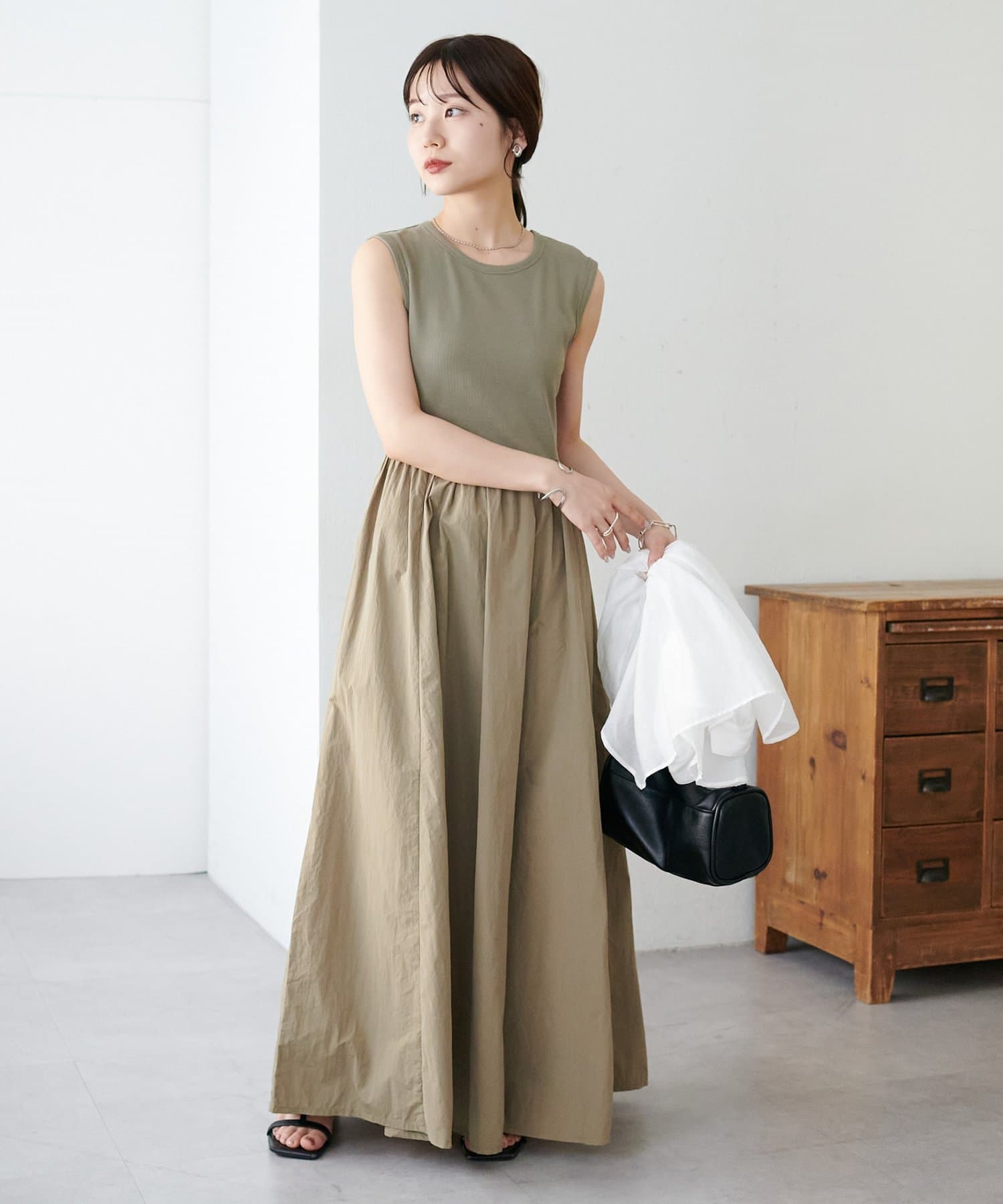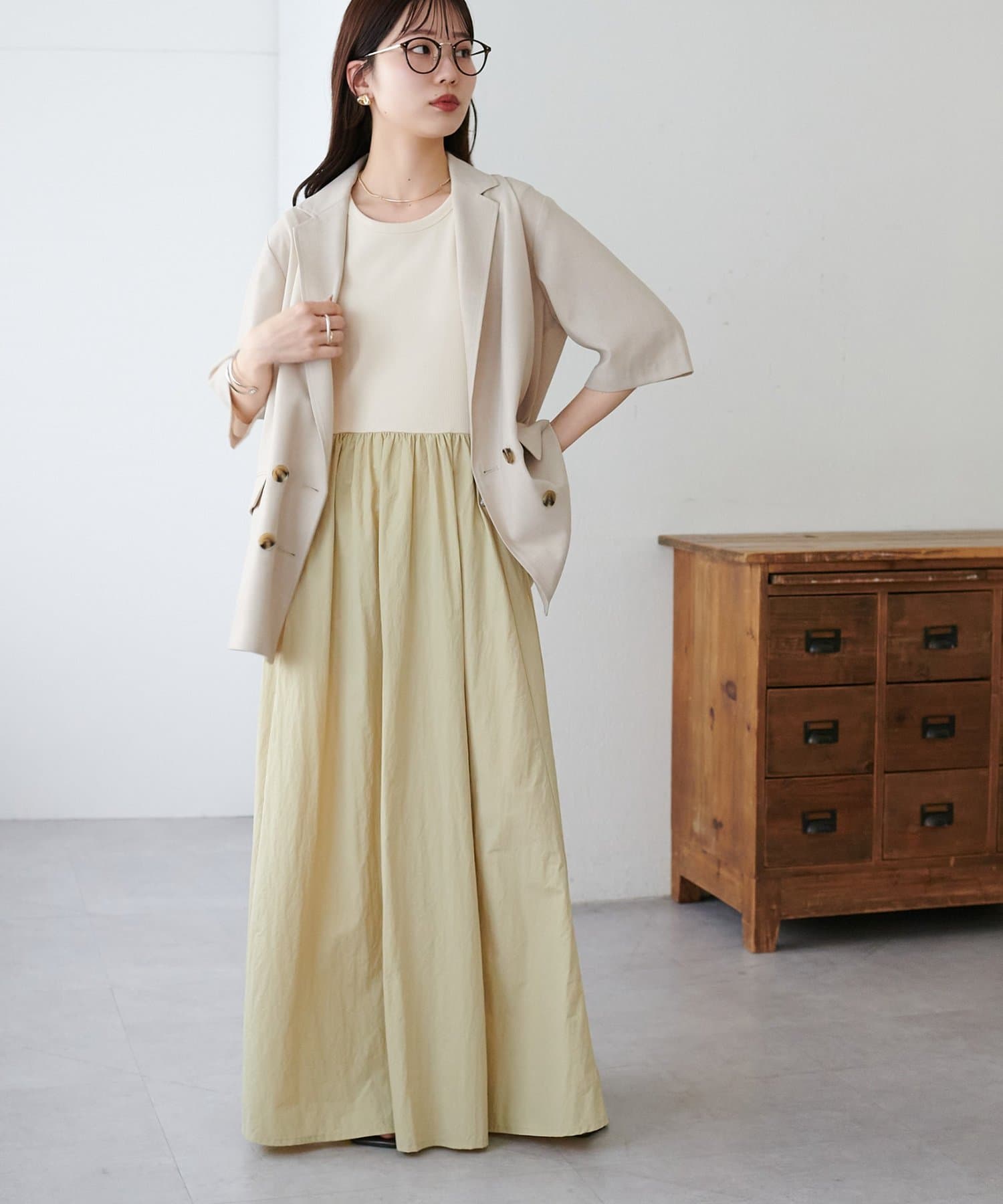 一枚で旬のレイヤードスタイルが完成する、異素材ドッキングワンピース。