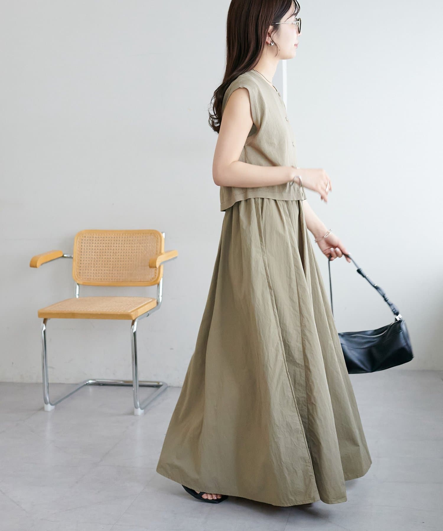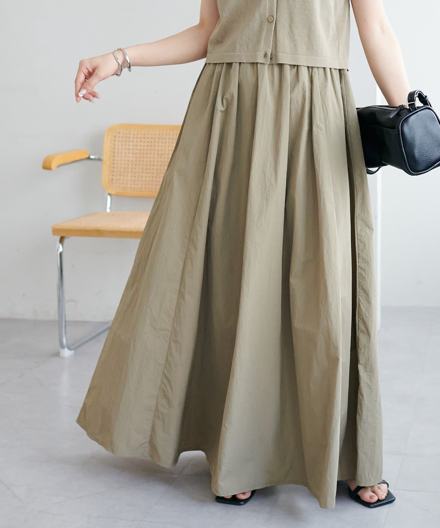 ・スカート部分はワッシャー加工を施したような軽やかなナイロン素材。たっぷりのギャザーがふんわりとした女性らしいシルエットを描きます。