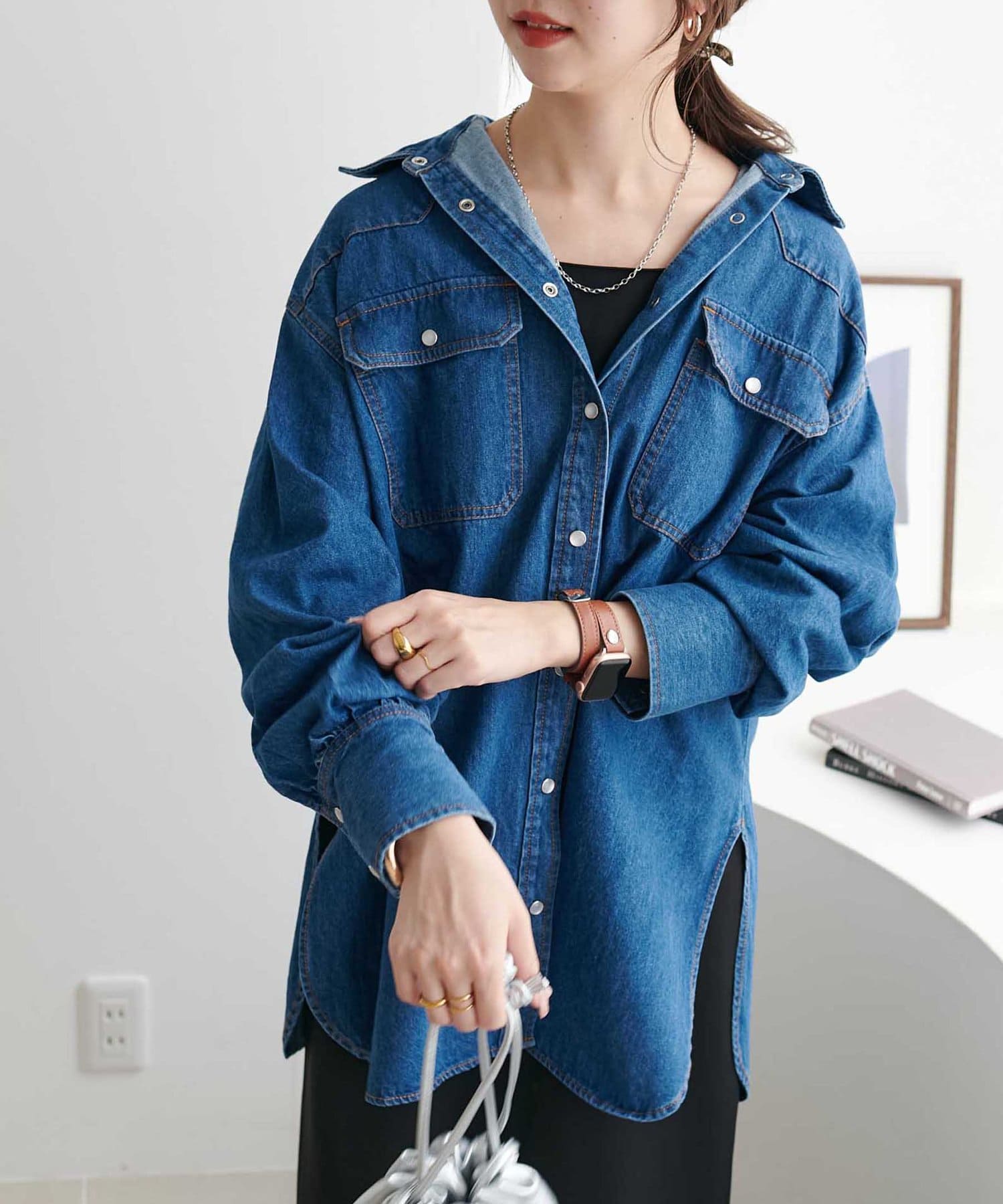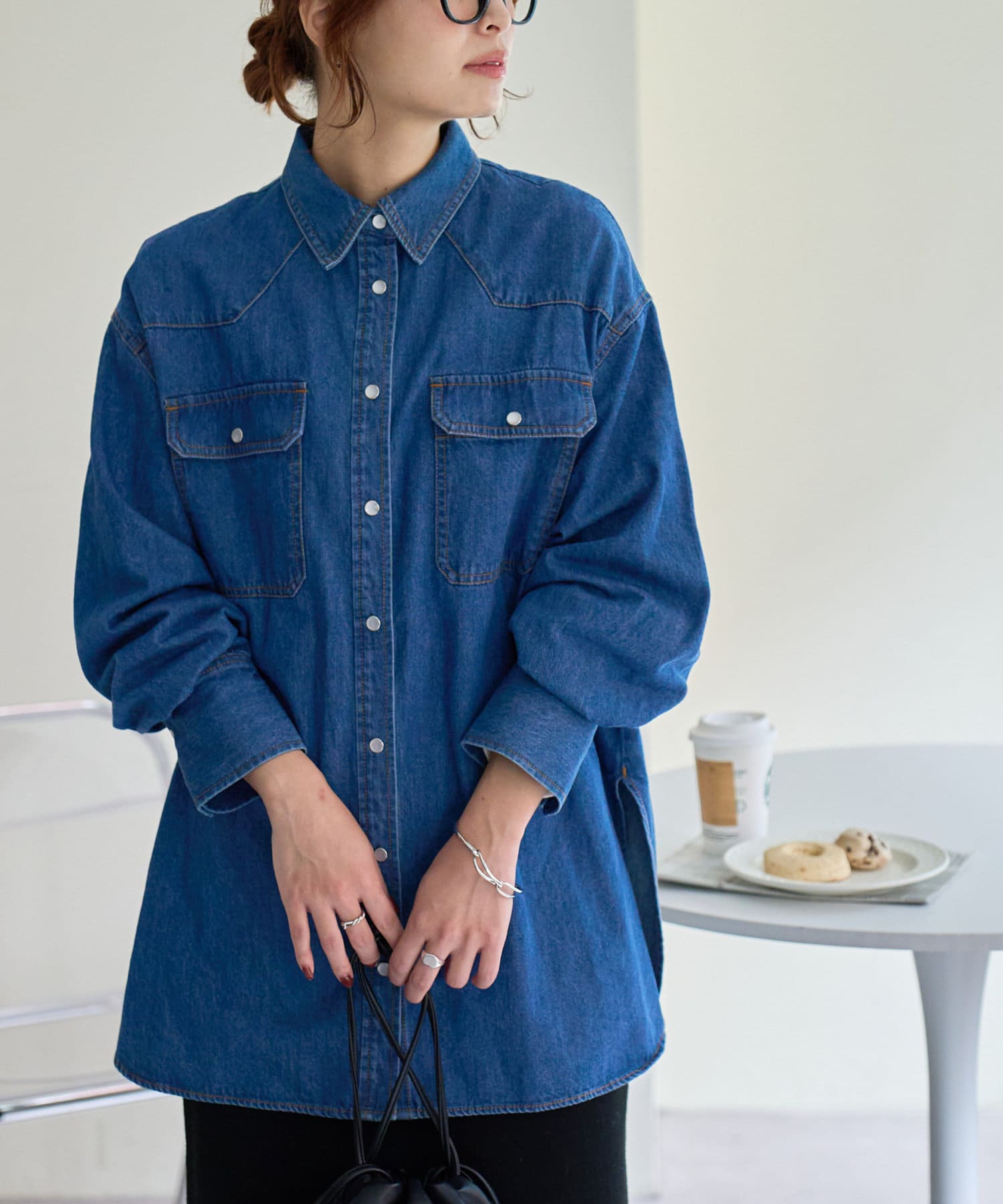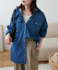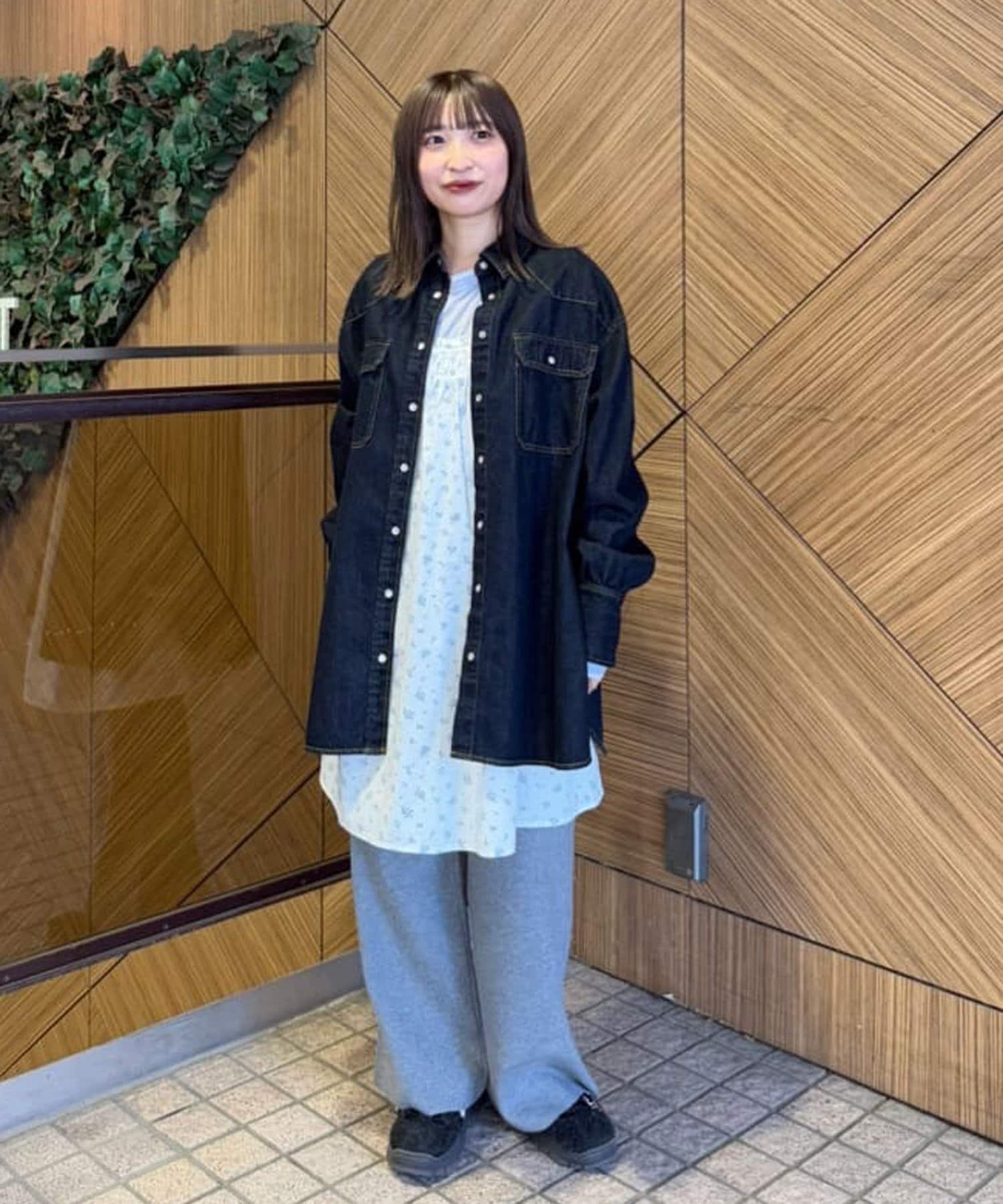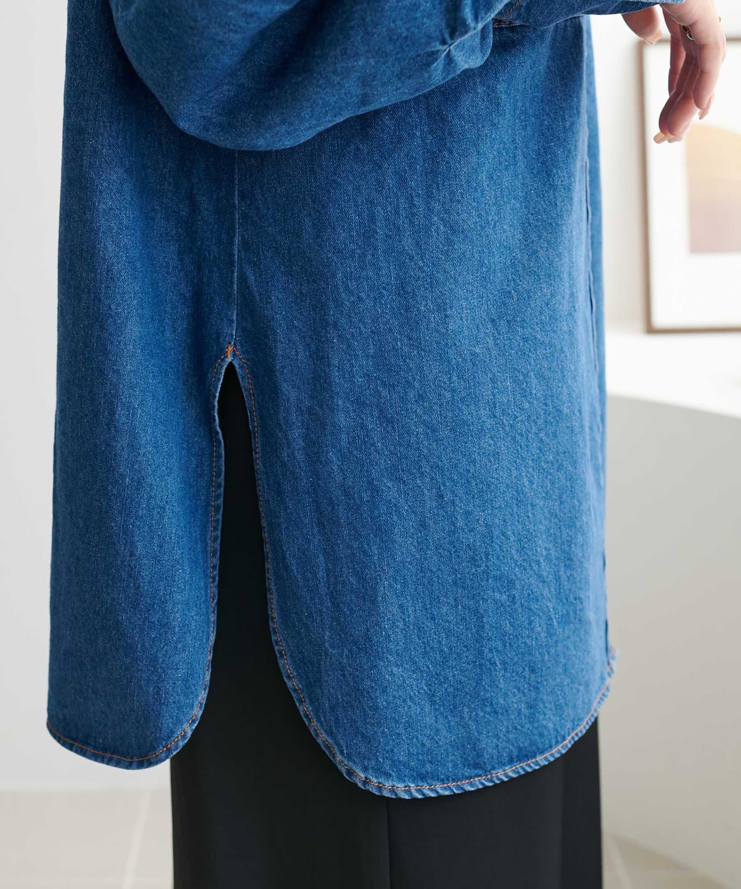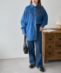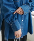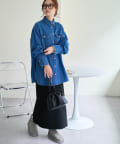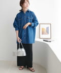 155cmスタッフ:定番のデニムシャツはお尻まで隠れる丈感で、体型カバーにも〇