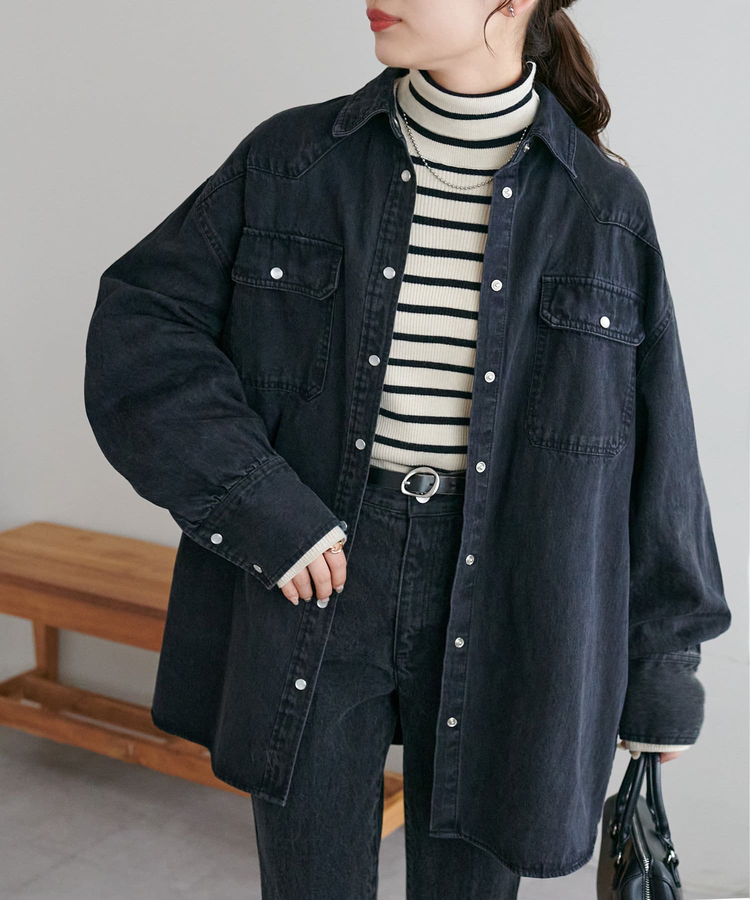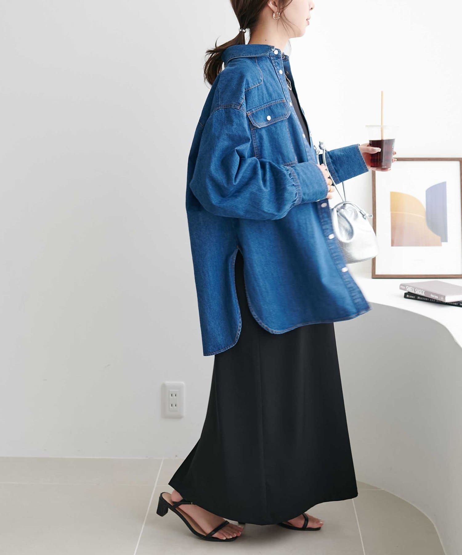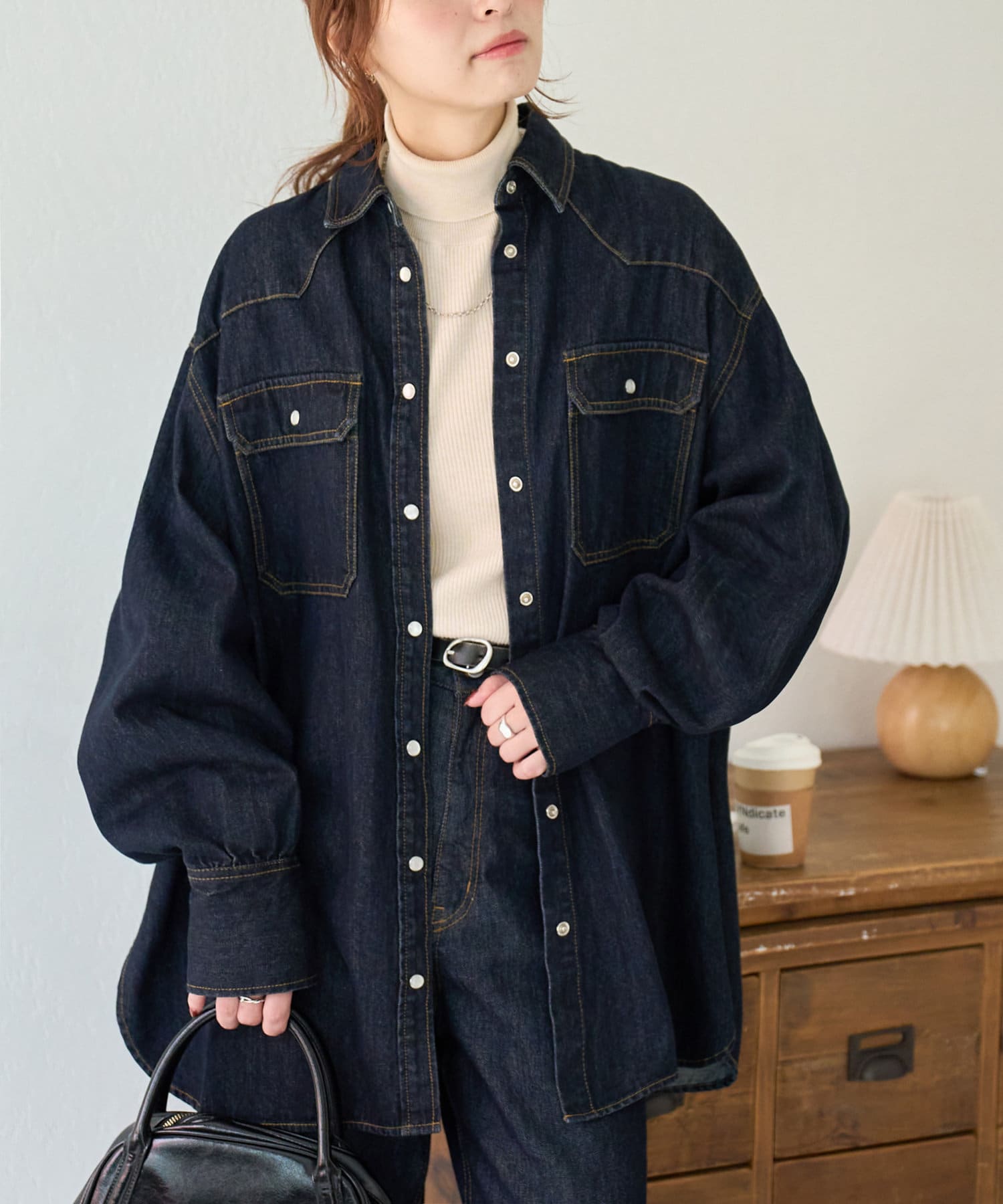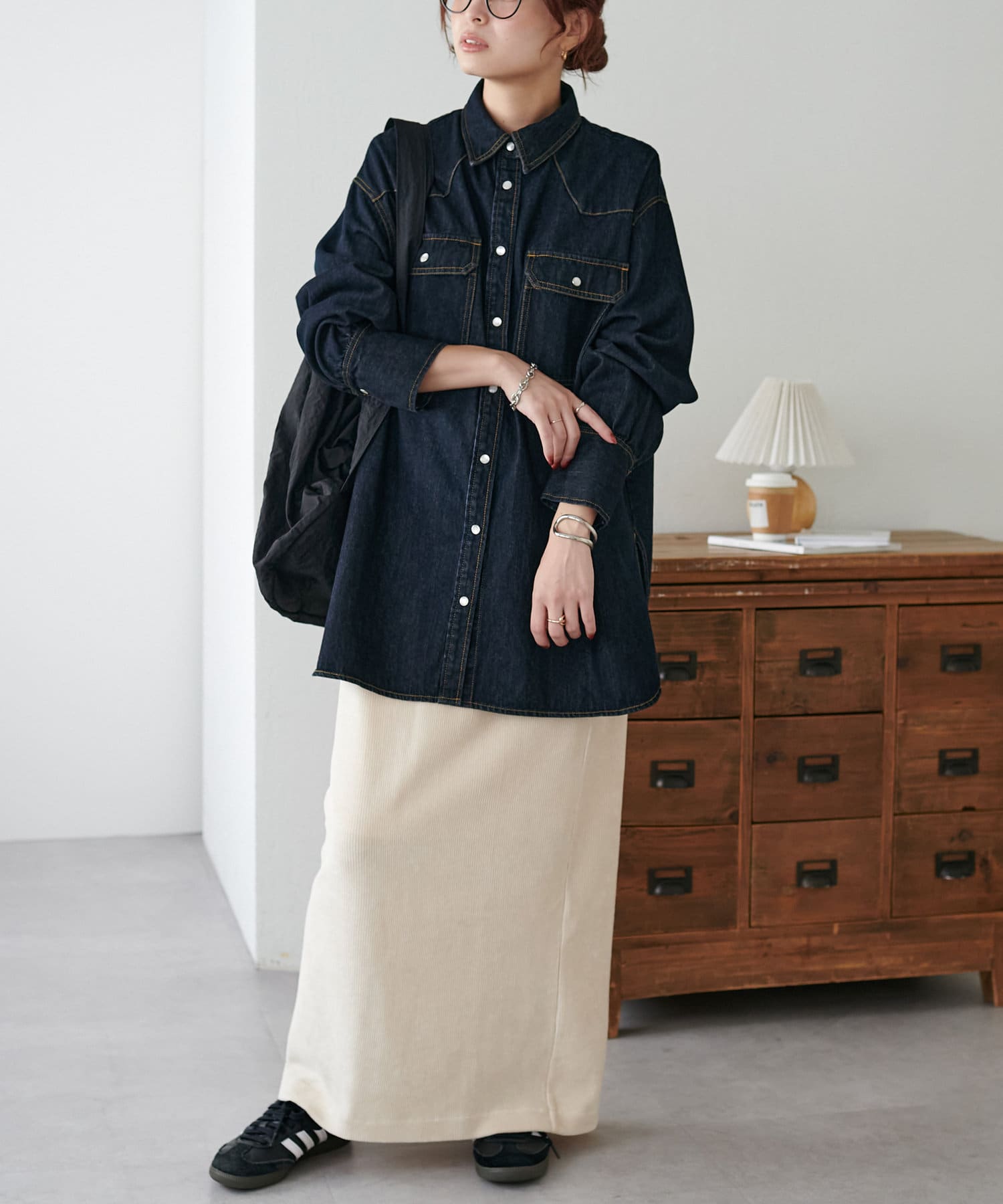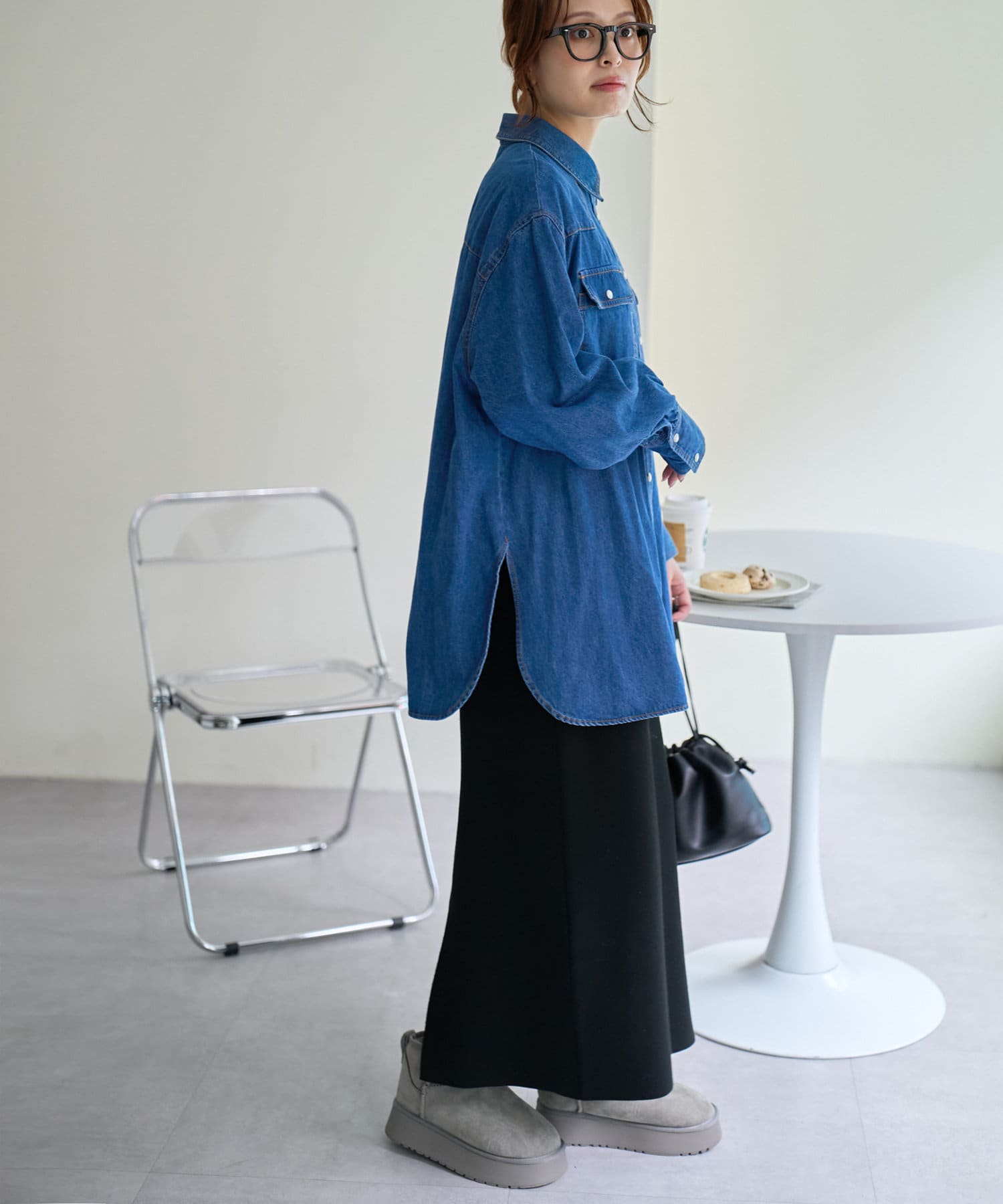 155cmスタッフ:定番のデニムシャツはお尻まで隠れる丈感で、体型カバーにも〇