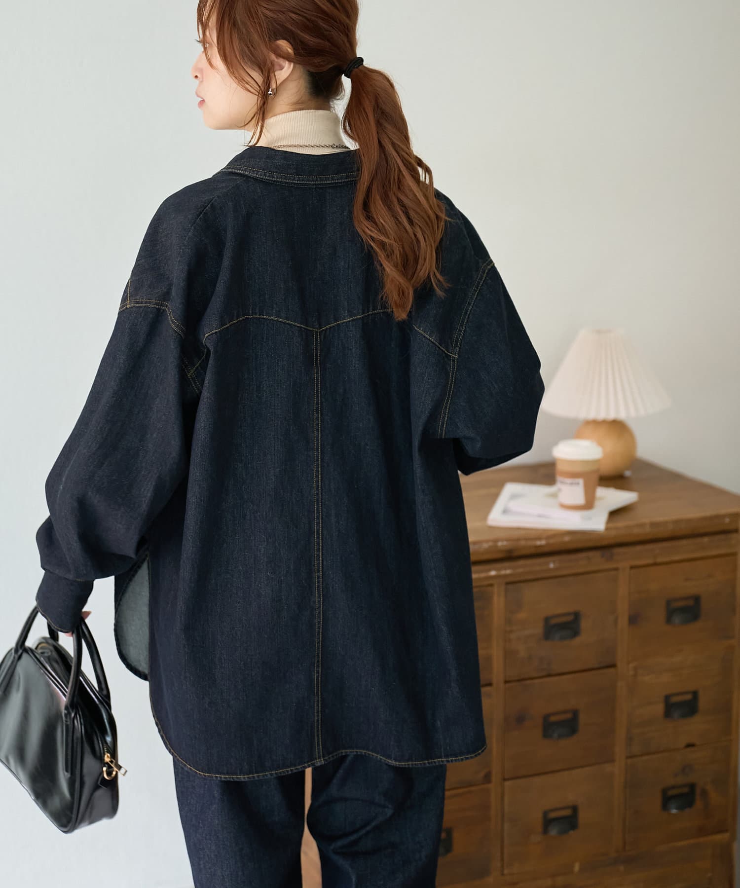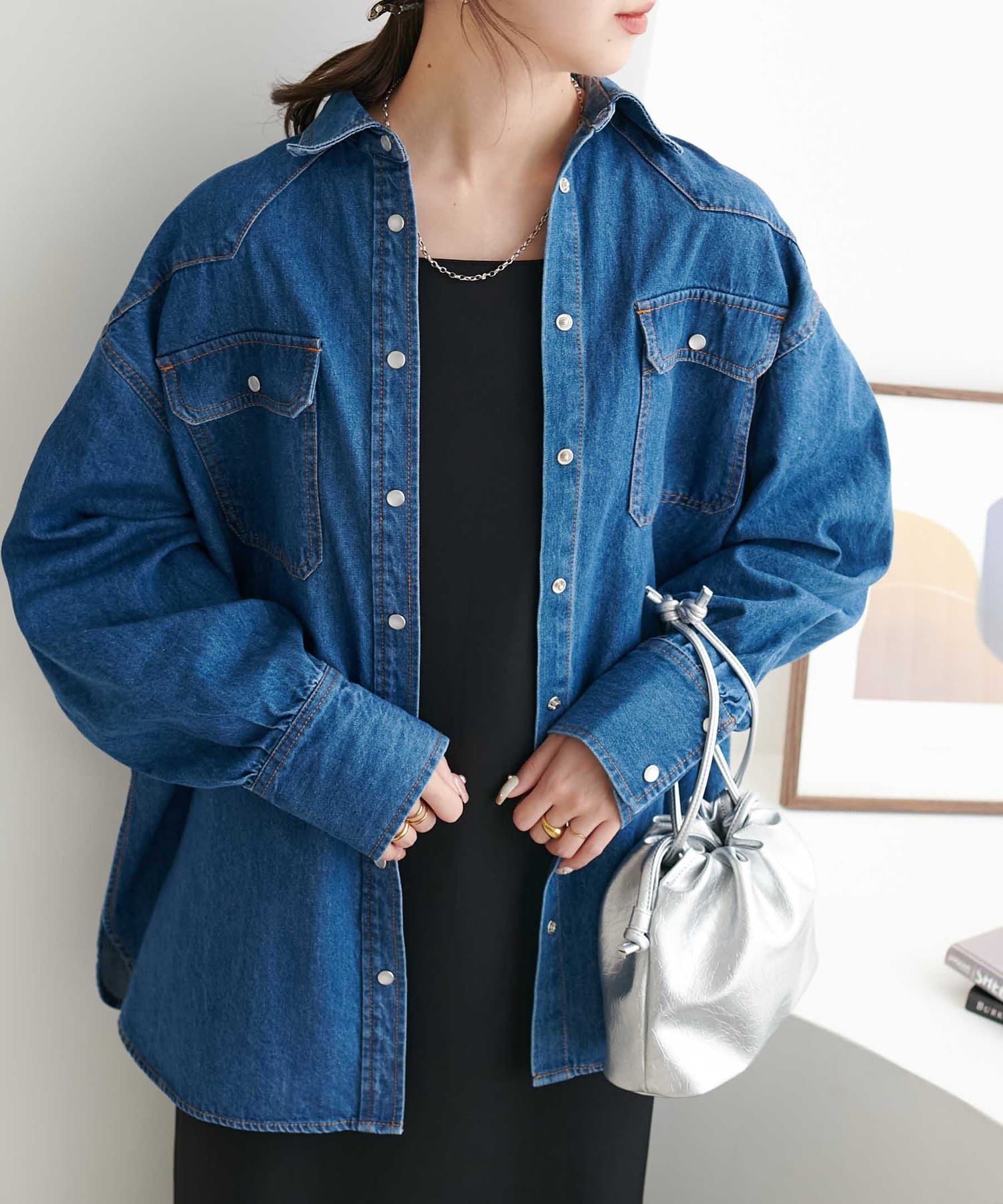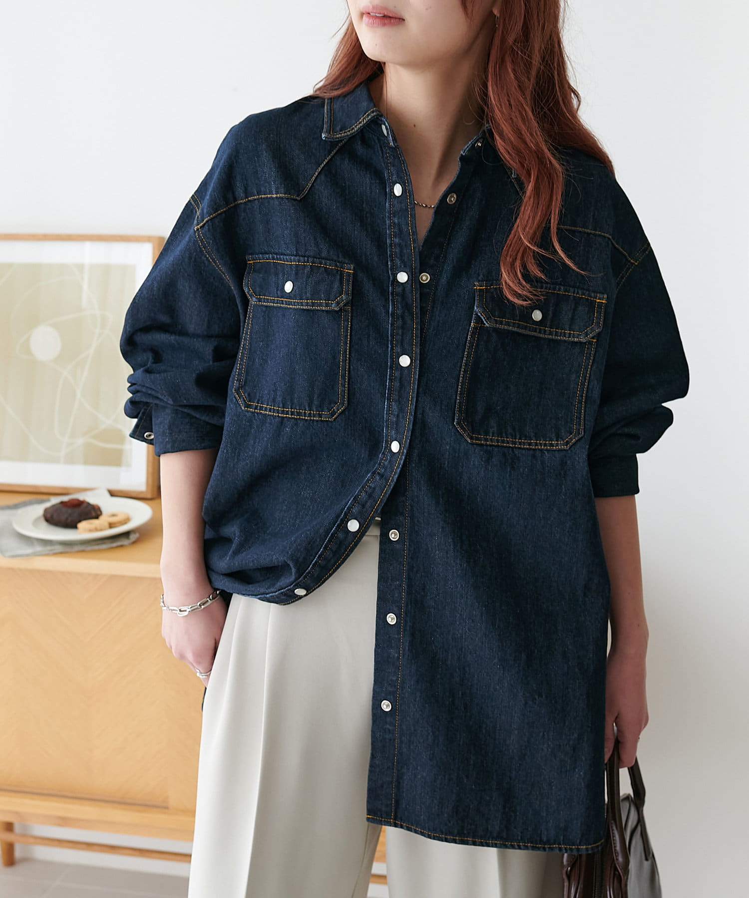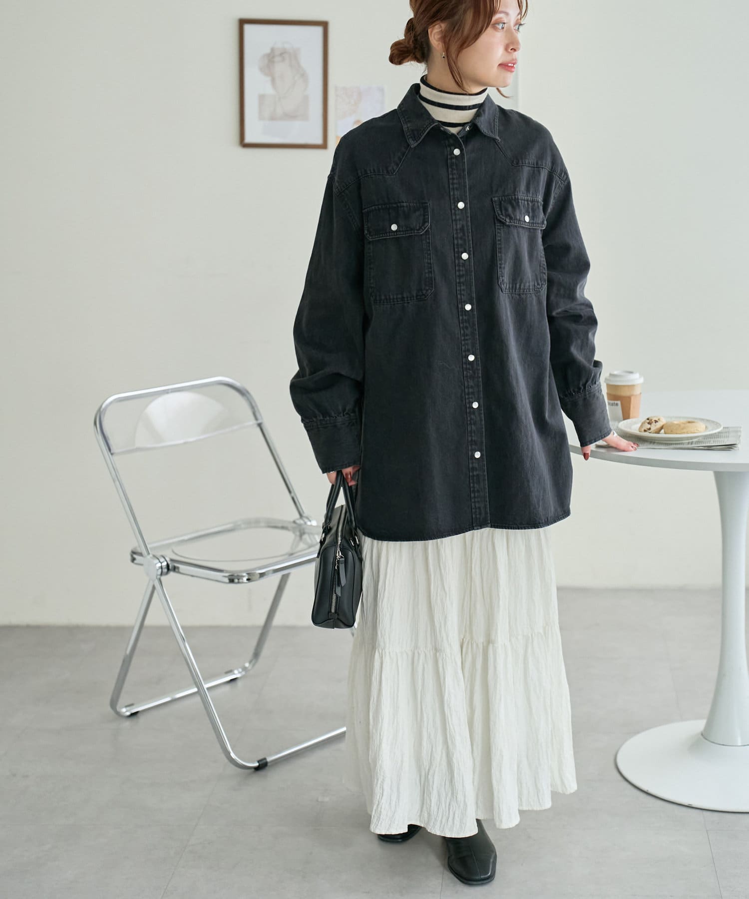 155cmスタッフ:定番のデニムシャツはお尻まで隠れる丈感で、体型カバーにも〇