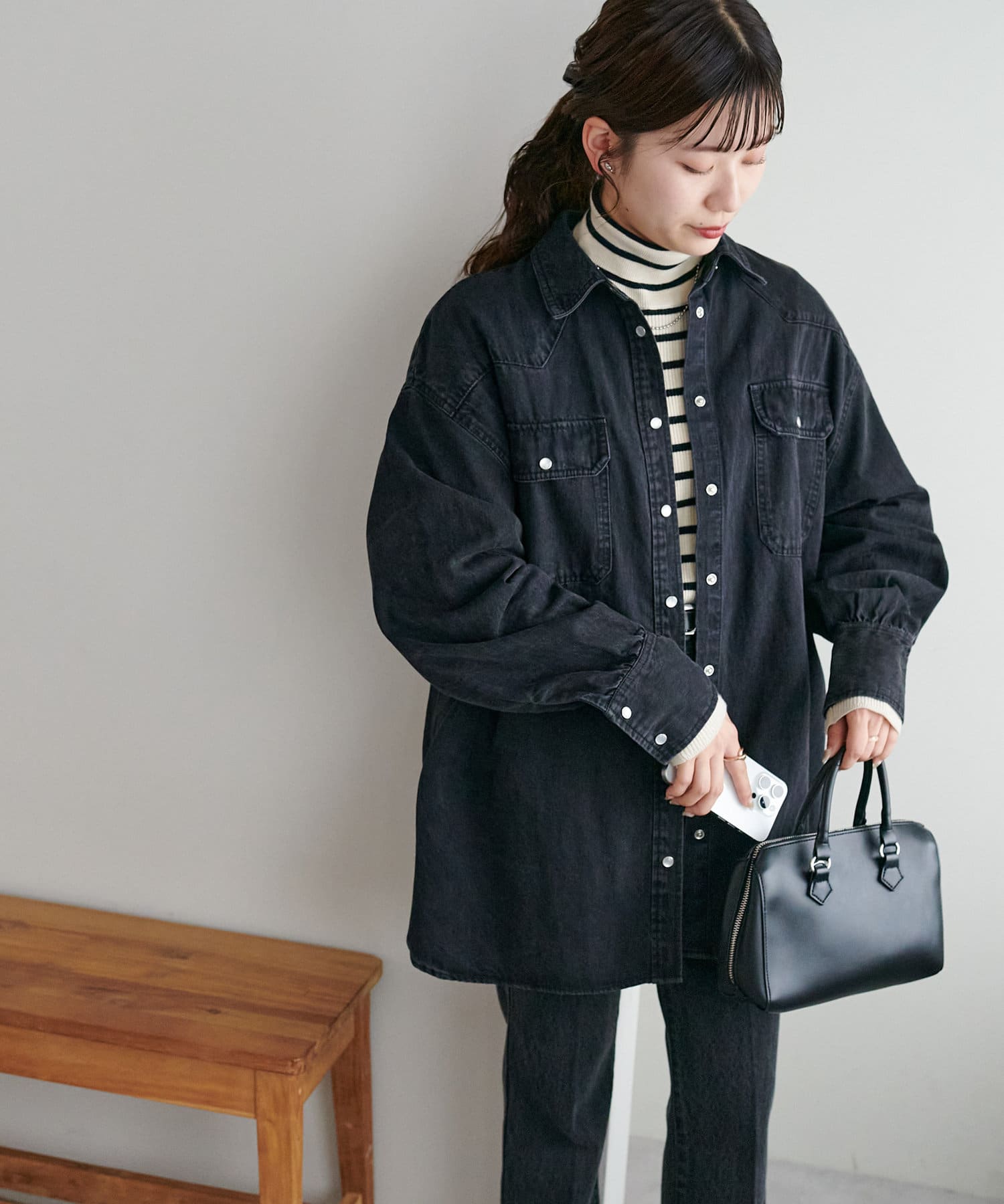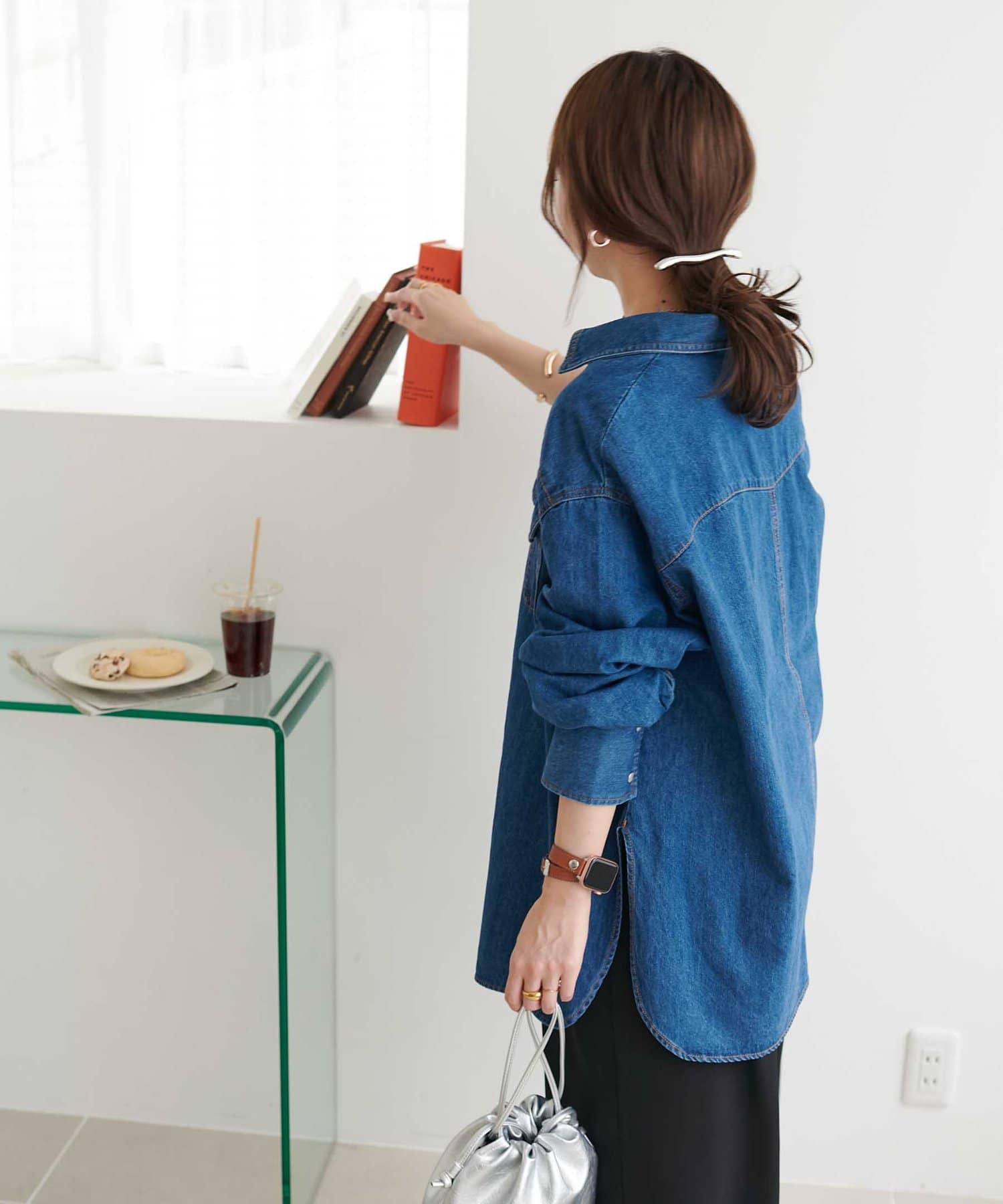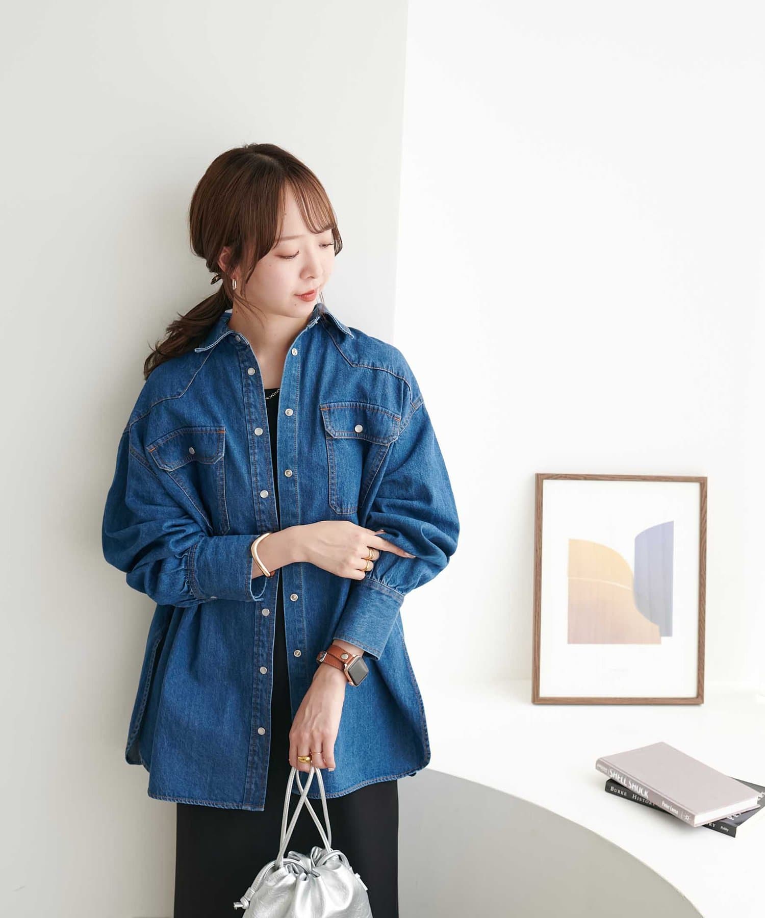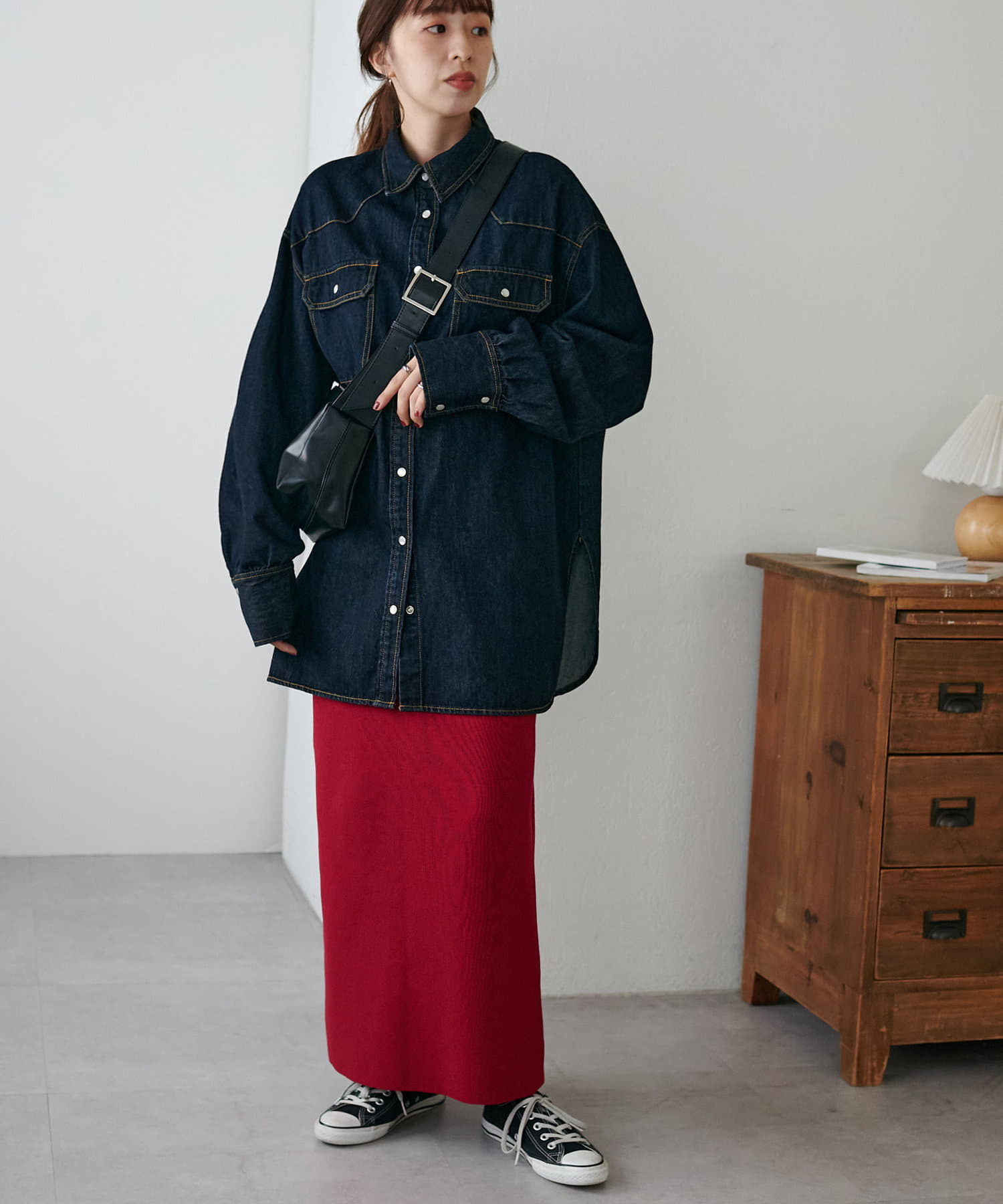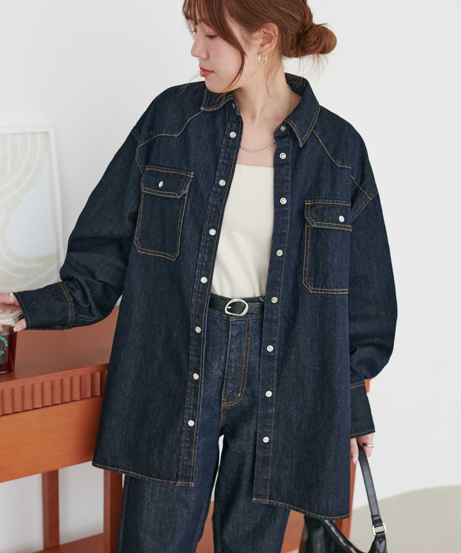 155cmスタッフ:定番のデニムシャツはお尻まで隠れる丈感で、体型カバーにも〇