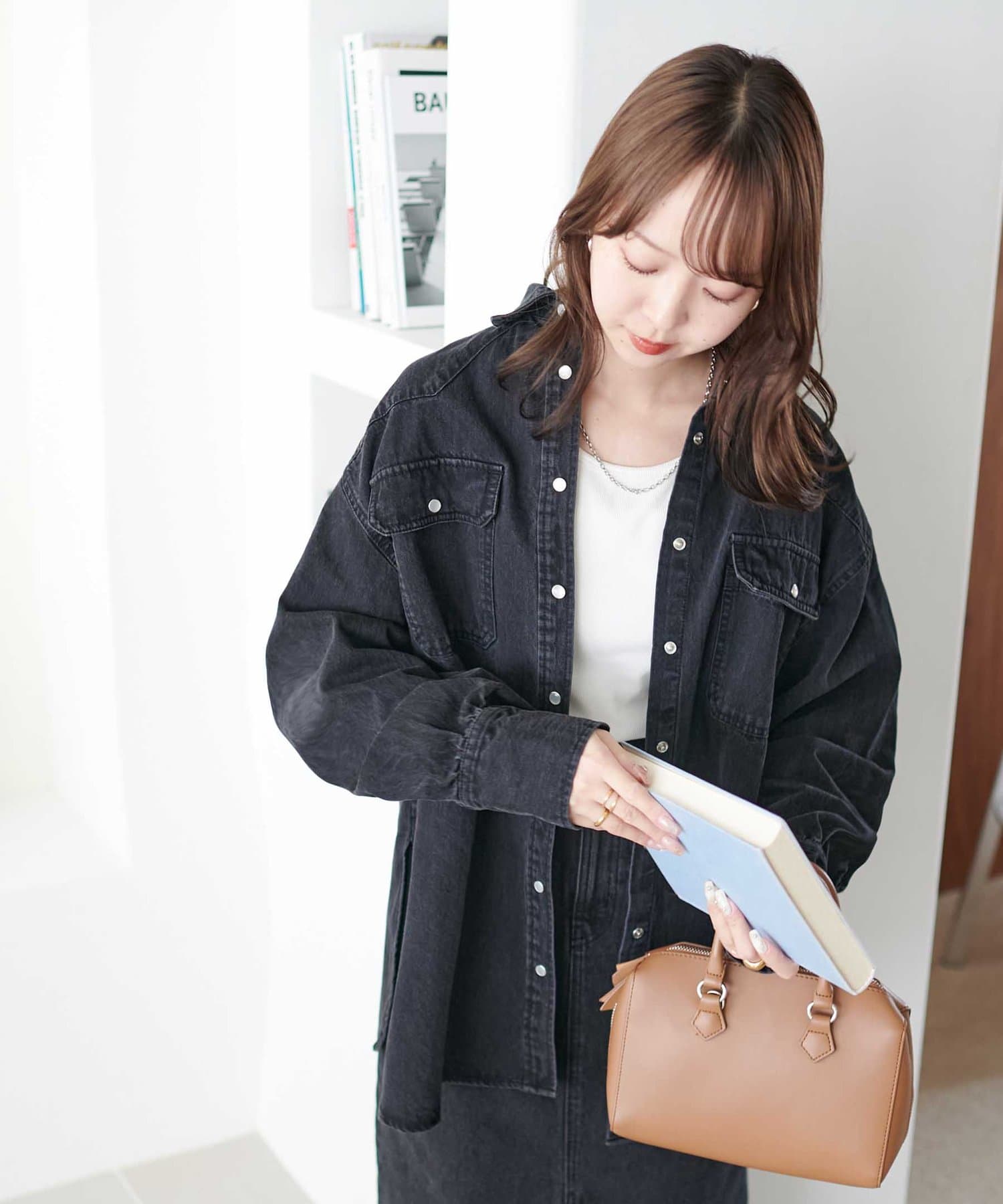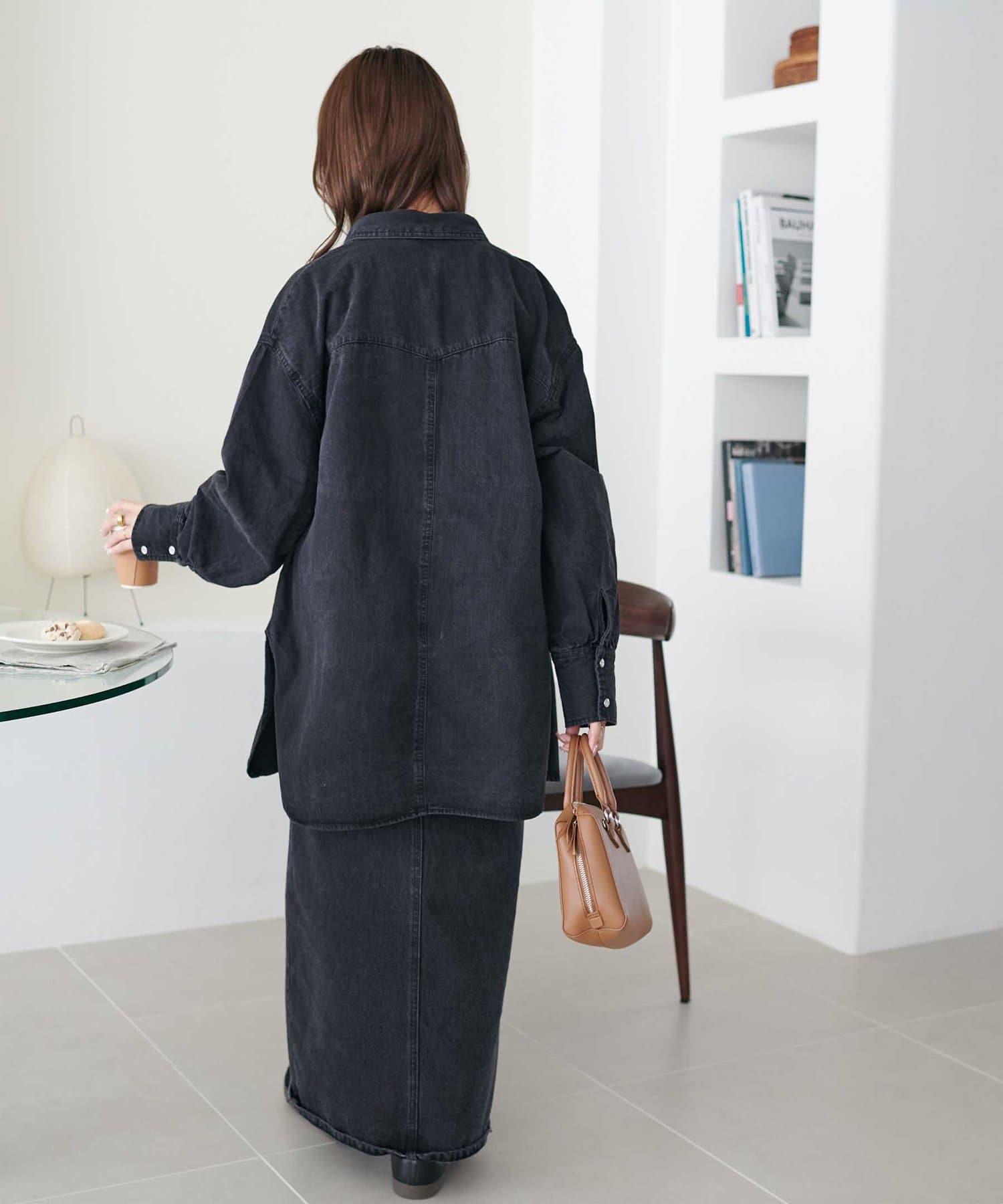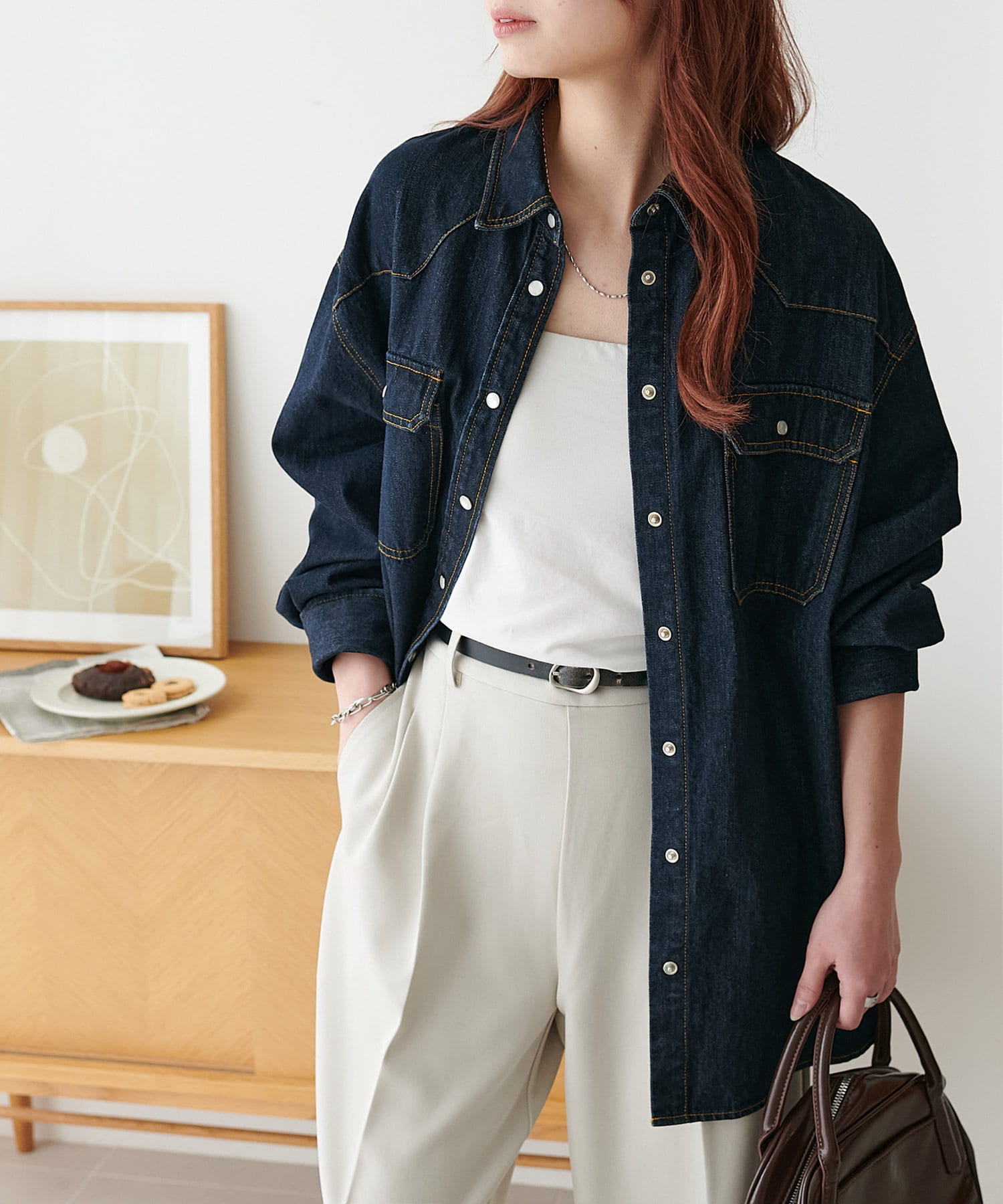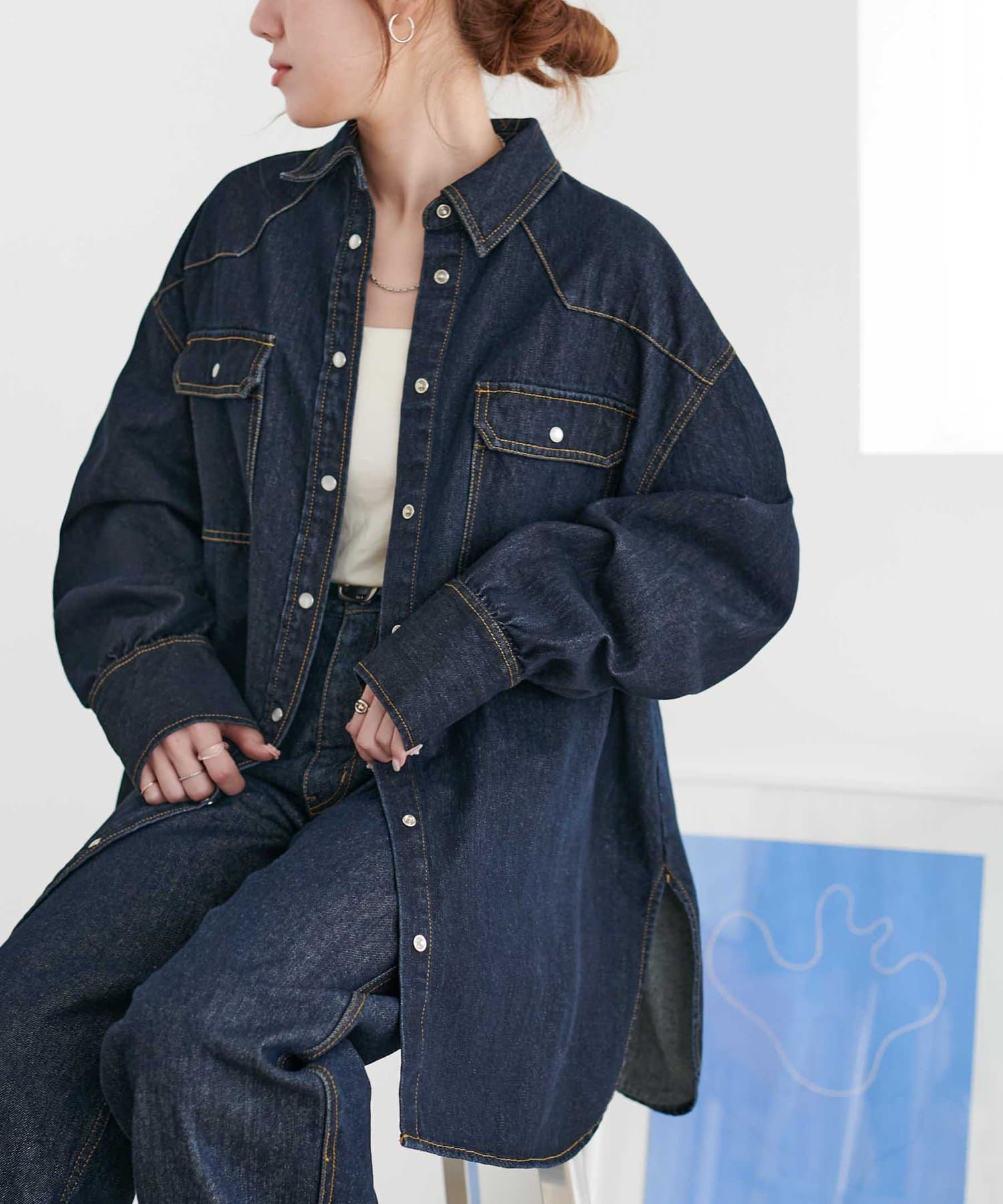 155cmスタッフ:定番のデニムシャツはお尻まで隠れる丈感で、体型カバーにも〇