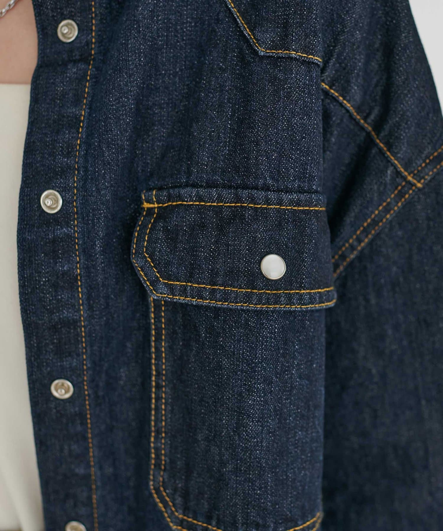普段使いしやすいデニムシャツですが、肩の切り替え部分やフラップのついたポケットが遊び心をプラス〇