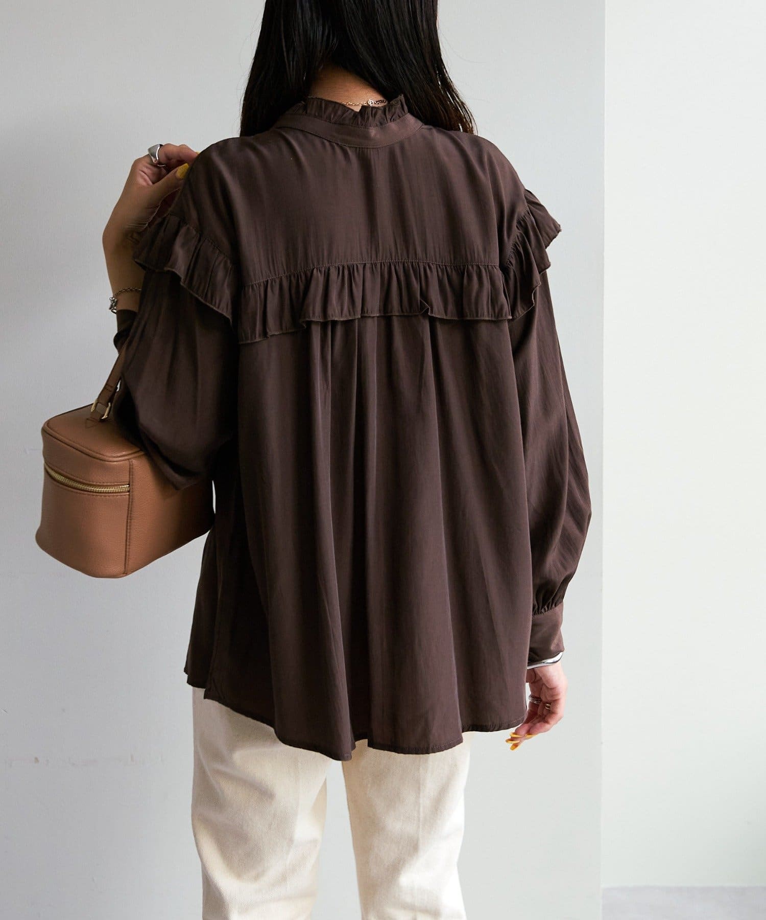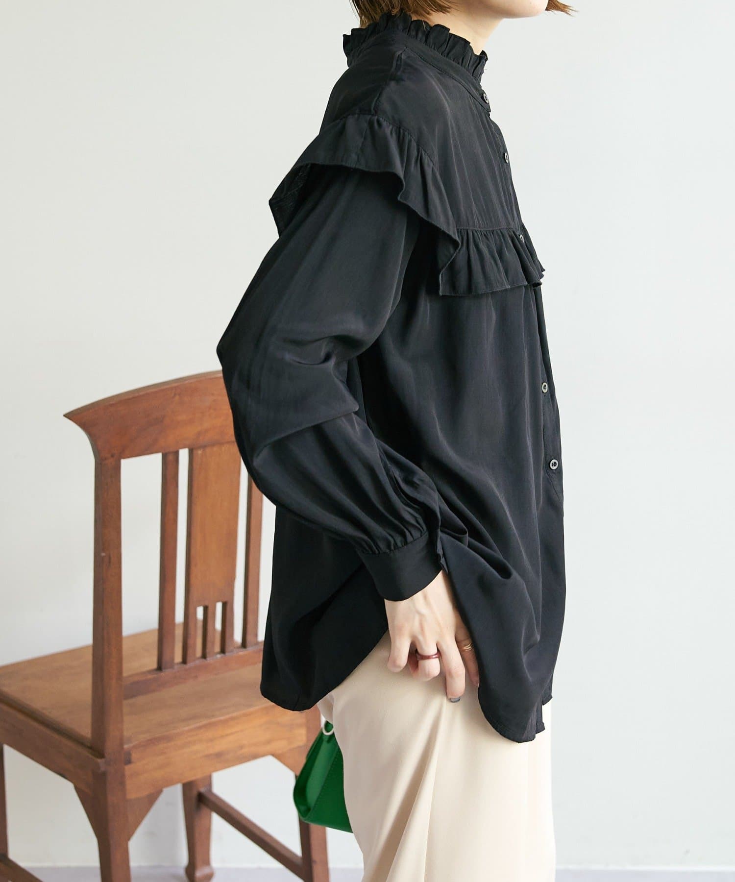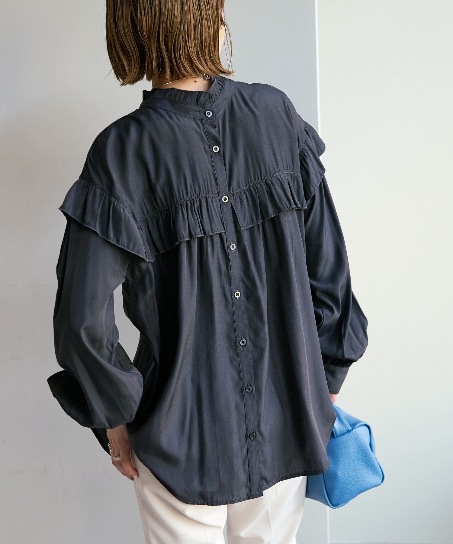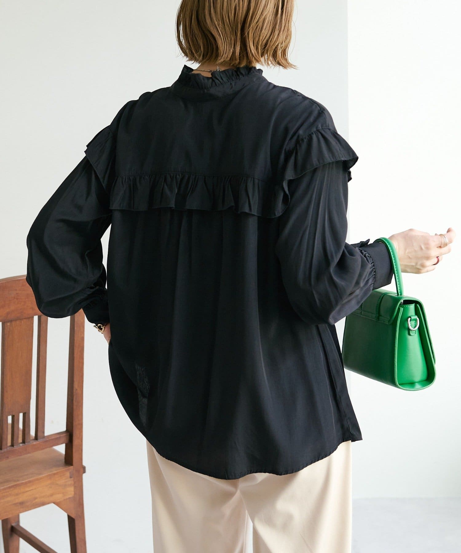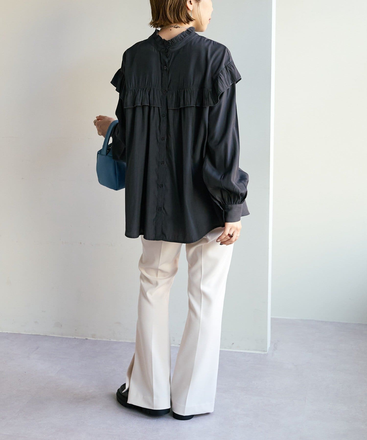155cmスタッフ:前後どちらでも着られるので、気分やコーディネートに合わせてアレンジできます。肩やネックのフリルが華やかで、大人っぽい甘さをプラスしてくれます♪