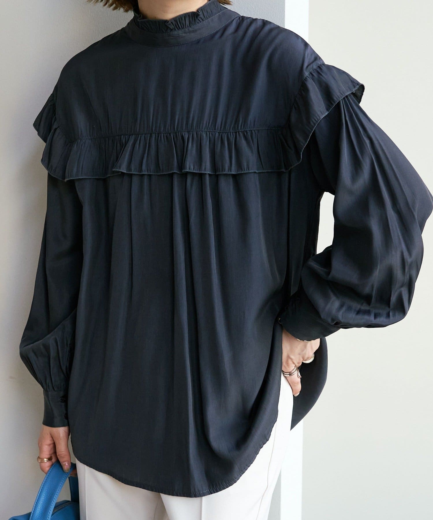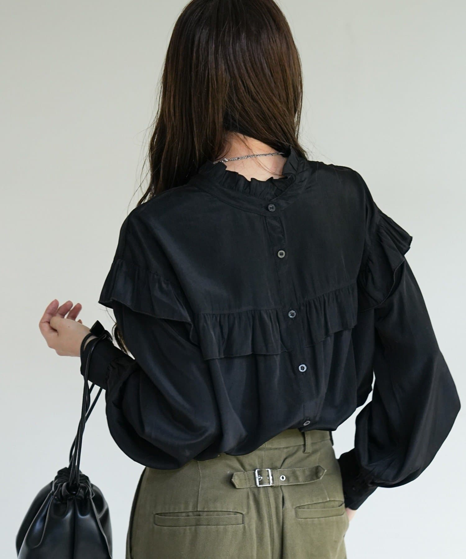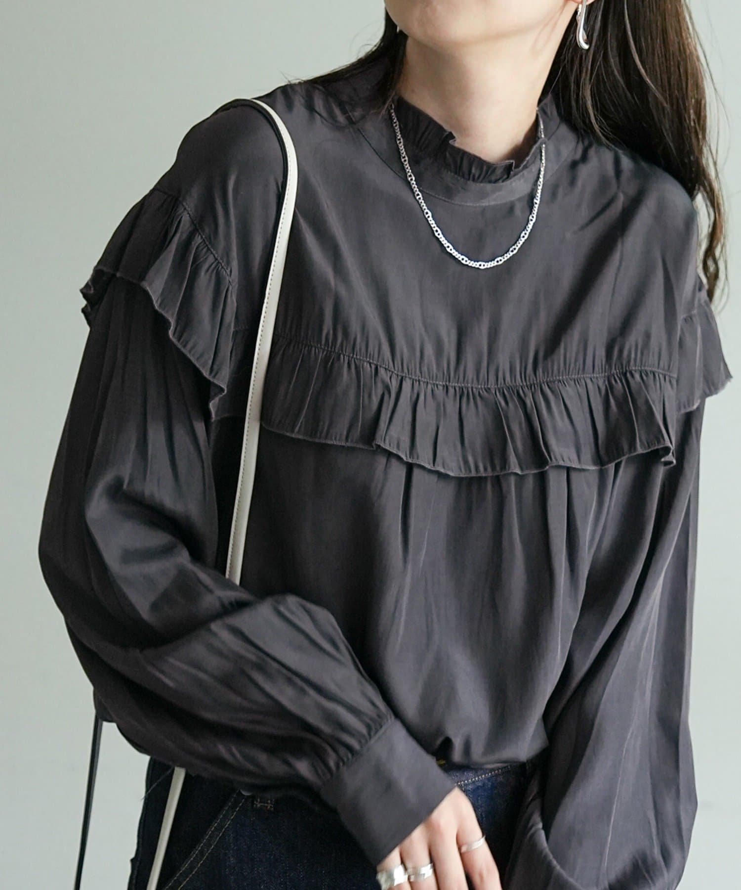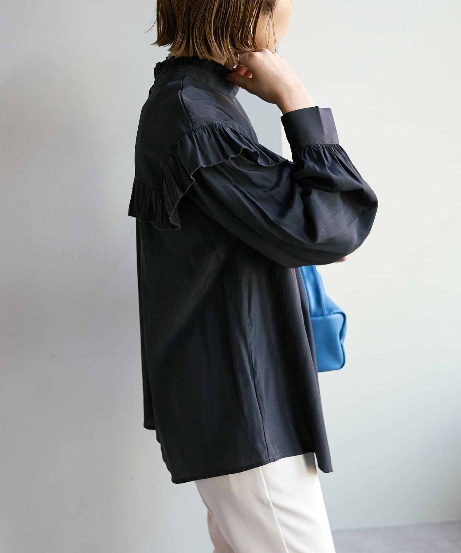 155cmスタッフ:前後どちらでも着られるので、気分やコーディネートに合わせてアレンジできます。肩やネックのフリルが華やかで、大人っぽい甘さをプラスしてくれます♪