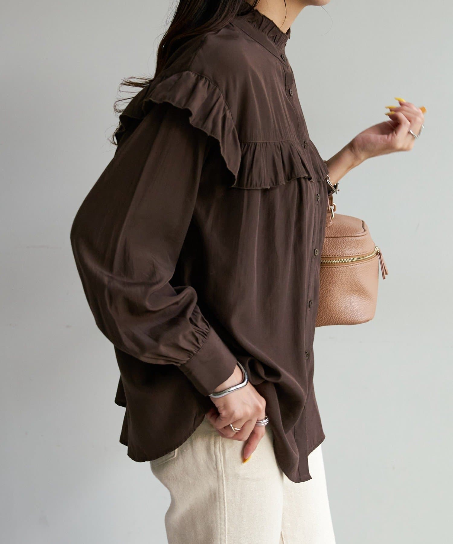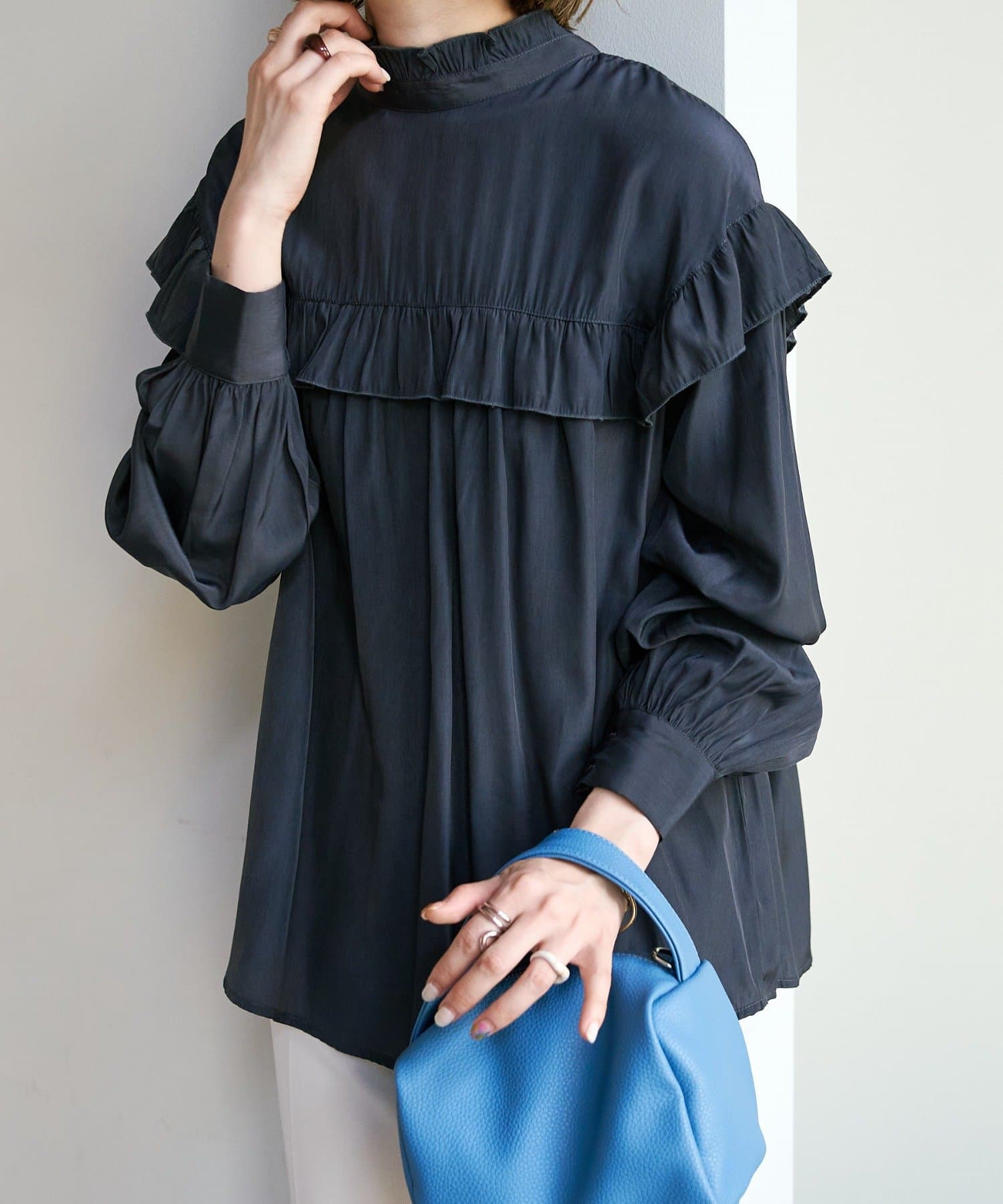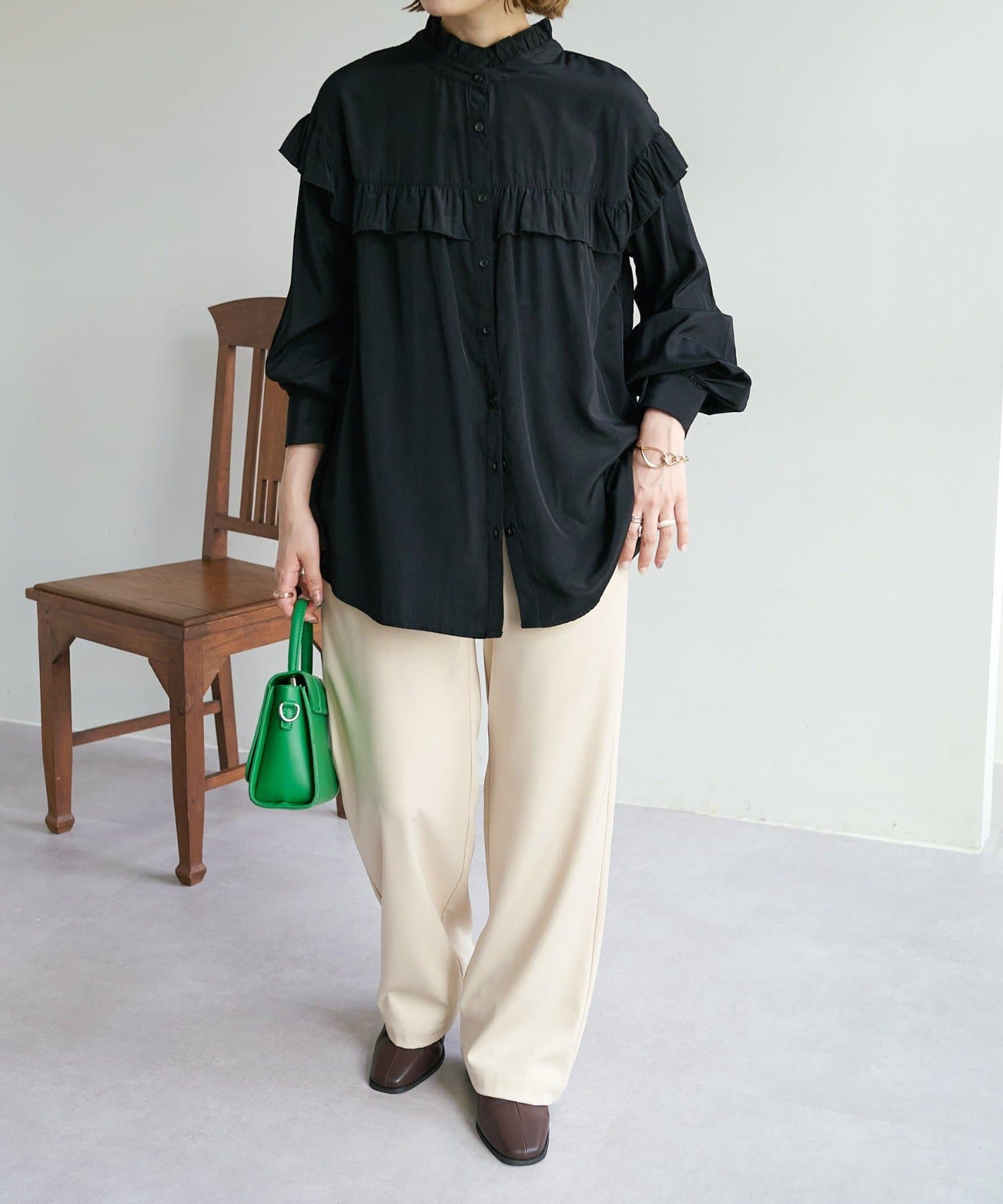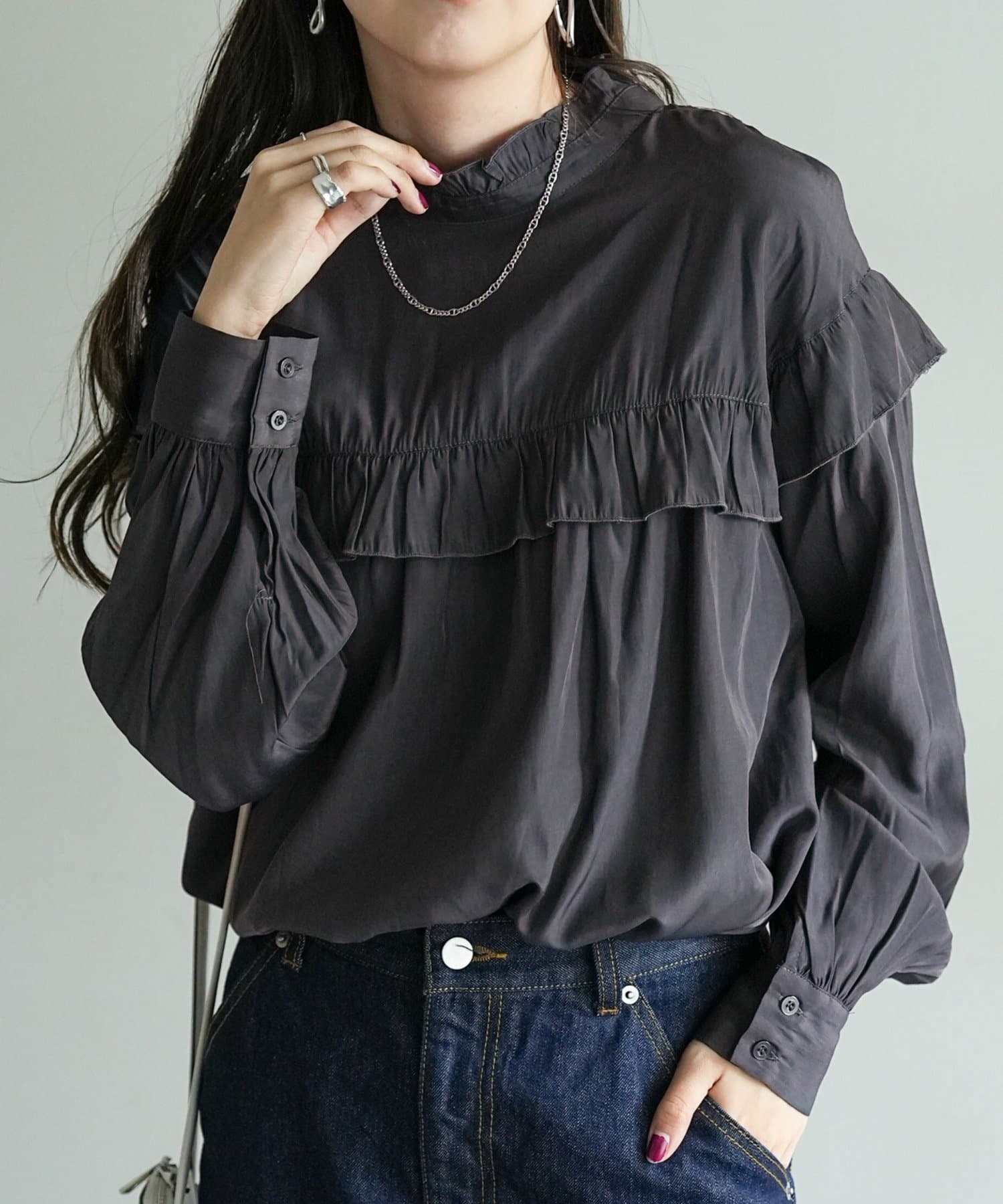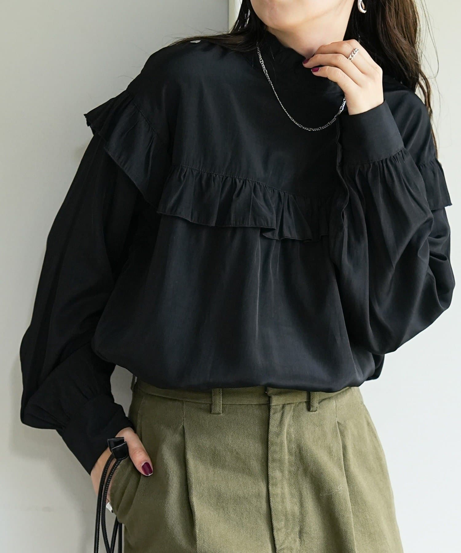 155cmスタッフ:前後どちらでも着られるので、気分やコーディネートに合わせてアレンジできます。肩やネックのフリルが華やかで、大人っぽい甘さをプラスしてくれます♪