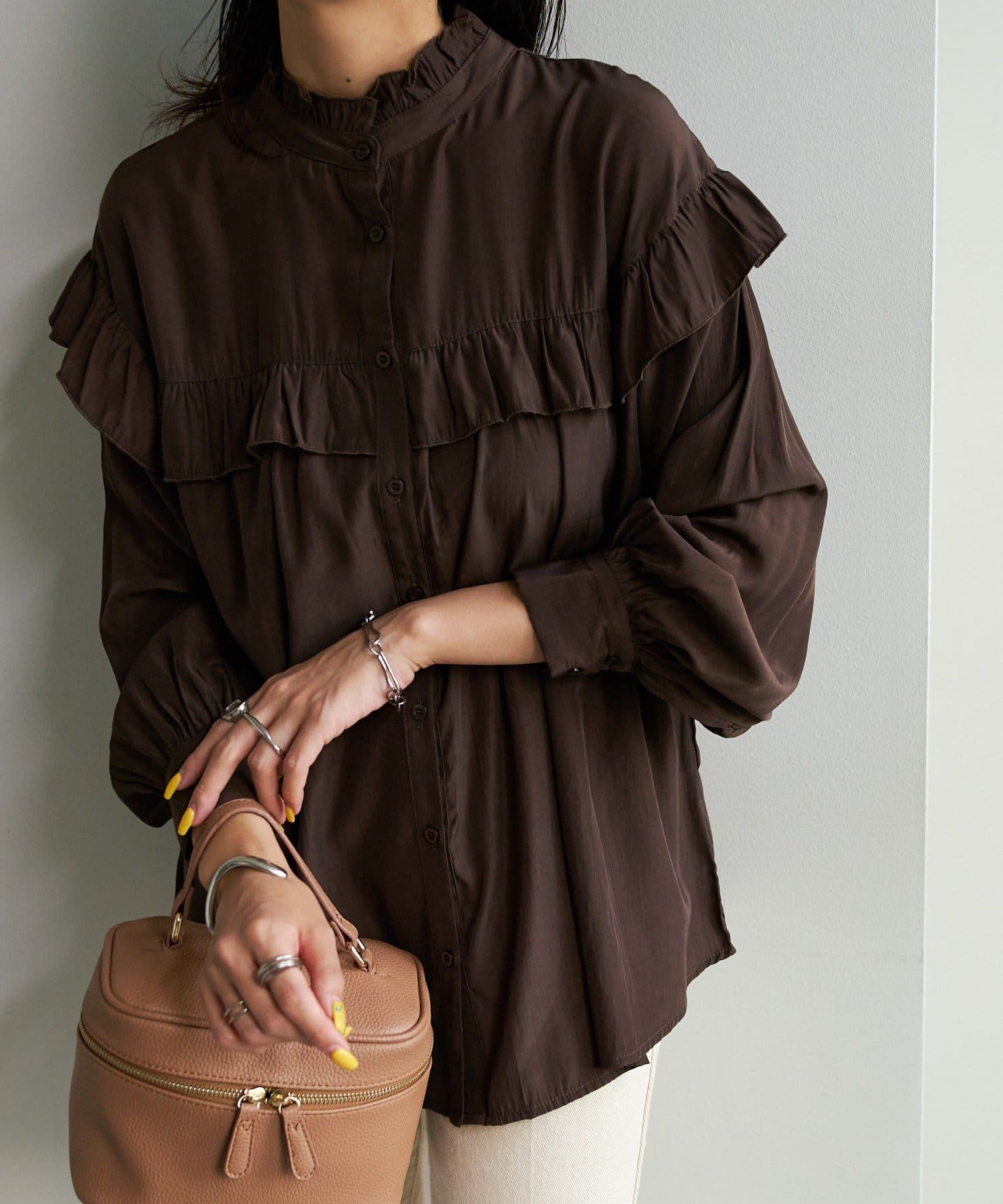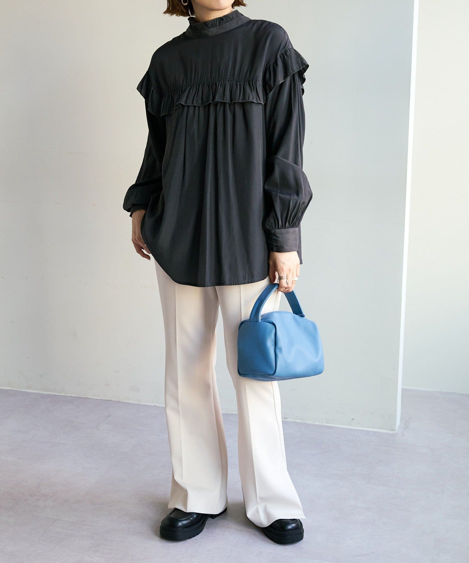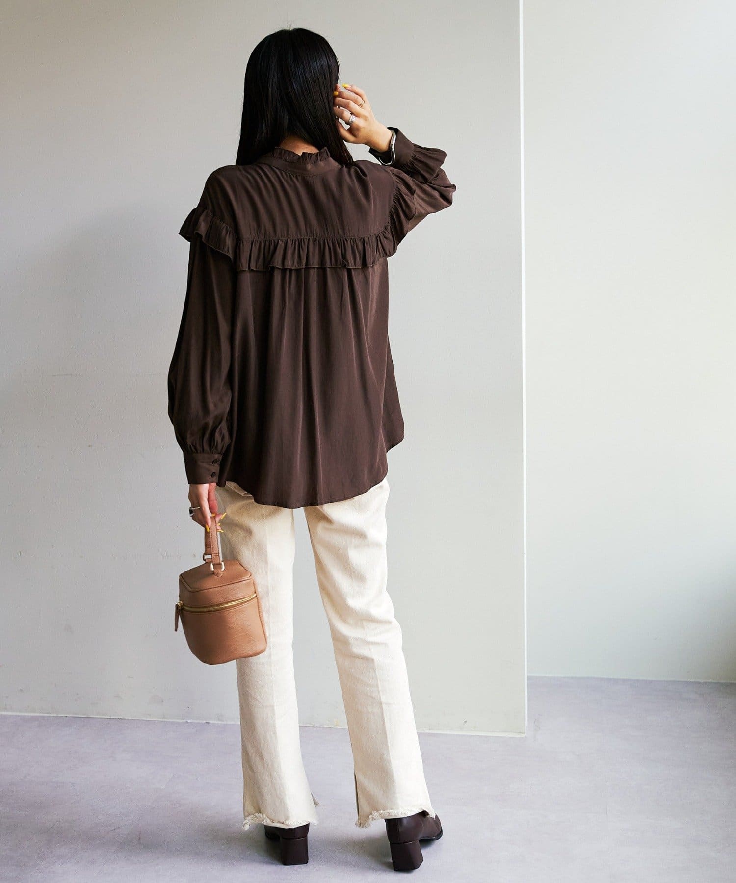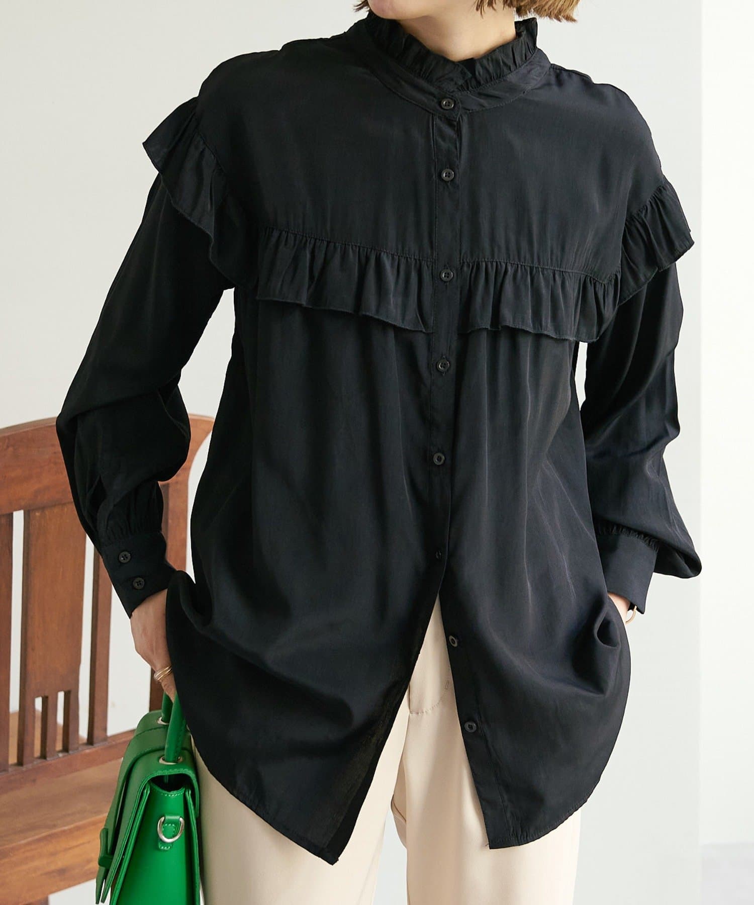 155cmスタッフ:前後どちらでも着られるので、気分やコーディネートに合わせてアレンジできます。肩やネックのフリルが華やかで、大人っぽい甘さをプラスしてくれます♪