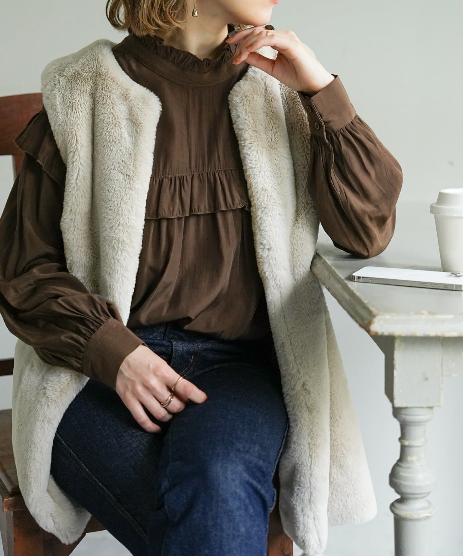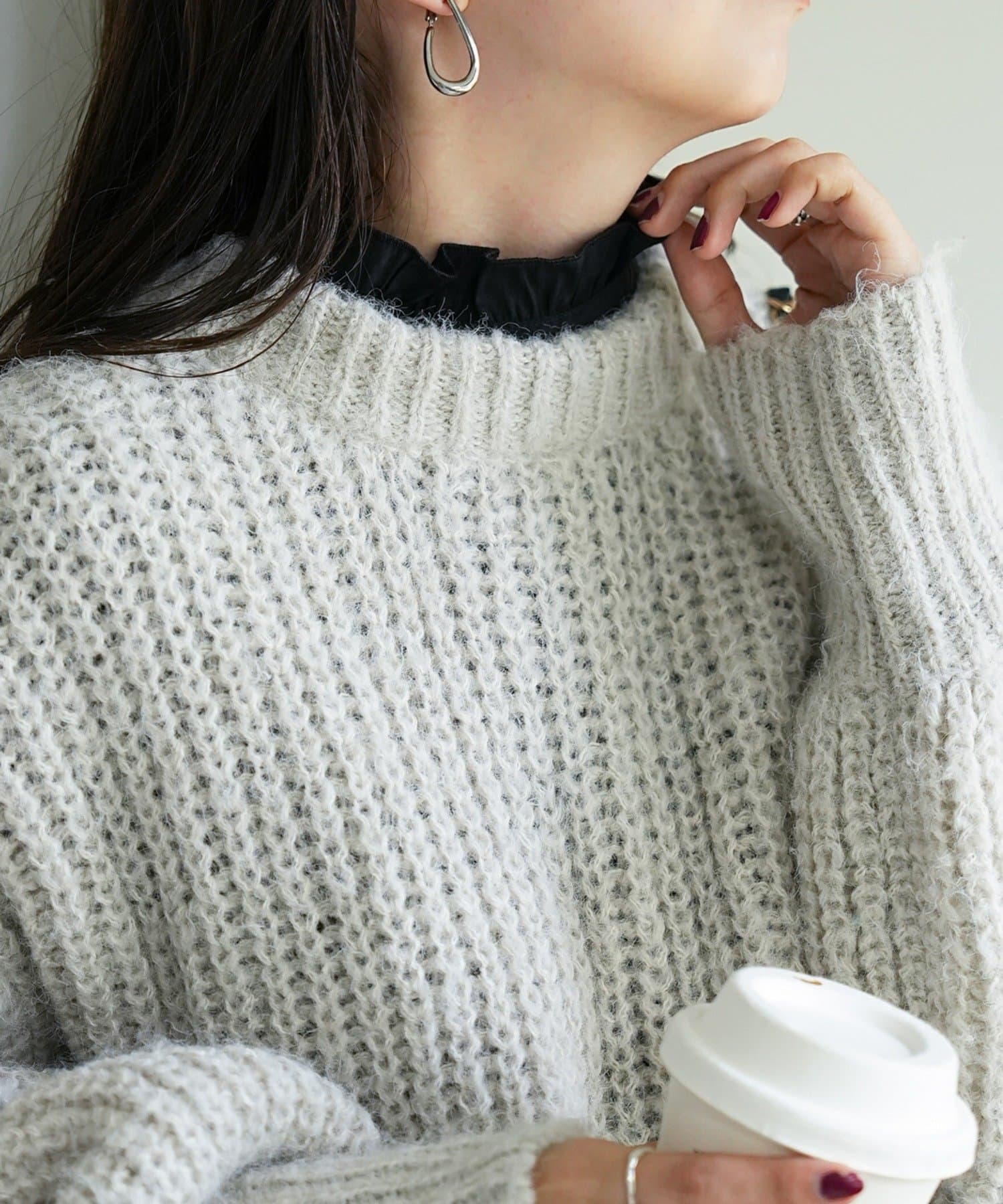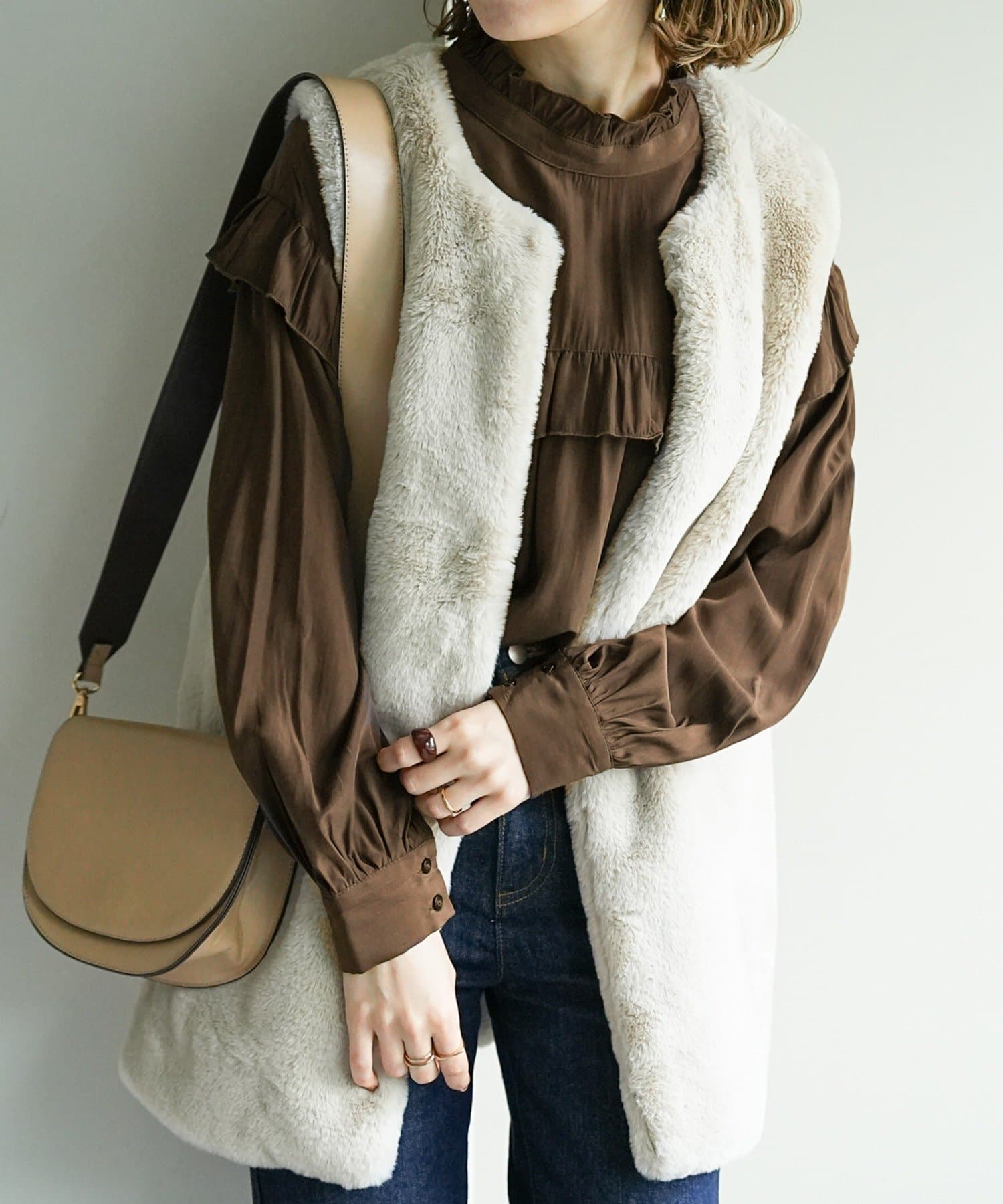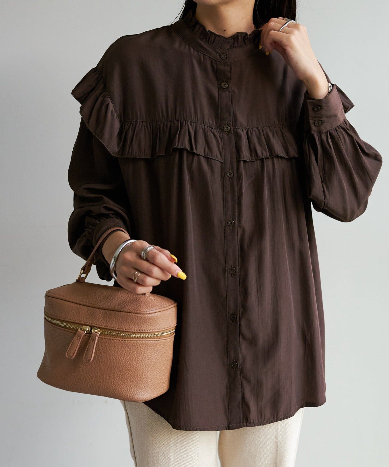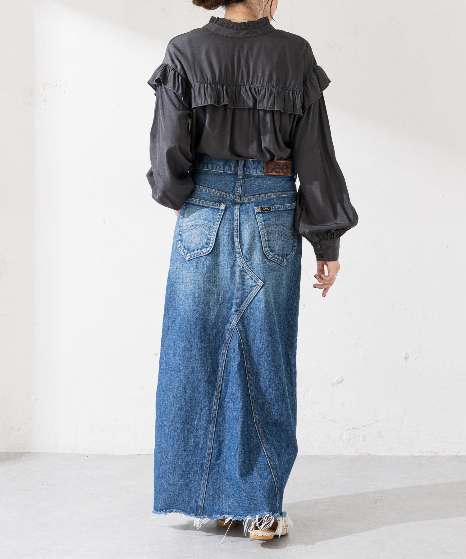 155cmスタッフ:前後どちらでも着られるので、気分やコーディネートに合わせてアレンジできます。肩やネックのフリルが華やかで、大人っぽい甘さをプラスしてくれます♪