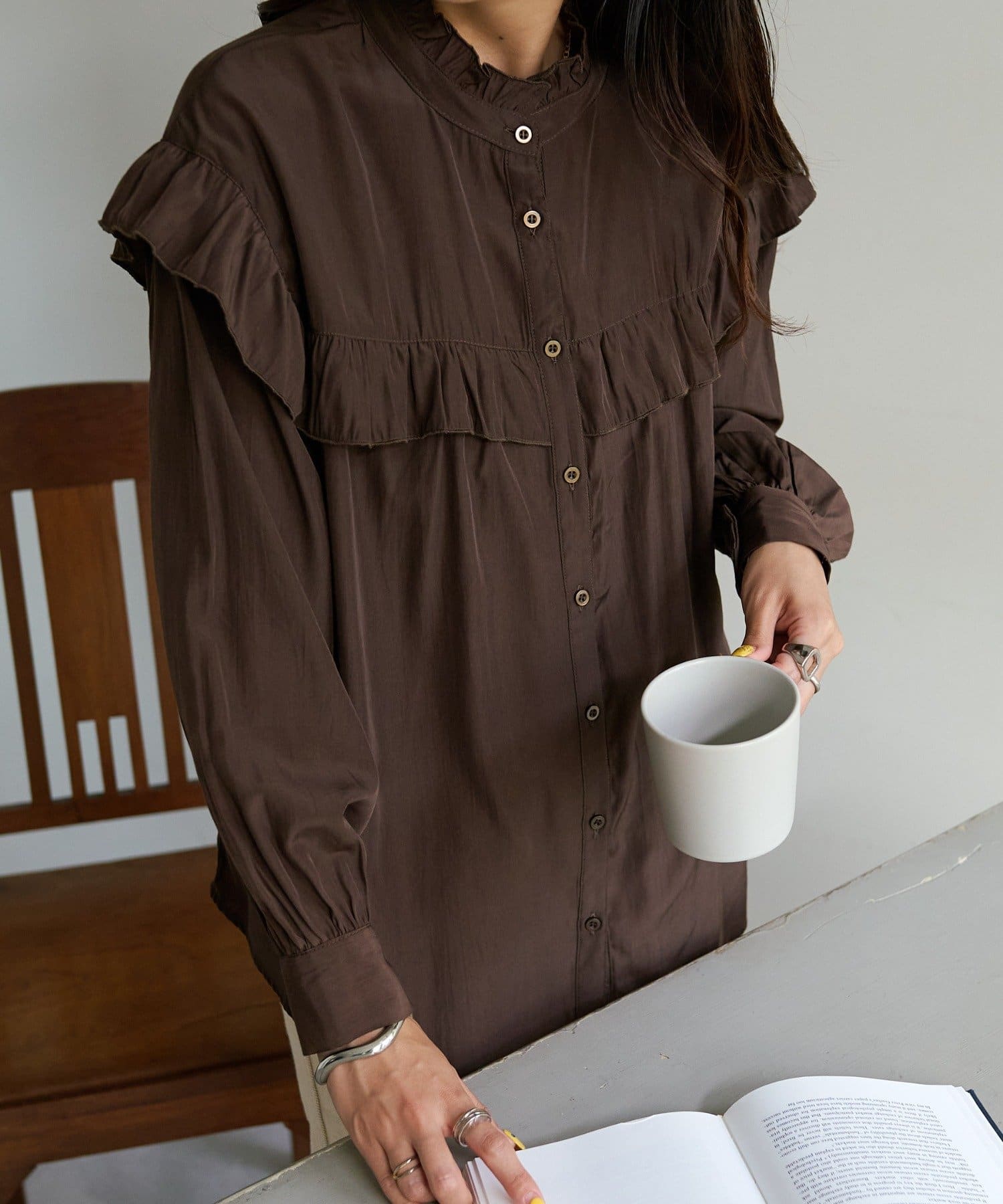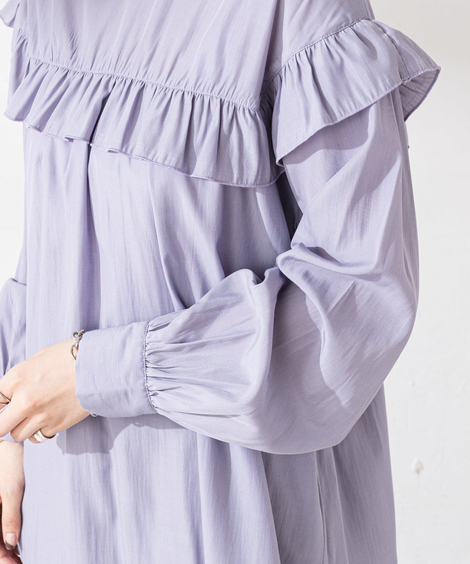・身頃・ネック・肩口のフリルデザインで大人っぽく華やかに
