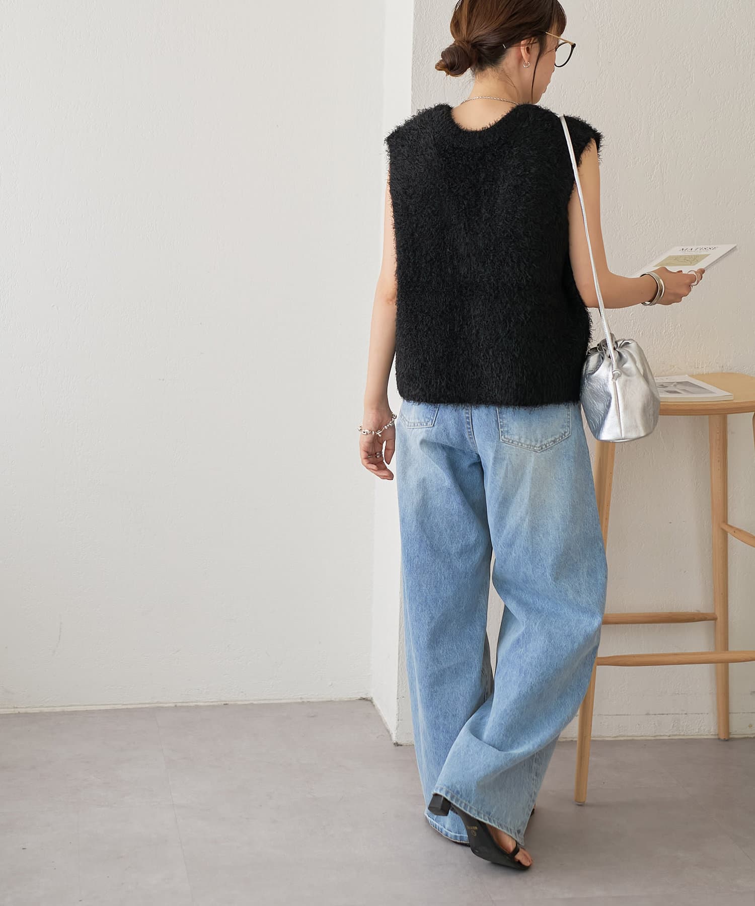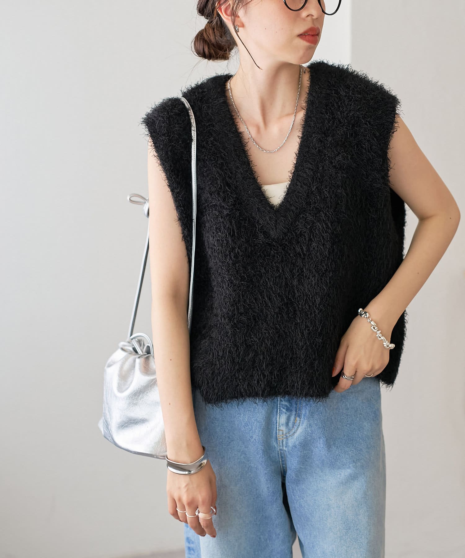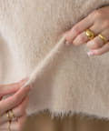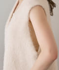 ふわふわとした毛足の長さが特徴のフェザー素材のショートベスト。