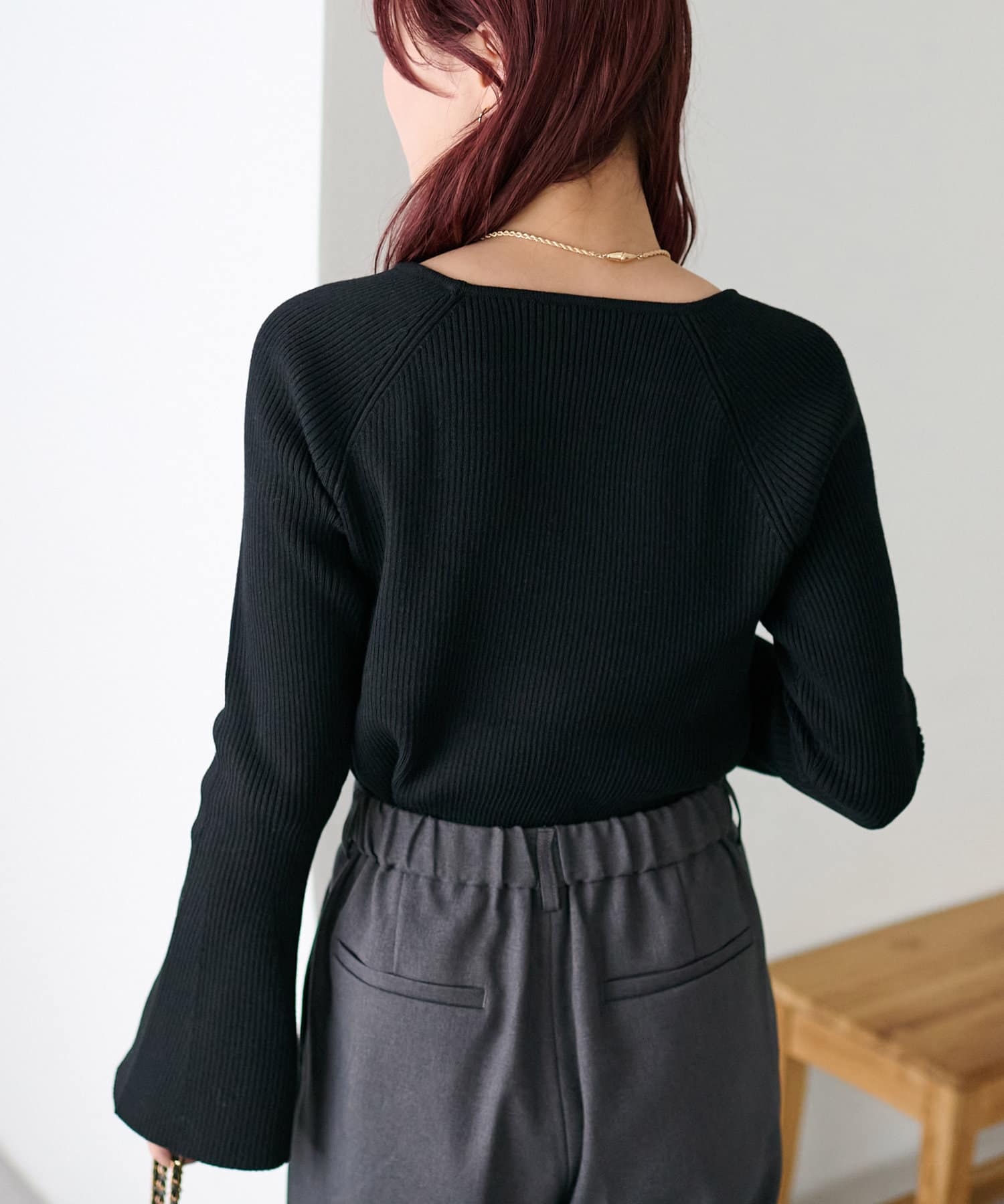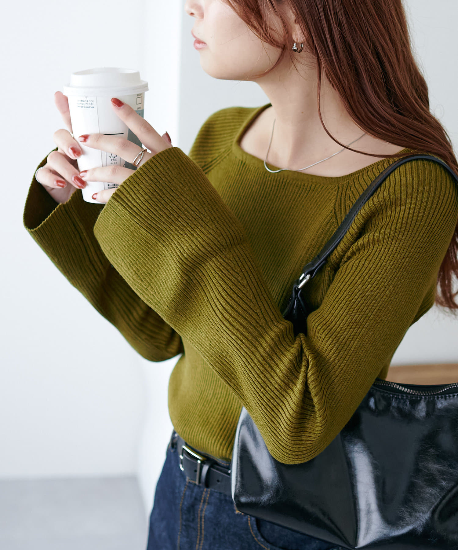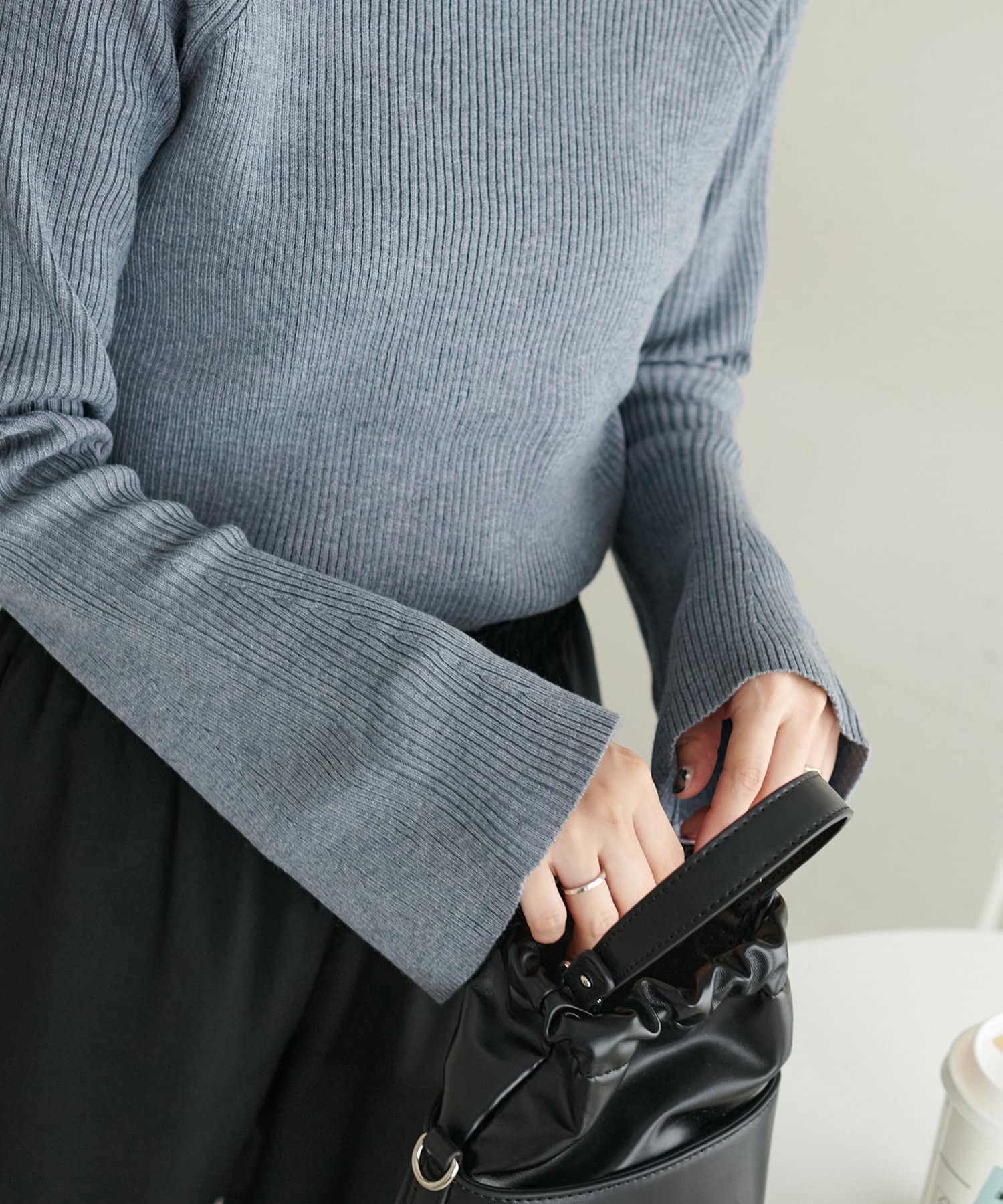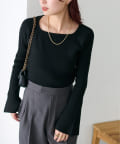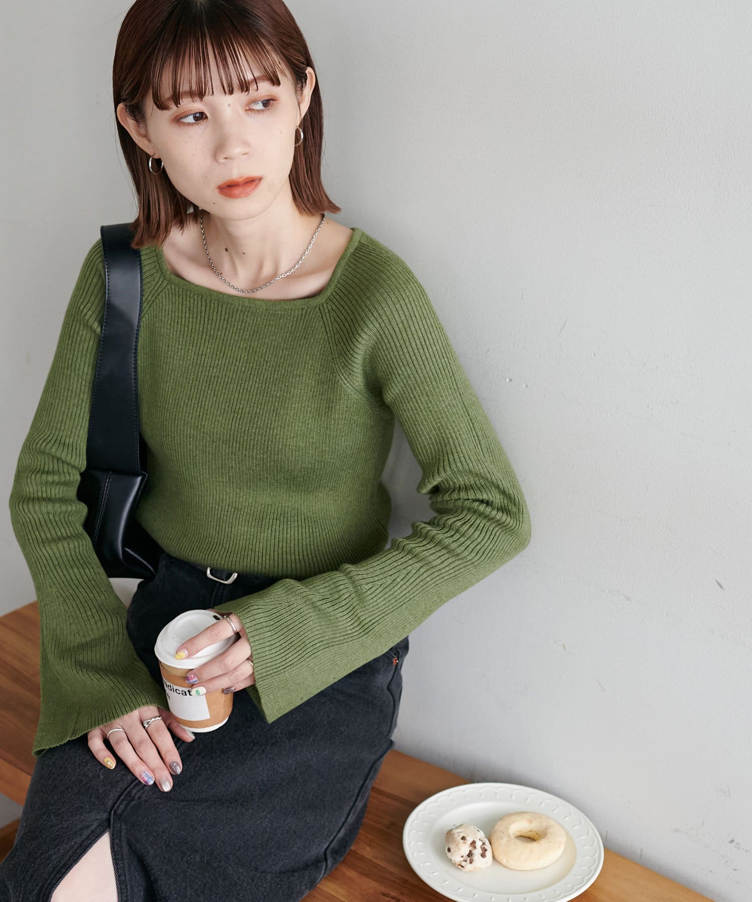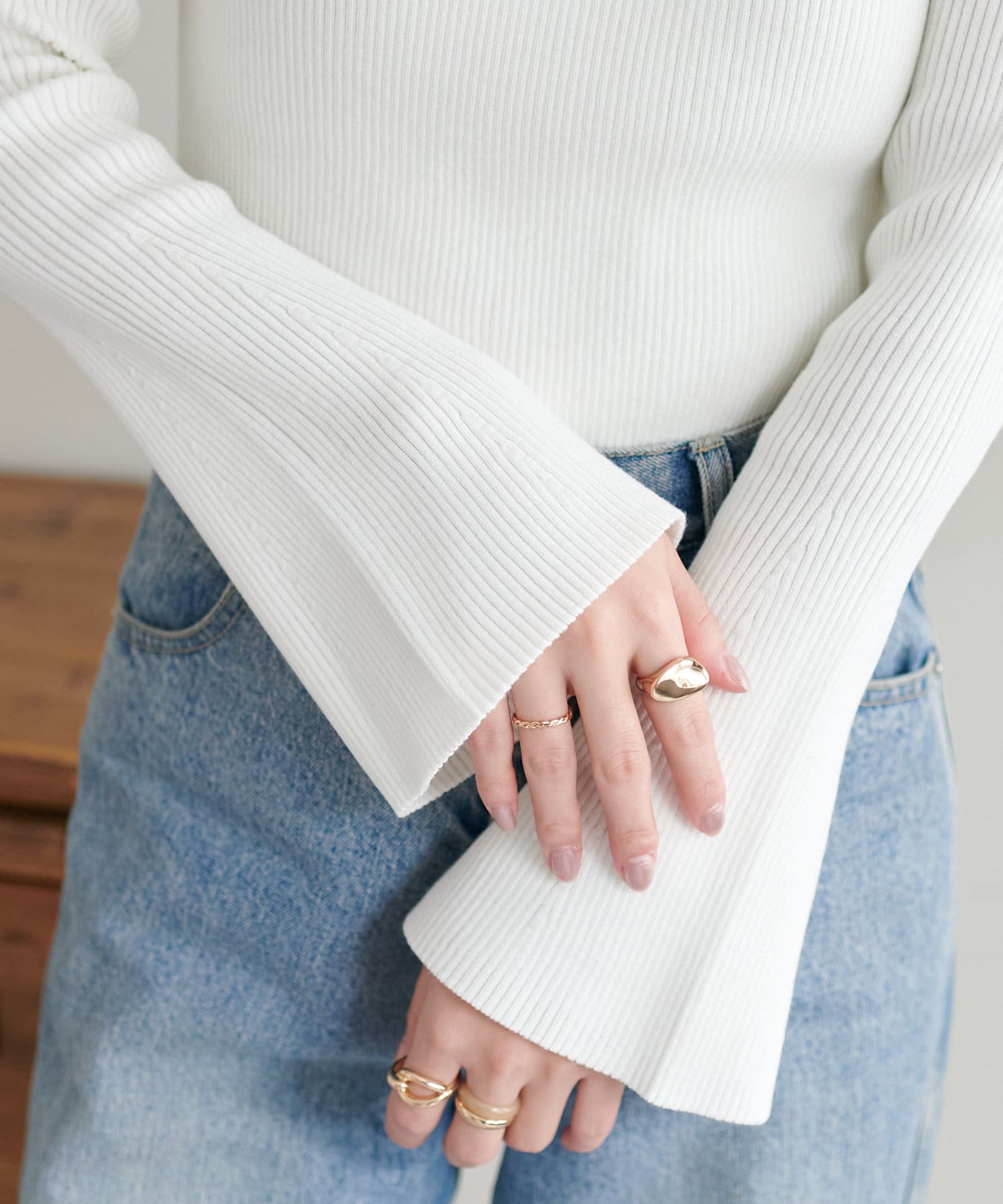 柔らかく伸縮性のある着心地のいいリブニット。袖口部分はフレアデザインなので1枚着でも様になります♪