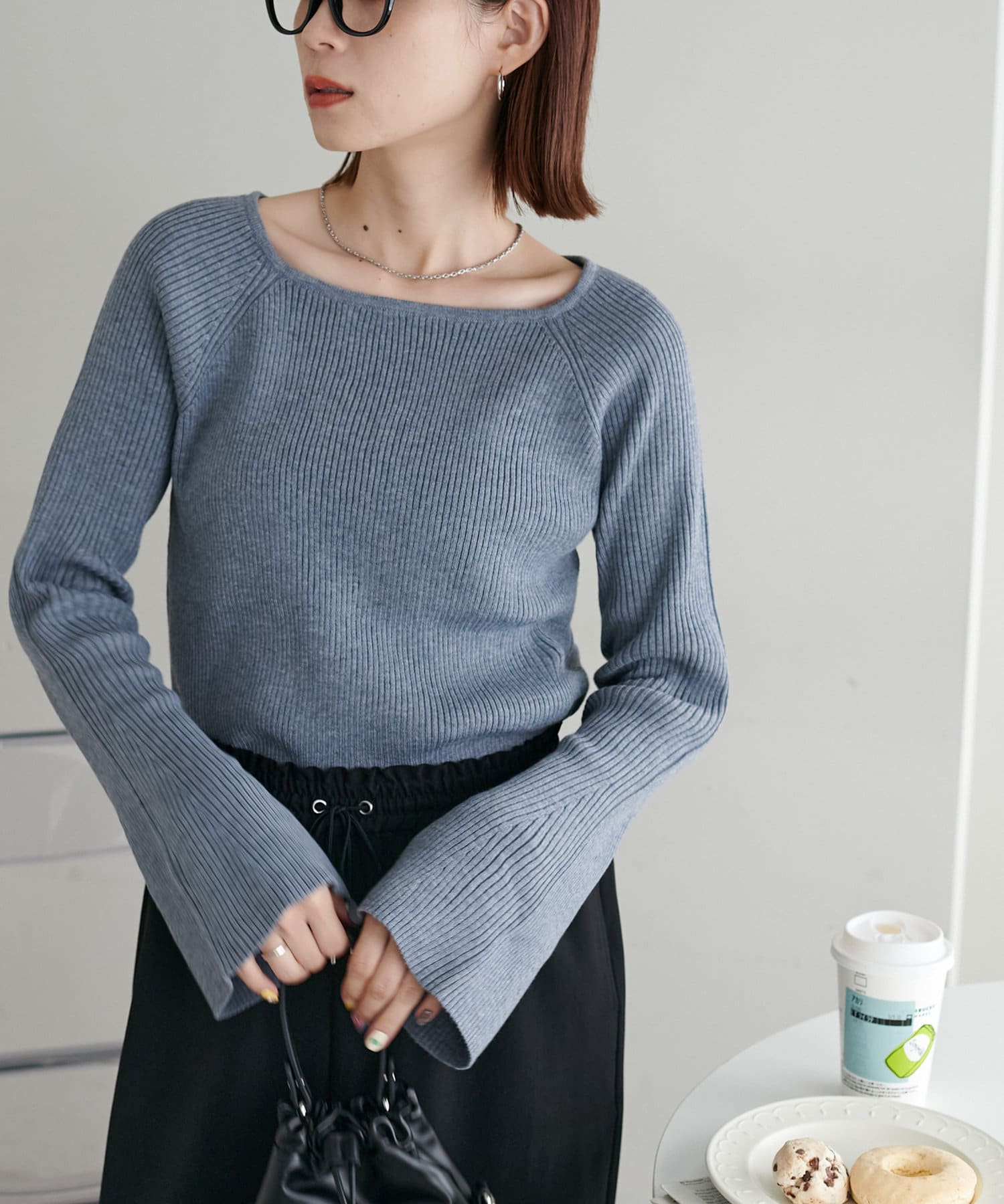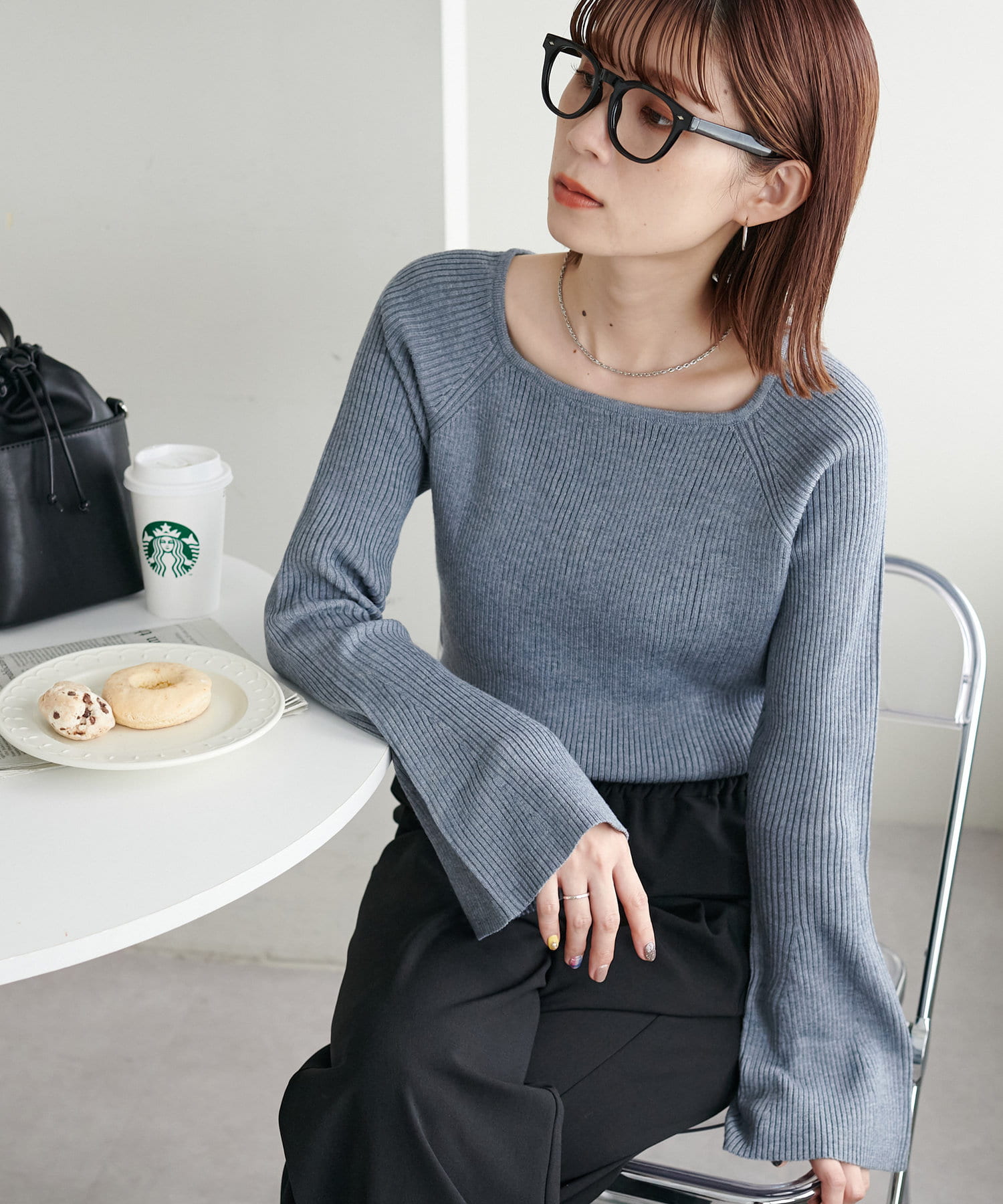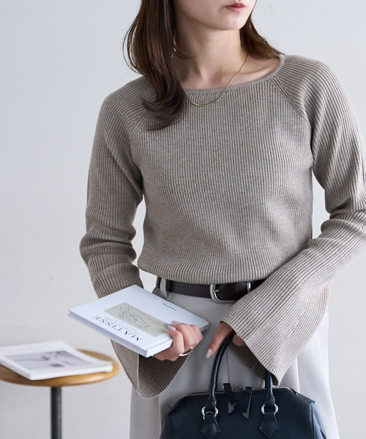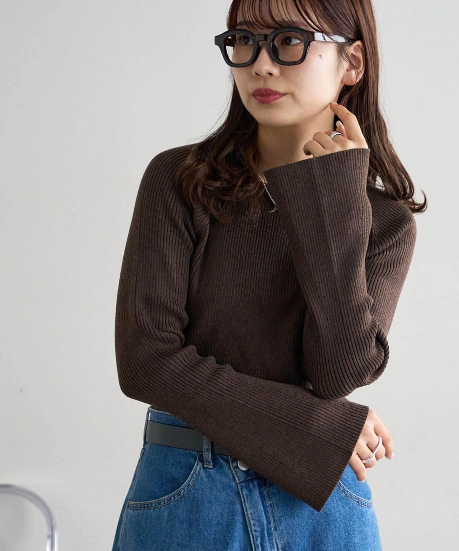 柔らかく伸縮性のある着心地のいいリブニット。袖口部分はフレアデザインなので1枚着でも様になります♪