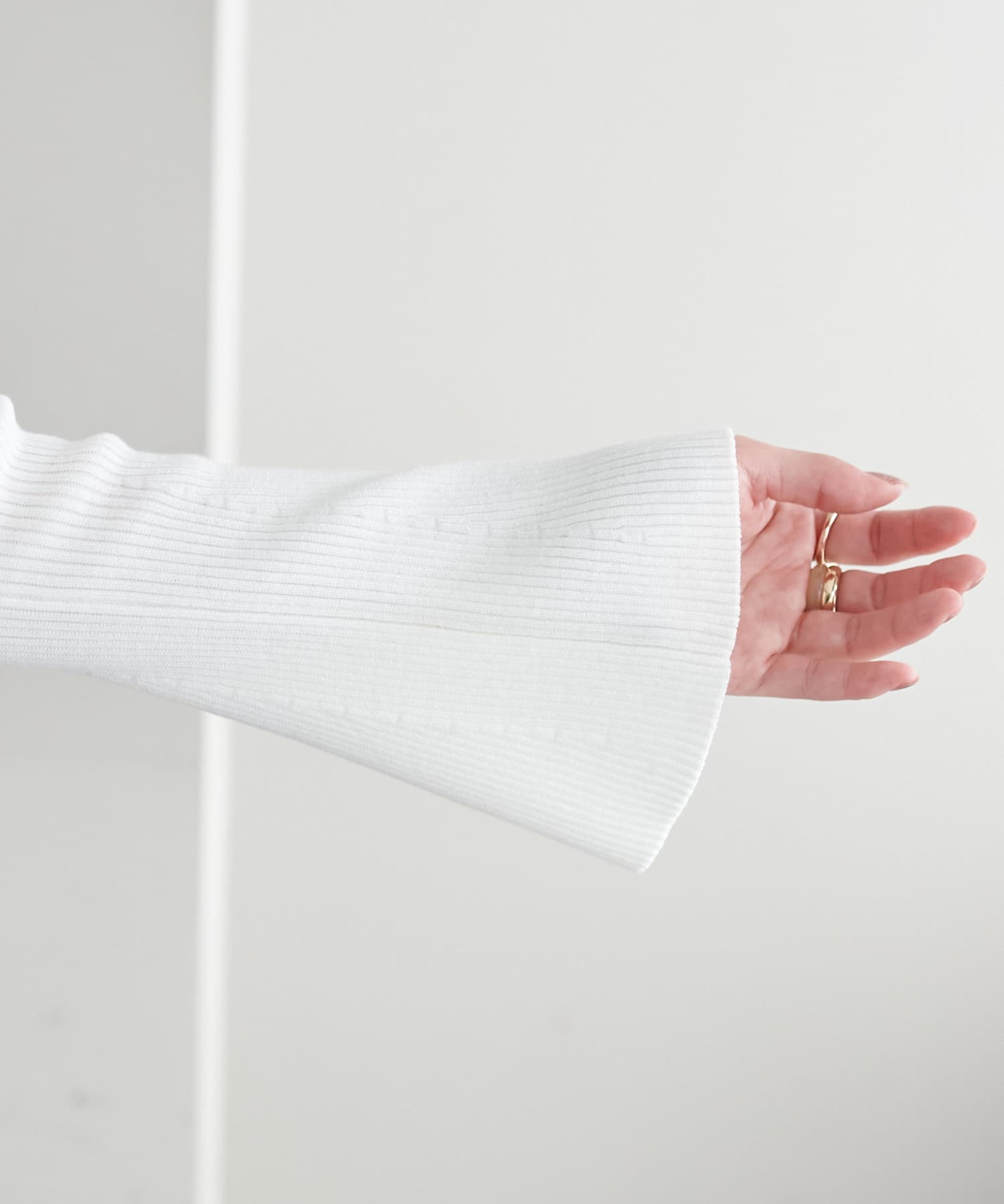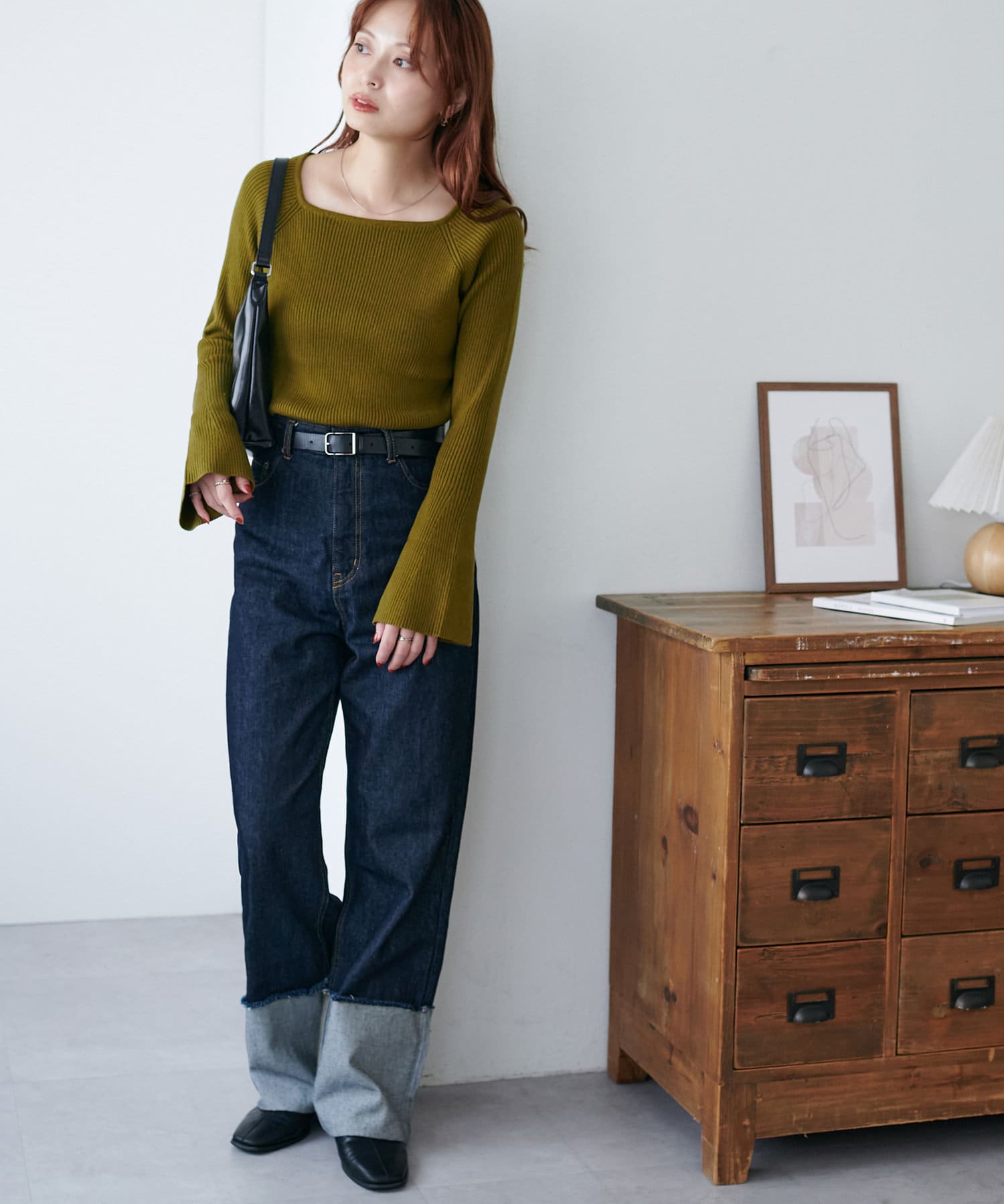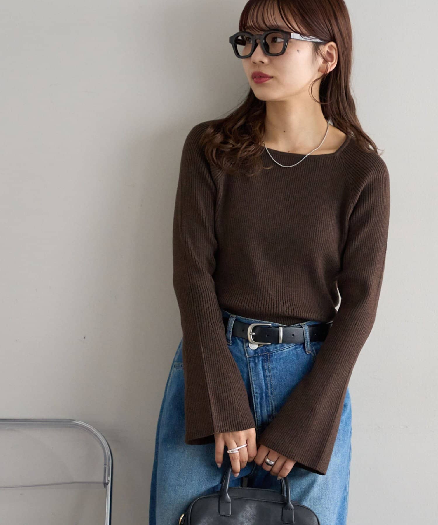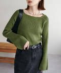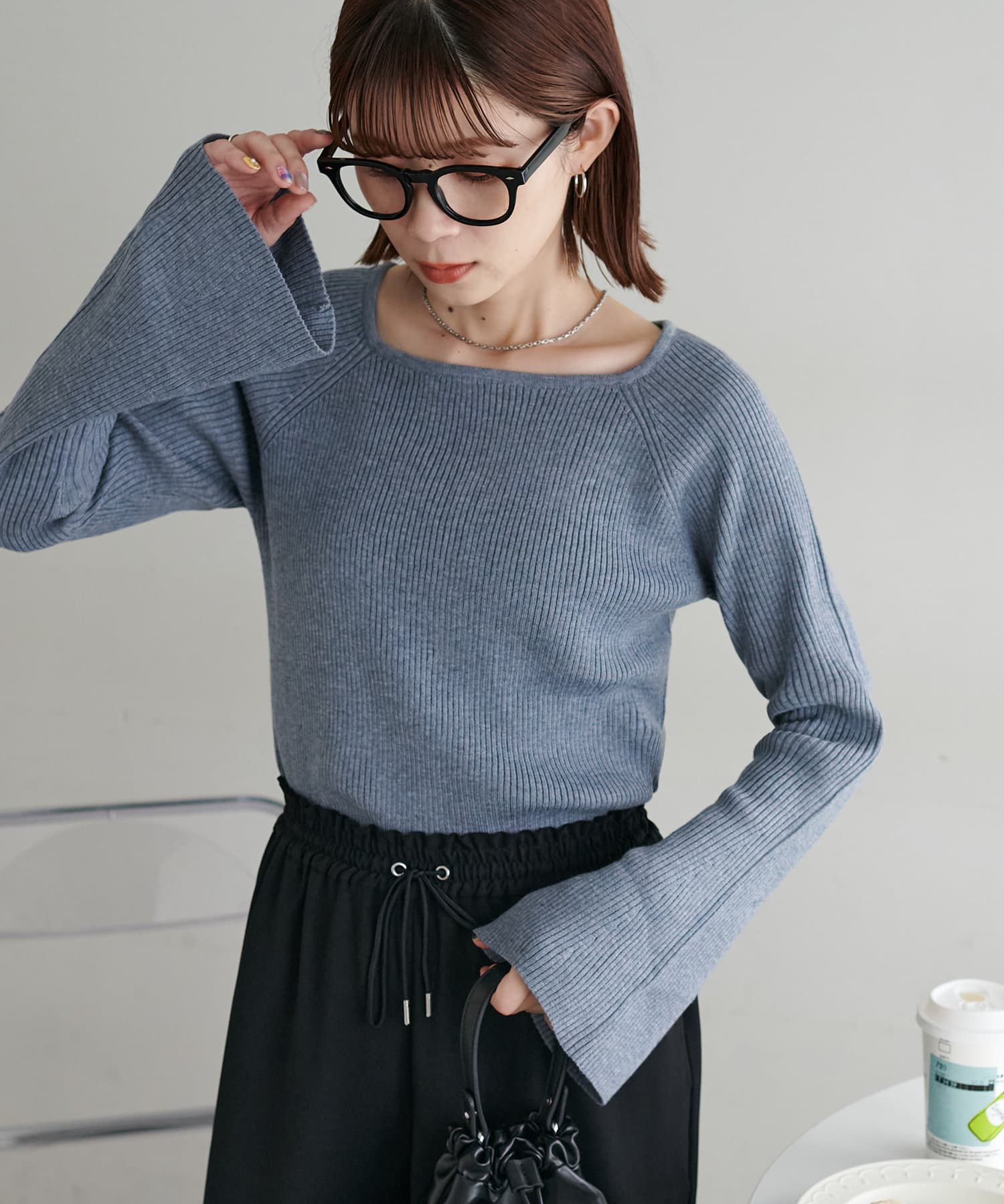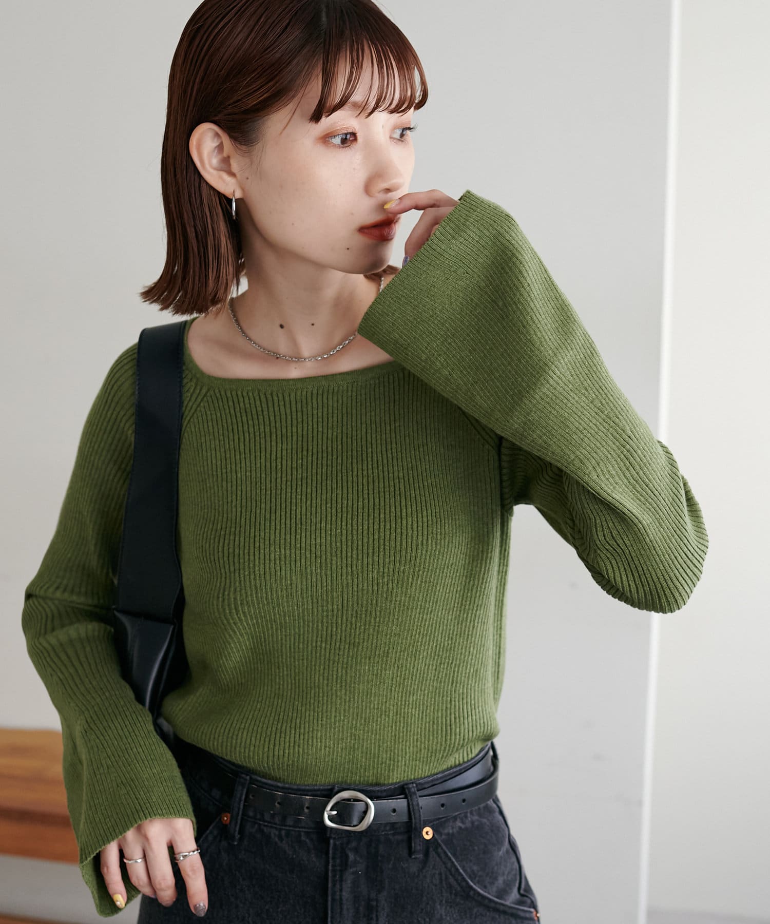 柔らかく伸縮性のある着心地のいいリブニット。袖口部分はフレアデザインなので1枚着でも様になります♪