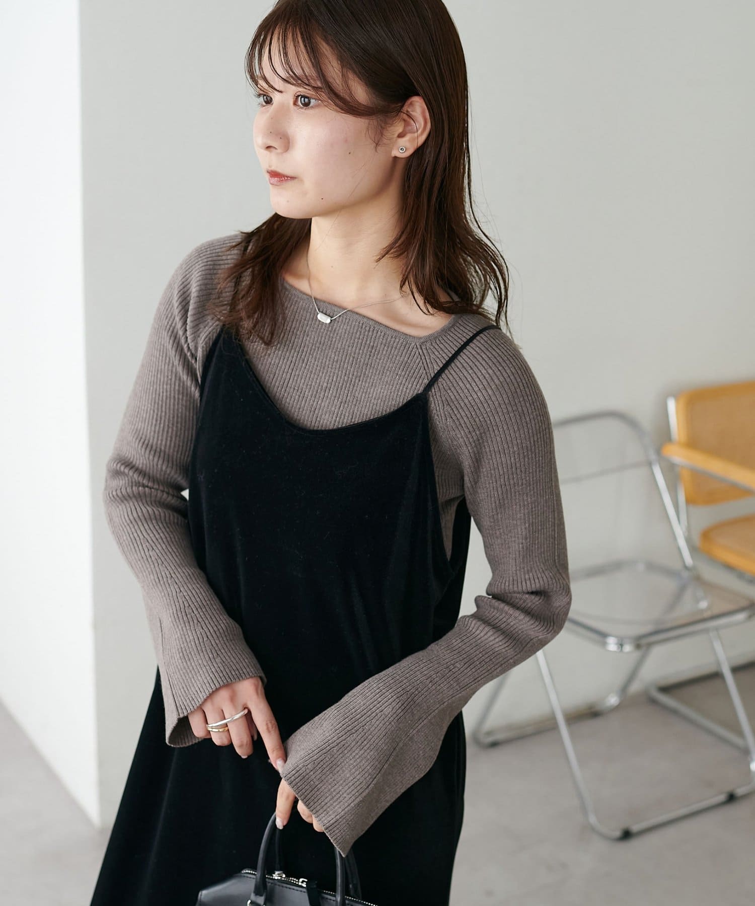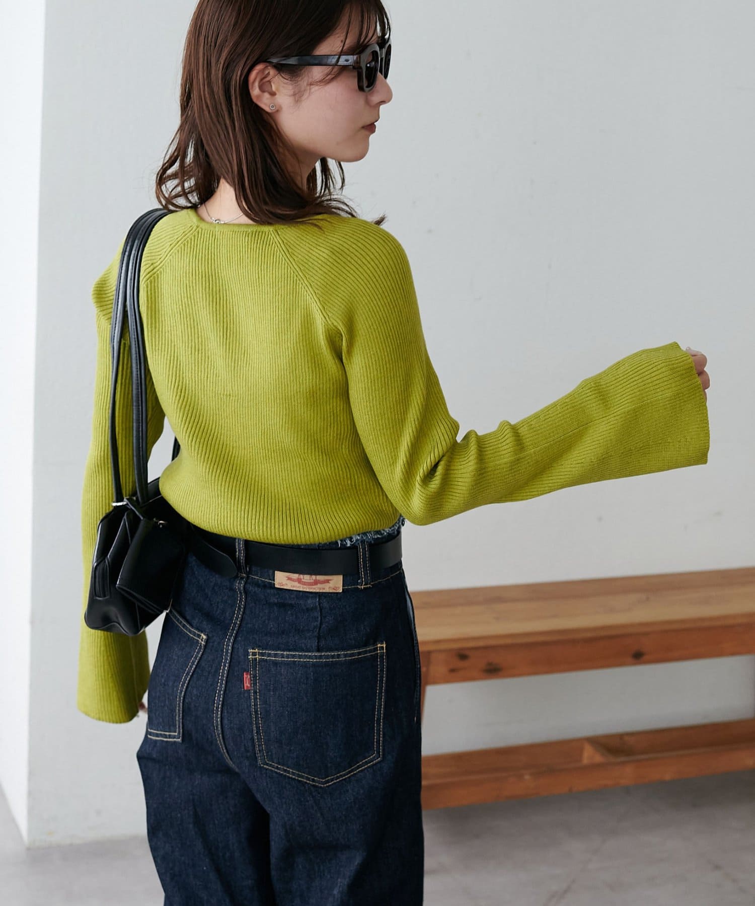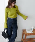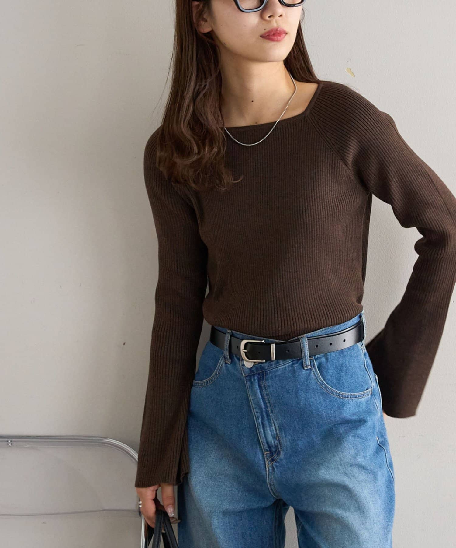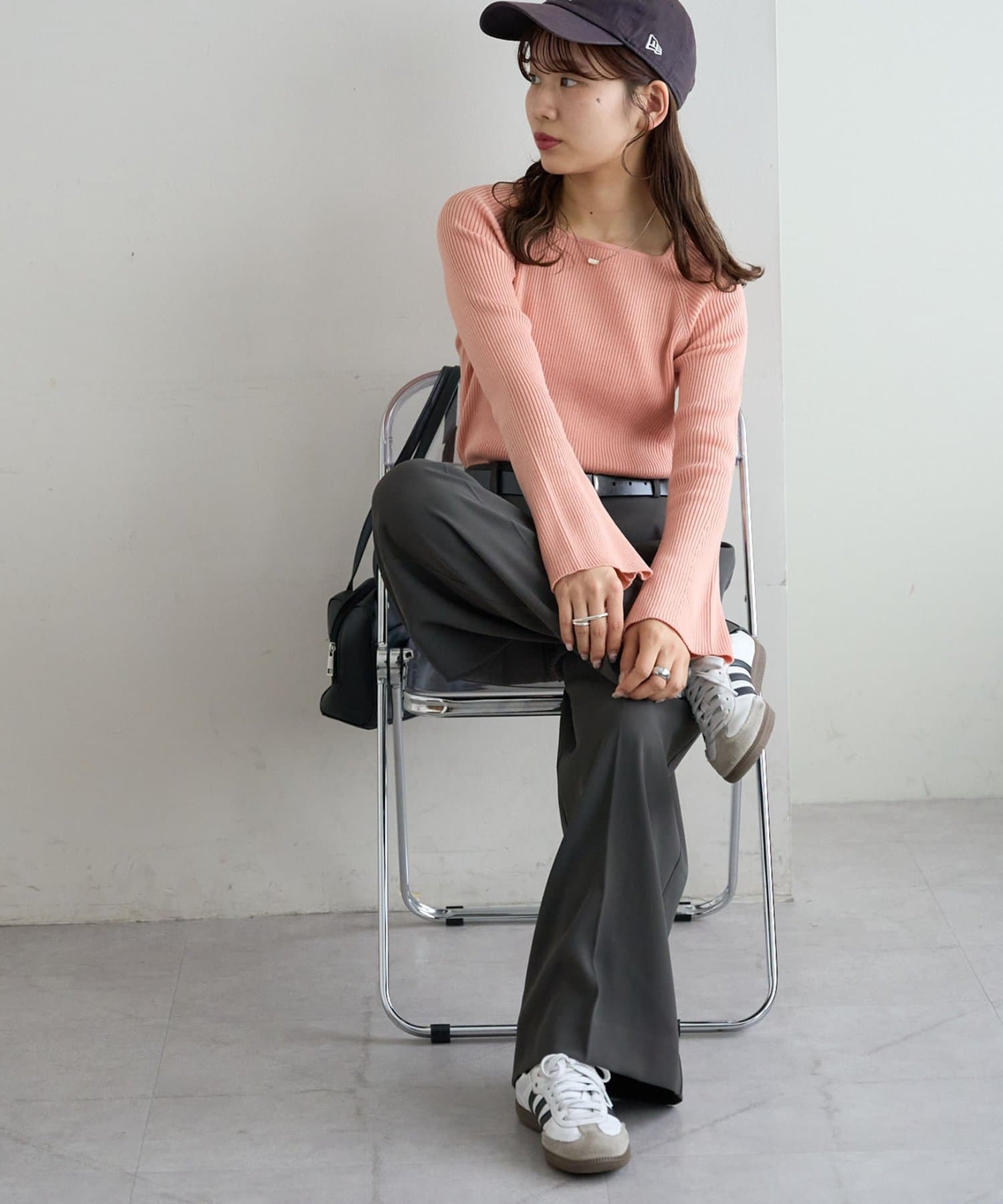 柔らかく伸縮性のある着心地のいいリブニット。袖口部分はフレアデザインなので1枚着でも様になります♪