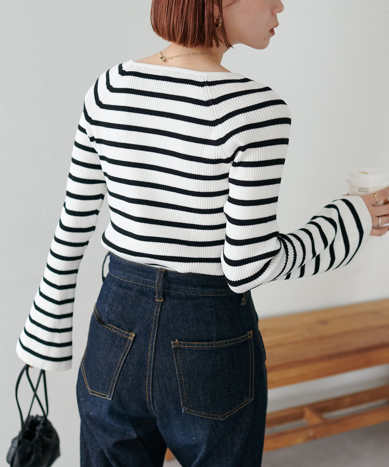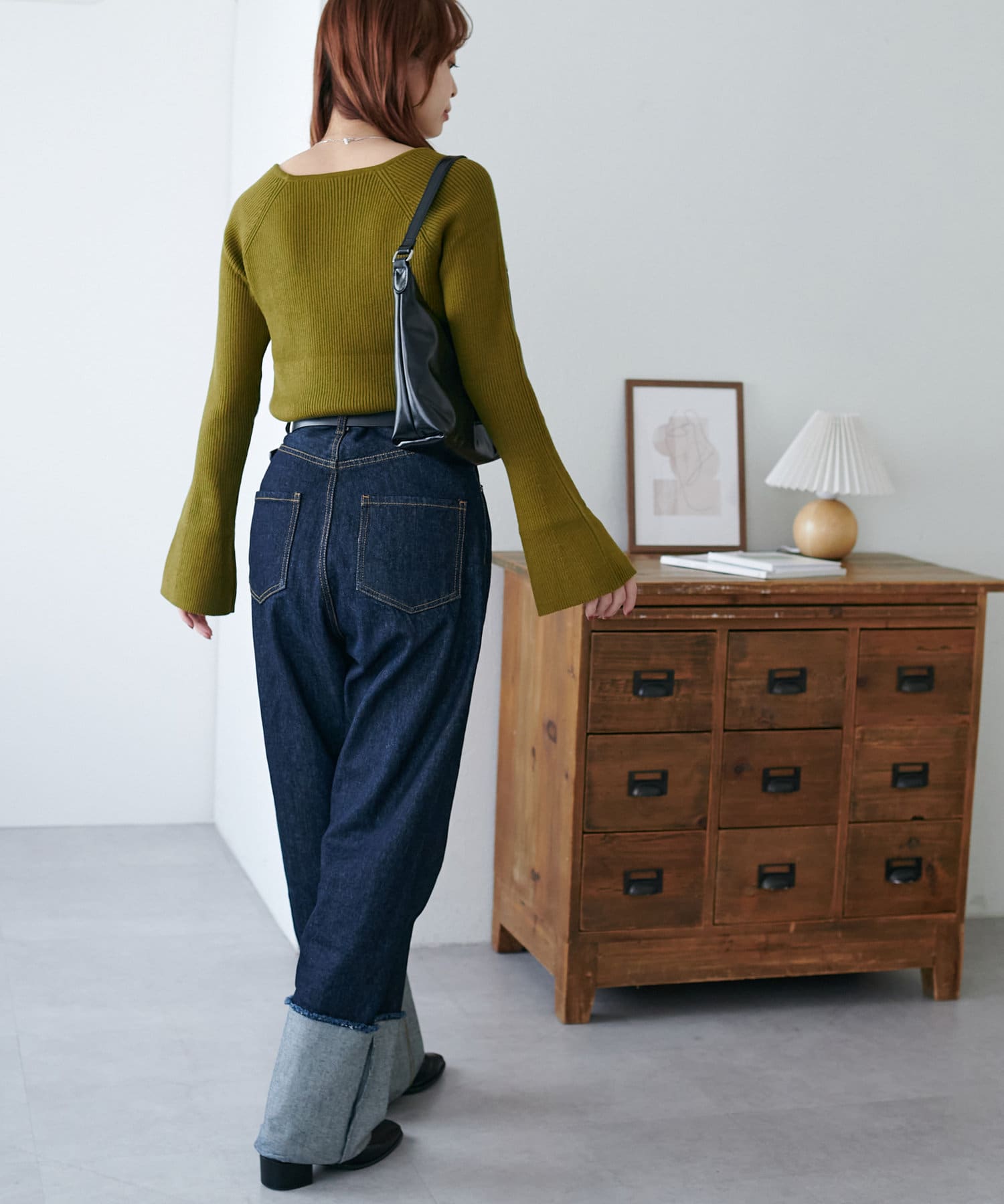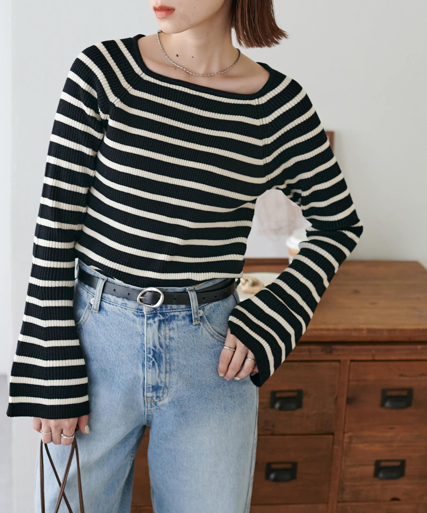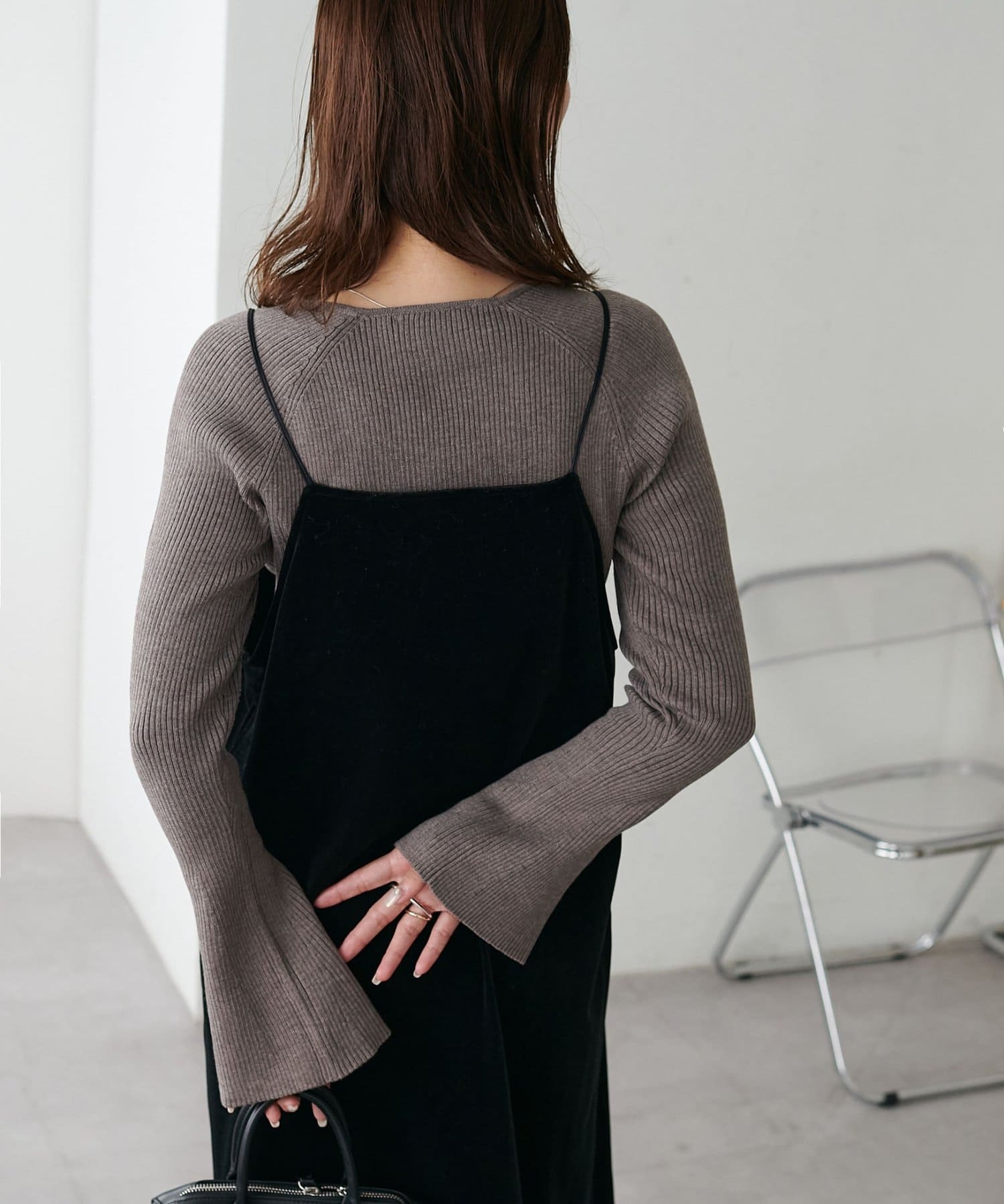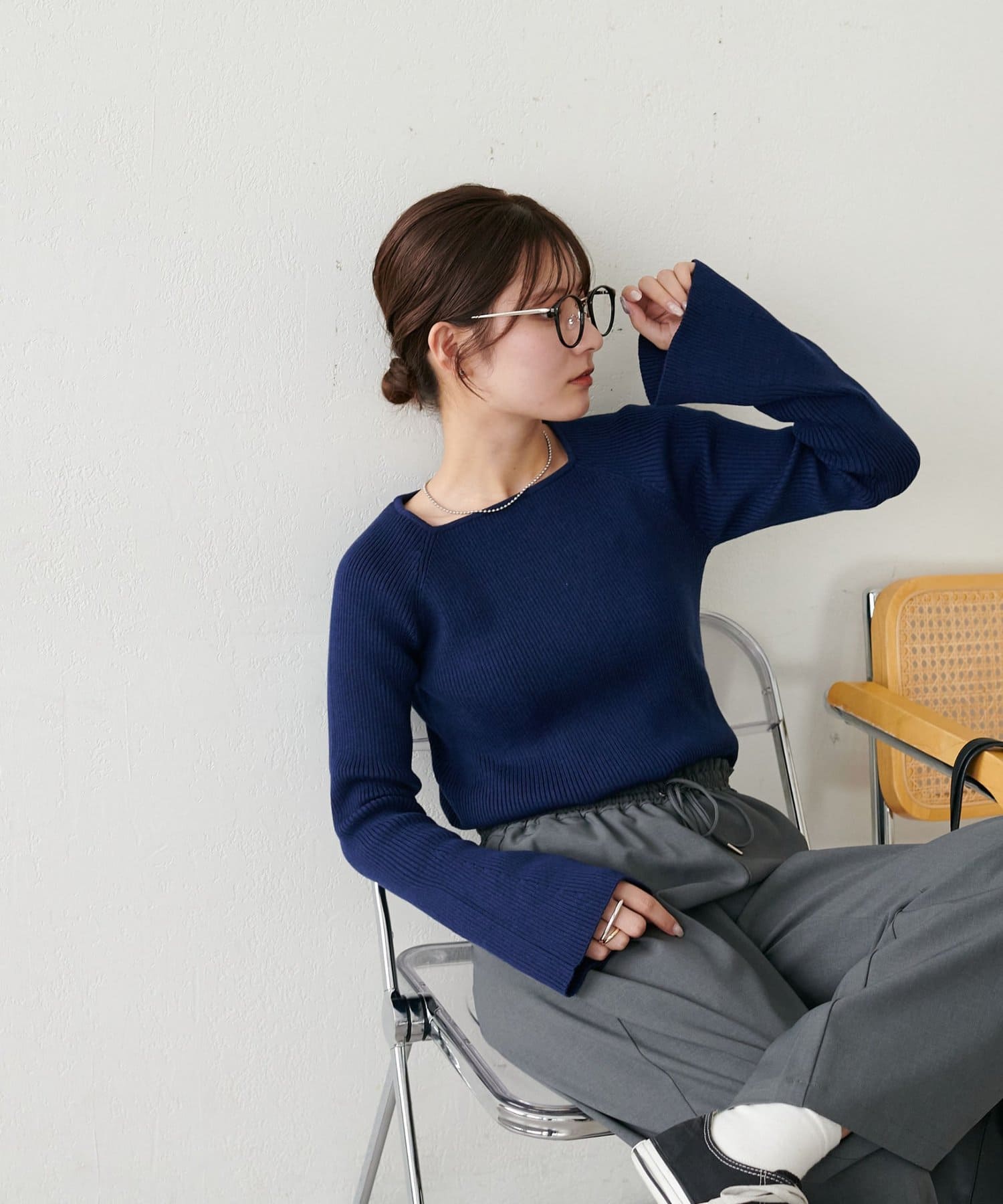 柔らかく伸縮性のある着心地のいいリブニット。袖口部分はフレアデザインなので1枚着でも様になります♪