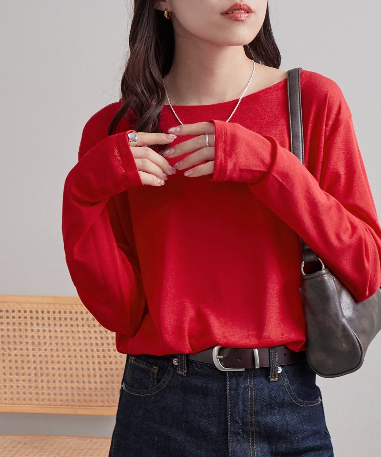 購入場所:店舗チャコールグレーと一緒にピンクも購入。スッキリとしたピンクで、派手すぎない春色で気に入りました。サムズホールは、私は突っ張る事なくちょうどよく着れました。指にかけず着ても柔らかい素材感でとてもお洒落です。ぴったりしすぎてないので、肉感も拾いません。着た時のシルエットがスッキリ見えてとても良い!腕まくりしてからおろしてもシワが目立たないのもとても気に入っています。