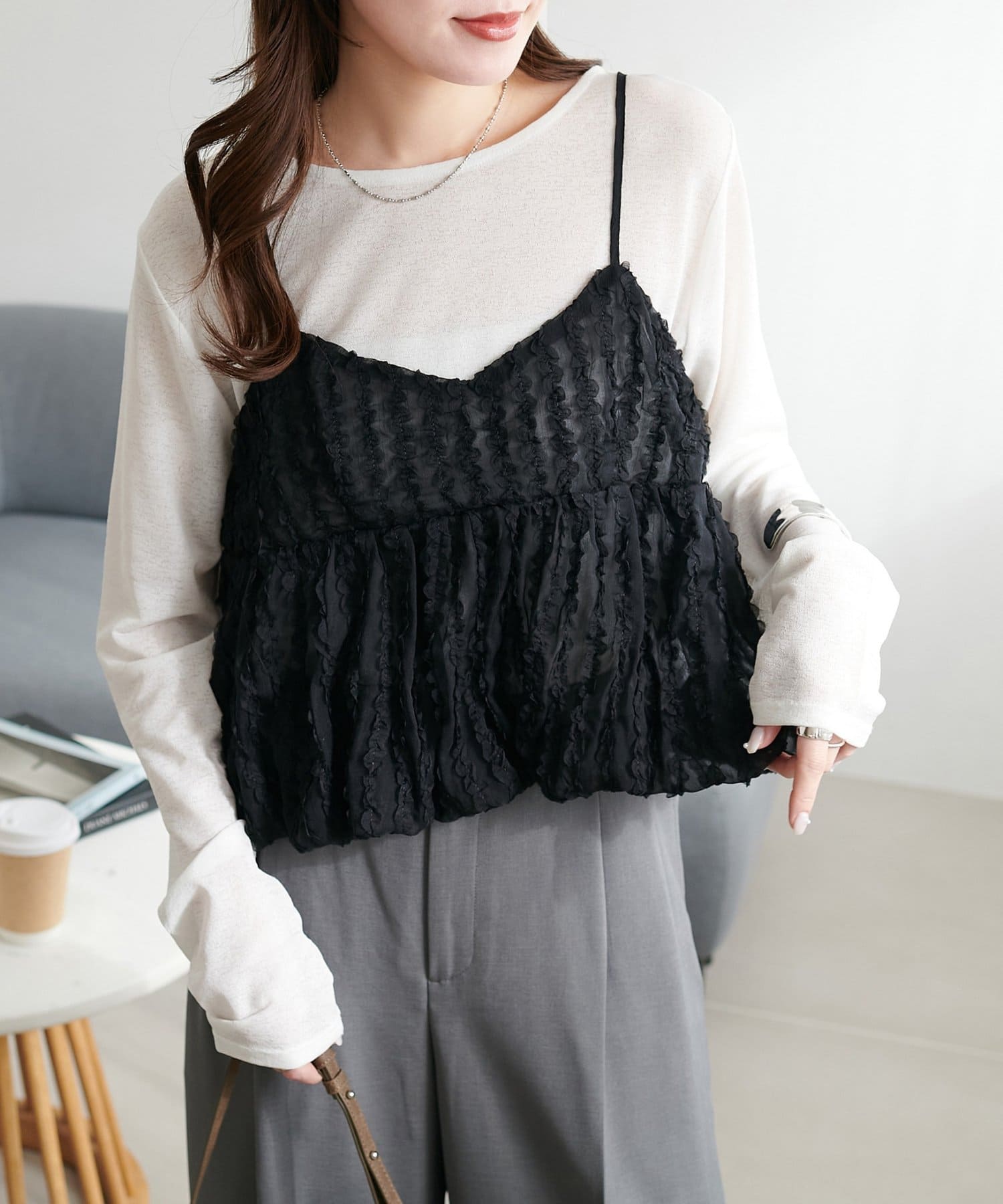 チャコールグレーと比較すると透け感はありますが、それでも下品にならない程度。春色シアートップス楽しみたい方におすすめです。