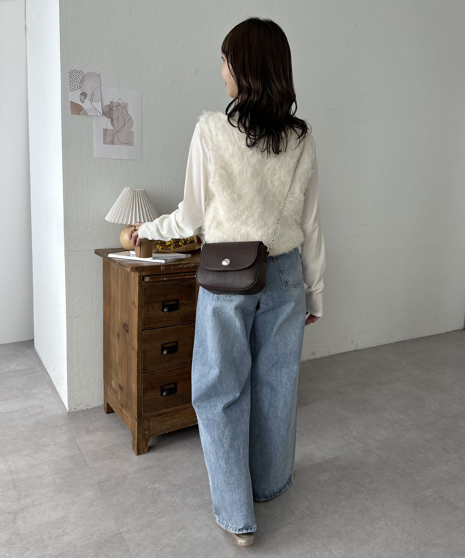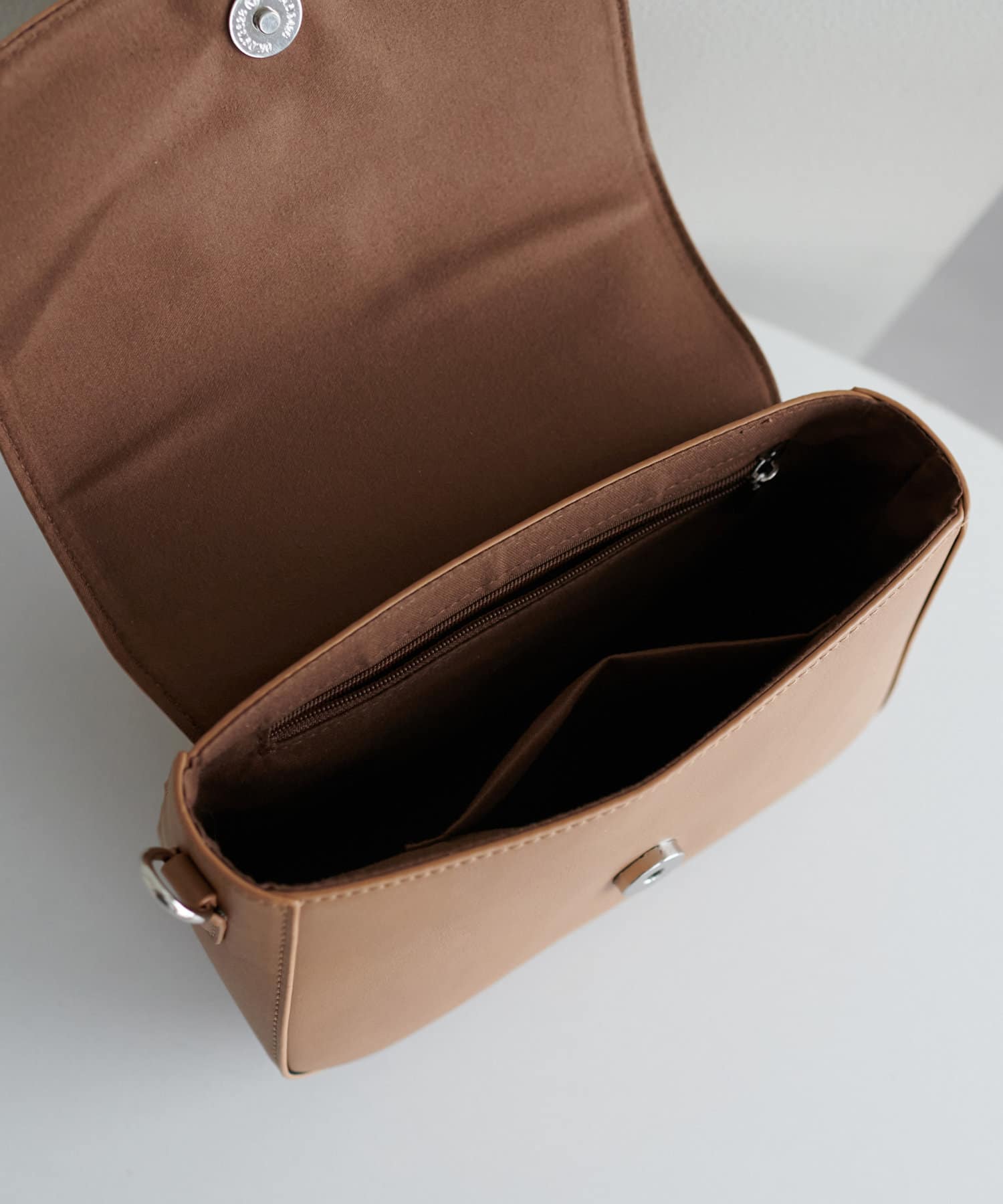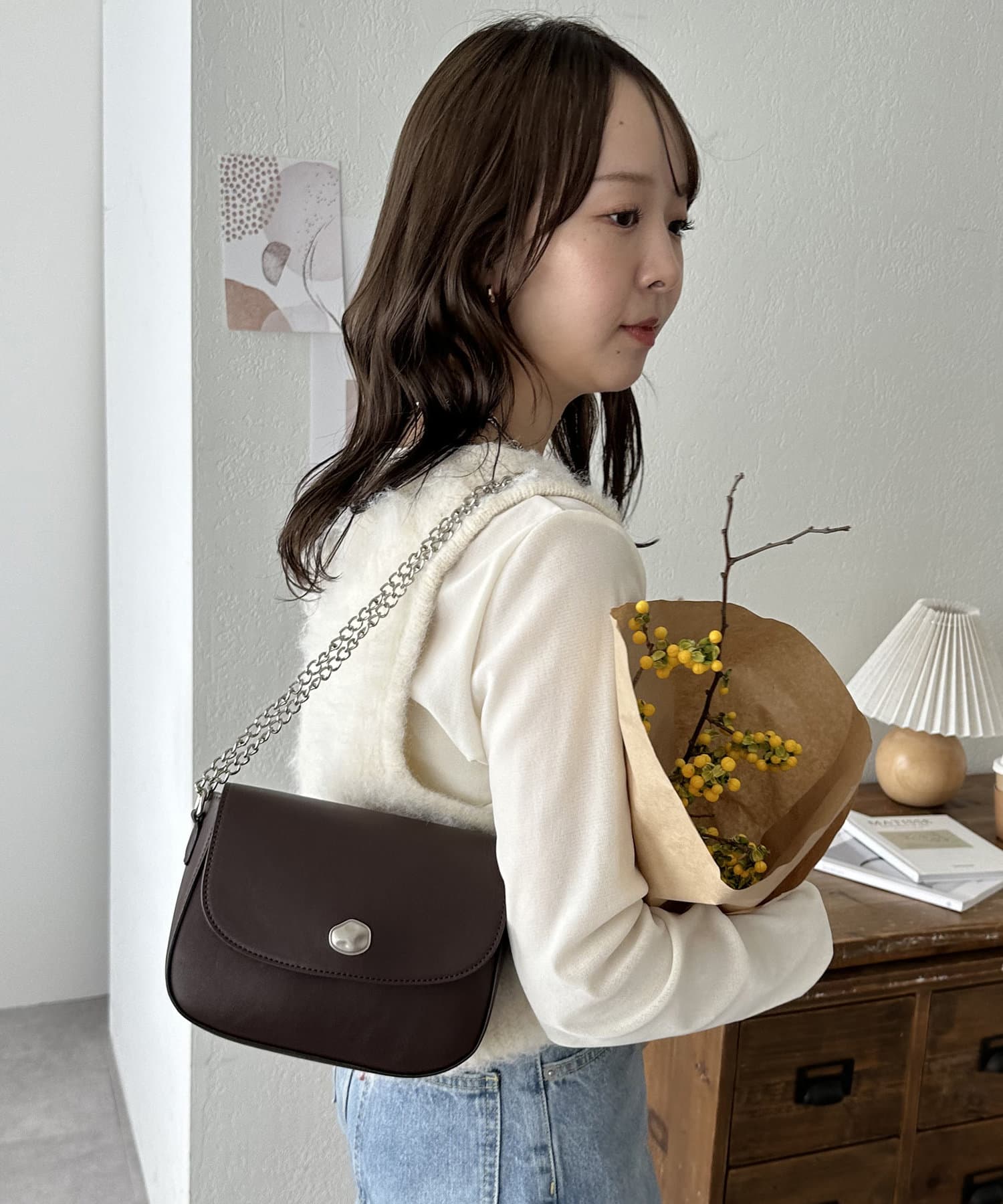 さりげない華やかさを添える、ニュアンス金具フラップショルダーバッグ。