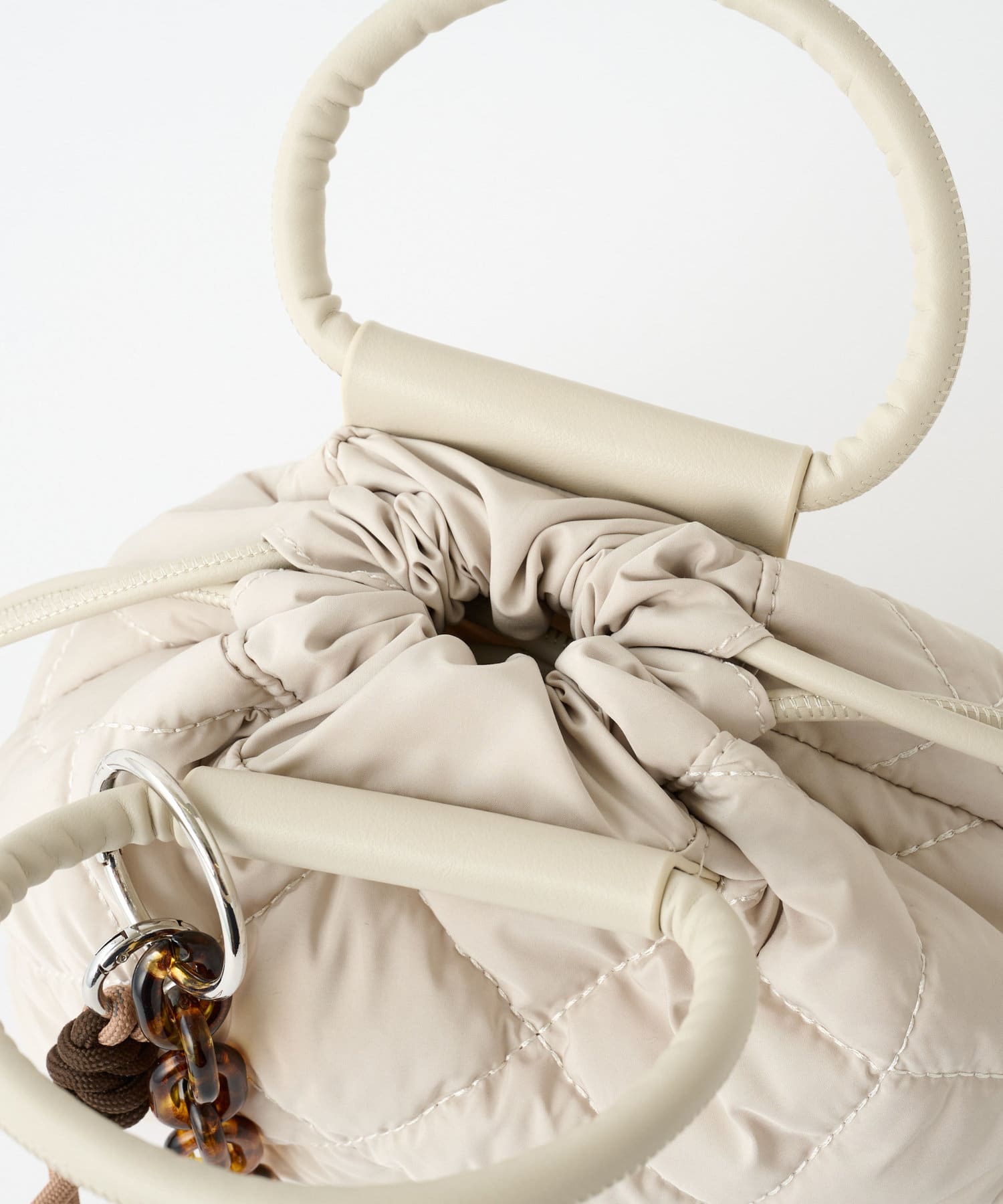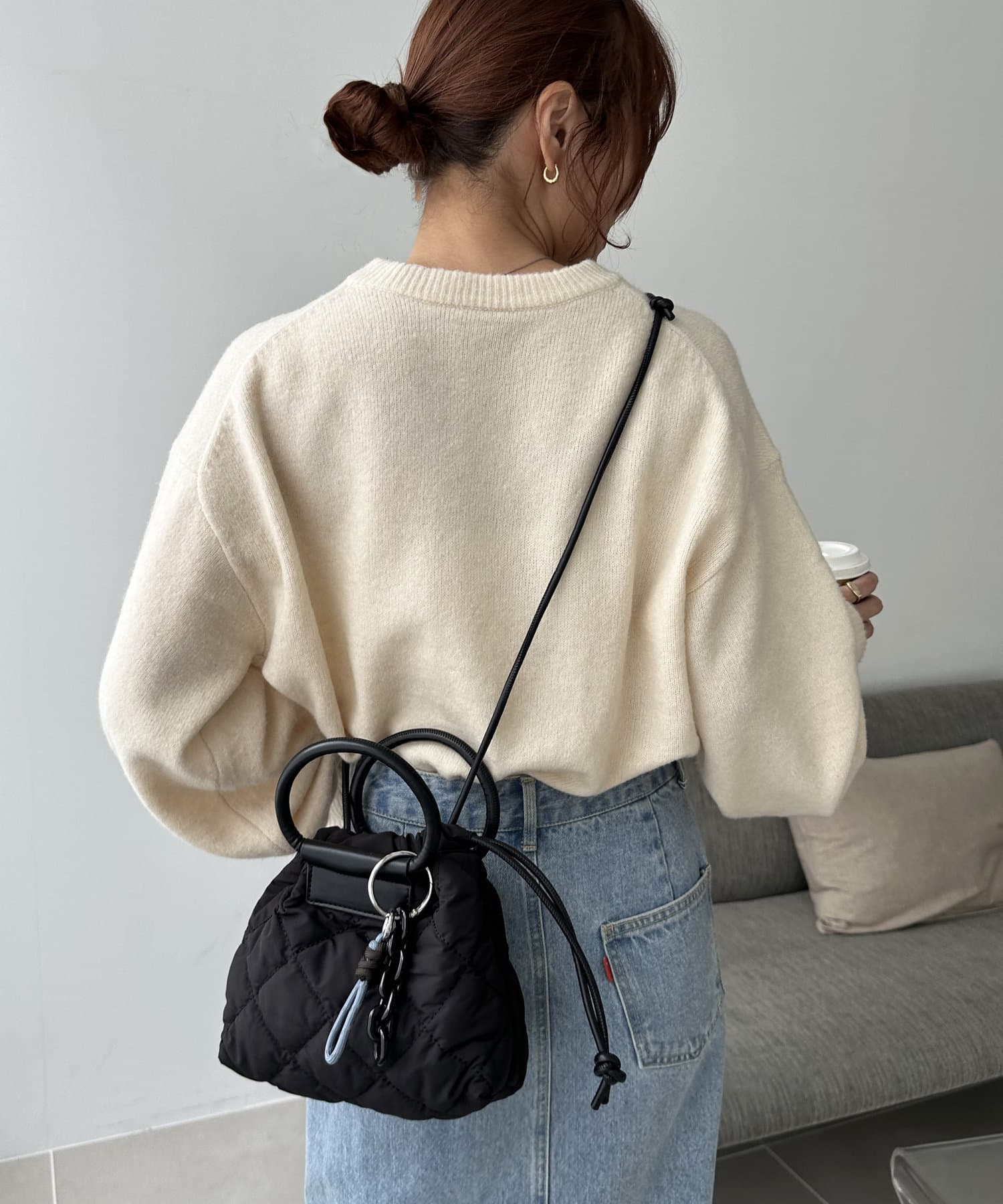 サッと出かける時にピッタリなミニマムサイズのショルダーバッグ。コロンッとした小さいサイズながらに、キルティングのデザインやチャームが付属していることで、デザイン性・存在感があります。チャームは取り外し可能なので、他のお鞄などに付けていただくのもオススメです♪また、ショルダー紐は長さ調節が可能な為、様々な持ち方で仕様いただけます◎(紐を中に収納し、巾着バッグとして使うのも可愛いです!)カラーは定番カラーのブラック・ベージュ・カーキの3色展開です!