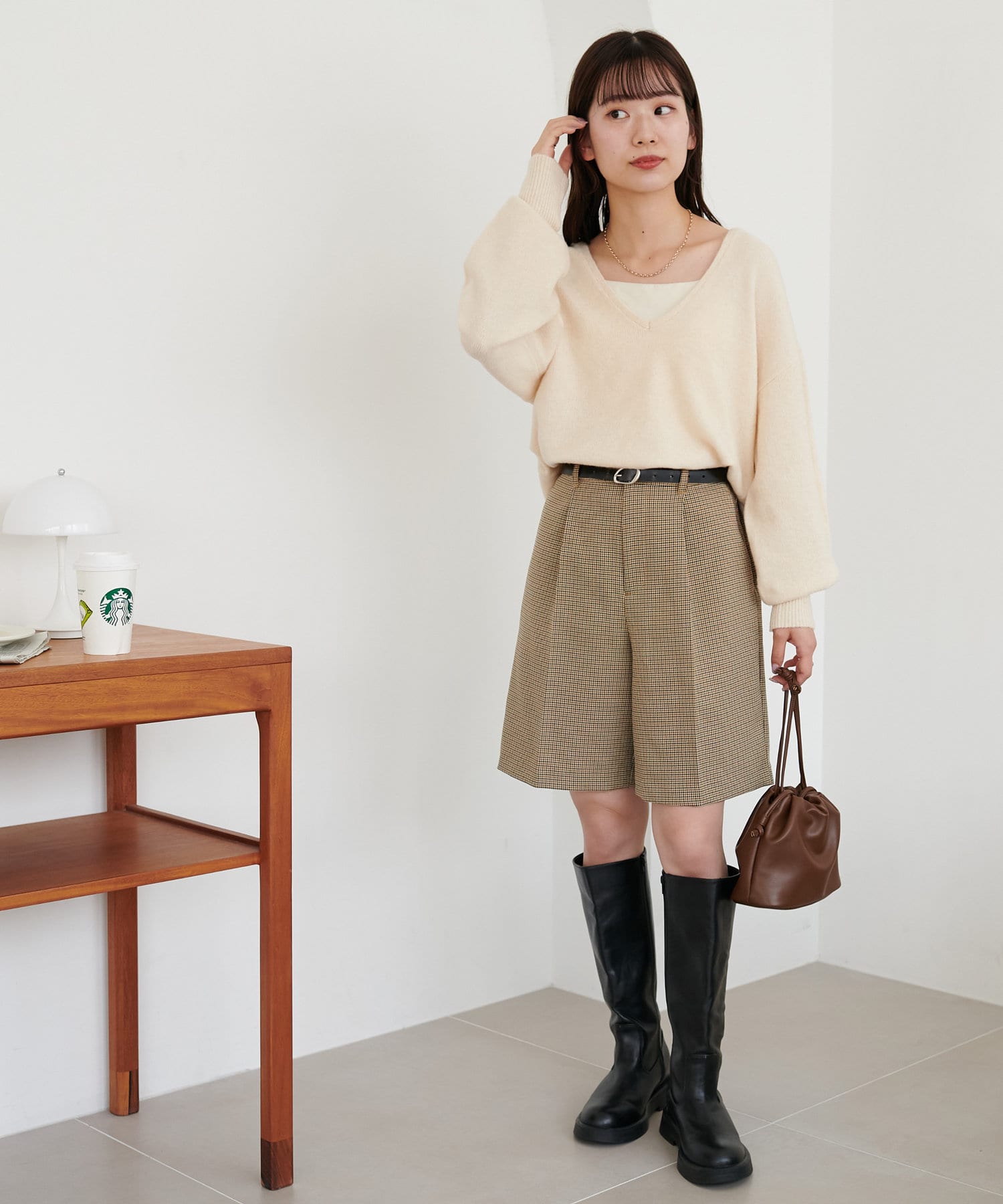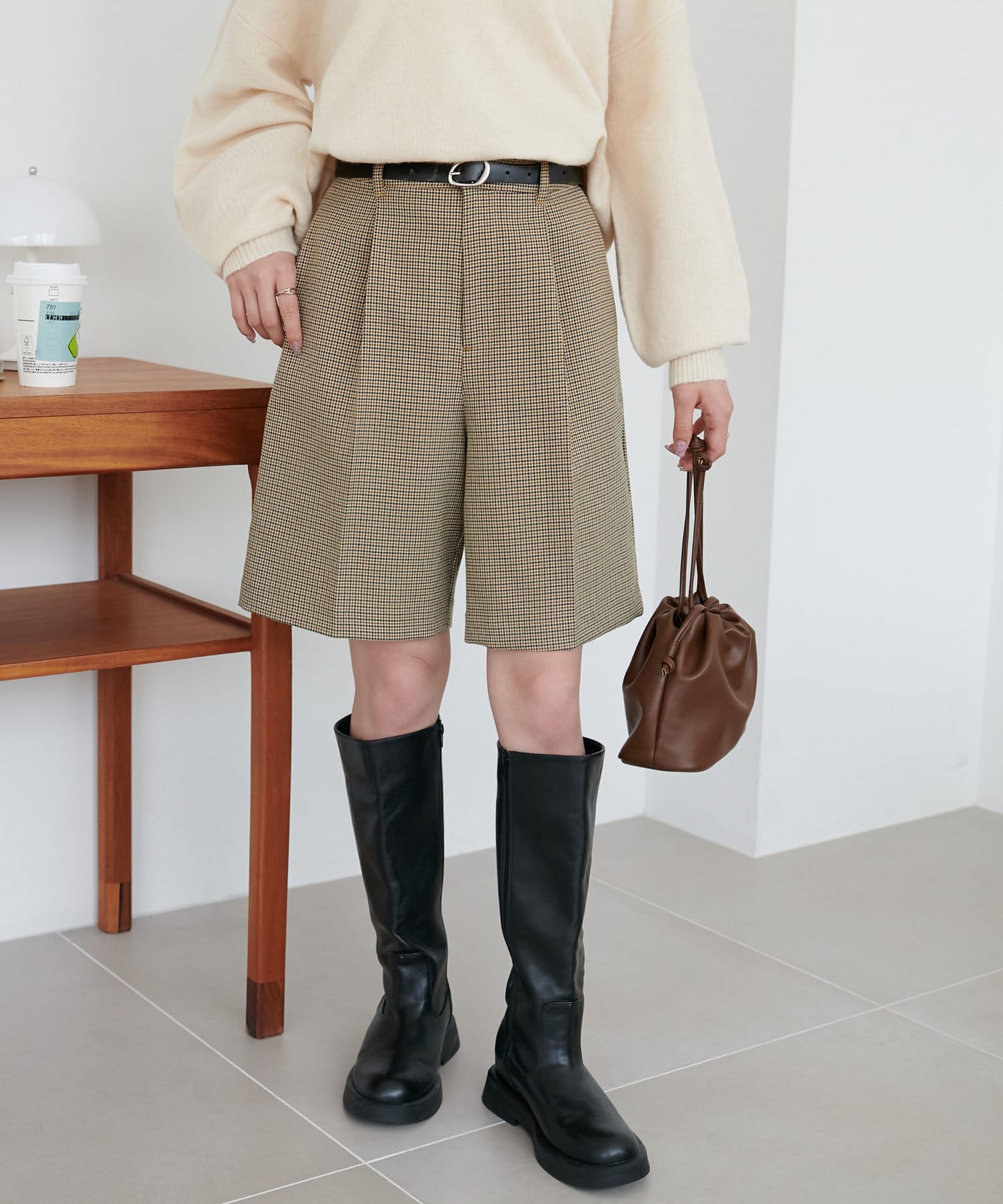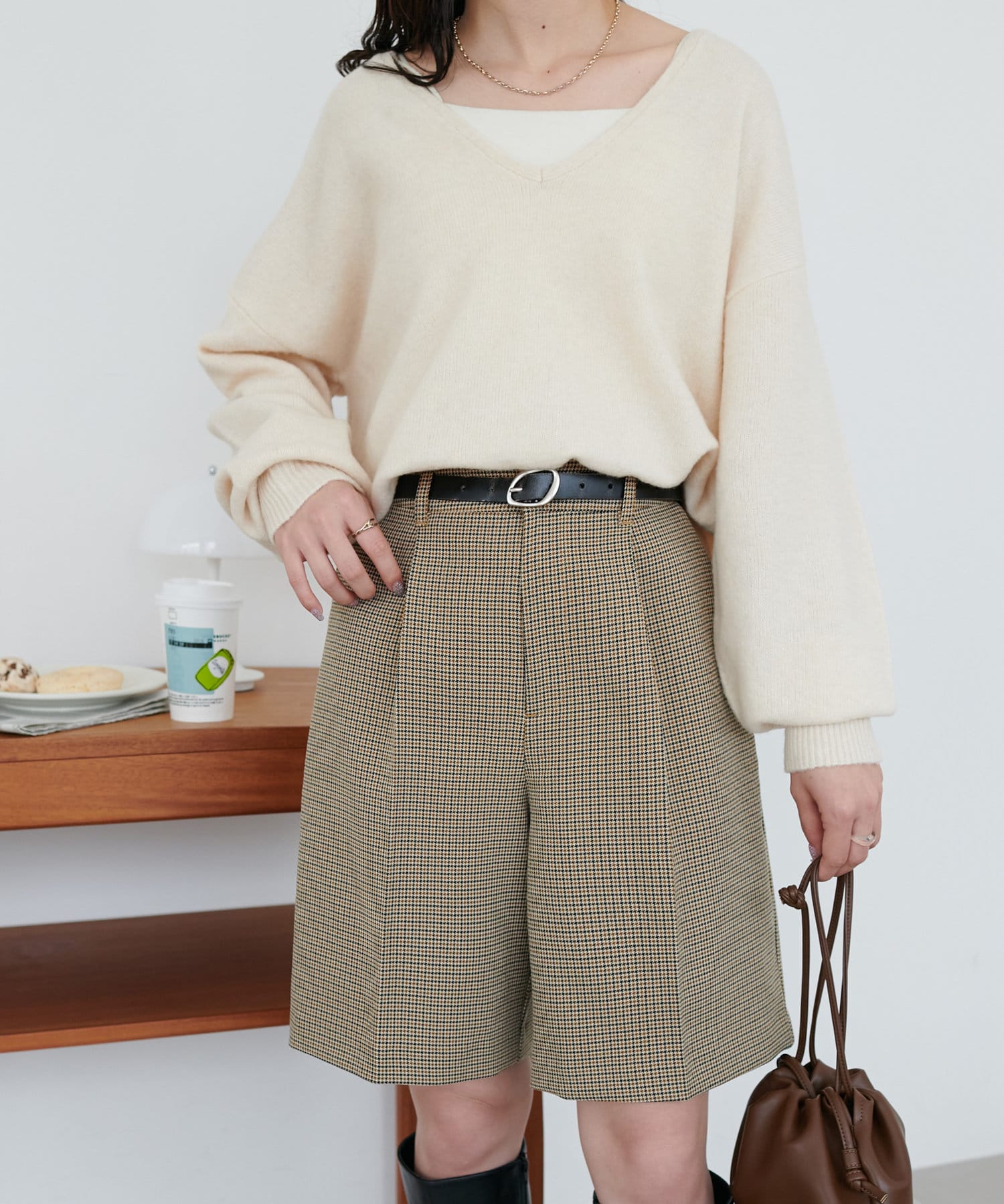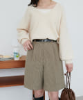 ショートパンツなので、ボリュームのあるゆったりとしたニットやスウェットを合わせたスタイリングがおすすめ。
