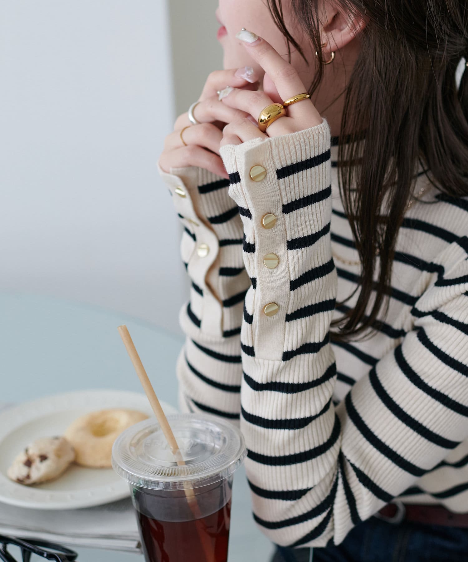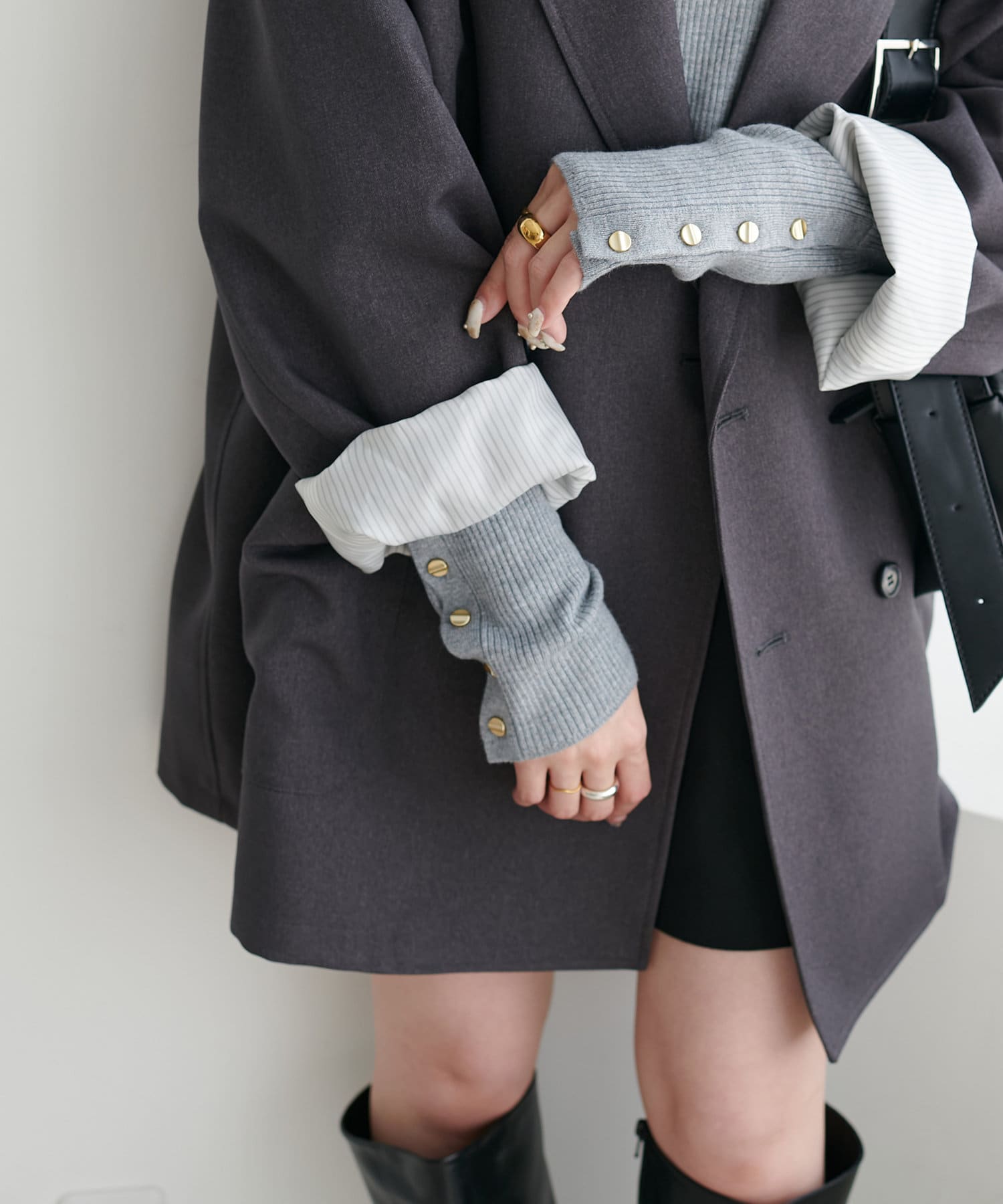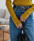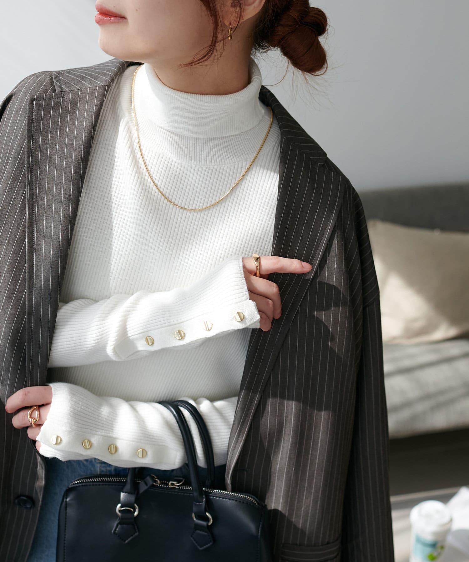 袖口に施したゴールドのボタンがコーデのポイントに!
