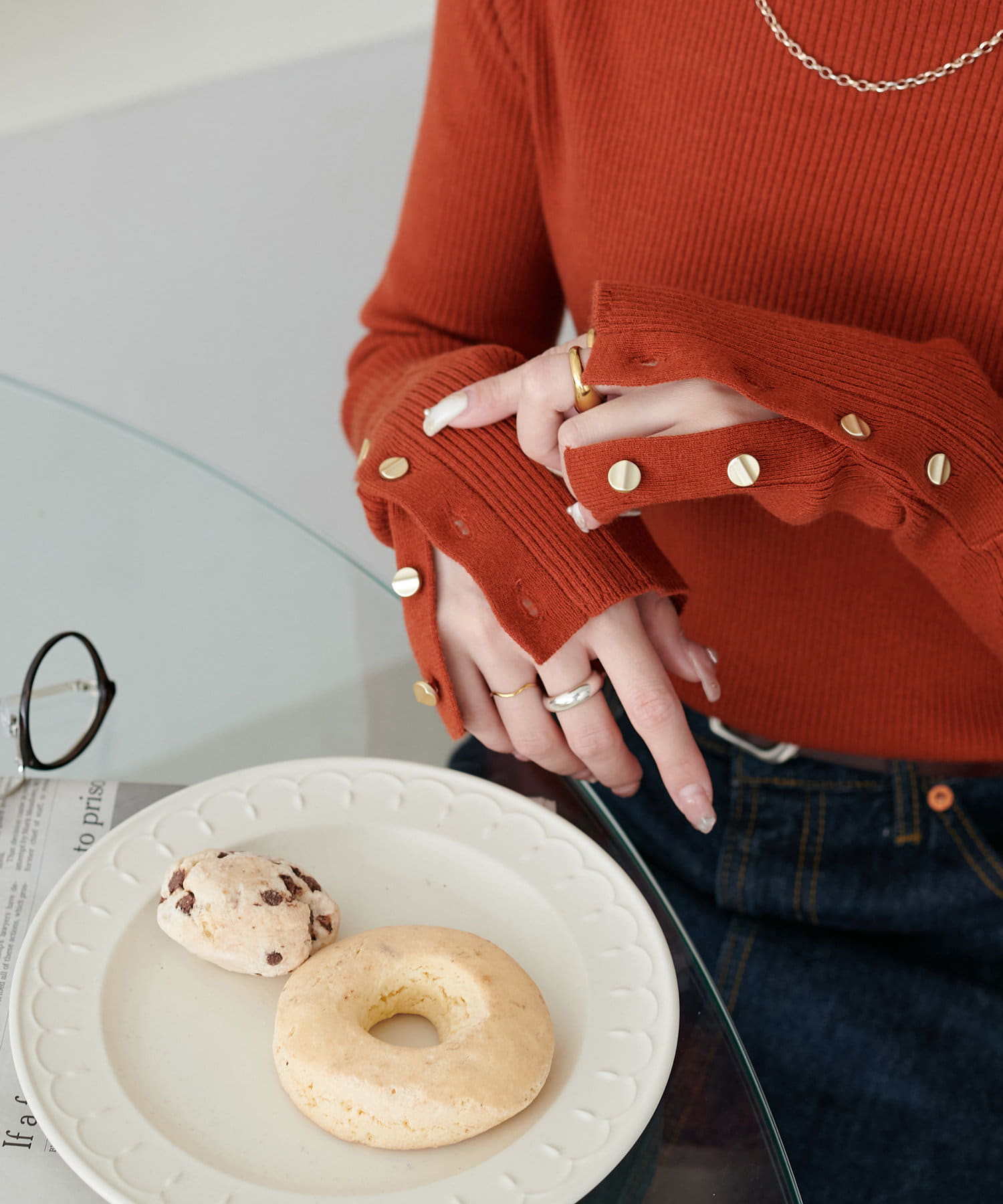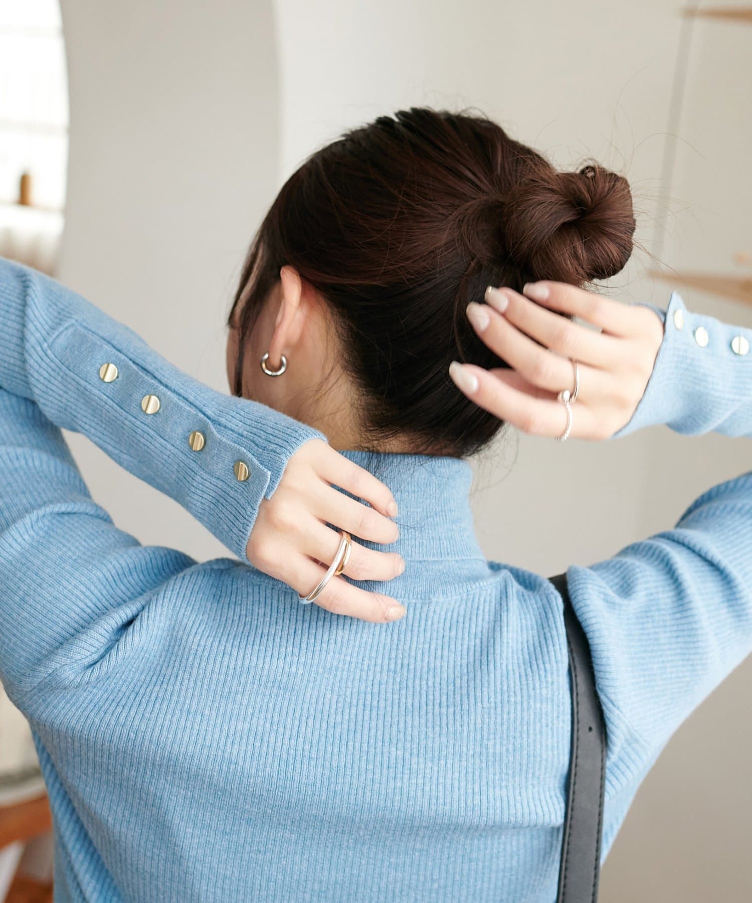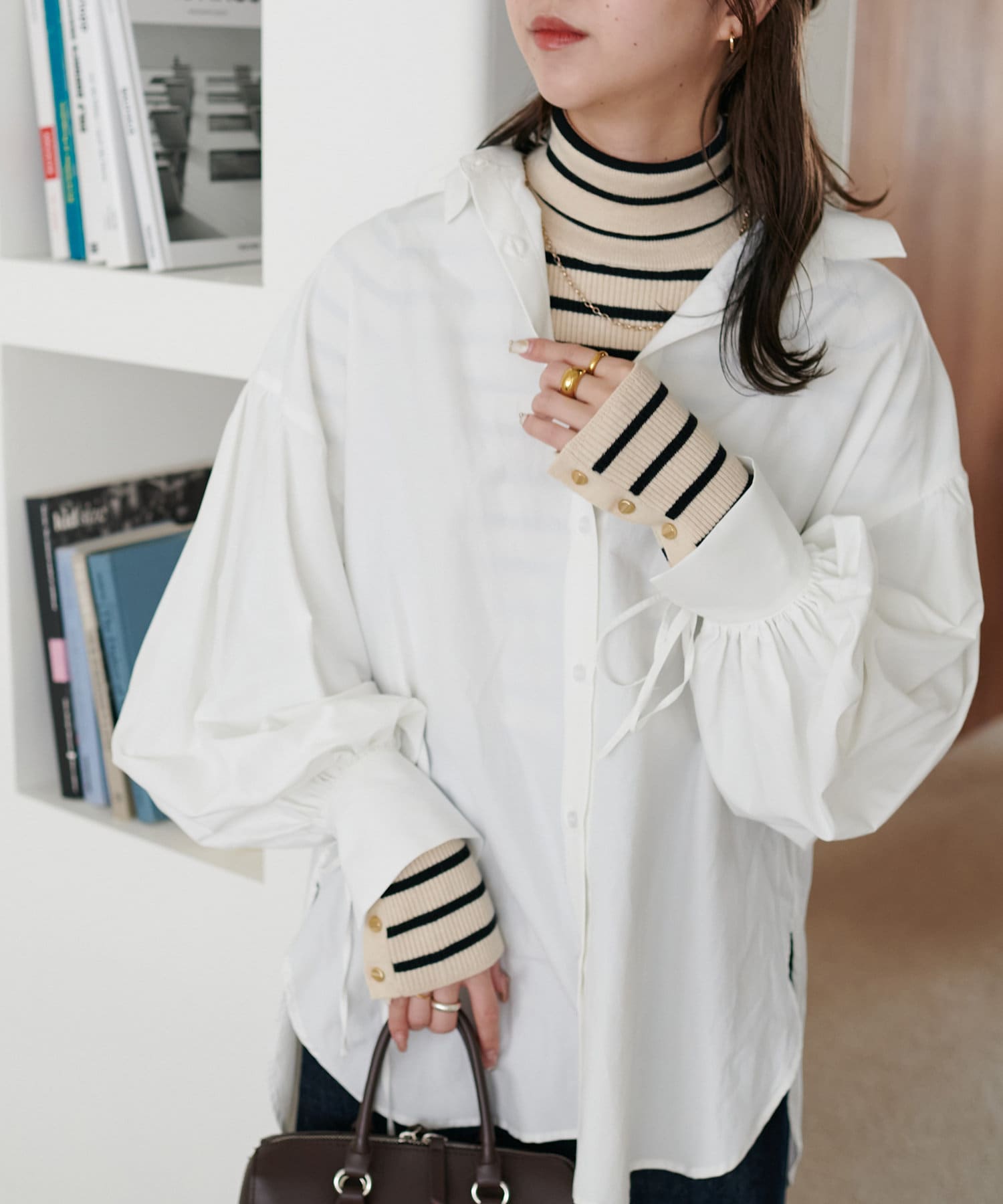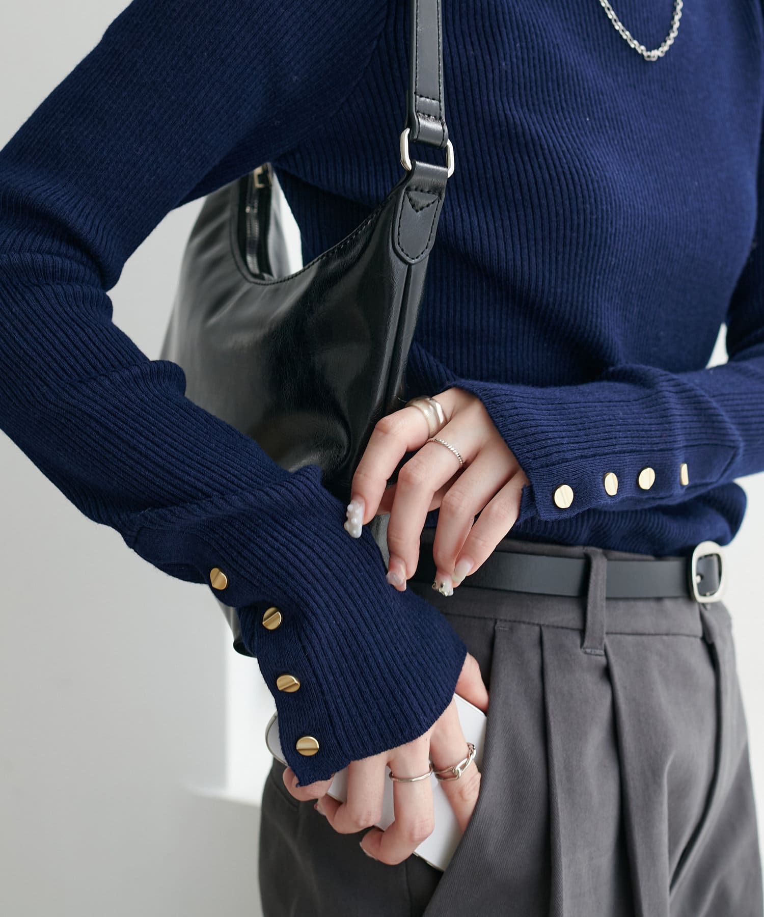 袖口に施したゴールドのボタンがコーデのポイントに!