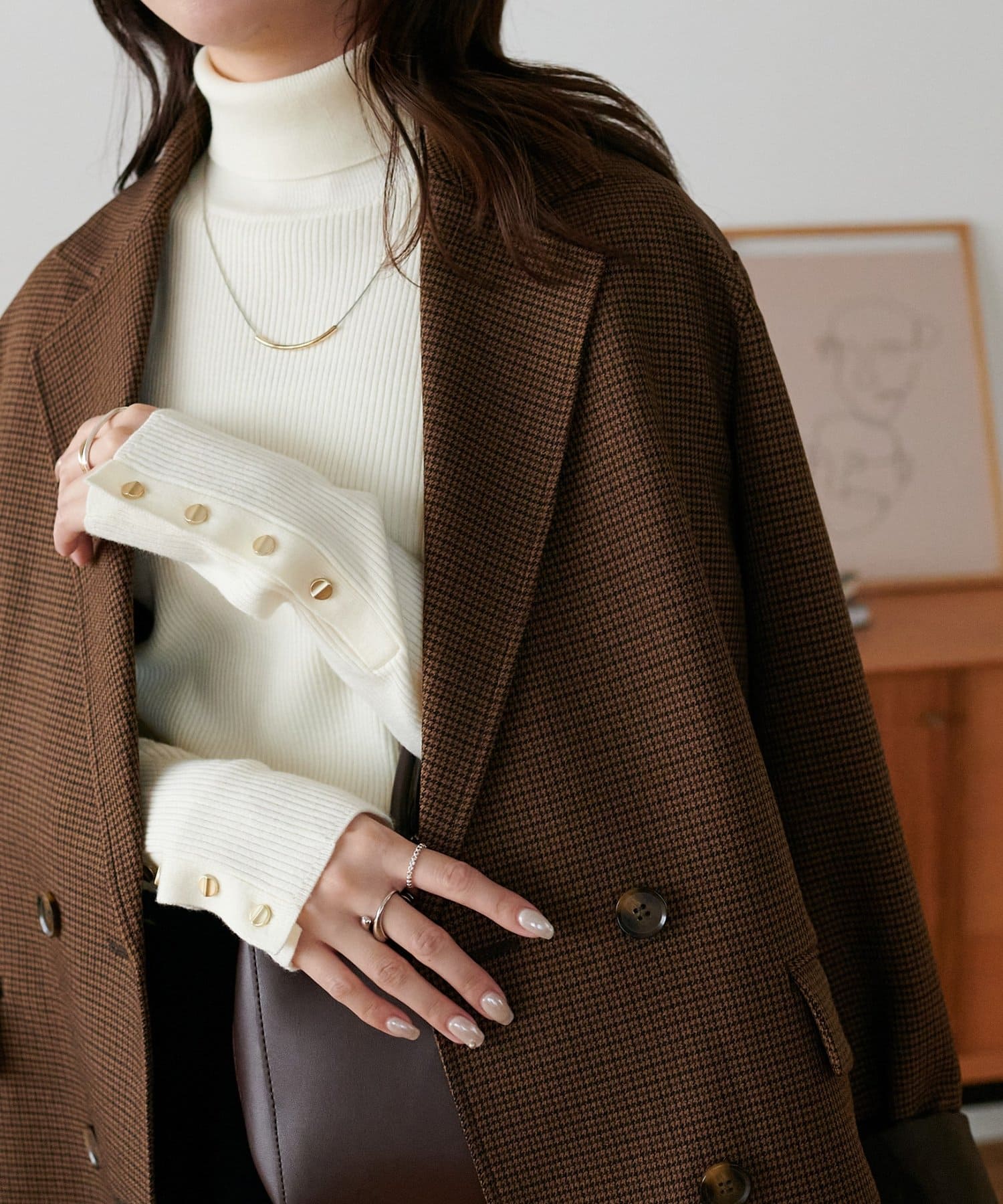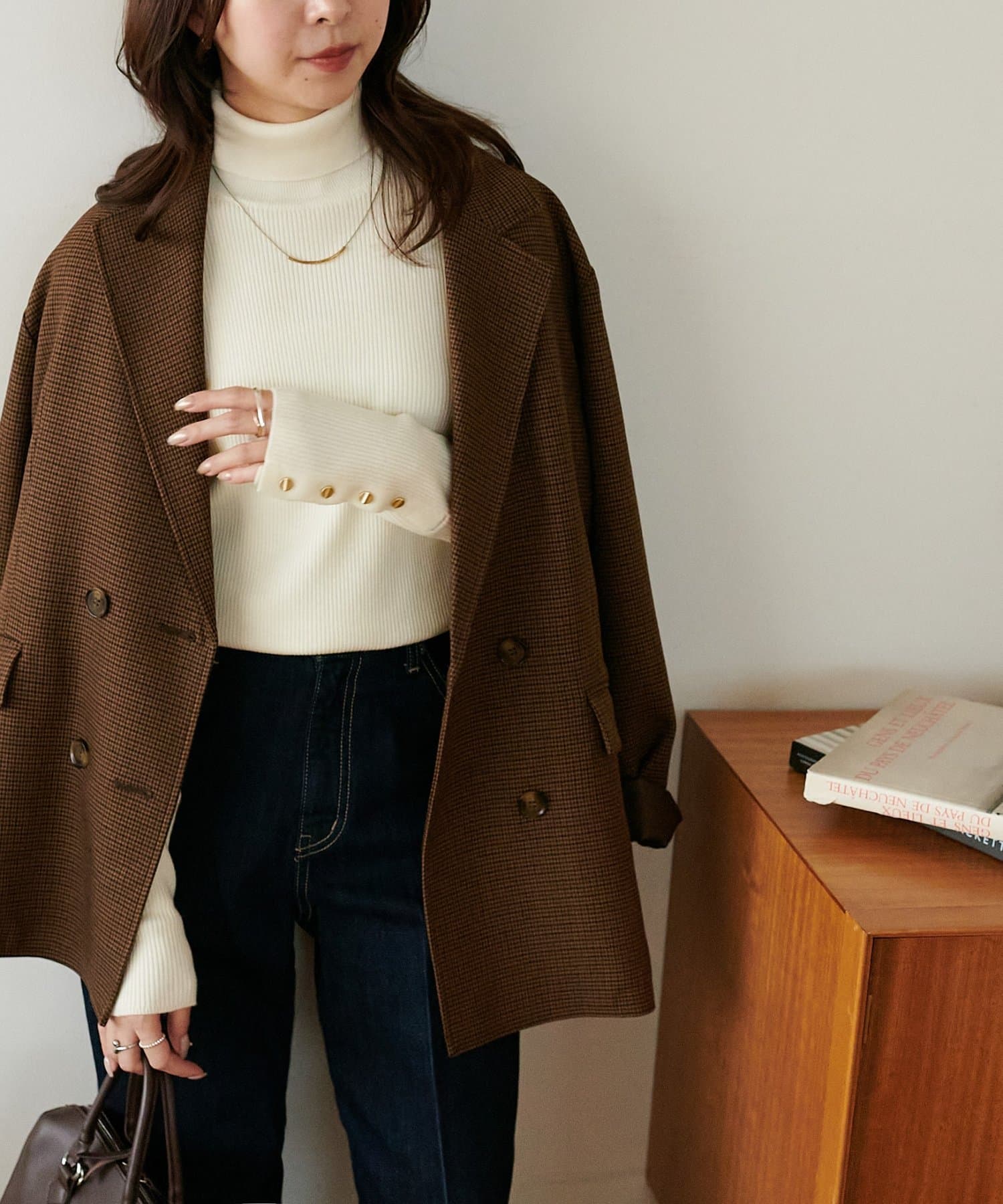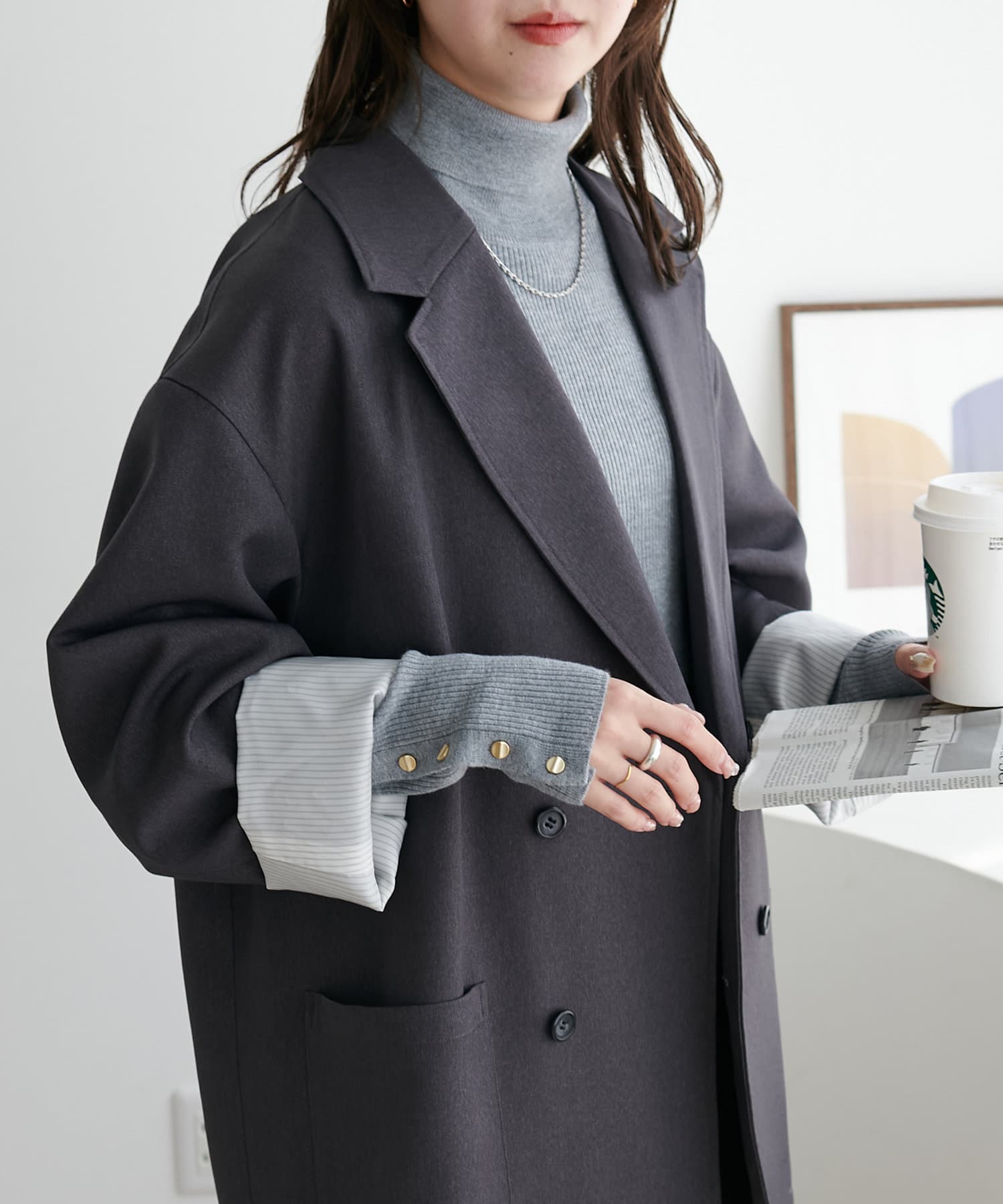 ゴールドのボタンはマットに仕上げたことで、コーデに馴染みやすく柔らかな印象をプラスします♪