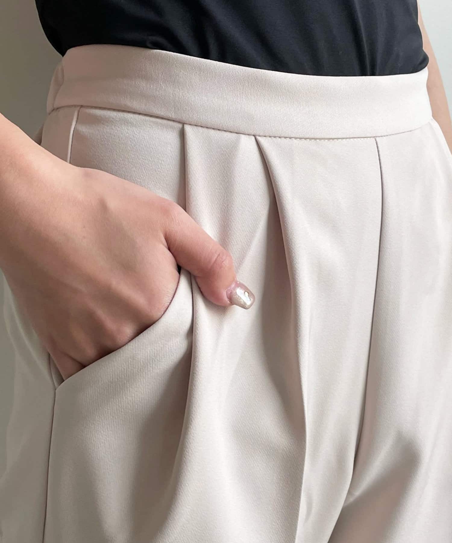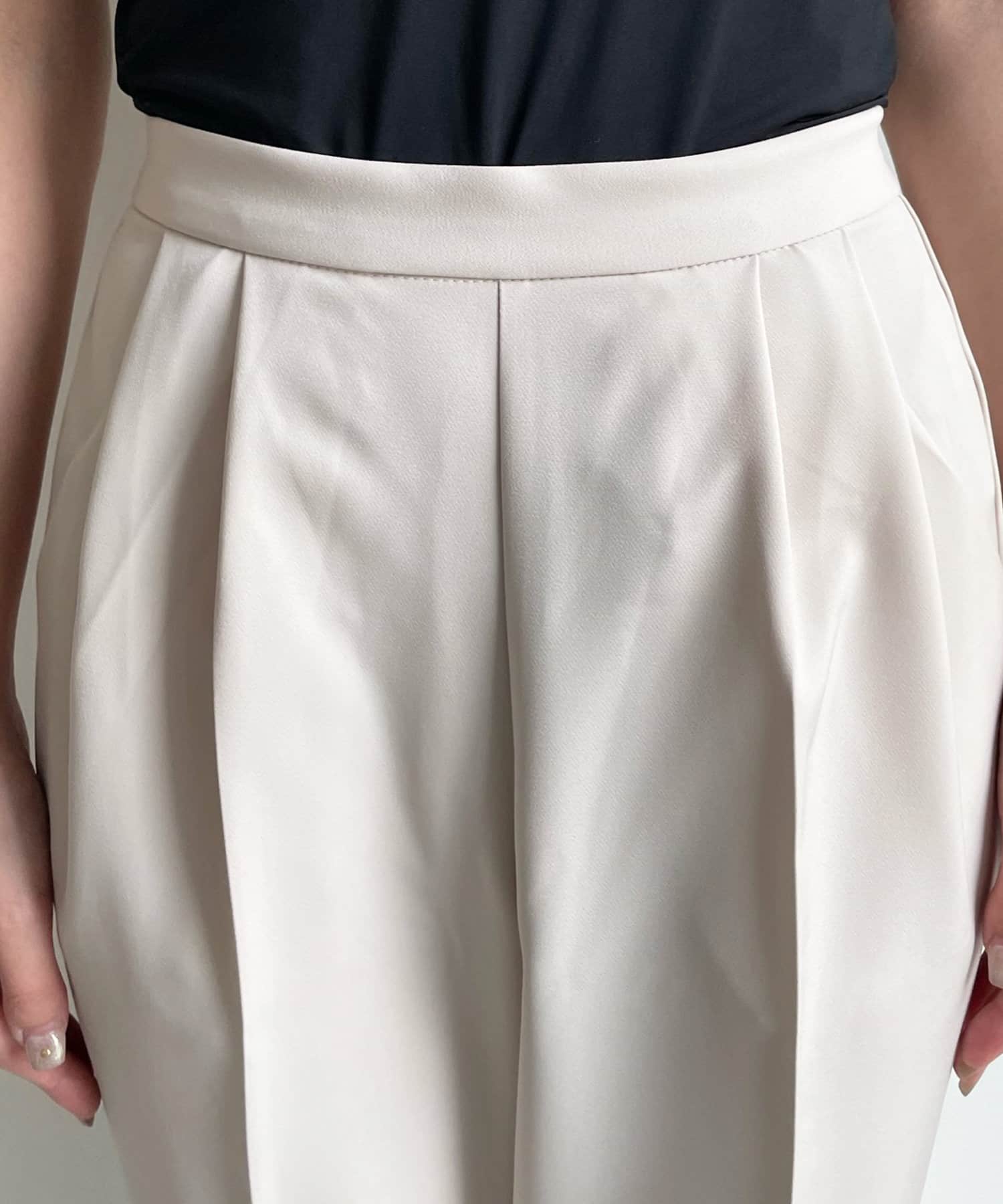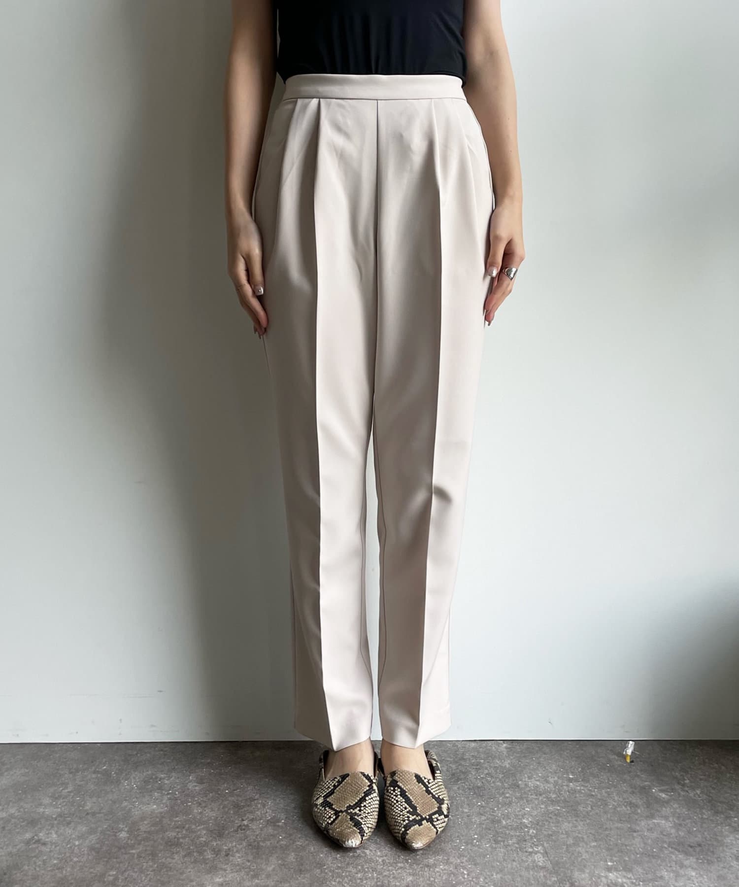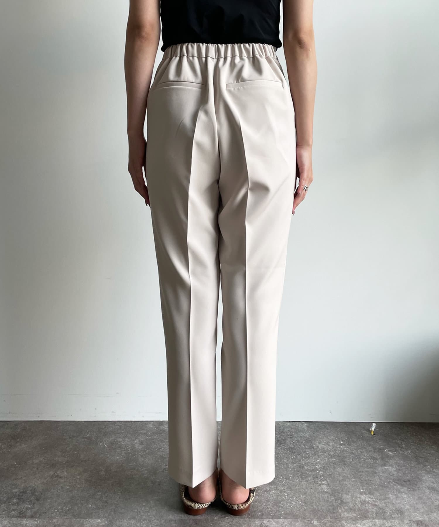 美シルエットの秘訣は、お腹周りをスッキリと見せるタック使いと縦ラインを強調するセンタープレス。さらに、脚長効果期待大のハイウエストデザインまでも。