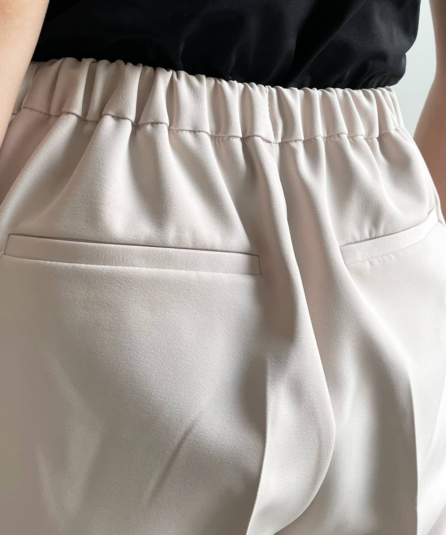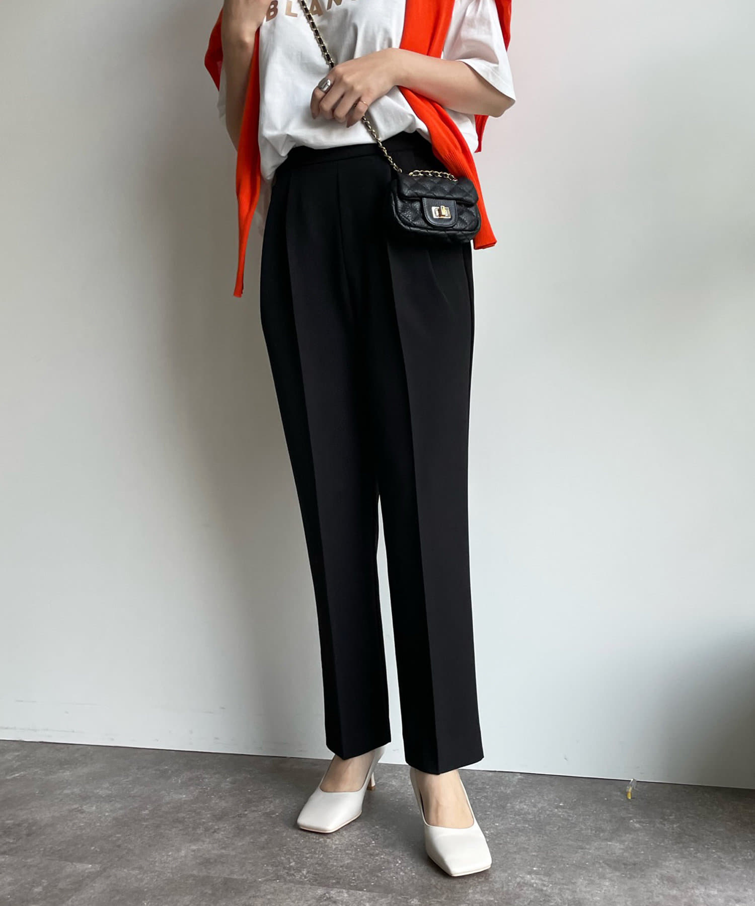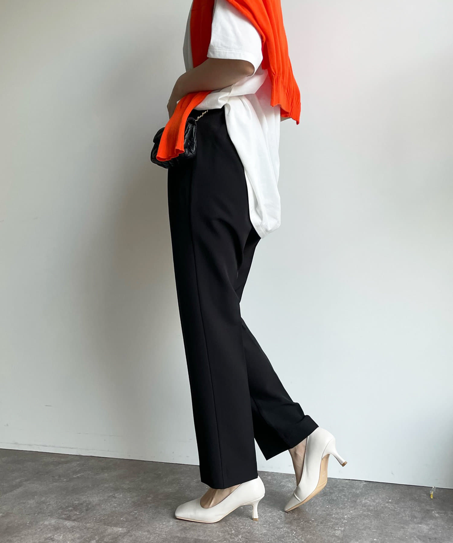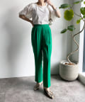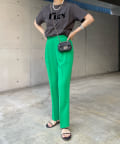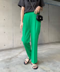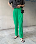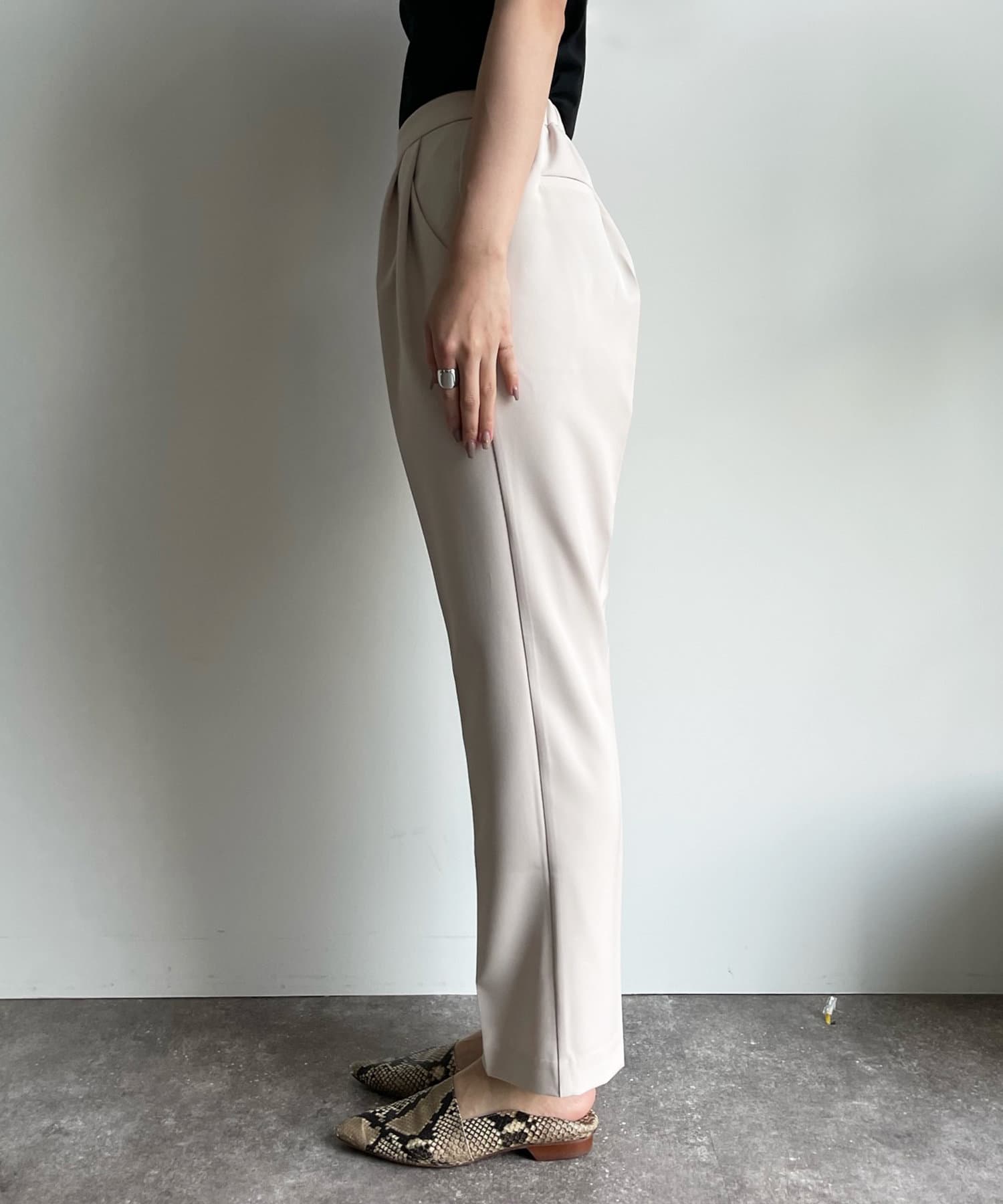 美シルエットの秘訣は、お腹周りをスッキリと見せるタック使いと縦ラインを強調するセンタープレス。さらに、脚長効果期待大のハイウエストデザインまでも。