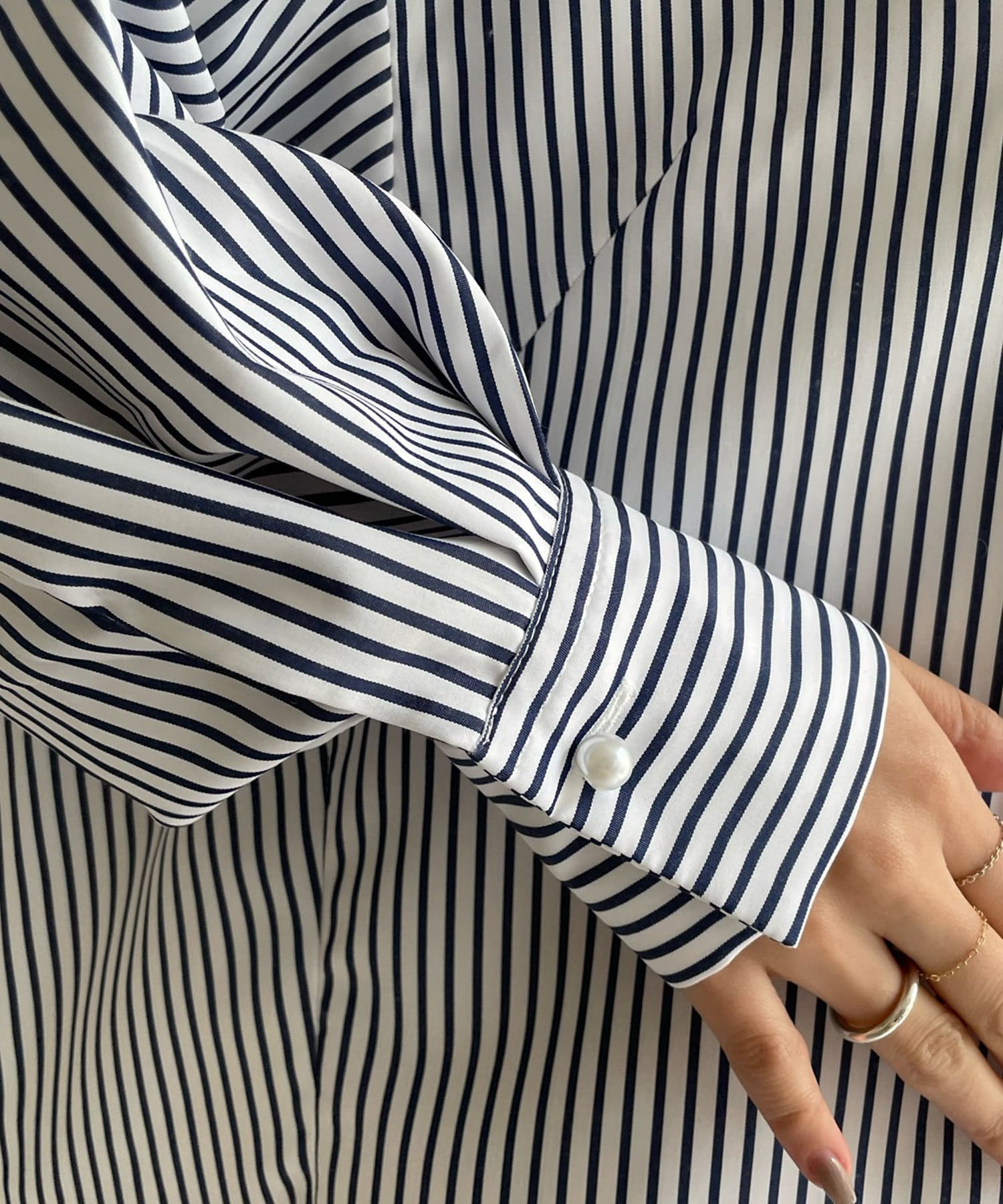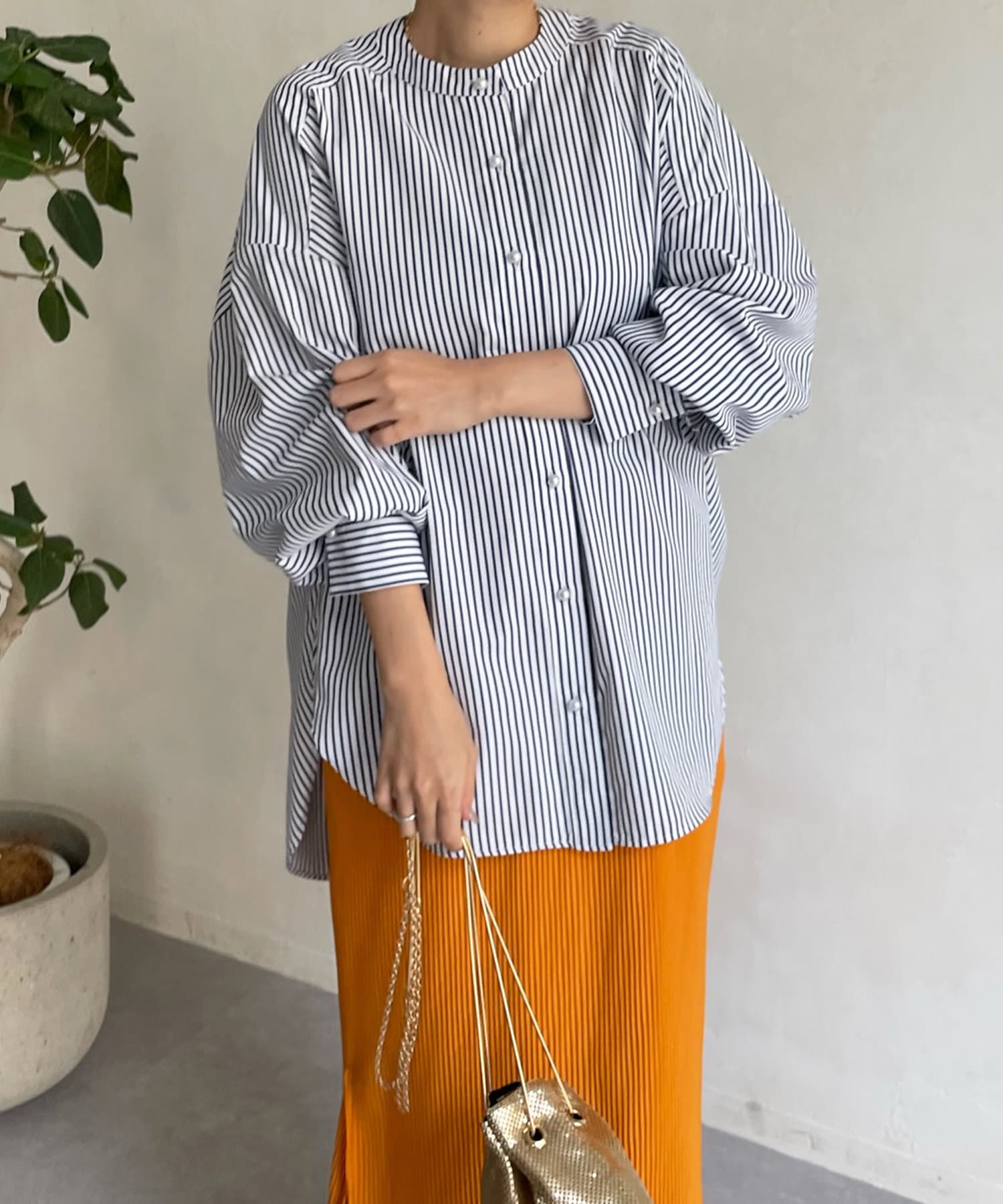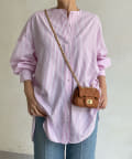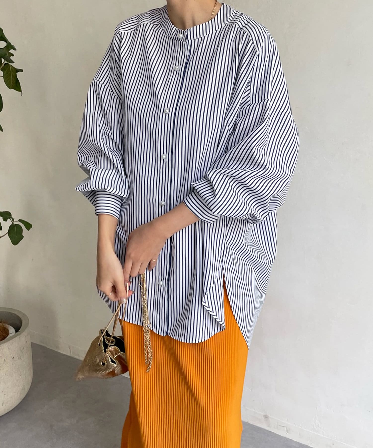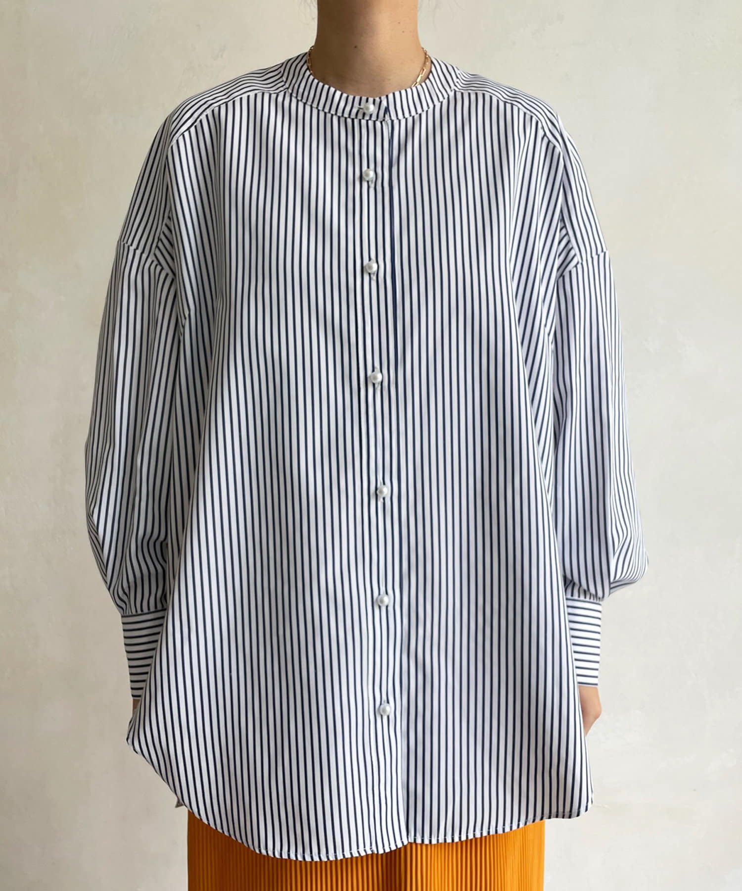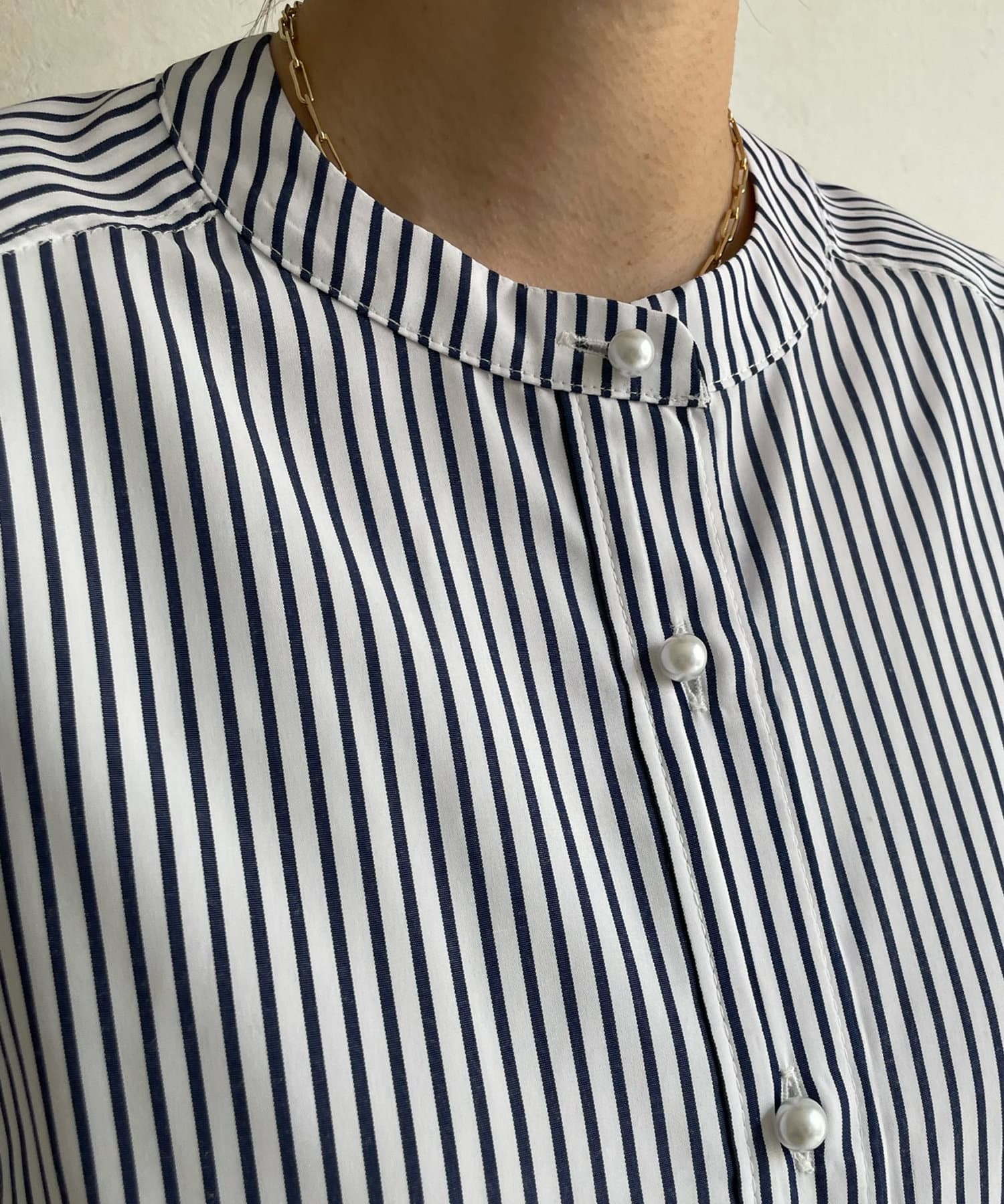 爽やかなストライプのノーカラーシャツに、程よくフェミニンな印象を与えるパールボタンをプラス。