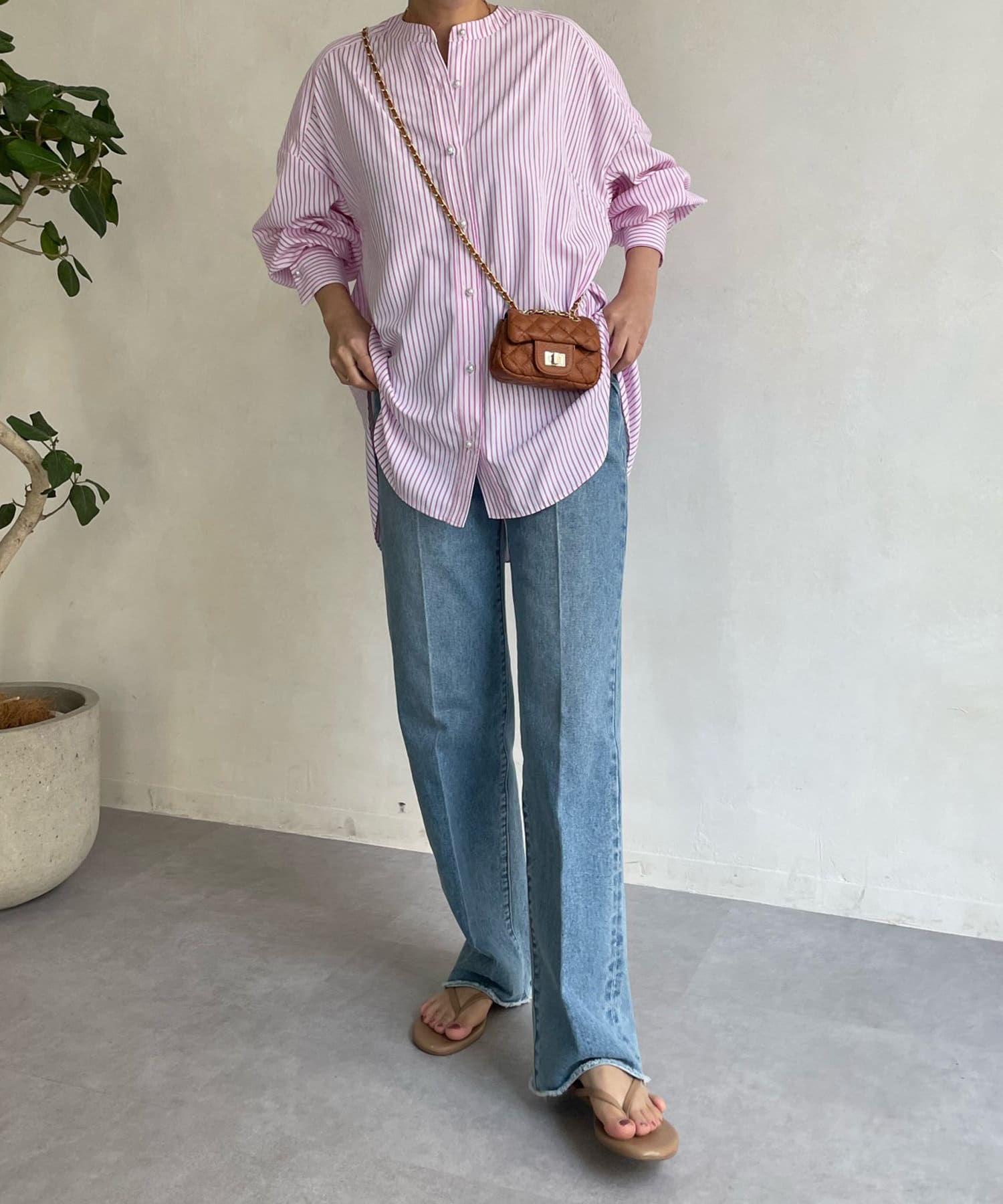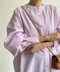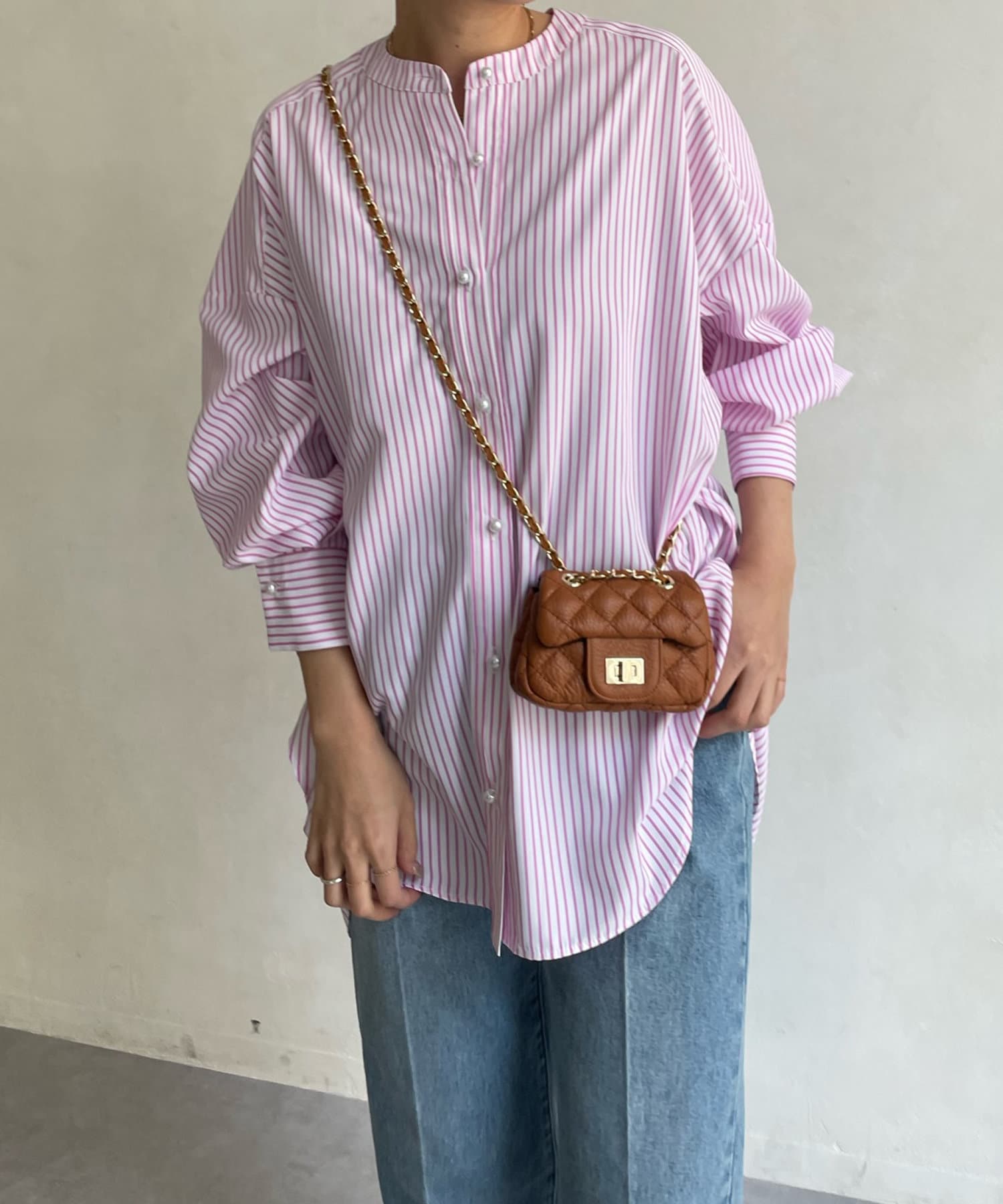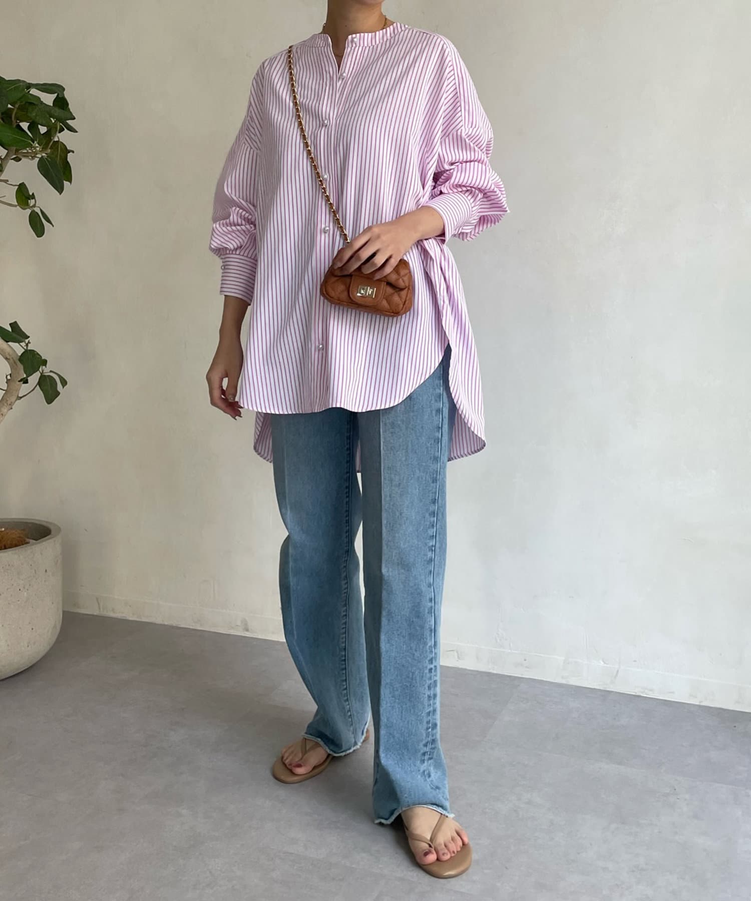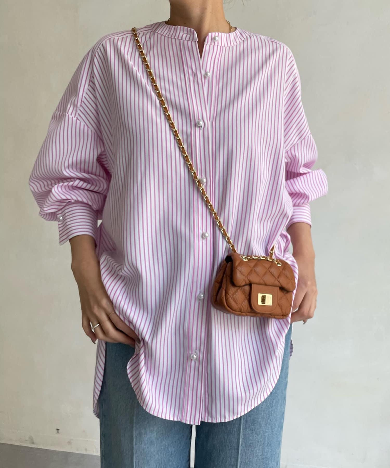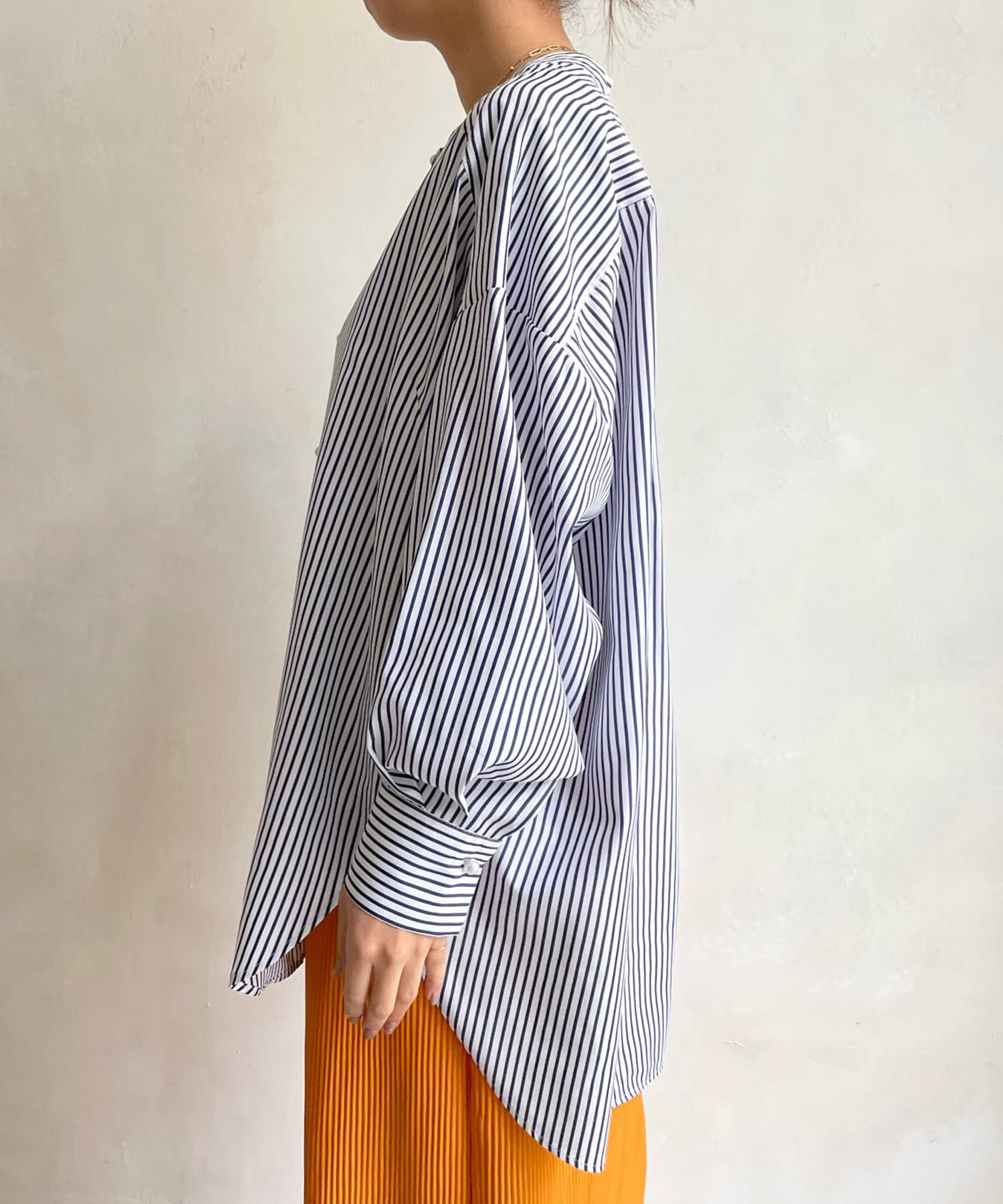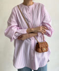爽やかなストライプのノーカラーシャツに、程よくフェミニンな印象を与えるパールボタンをプラス。