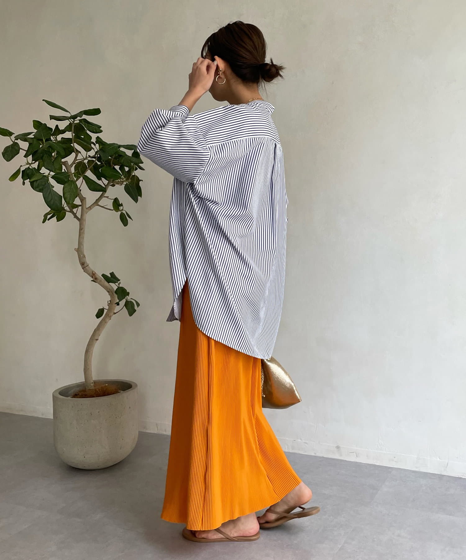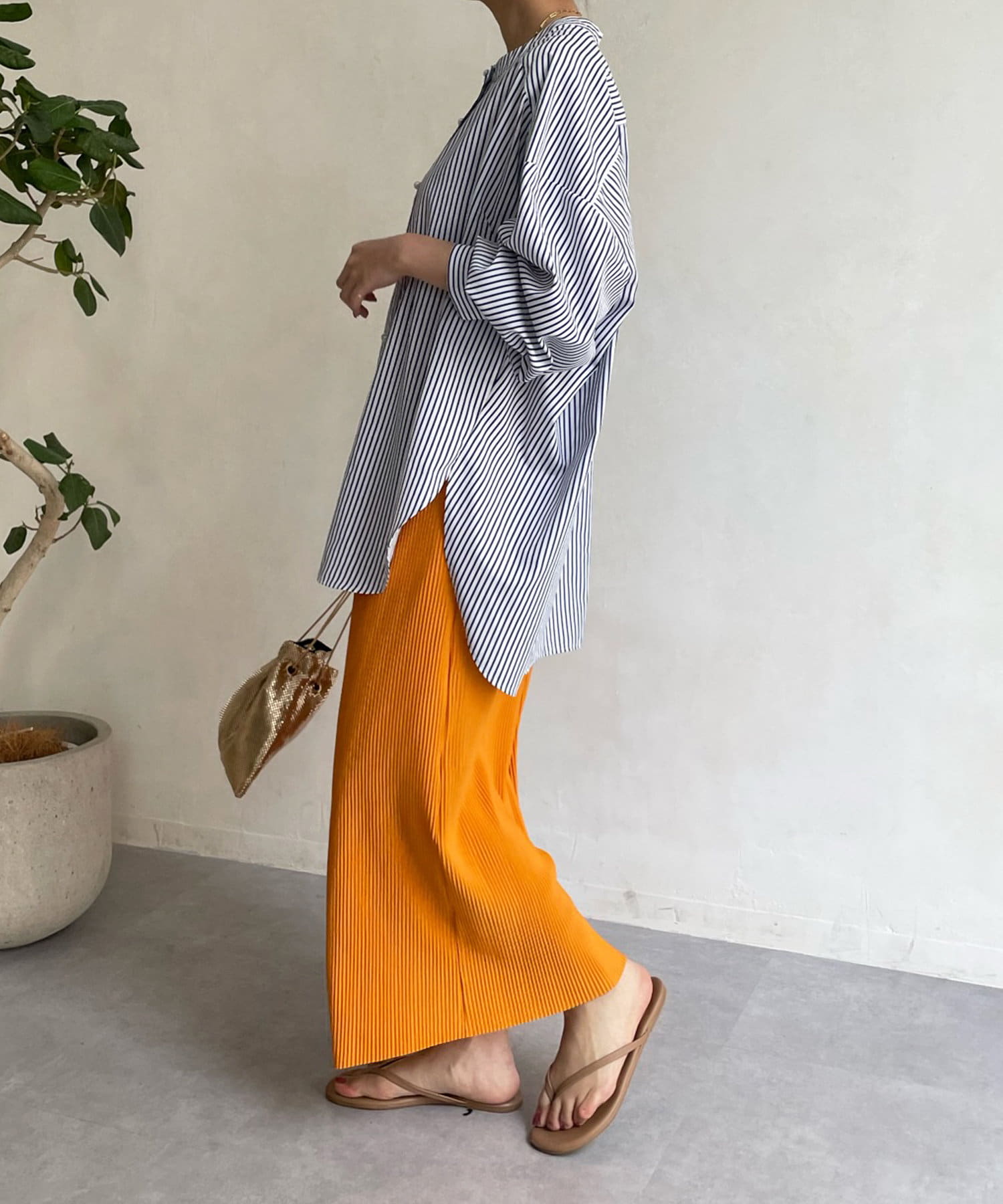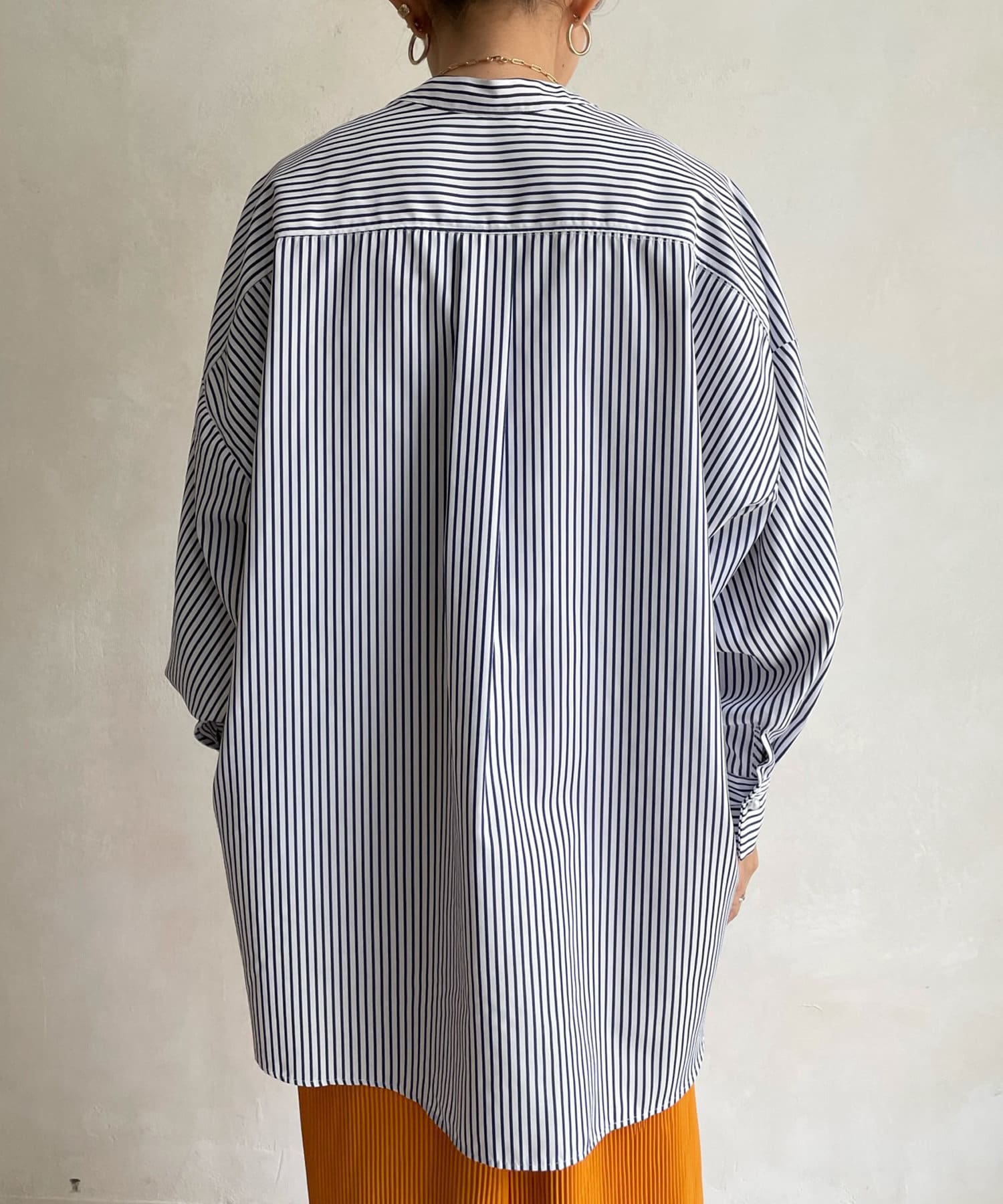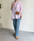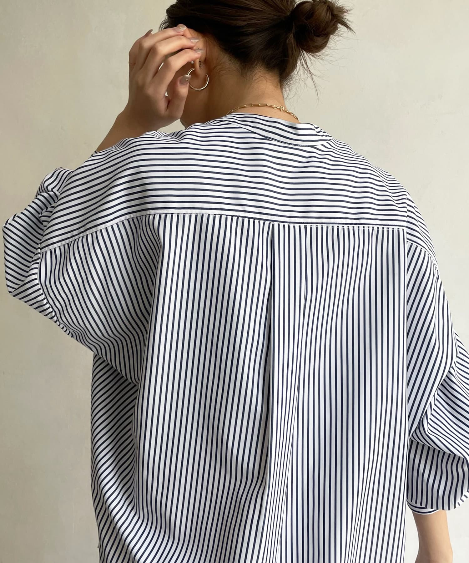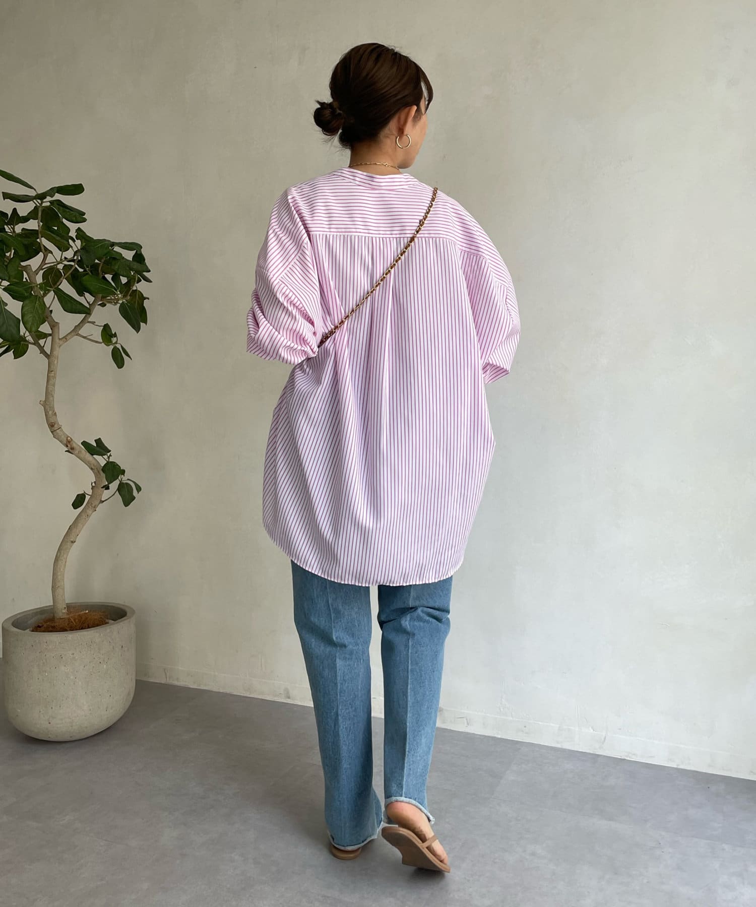 爽やかなストライプのノーカラーシャツに、程よくフェミニンな印象を与えるパールボタンをプラス。