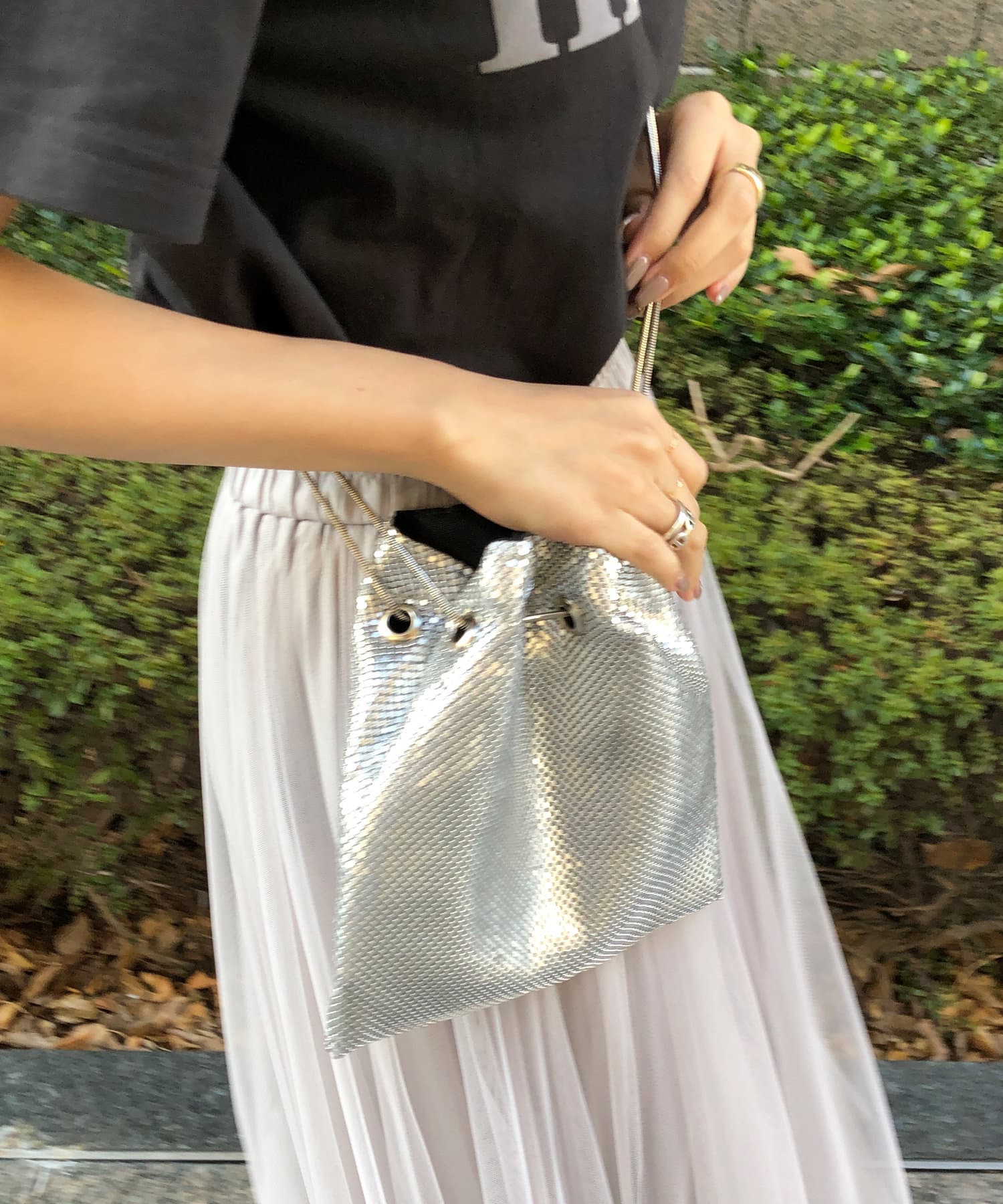 アクセントを与えてくれるメタリックなバッグ