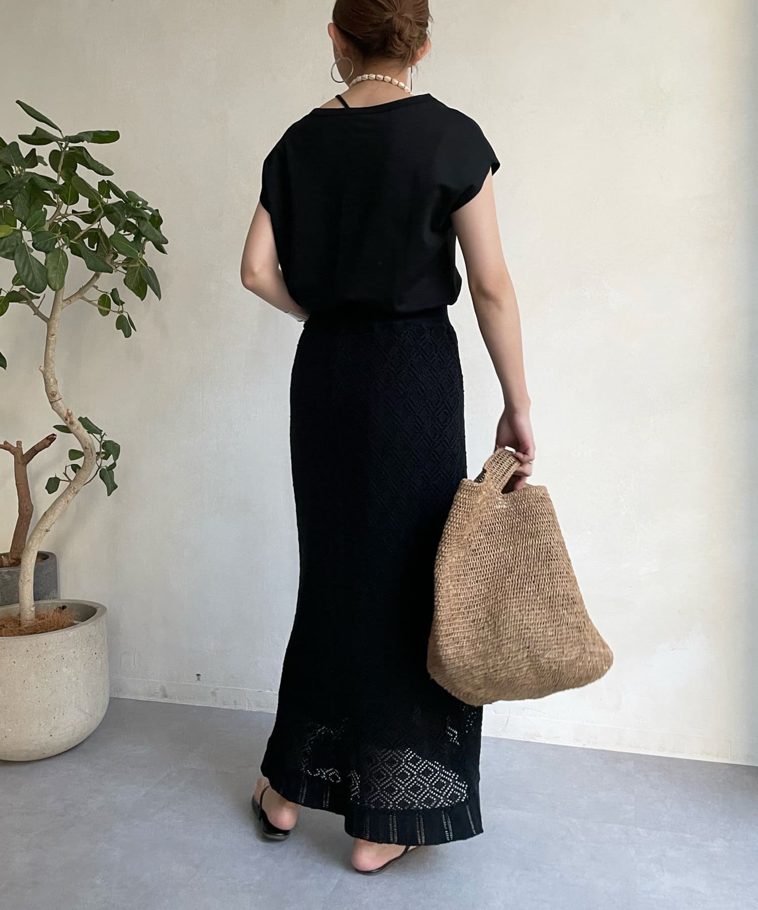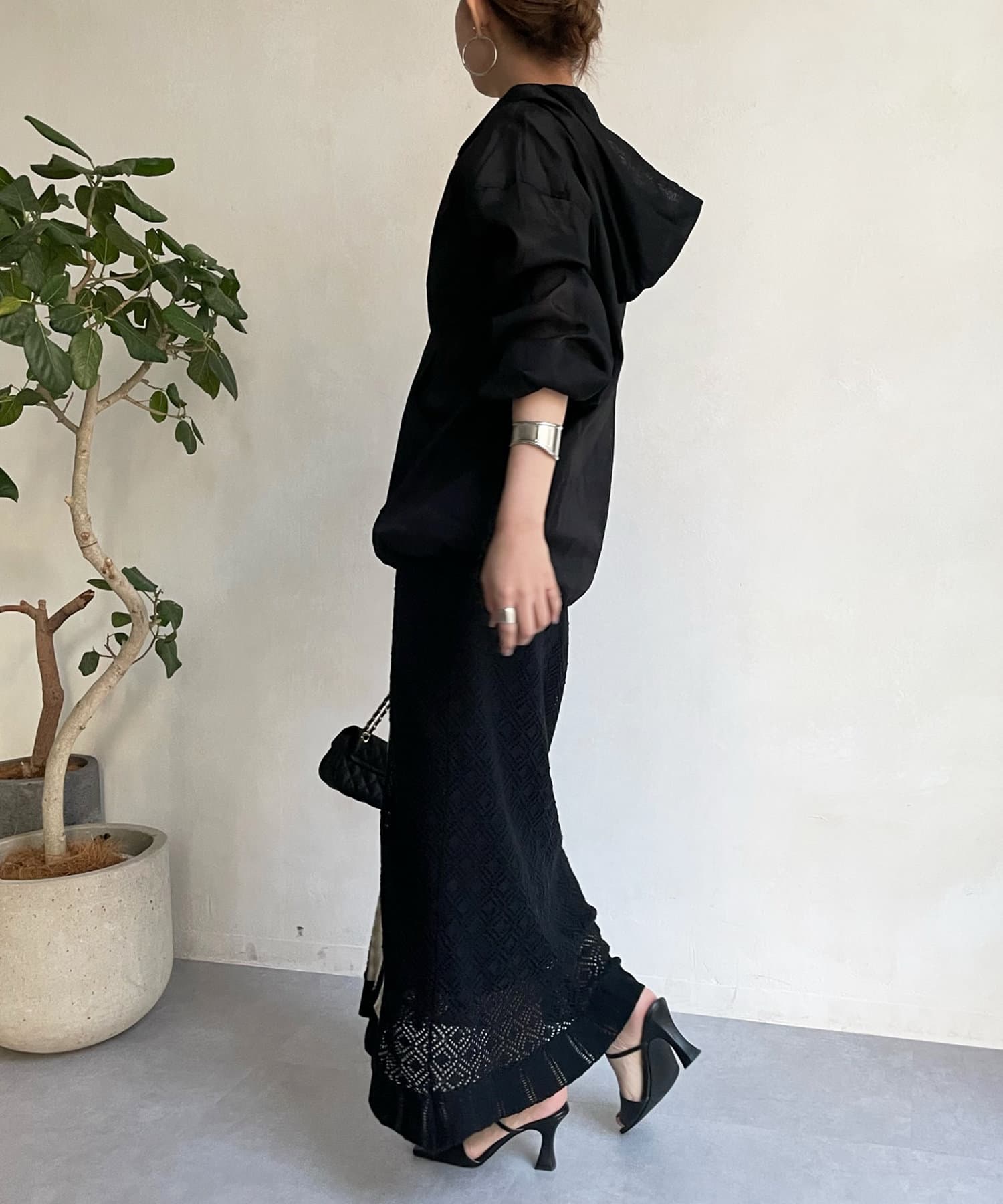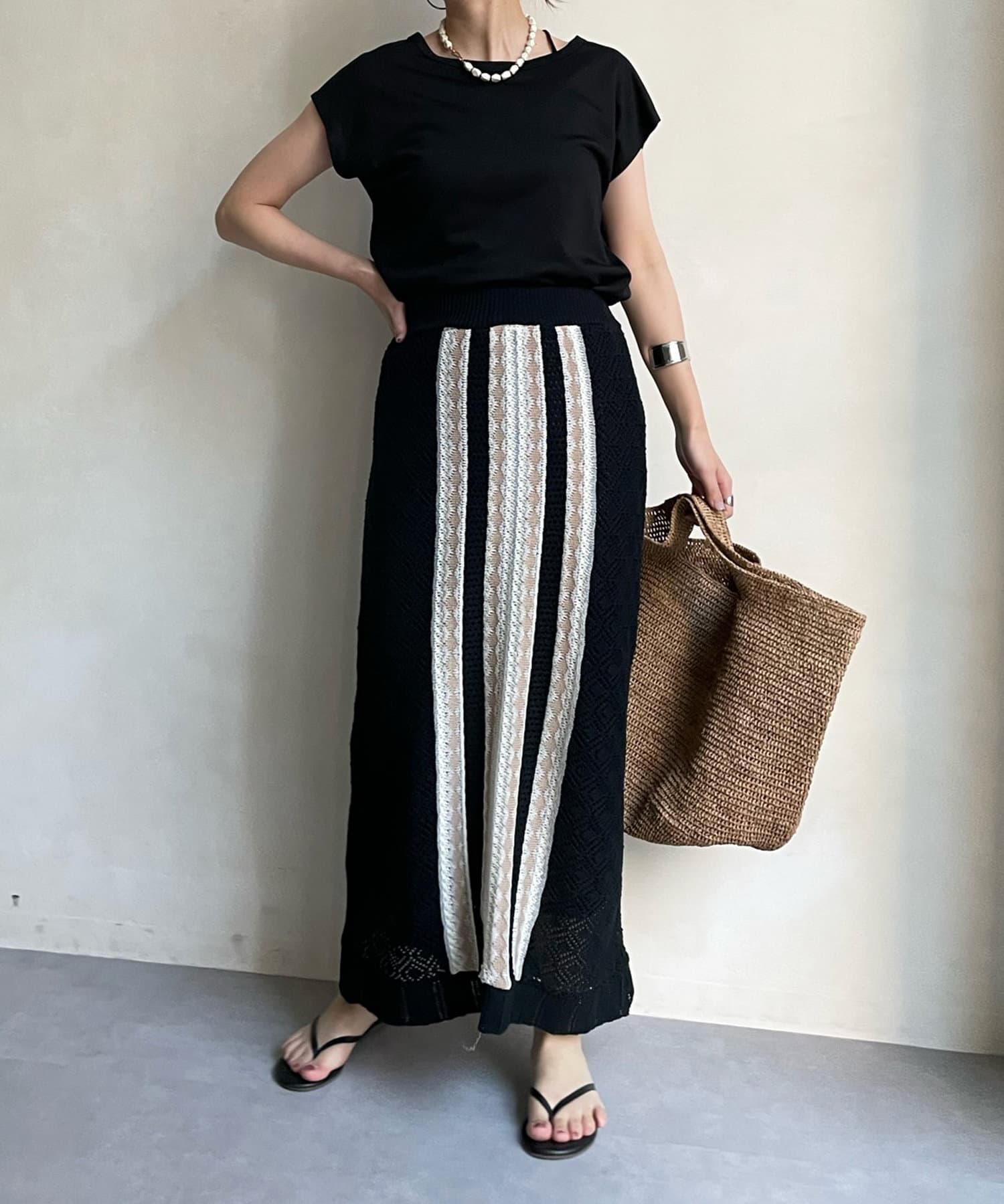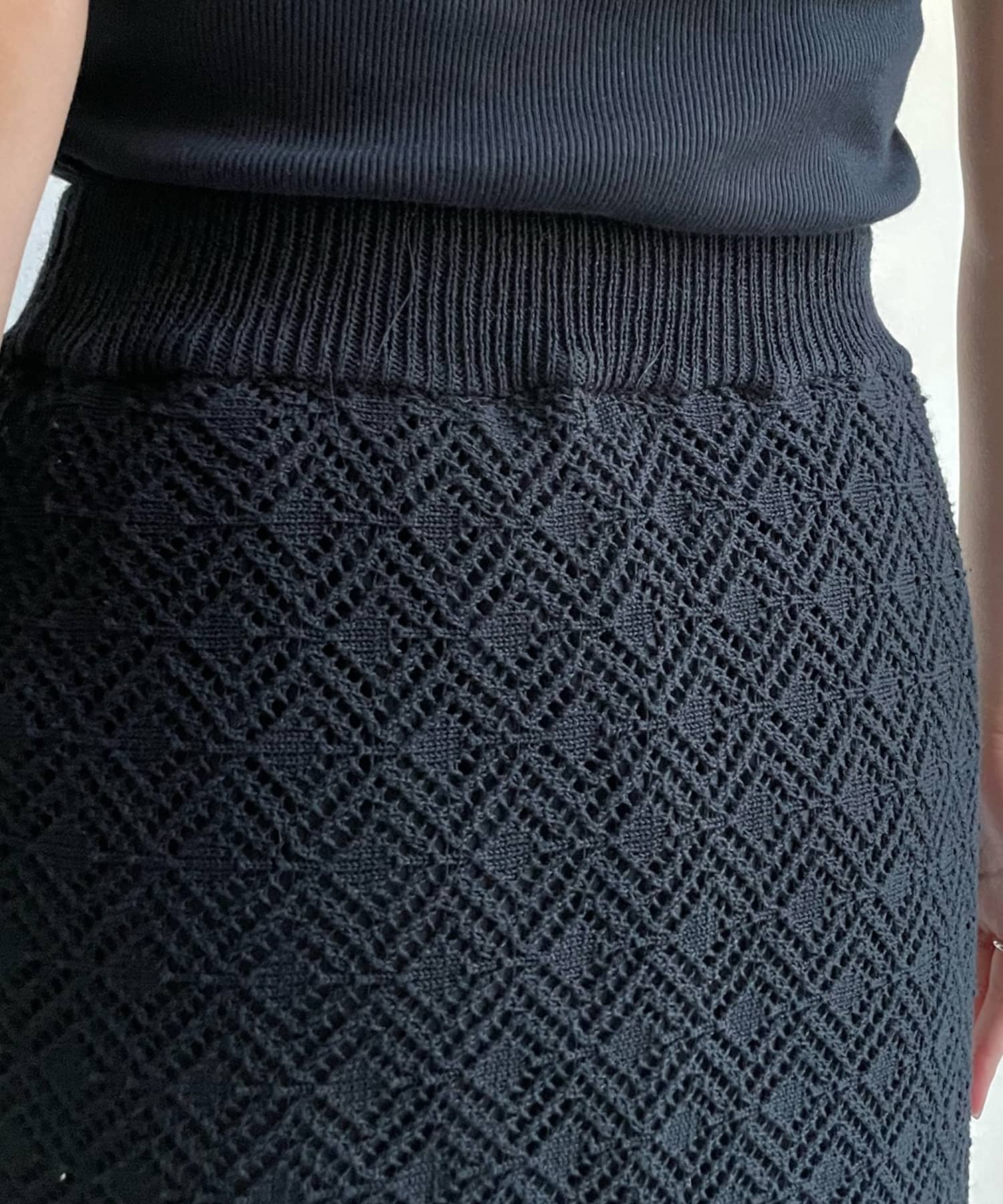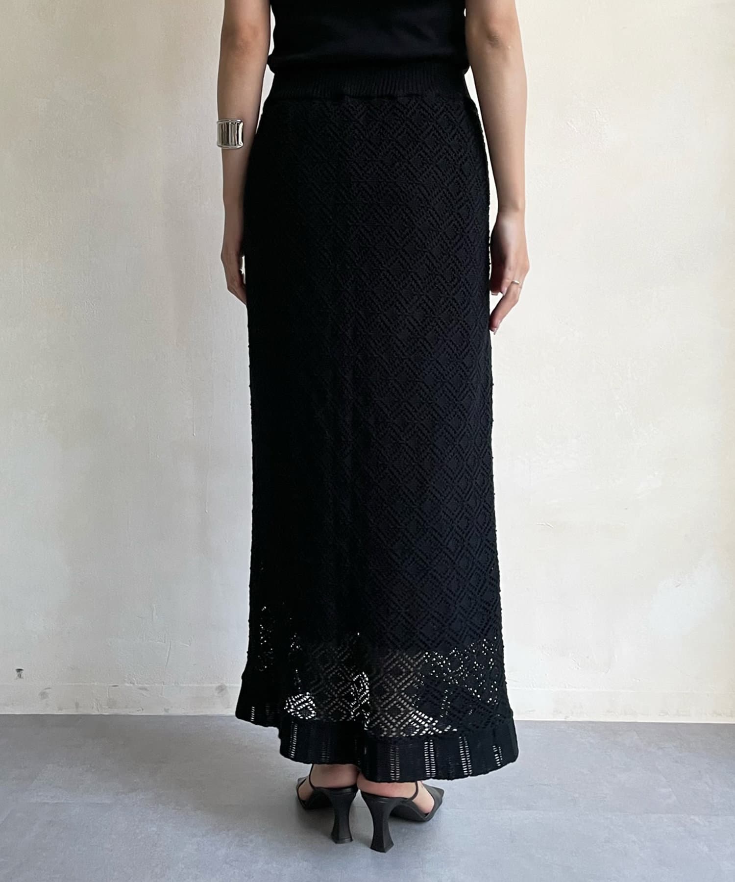 程よい透け感とトレンド感のあるカラーのクロシェ編みニットスカートはコーデの主役になるおしゃれな1着。