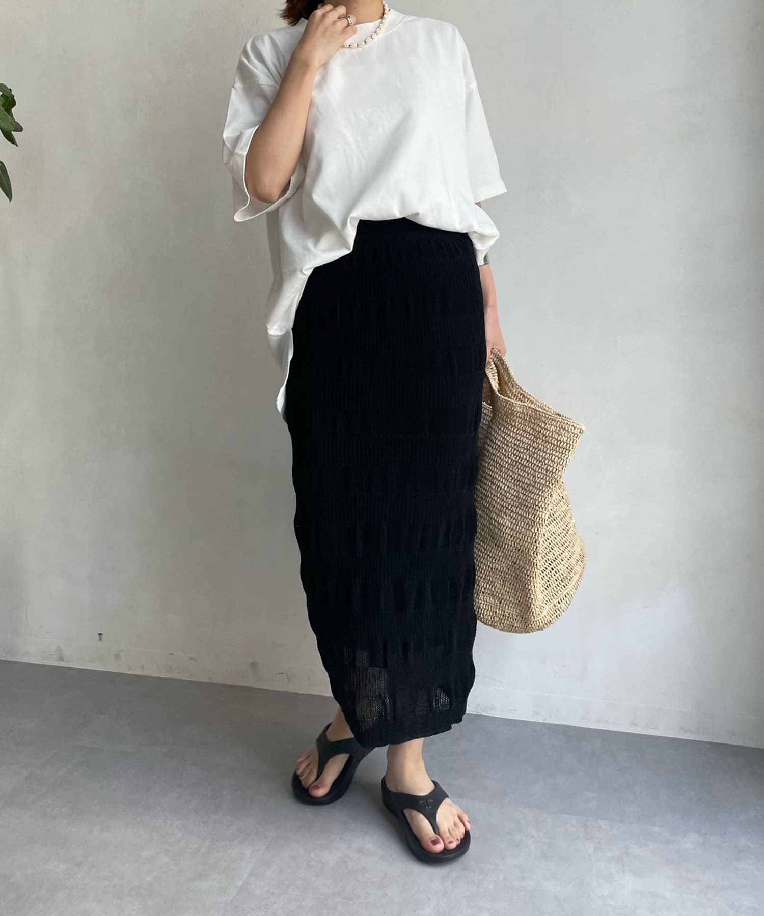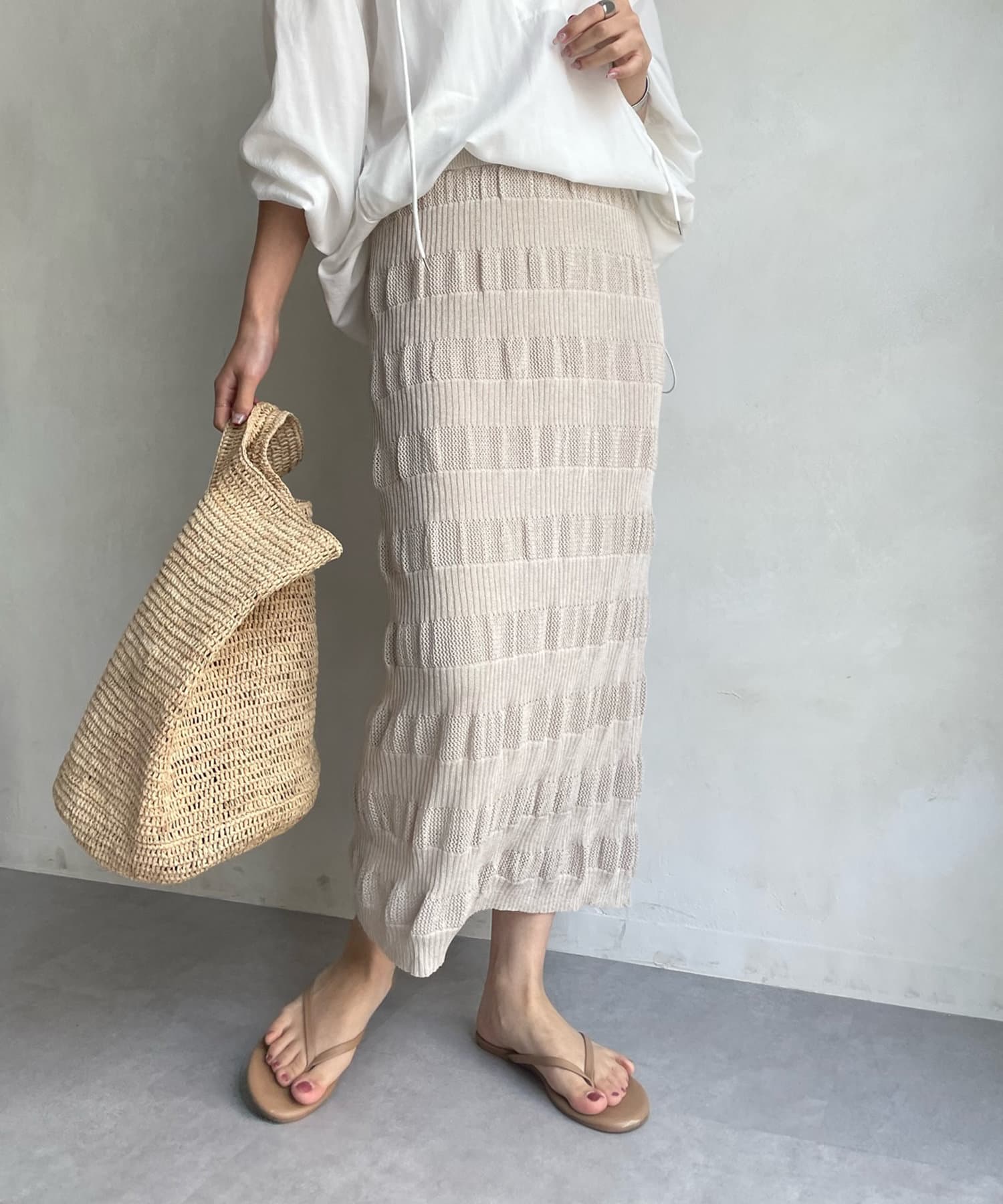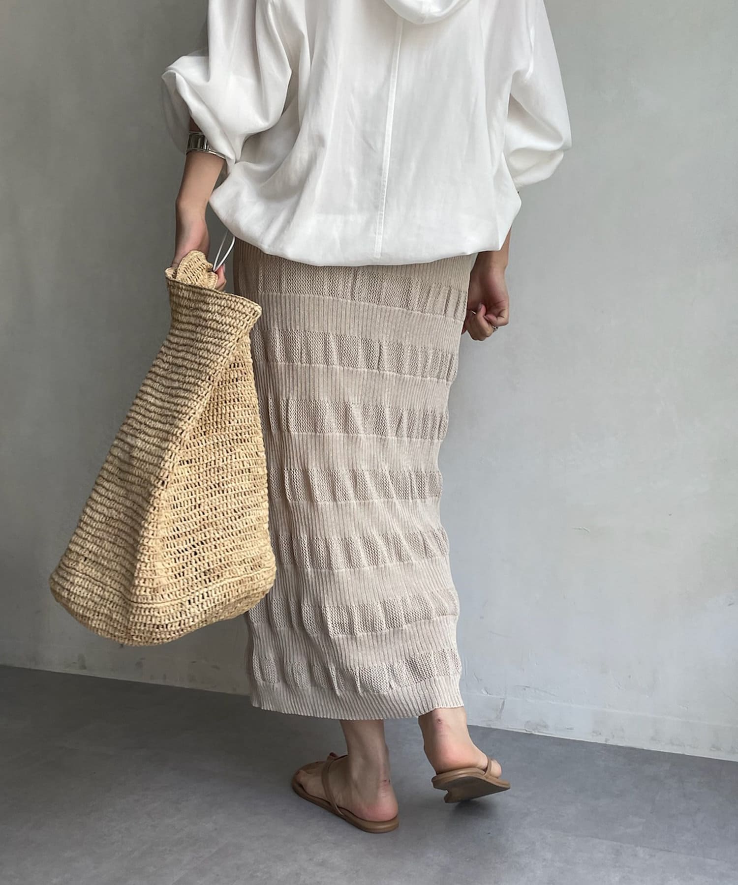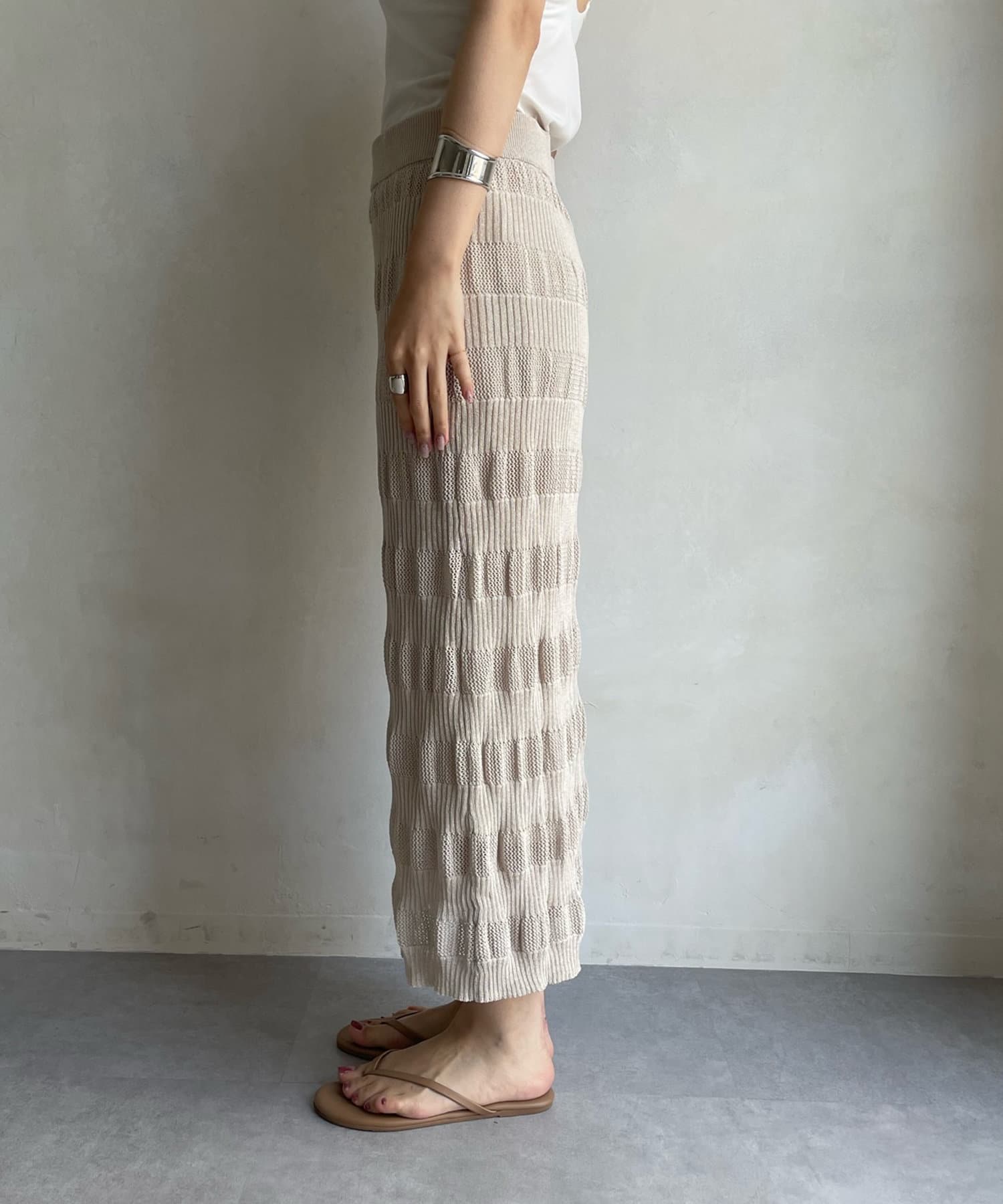 リブとメッシュの編地で見た目も涼しげで春夏にピッタリ!ウエストゴム仕様で楽なうえ、ソフトな生地で伸縮性があり、足さばきもしやすく実用性も◎裏表情ある生地感が、シンプルなトップスと合わせるだけでしっかり様見え◎地付きで透ける心配もなく穿いて頂けます。