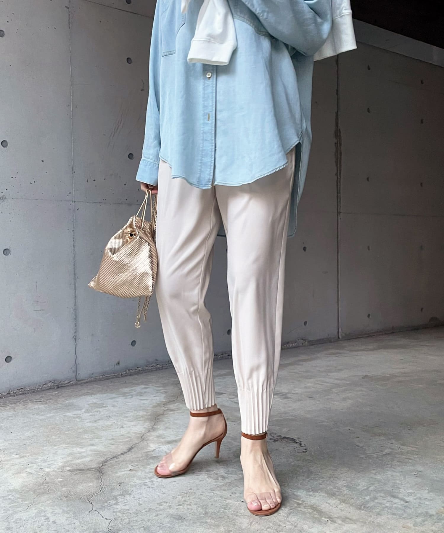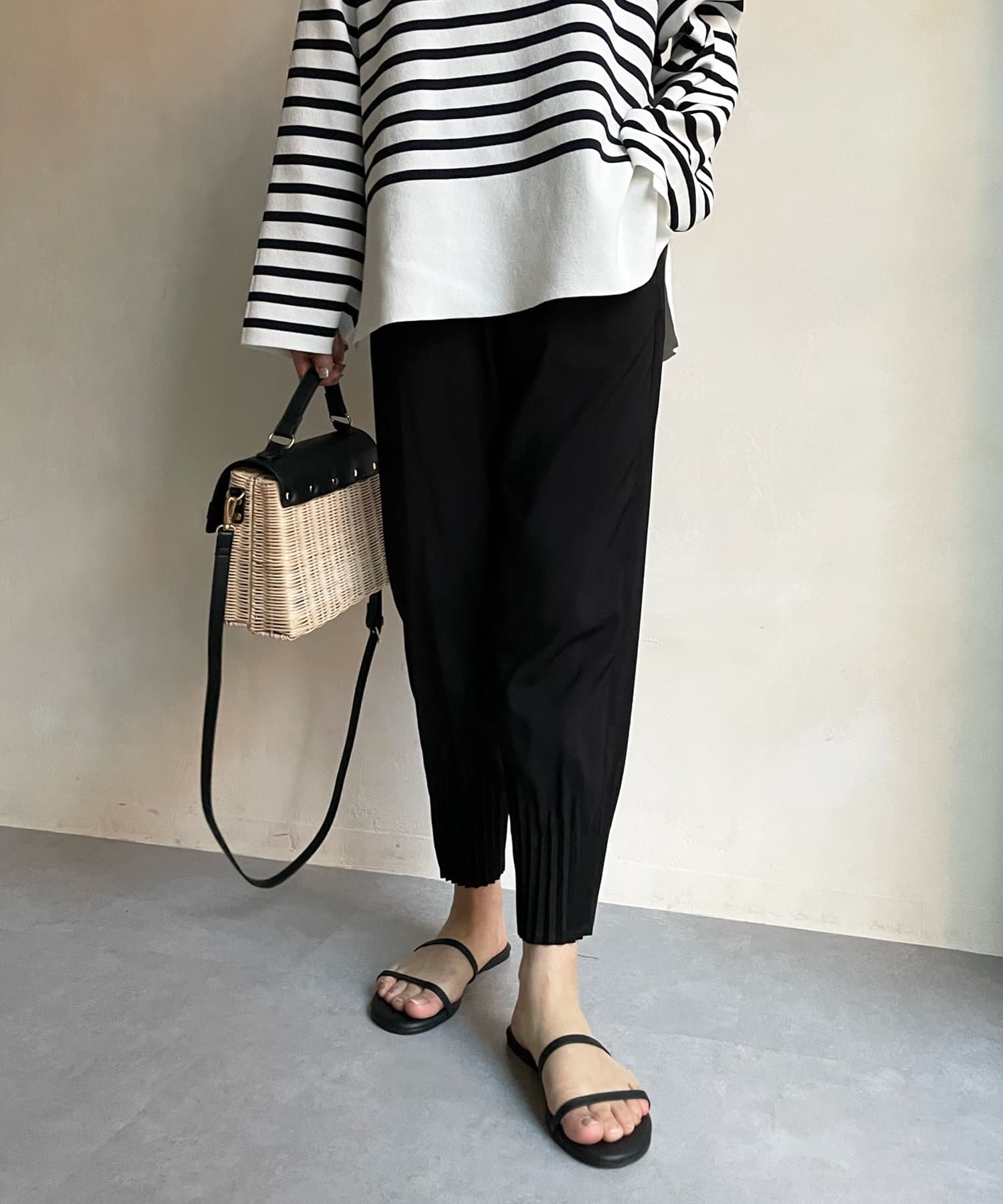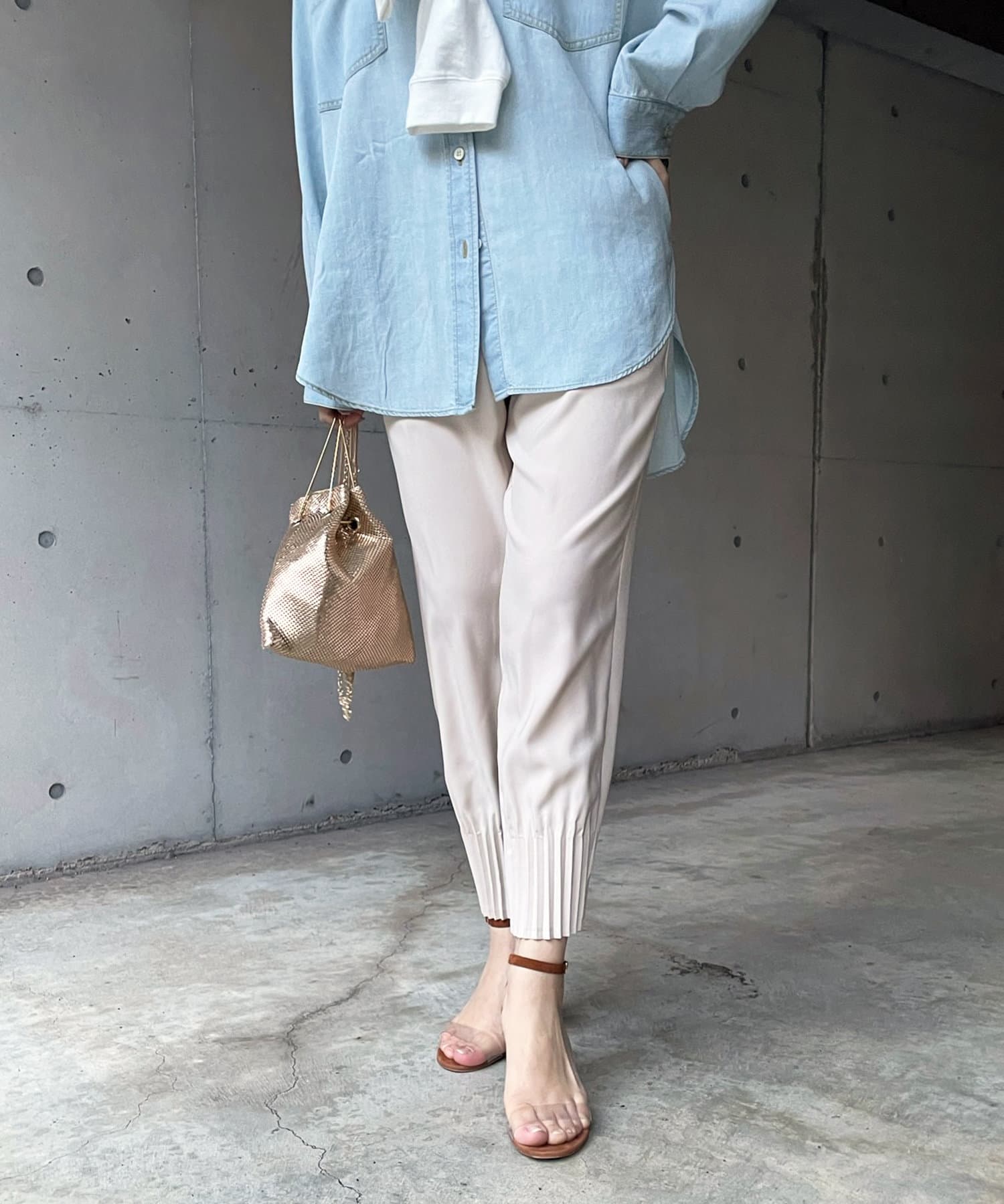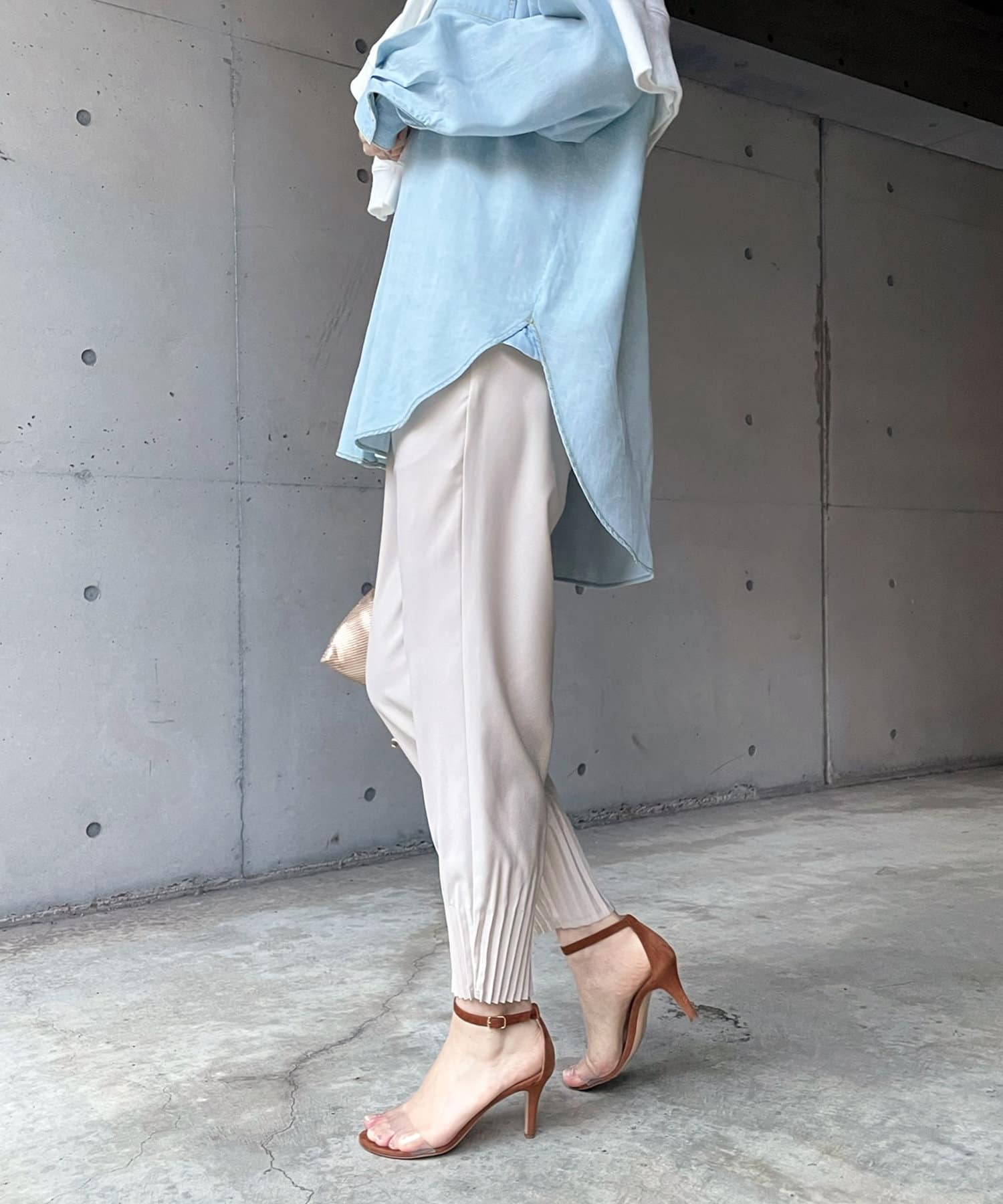 裾にプリーツ加工を施すことで、上品な印象をプラス。足首に沿うシルエットは、足元を綺麗に見せ、トレンドスタイルを叶えます。