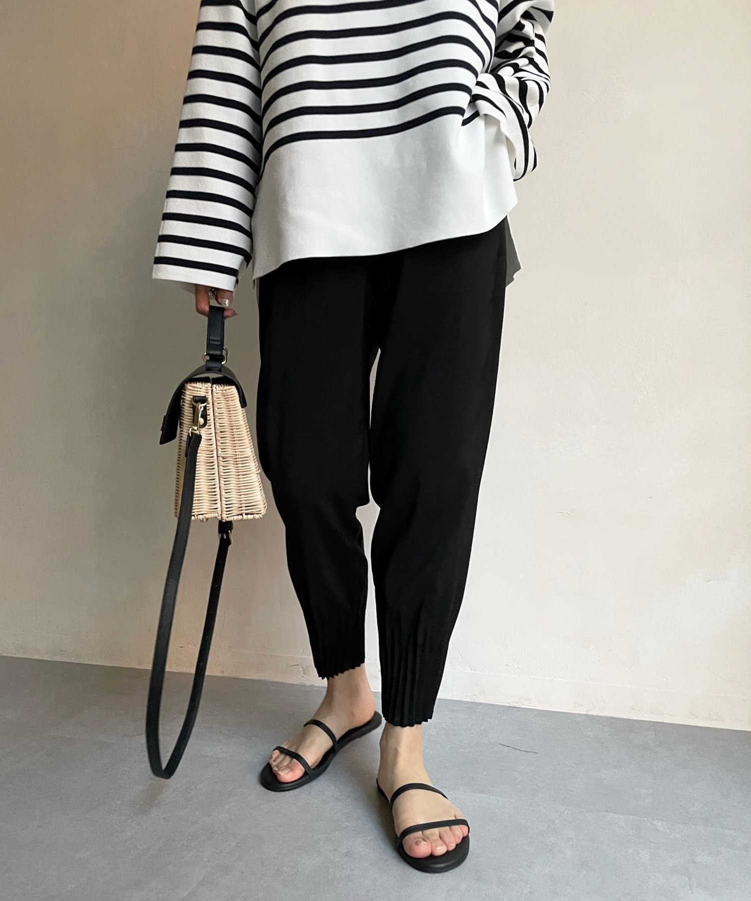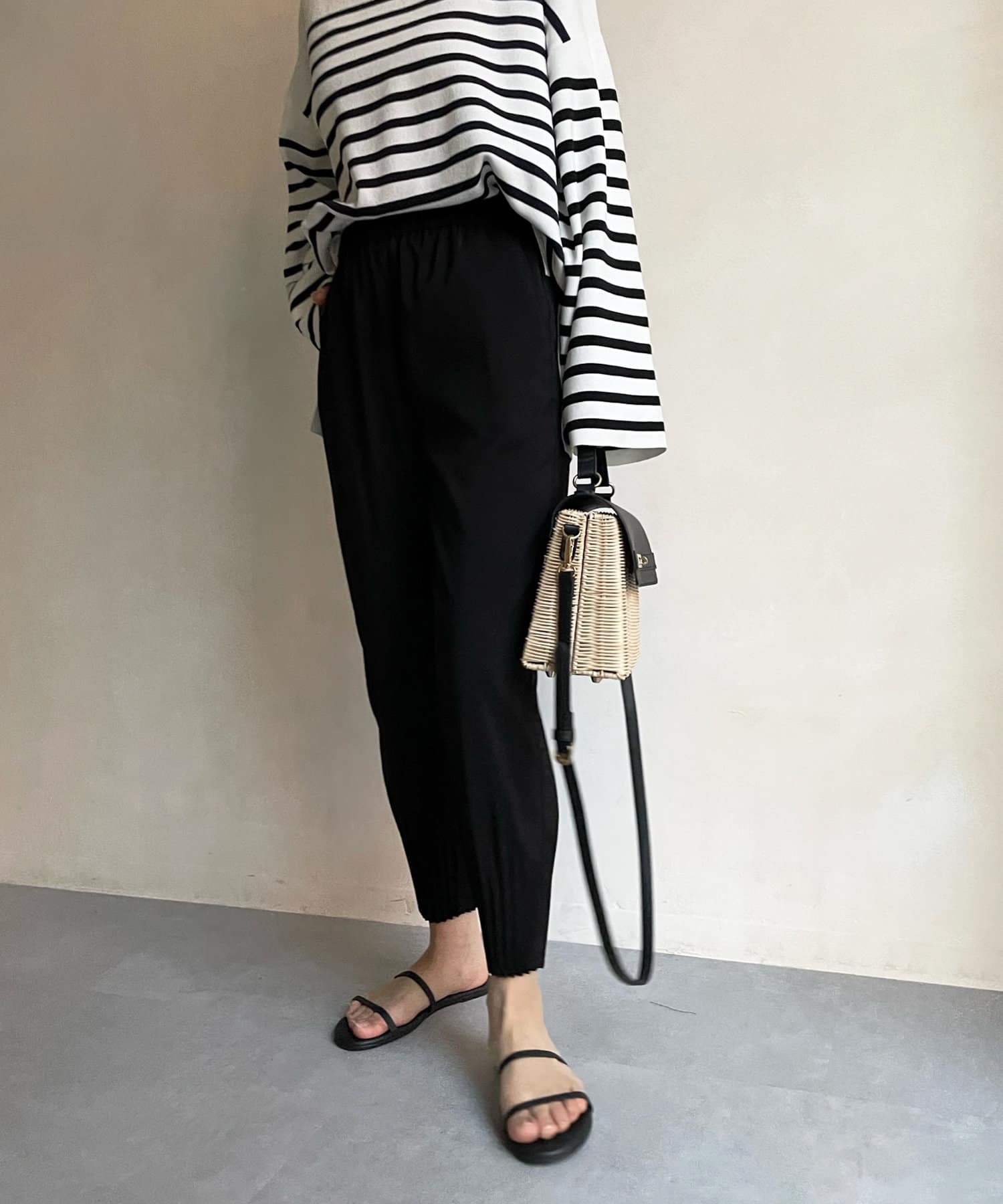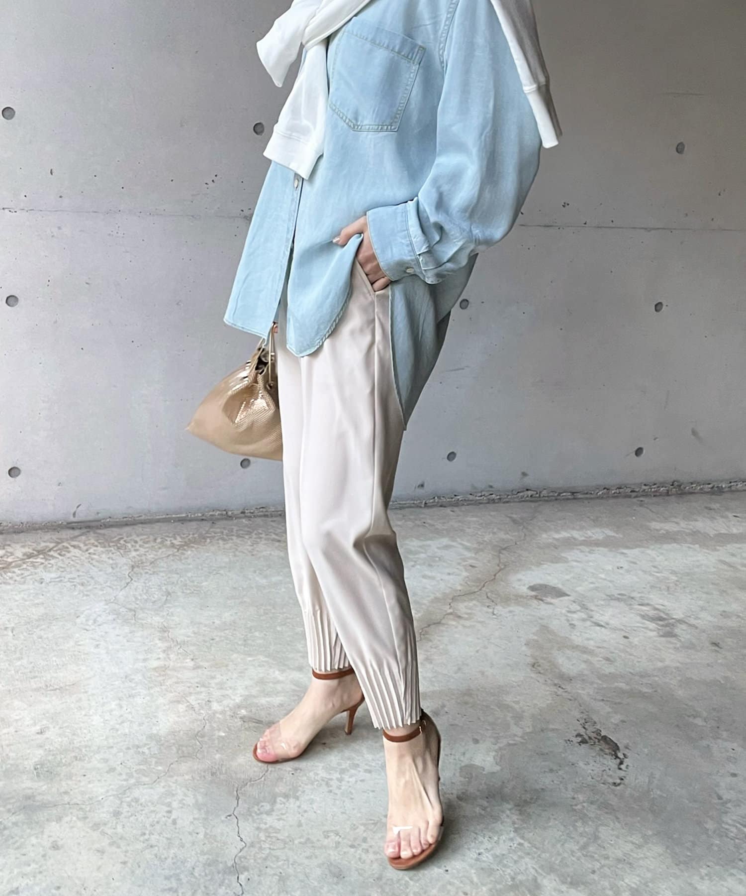 裾にプリーツ加工を施すことで、上品な印象をプラス。足首に沿うシルエットは、足元を綺麗に見せ、トレンドスタイルを叶えます。