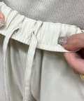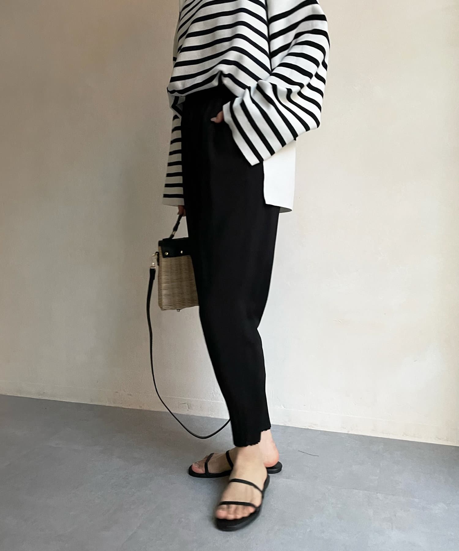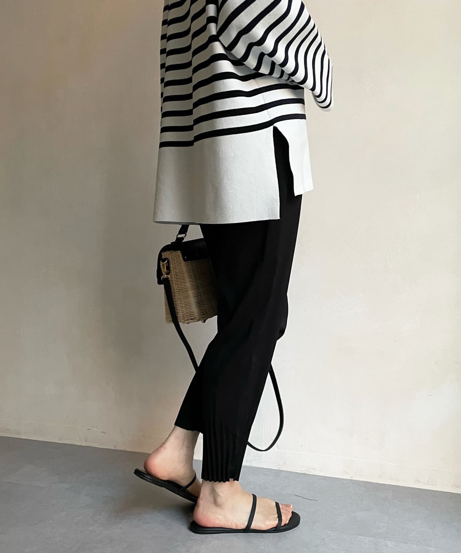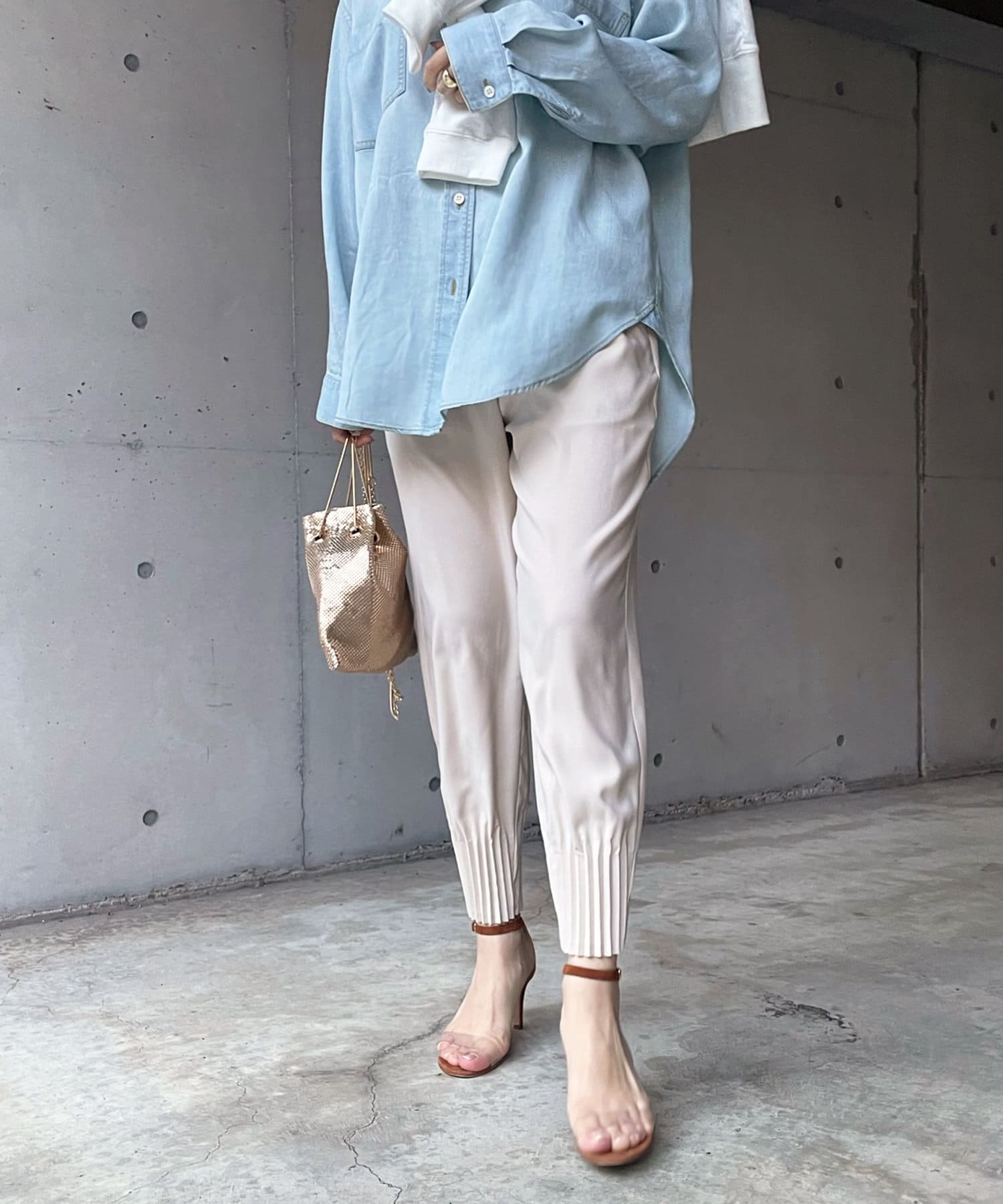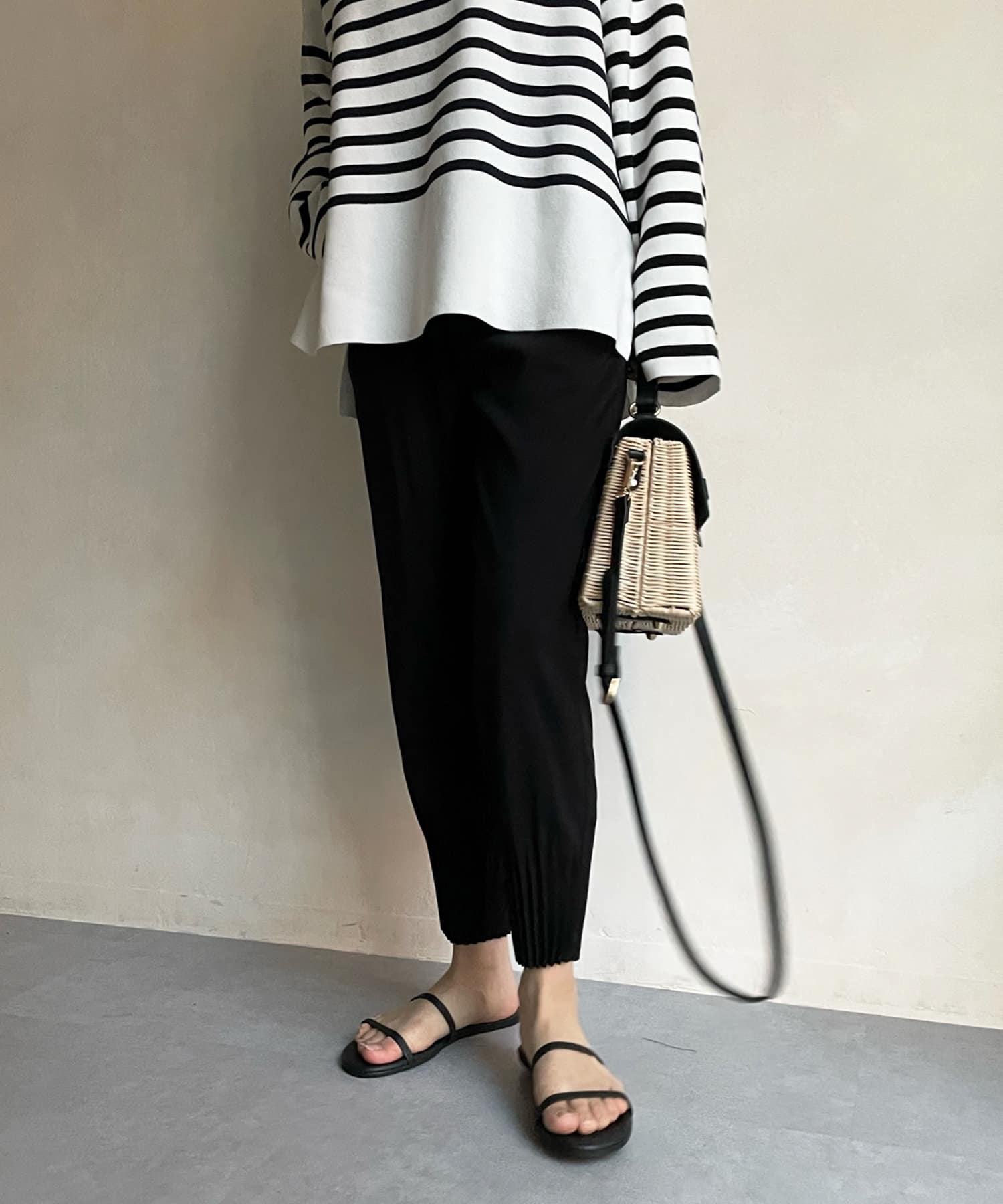 裾にプリーツ加工を施すことで、上品な印象をプラス。足首に沿うシルエットは、足元を綺麗に見せ、トレンドスタイルを叶えます。