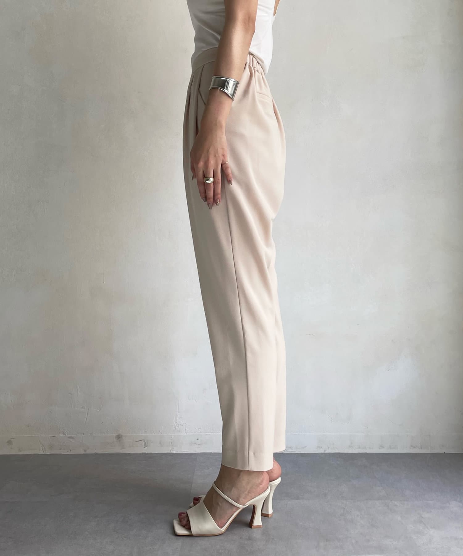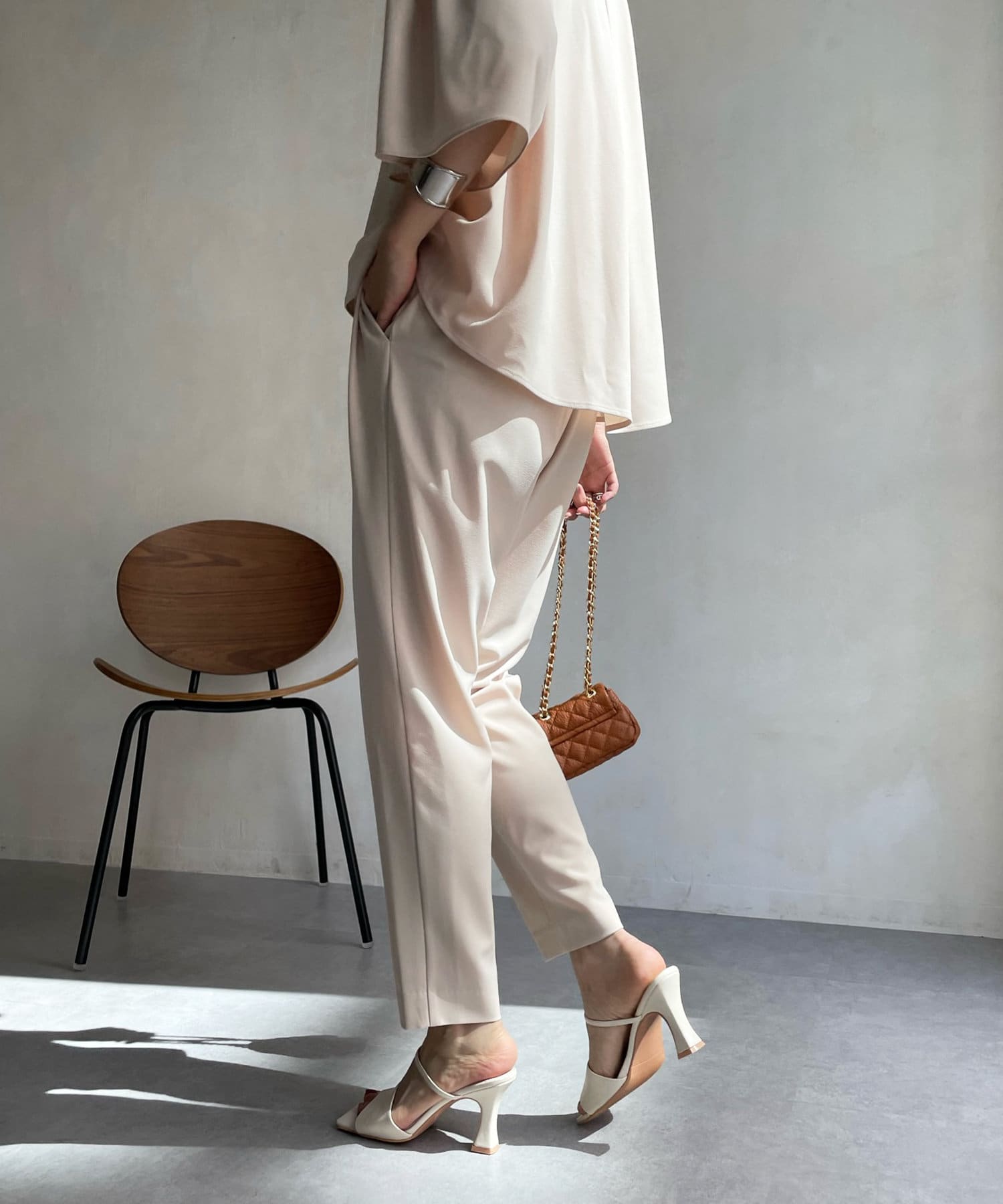 裾に向かってテーパード掛かったシルエットが綺麗なパンツ。