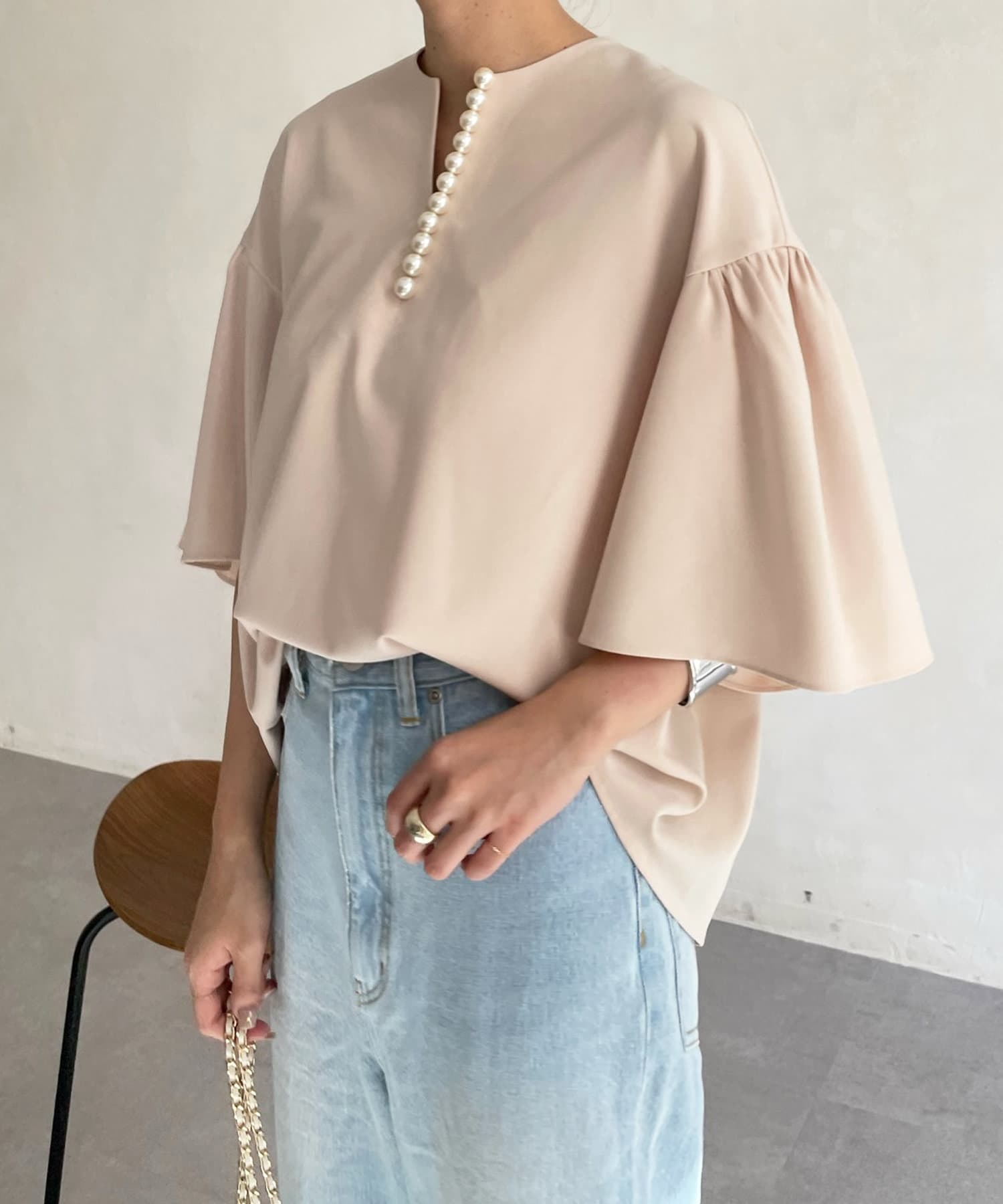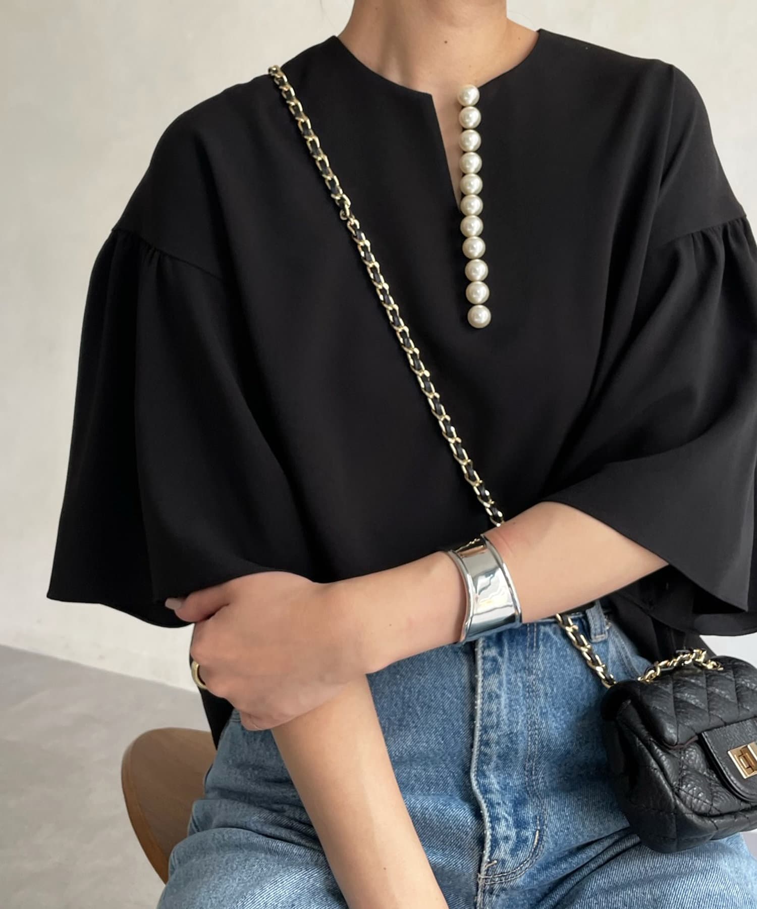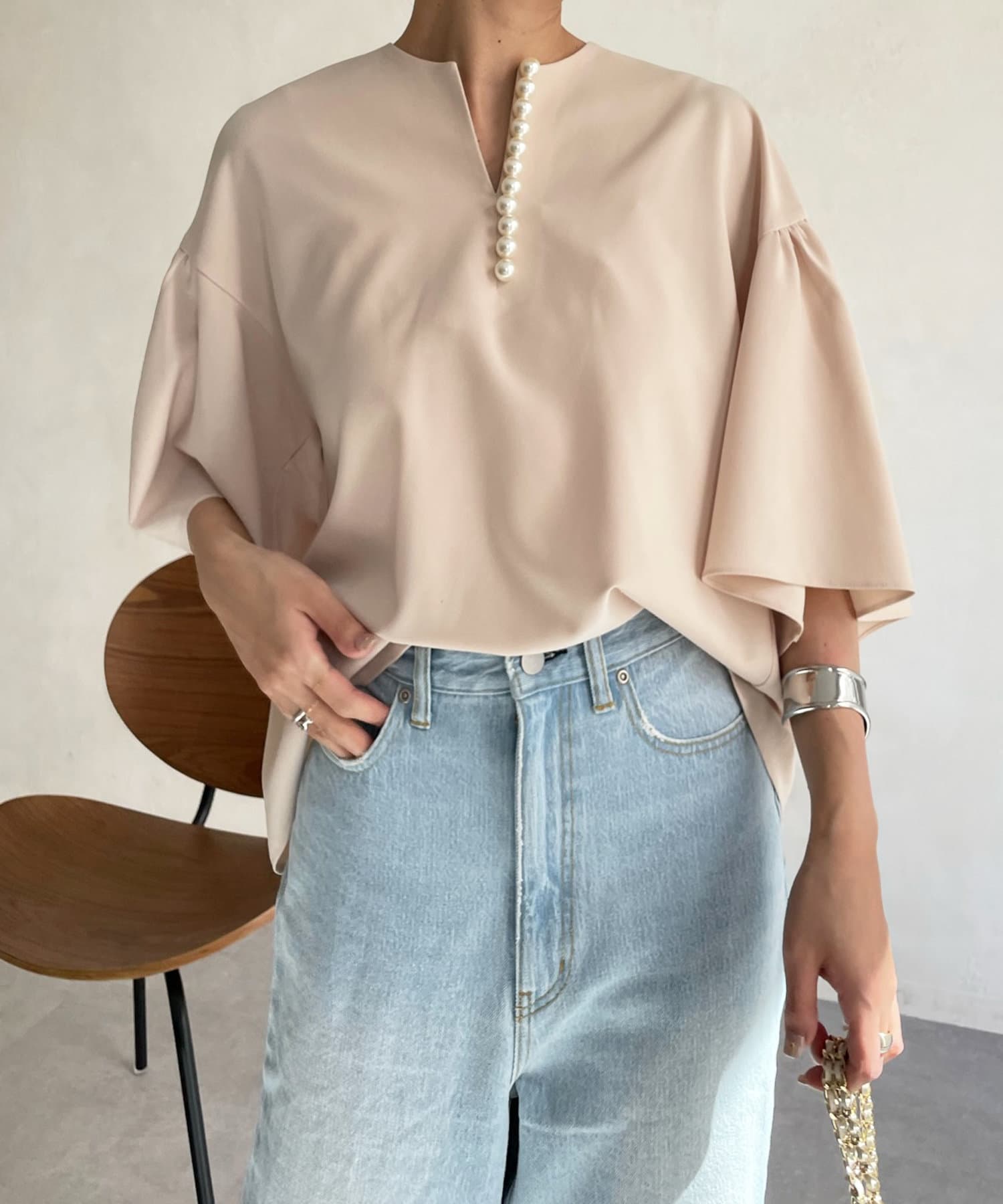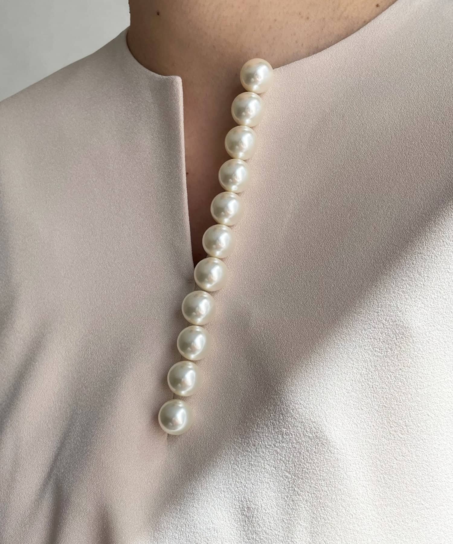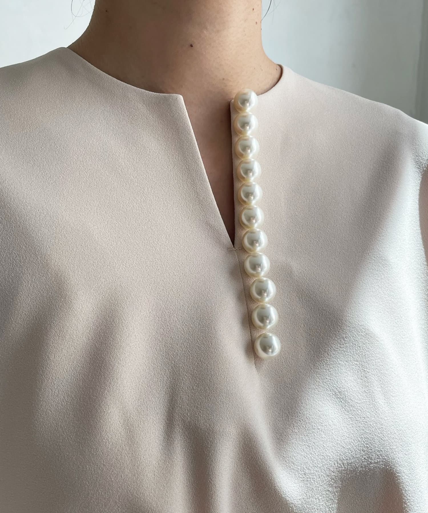 ネックラインに配したパールのデザインがトレンドライクなブラウス。