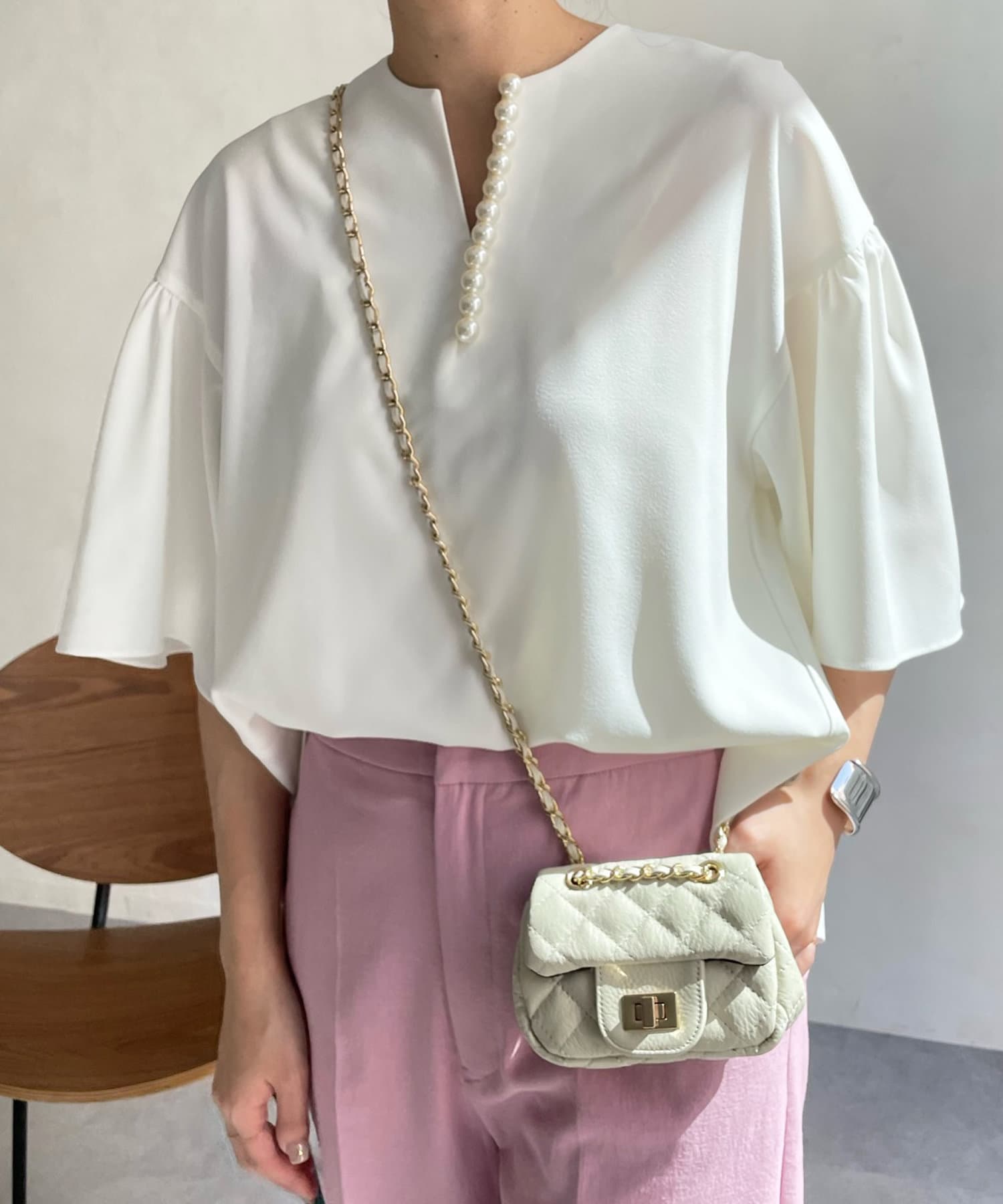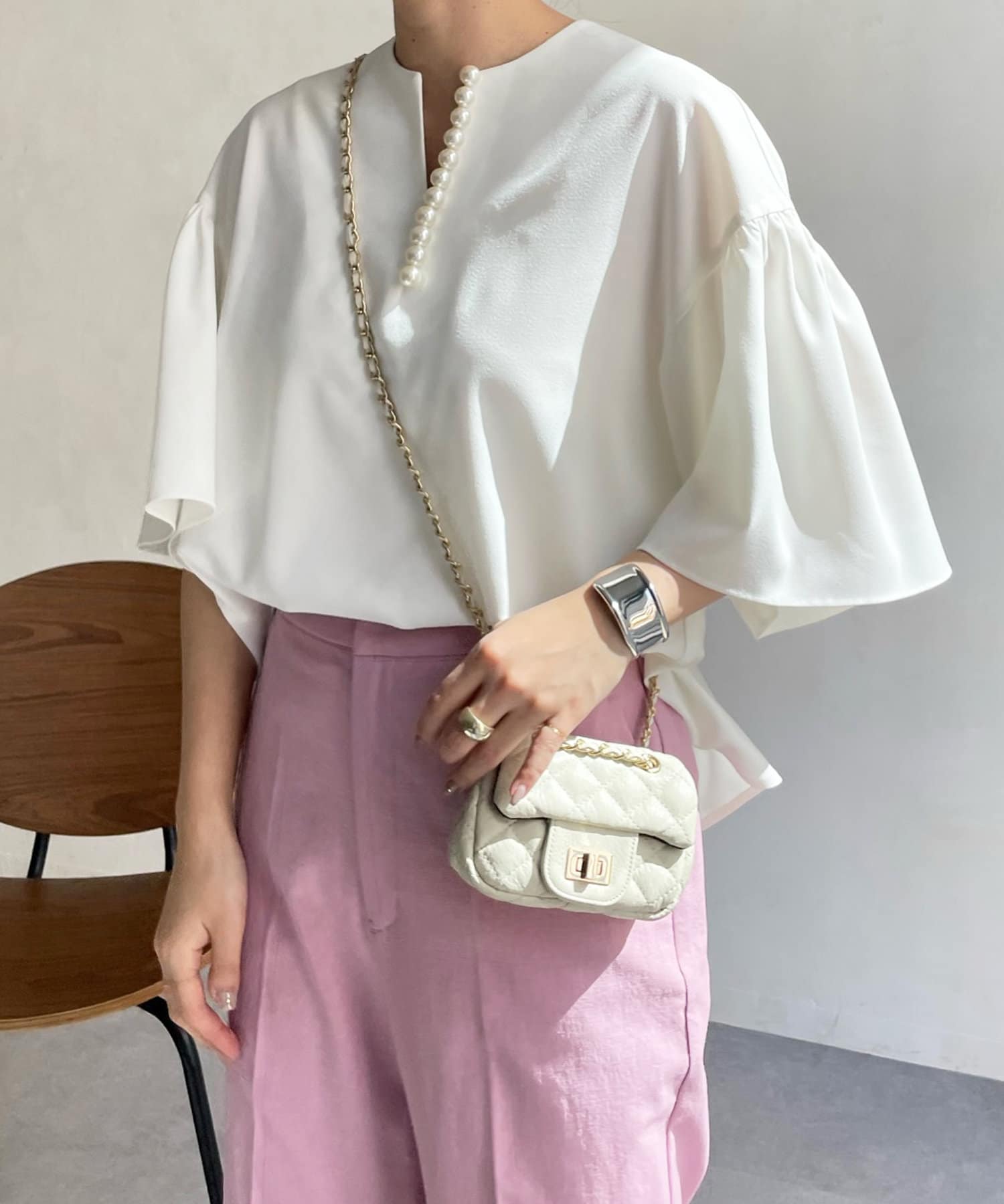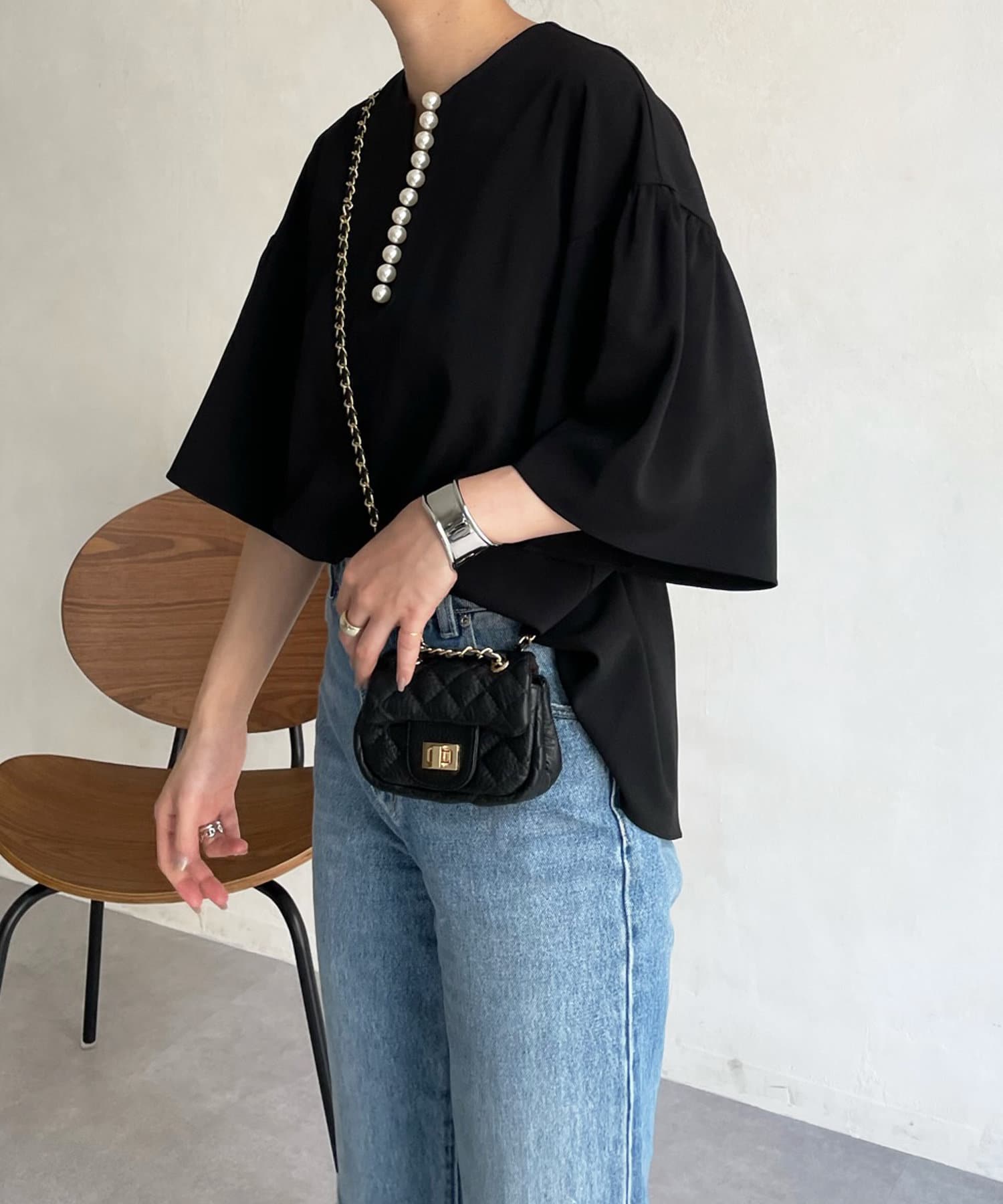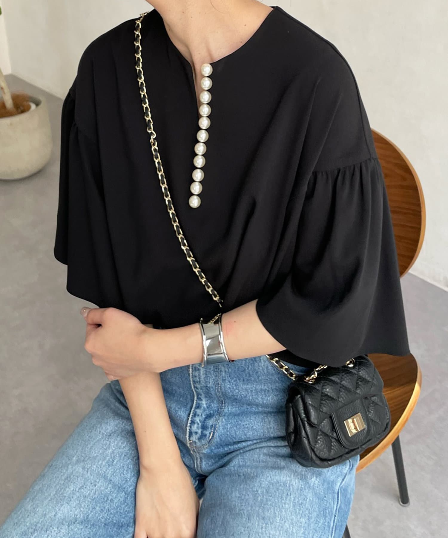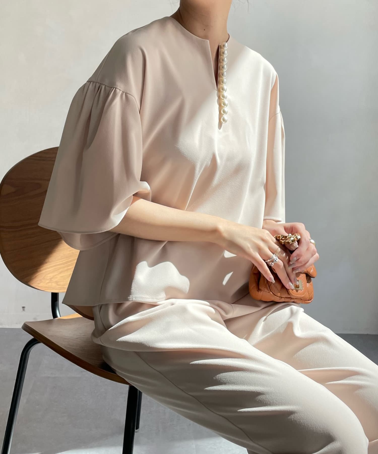 ネックラインに配したパールのデザインがトレンドライクなブラウス。