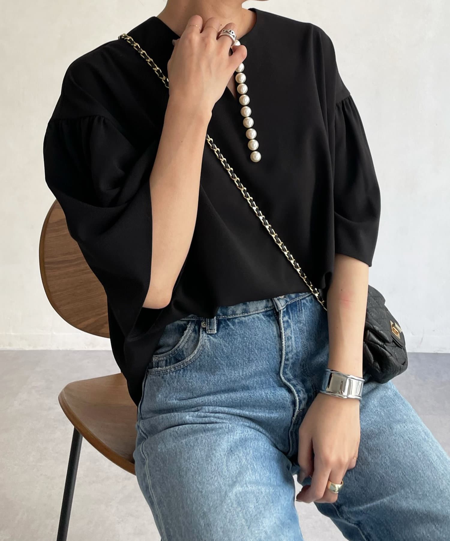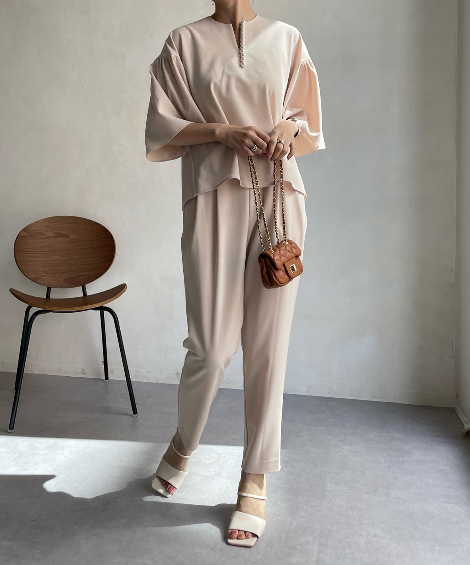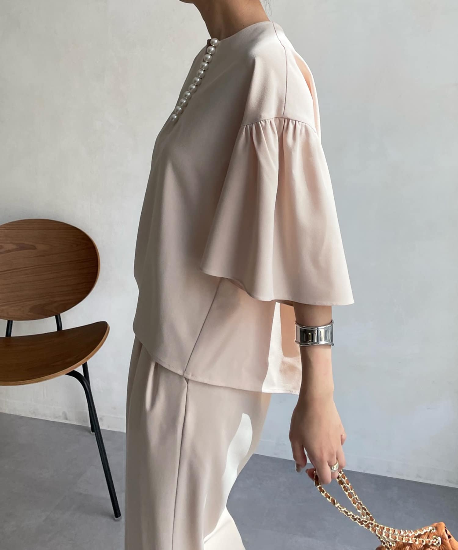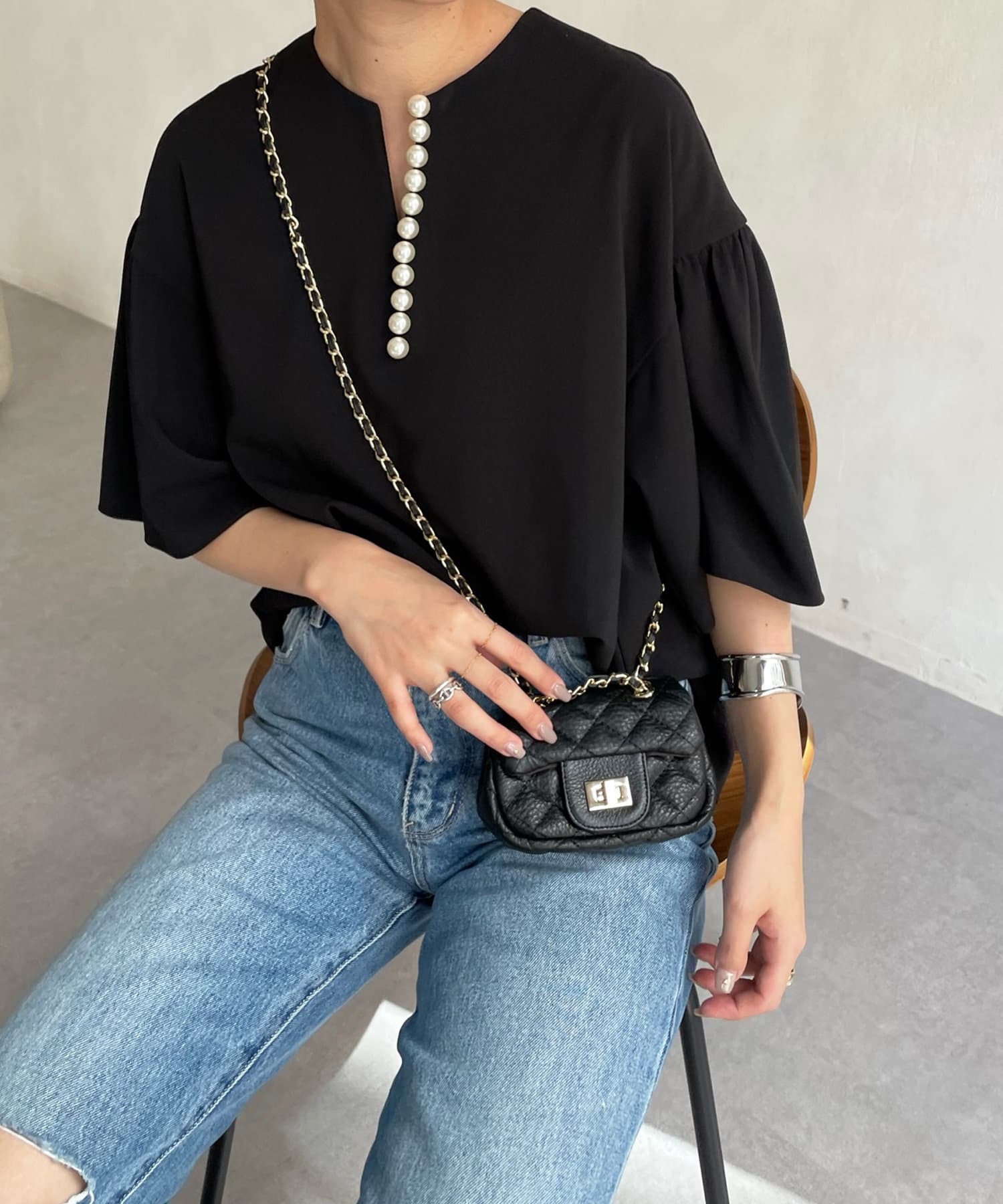 ネックラインに配したパールのデザインがトレンドライクなブラウス。