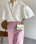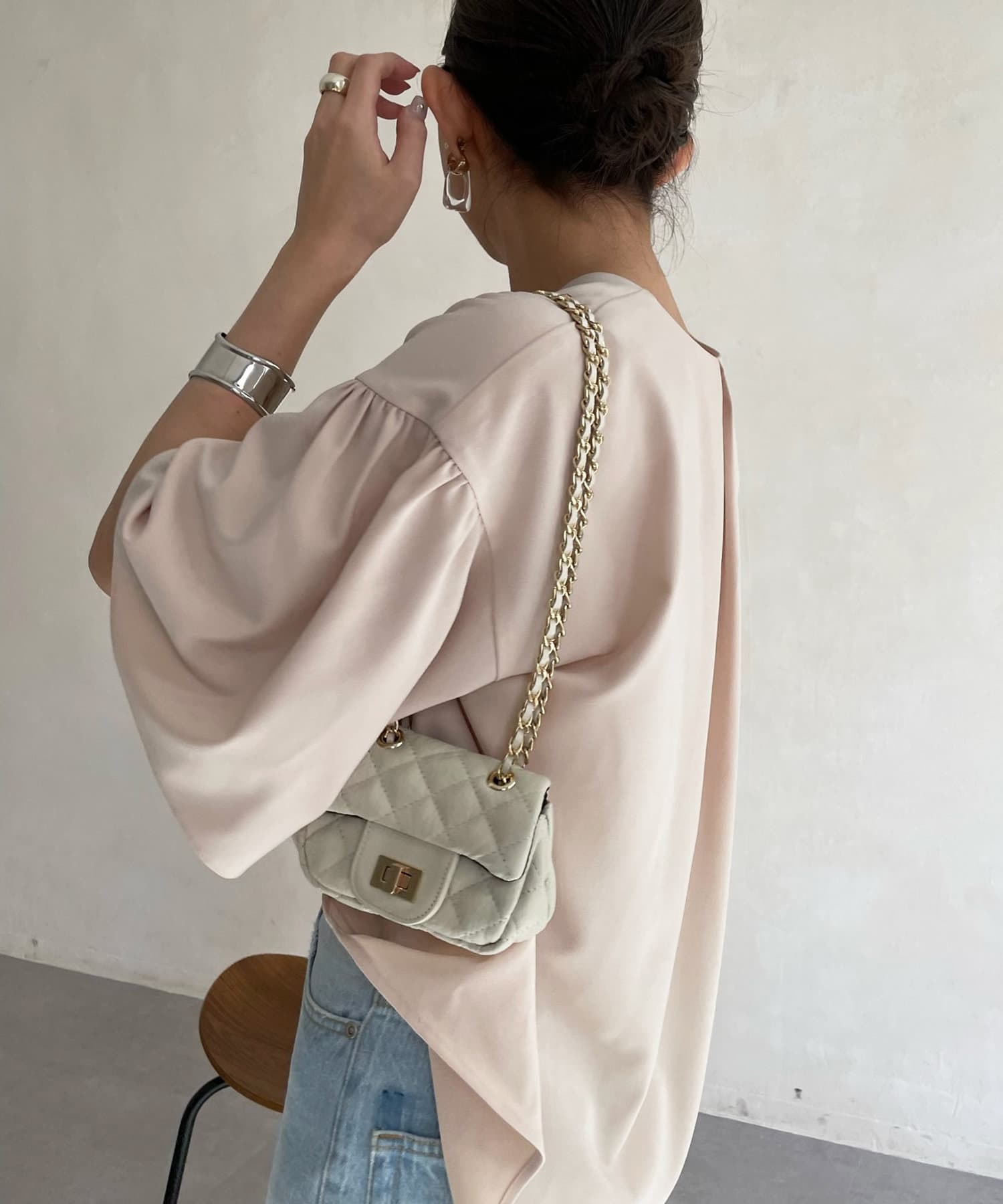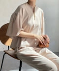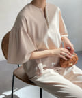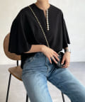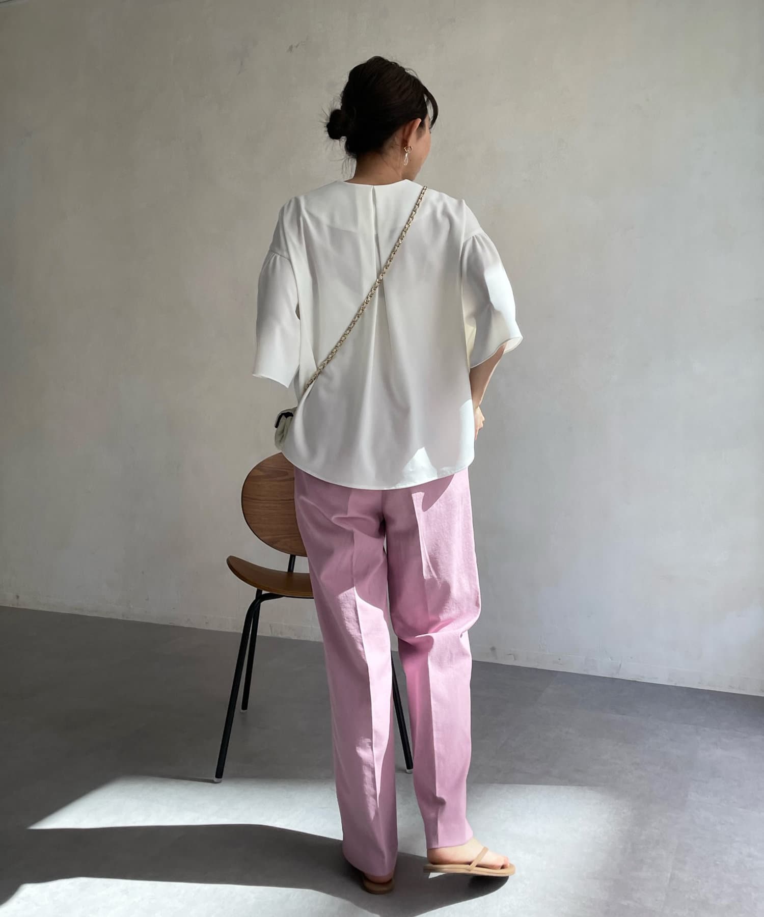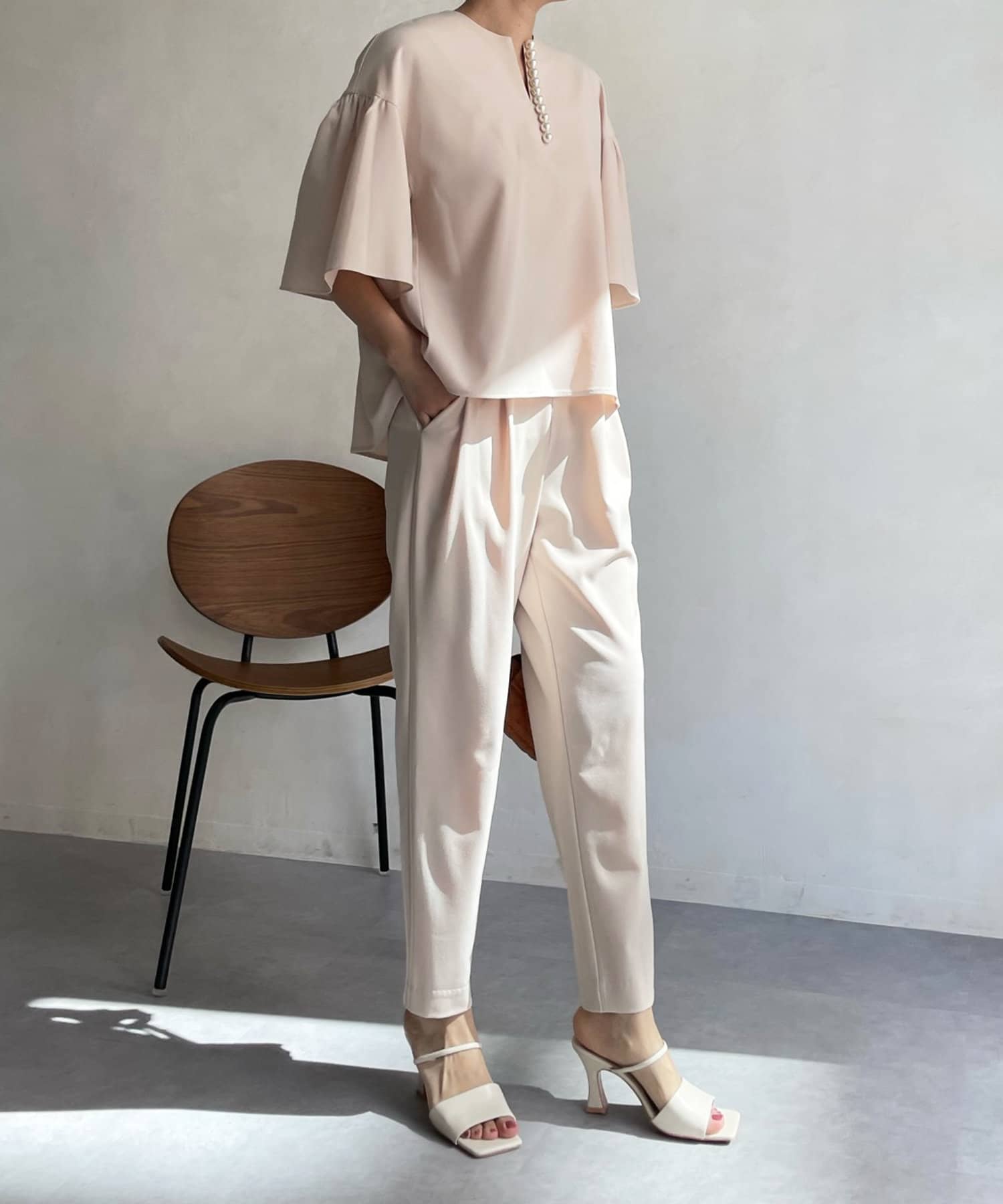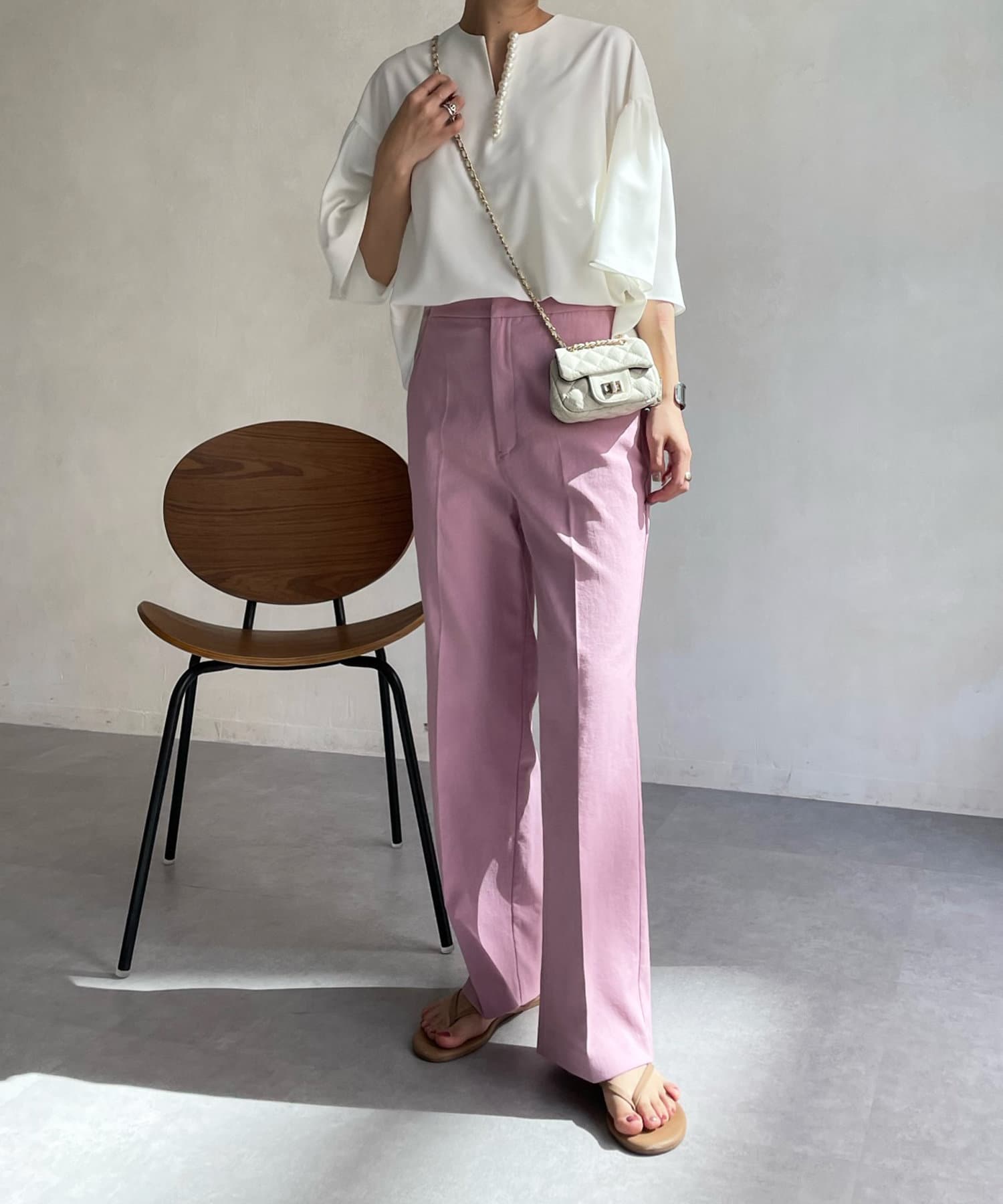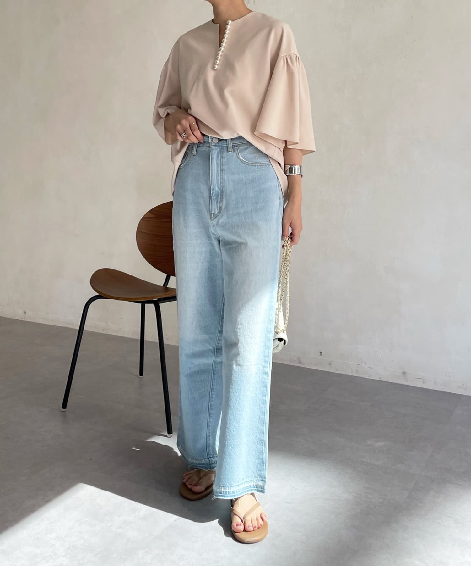 ネックラインに配したパールのデザインがトレンドライクなブラウス。